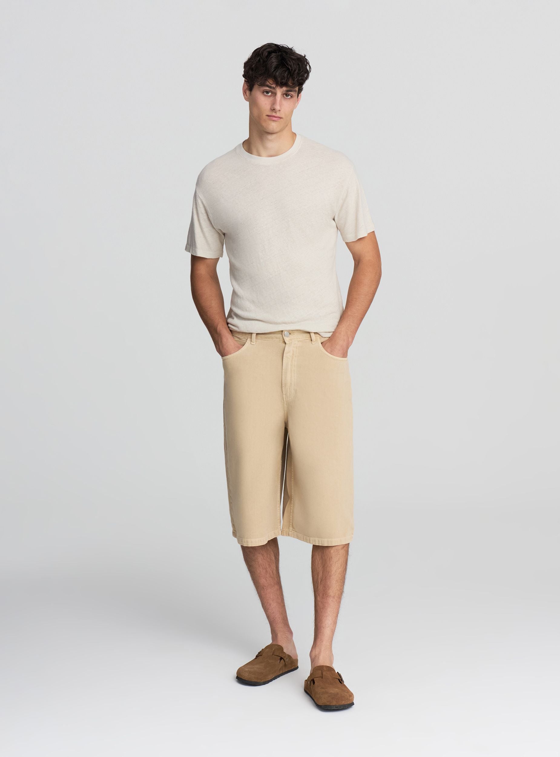 Bermuda da uomo a gamba ampia con lunghezza al ginocchio, perfetti per un’estetica disinvolta e contemporanea. La vita con passanti per cintura e tasche laterali rende il capo pratico e confortevole, mentre la linea pulita e il taglio dritto lo rendono ideale per accompagnare camicie leggere, t-shirt o canotte. Un’ottima scelta per look estivi rilassati ma curati, adatti al tempo libero, alla città o alle vacanze.