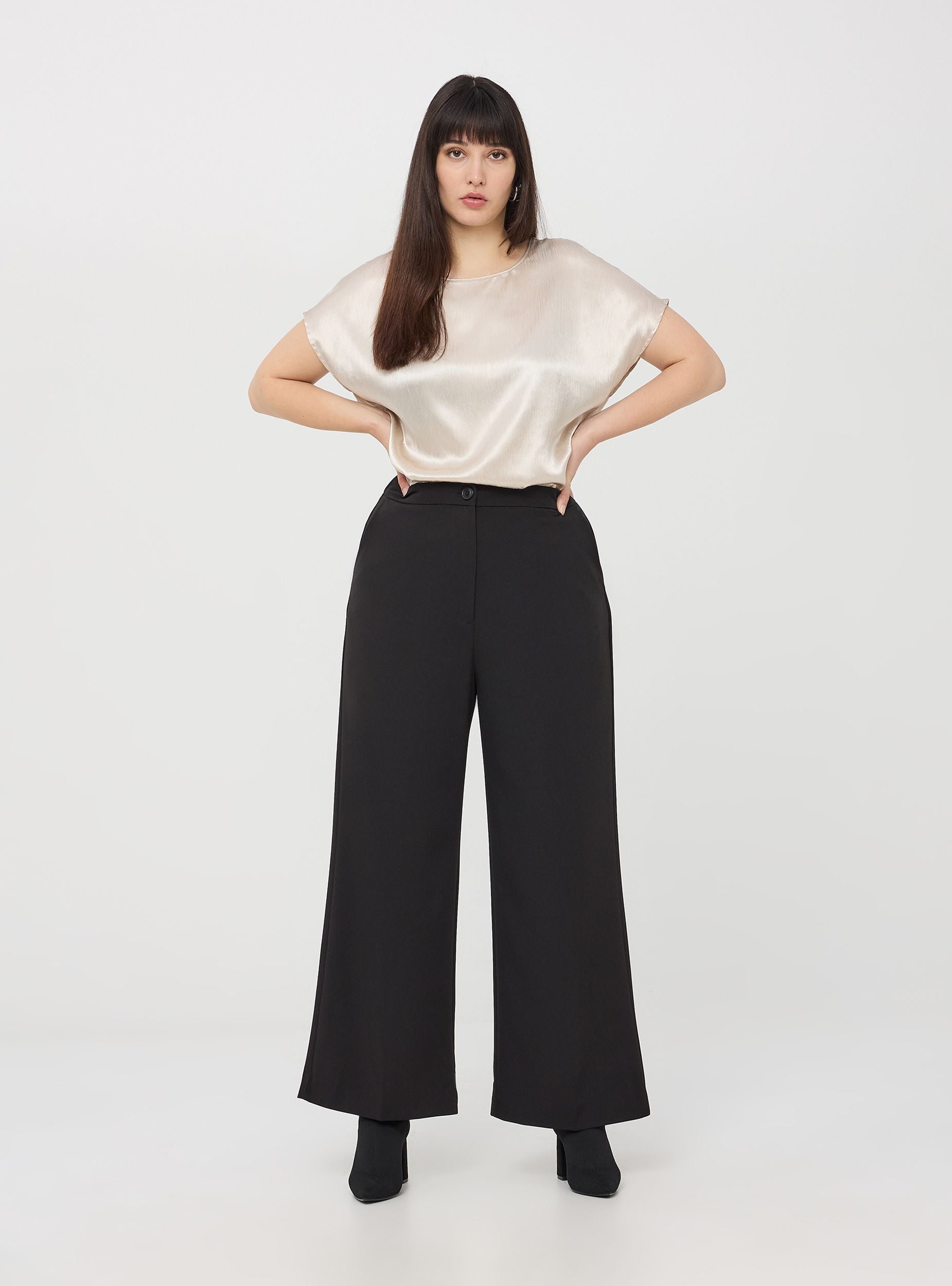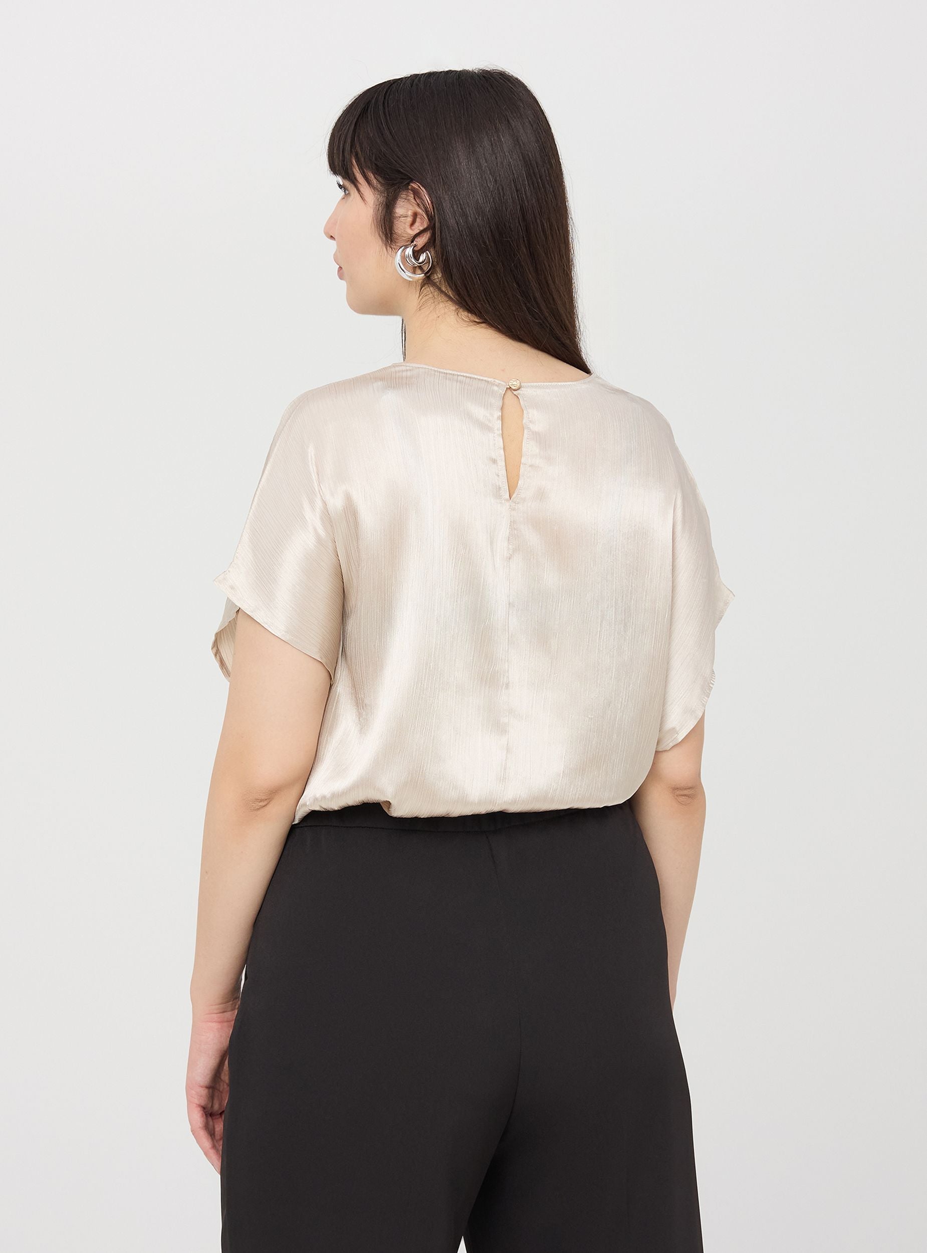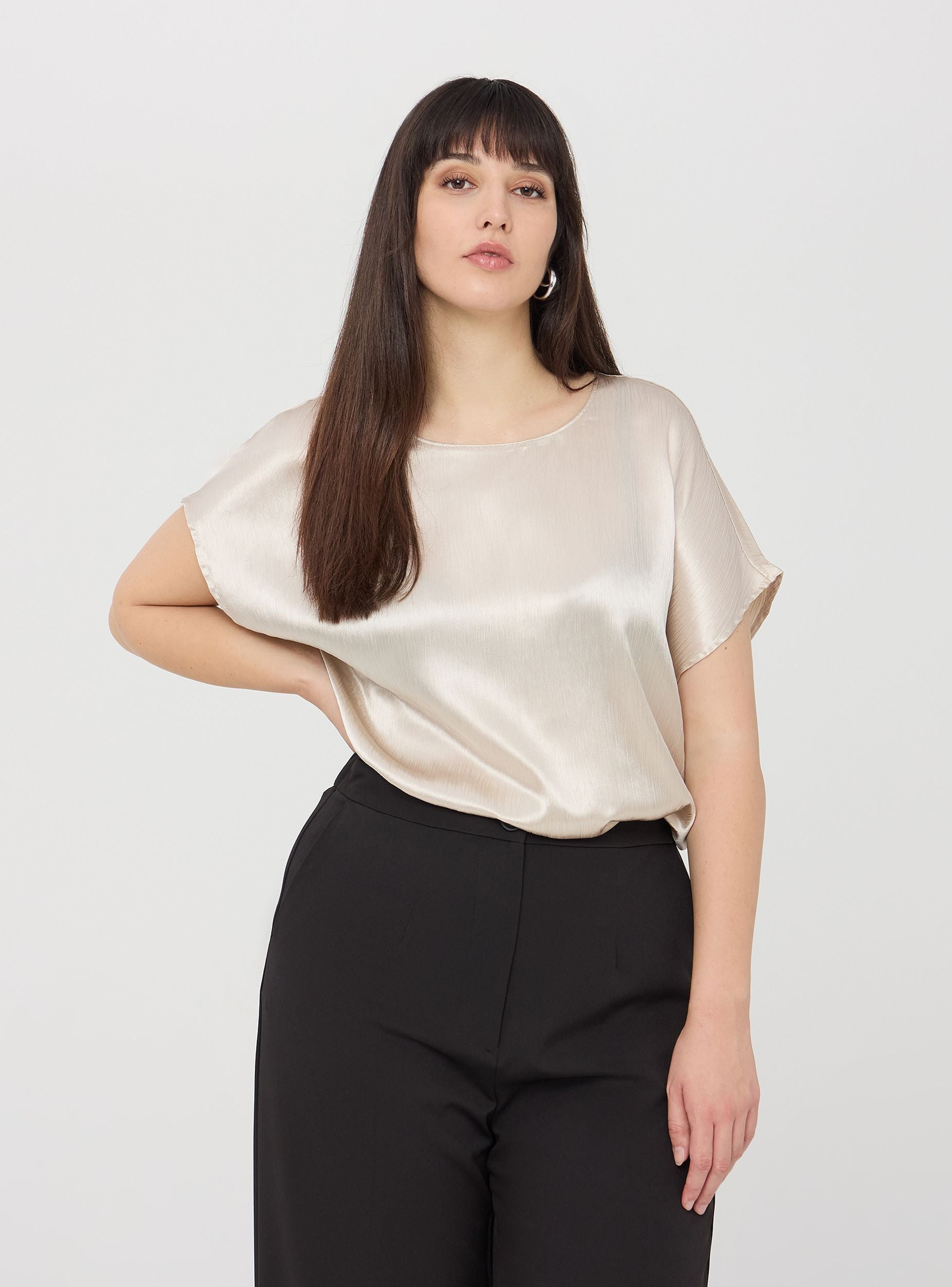 Blusa da donna in effetto raso a tinta unita, dalla vestibilità  morbida e confortevole. Presenta uno scollo rotondo e maniche corte. Sul retro è caratterizzata da un'apertura dritta chiusa con un piccolo bottone.