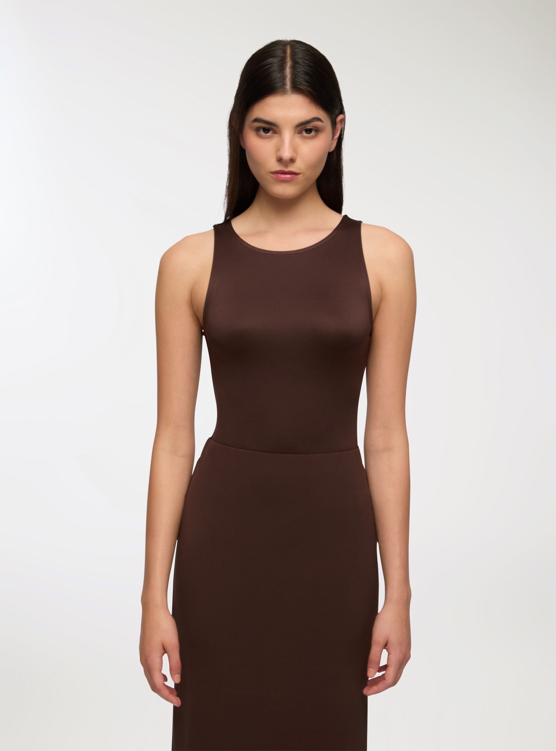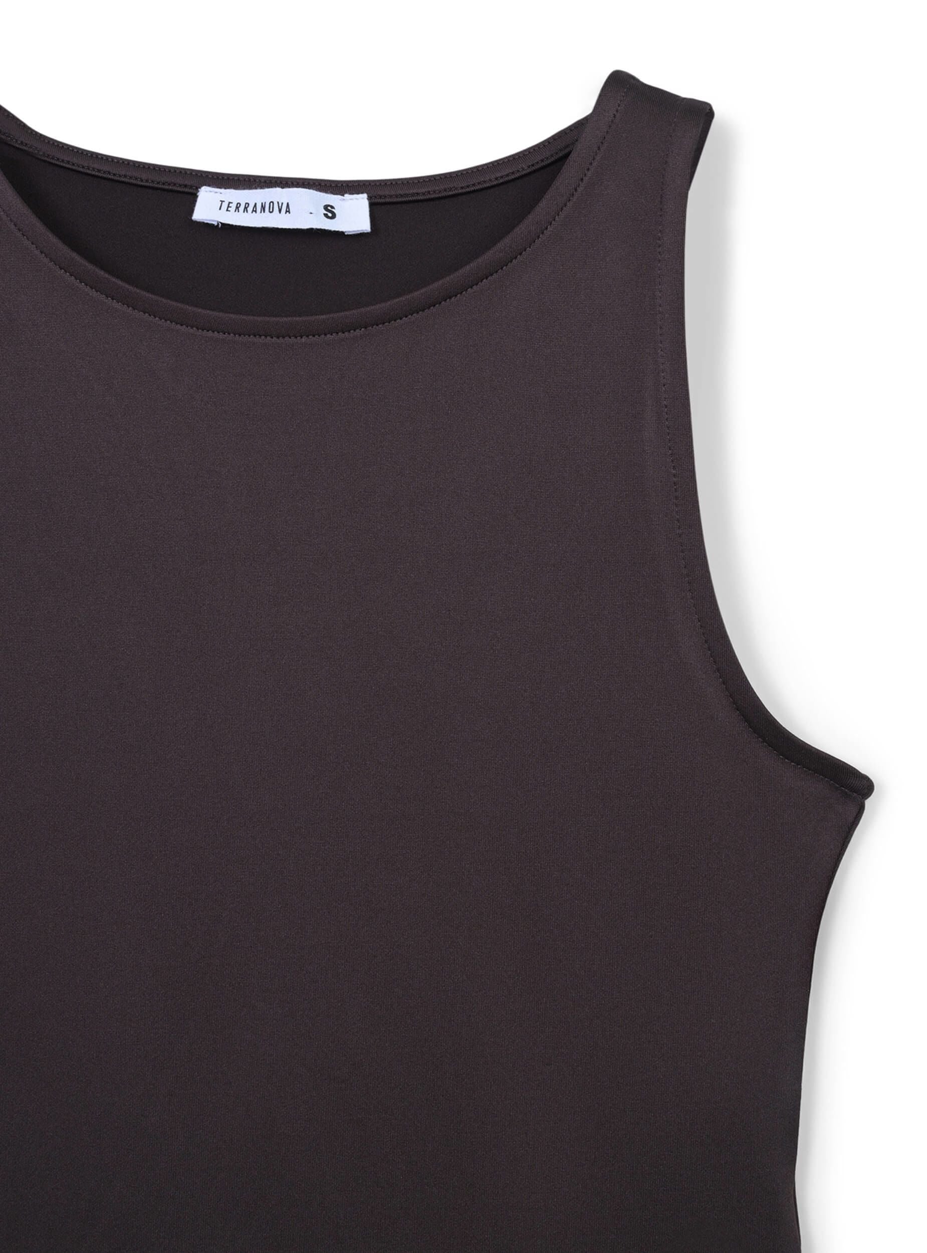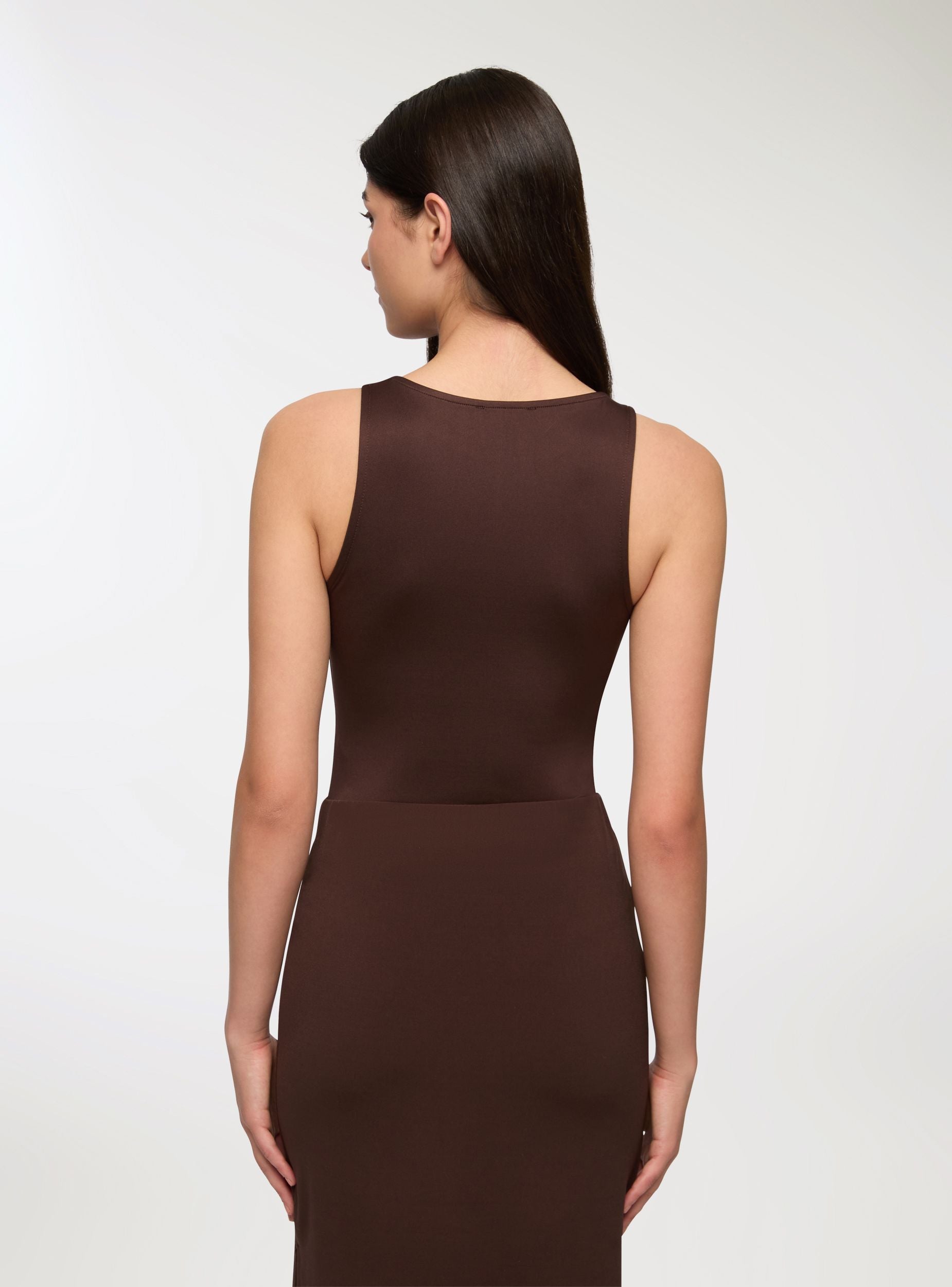 Body da donna dal design essenziale, ideale per look versatili e contemporanei. Il modello presenta una silhouette aderente, scollo tondo e spalline larghe, perfetto da indossare sotto giacche o cardigan per un outfit casual o più ricercato. La chiusura con bottoni automatici sul fondo garantisce praticità. Stile a tinta unita, senza maniche, valorizza la figura e si adatta a molteplici occasioni.Dettagli