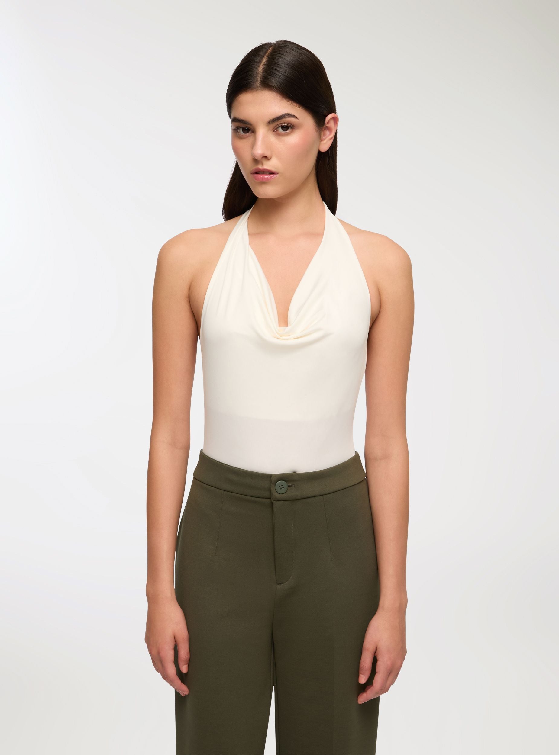 Body da donna con scollo drappeggiato e design senza maniche, ideale per occasioni eleganti o serate speciali. La chiusura a bottoni lo rende pratico e comodo da indossare. Perfetto da abbinare a pantaloni palazzo o gonne a vita alta per un look sofisticato e moderno. La vestibilità aderente valorizza la silhouette, mentre il dettaglio del drappeggio aggiunge un tocco di stile unico.