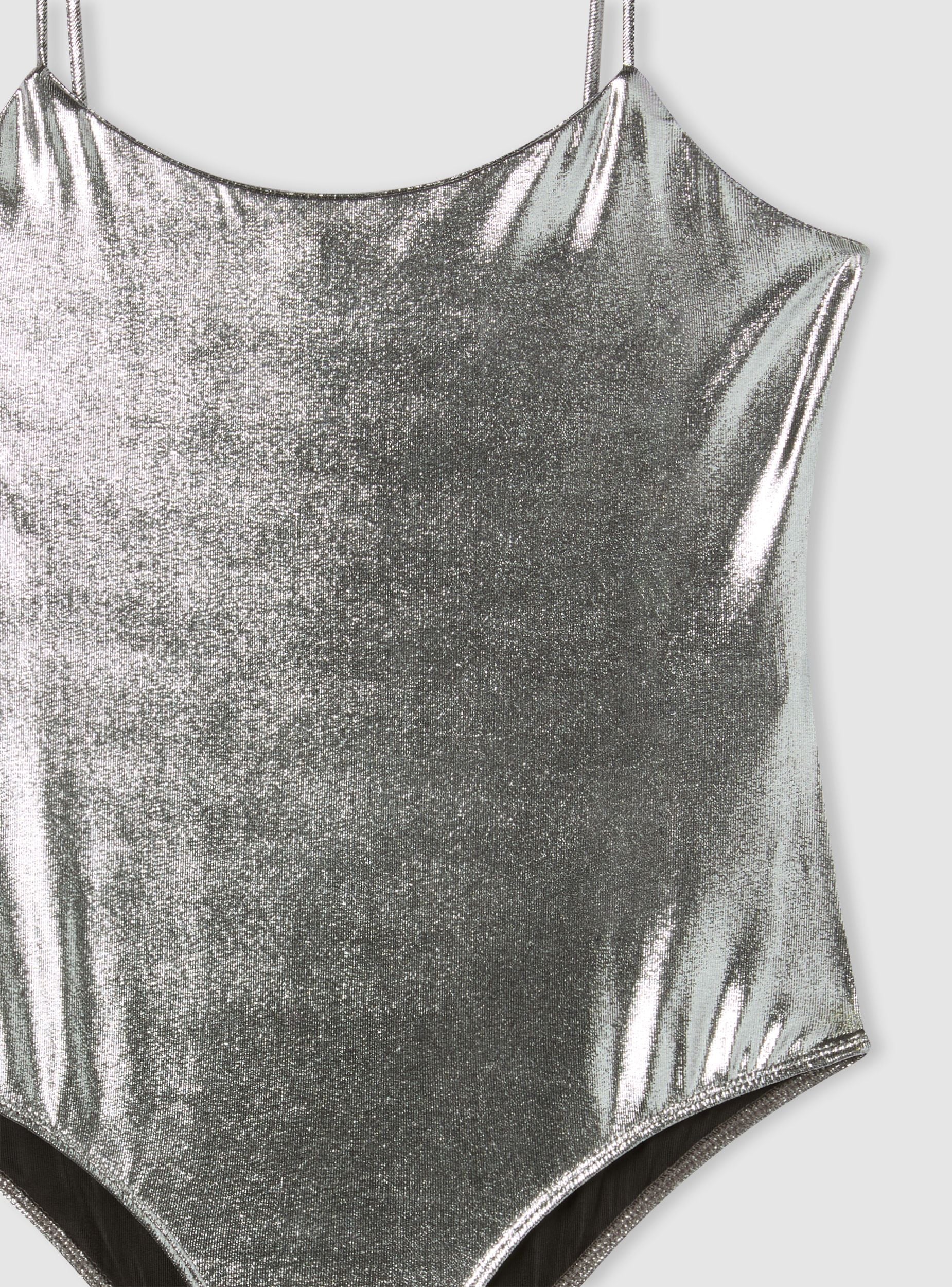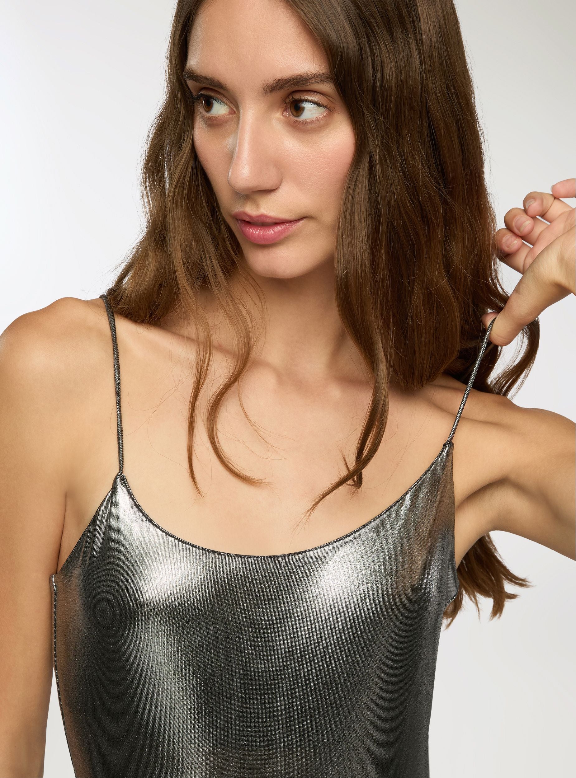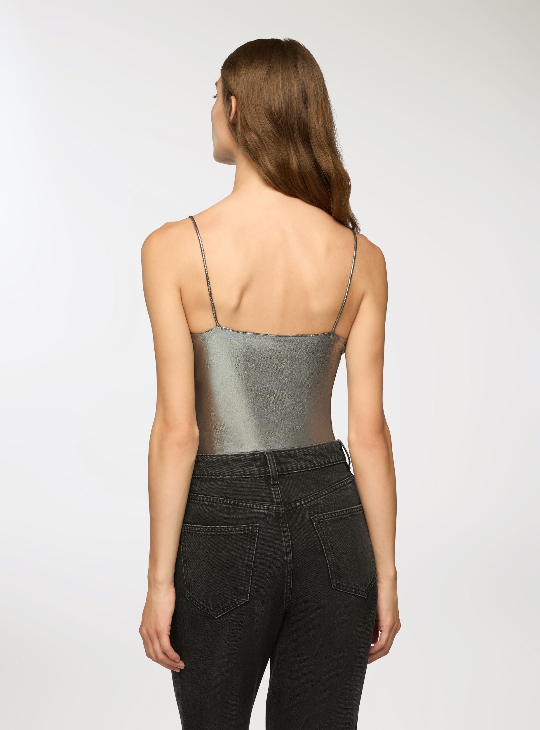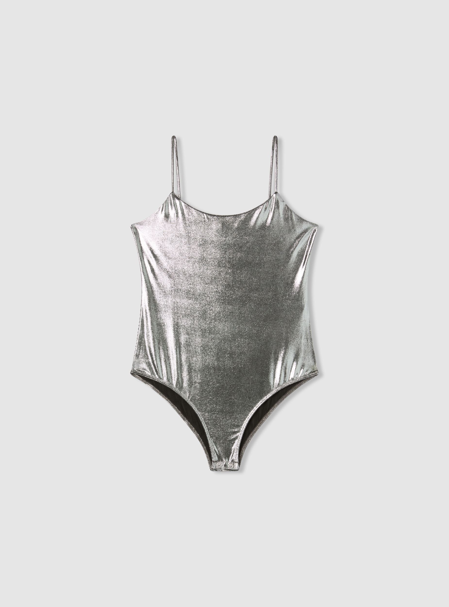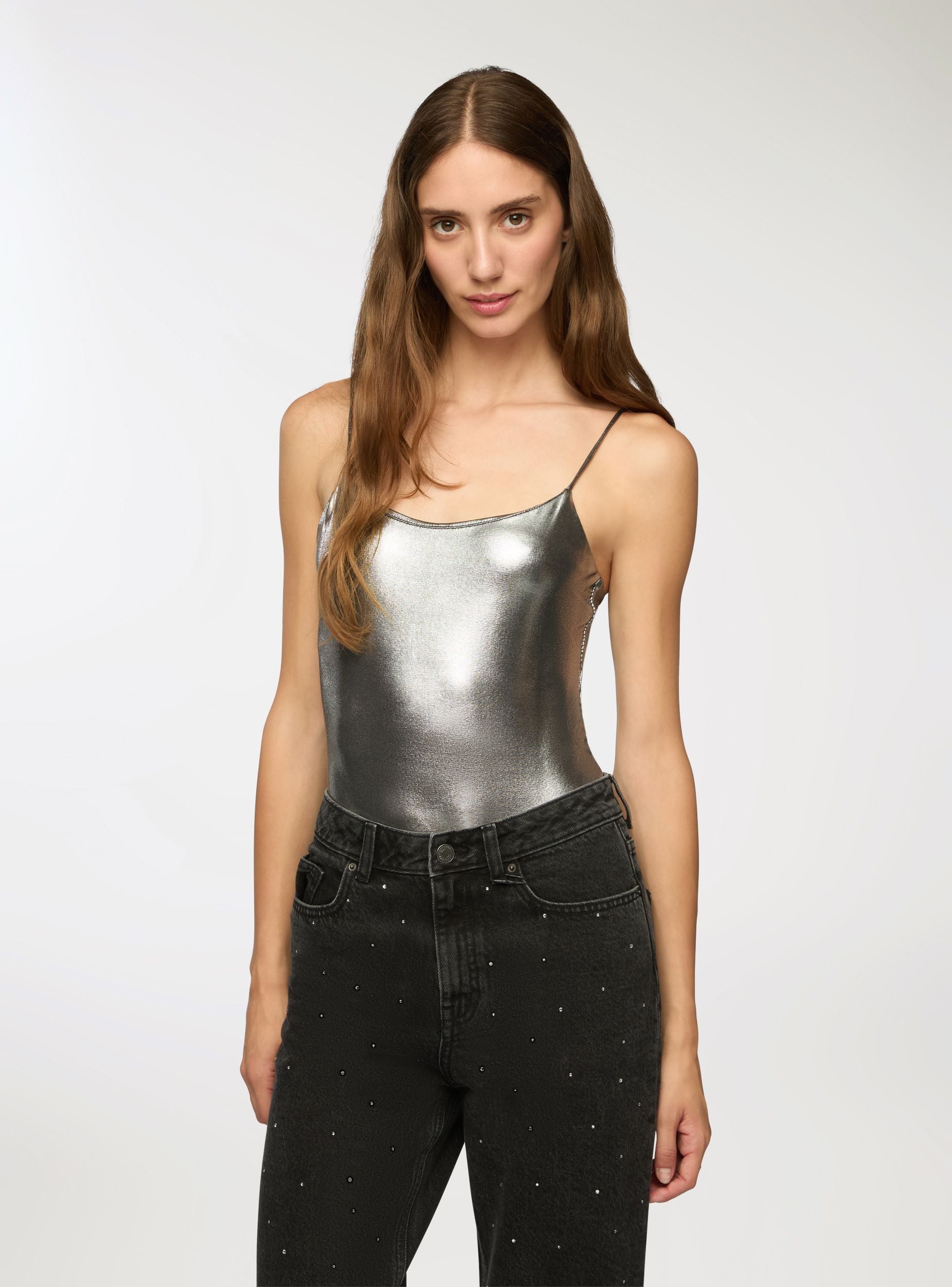Body da donna con spalline sottili e taglio aderente che valorizza la silhouette. Il tessuto presenta una finitura laminata effetto lucido, perfetta per creare look d’impatto, sia da sera che per occasioni speciali. Il rivestimento brillante dona un tocco glamour e moderno, ideale per chi ama osare con stile. Da abbinare a jeans a vita alta o gonne a tubino.