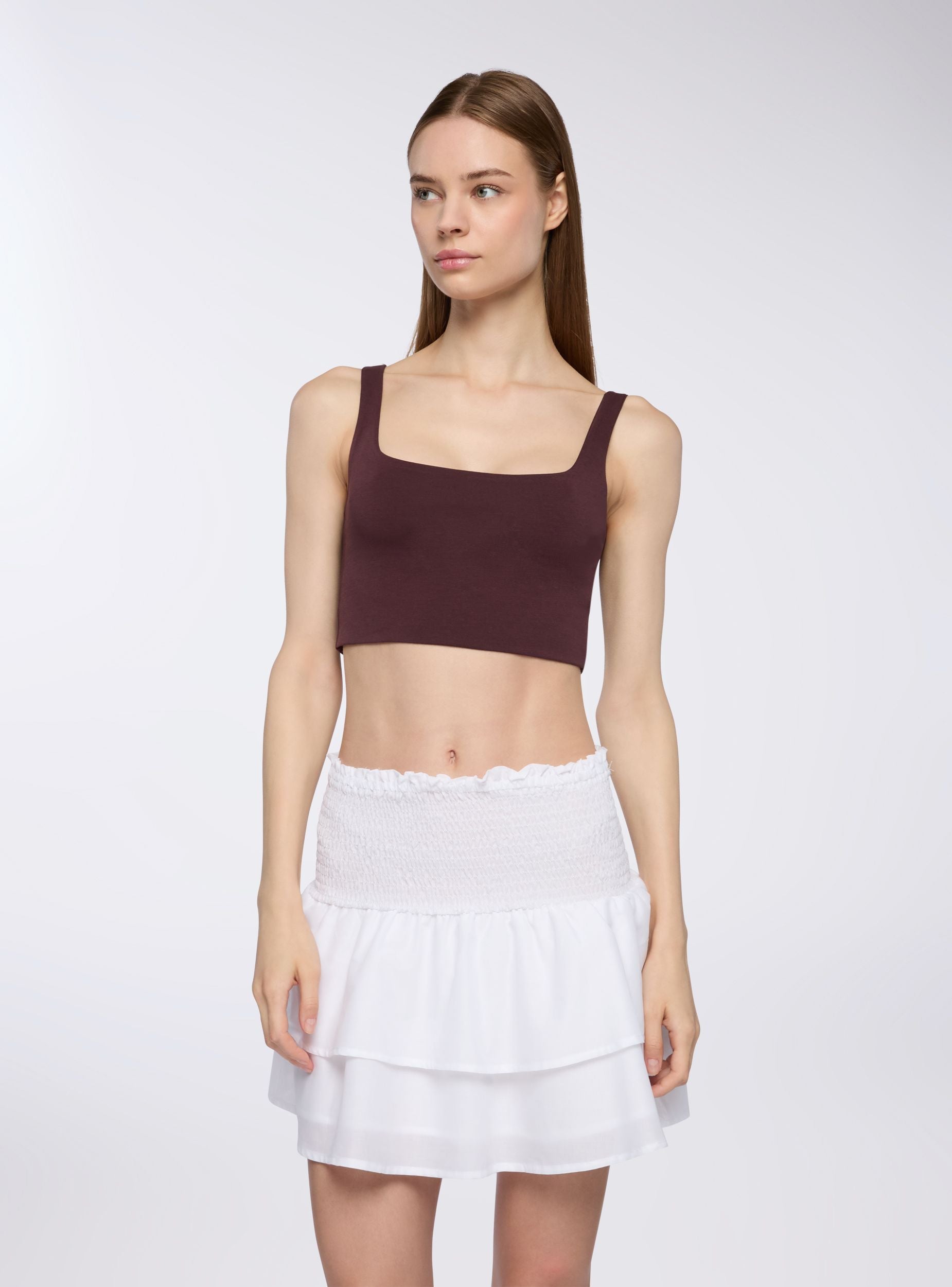 Bra da donna con design a tinta unita, caratterizzato da uno scollo quadrato che offre un look minimal e moderno. Il tessuto elasticizzato assicura una vestibilità comoda e aderente, con spalline larghe che forniscono supporto e stabilità. Il taglio è pensato per abbracciare la figura con delicatezza, garantendo comfort per tutto il giorno.