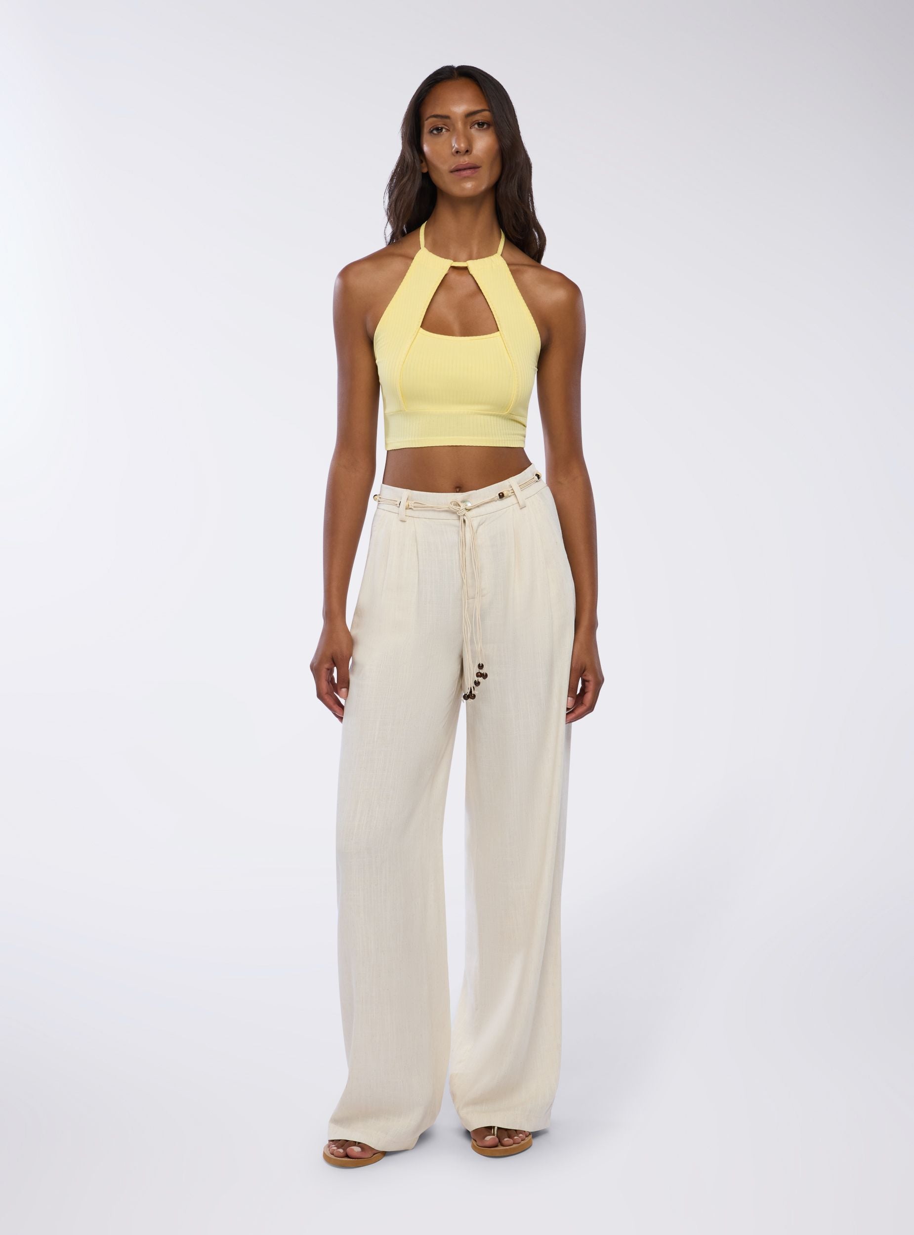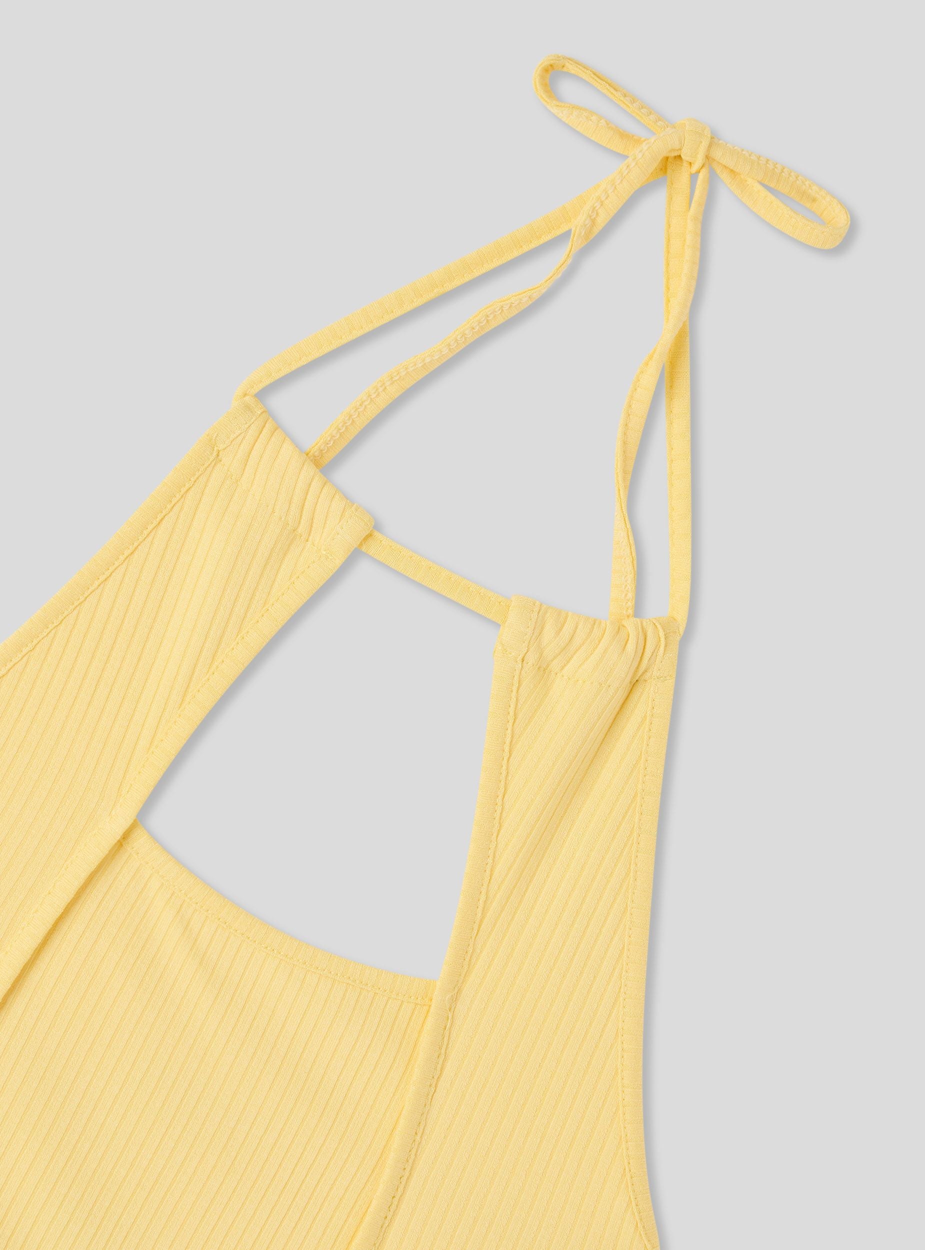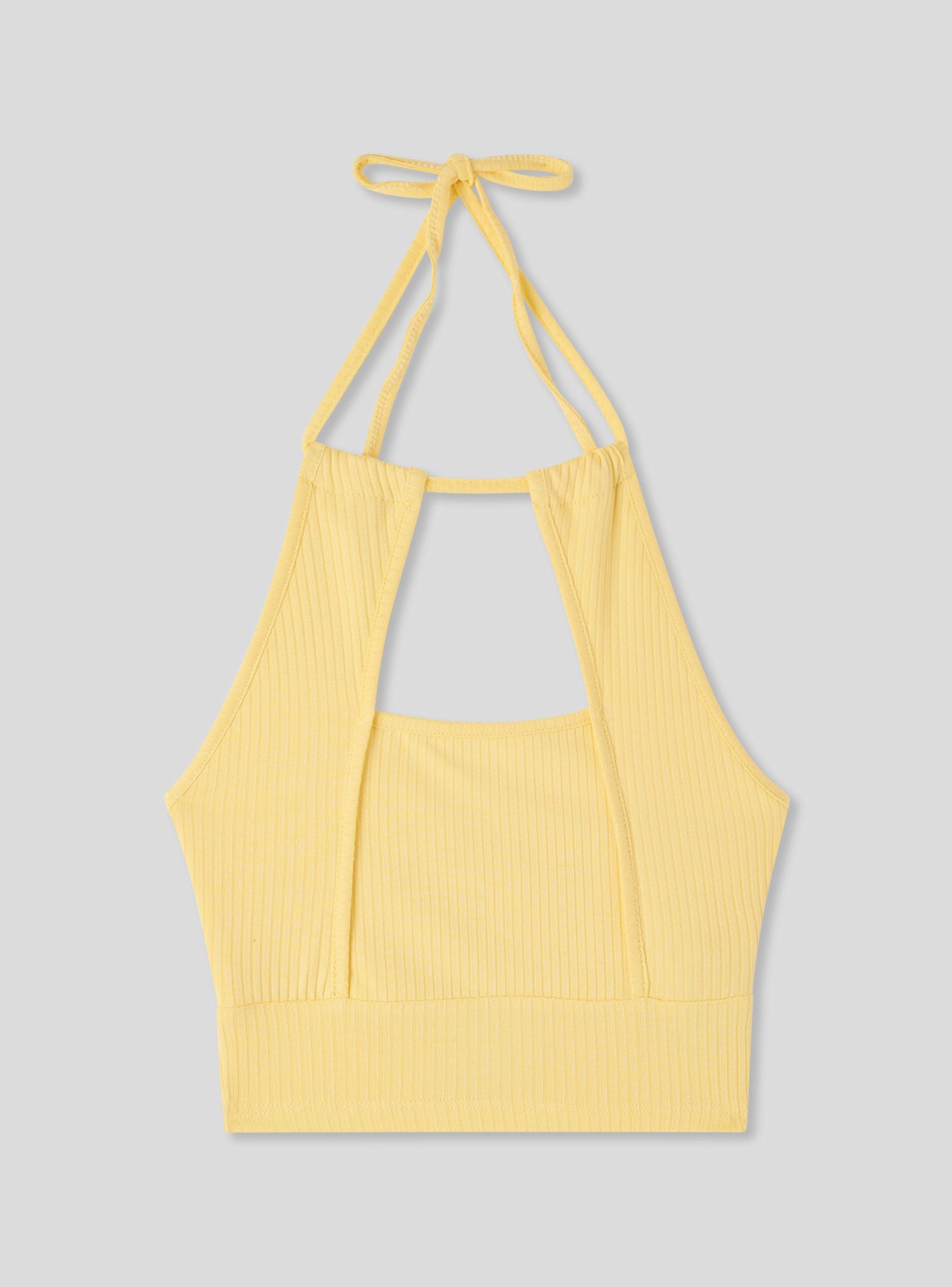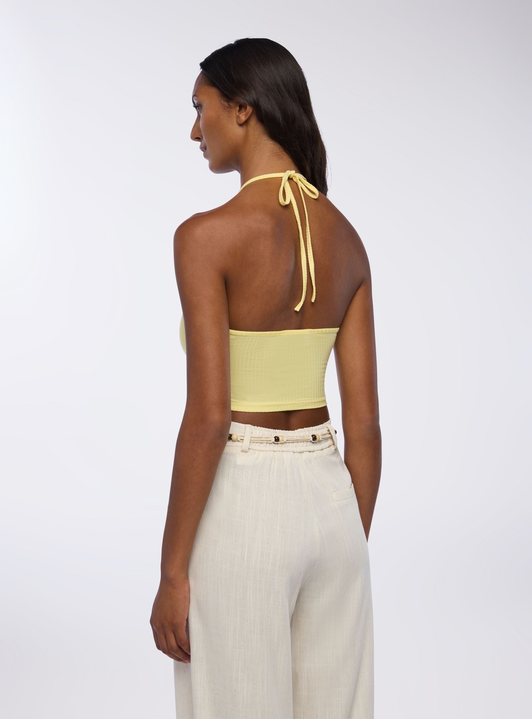 Top da donna con design halterneck e oblò frontale. Ideale per un look casual e trendy, si abbina perfettamente a jeans o pantaloni a vita alta. La vestibilità aderente e il dettaglio del nodo sul collo aggiungono un tocco di stile unico. Perfetto per giornate estive o serate informali, questo top offre comfort e versatilità per diverse occasioni.Dettagli
