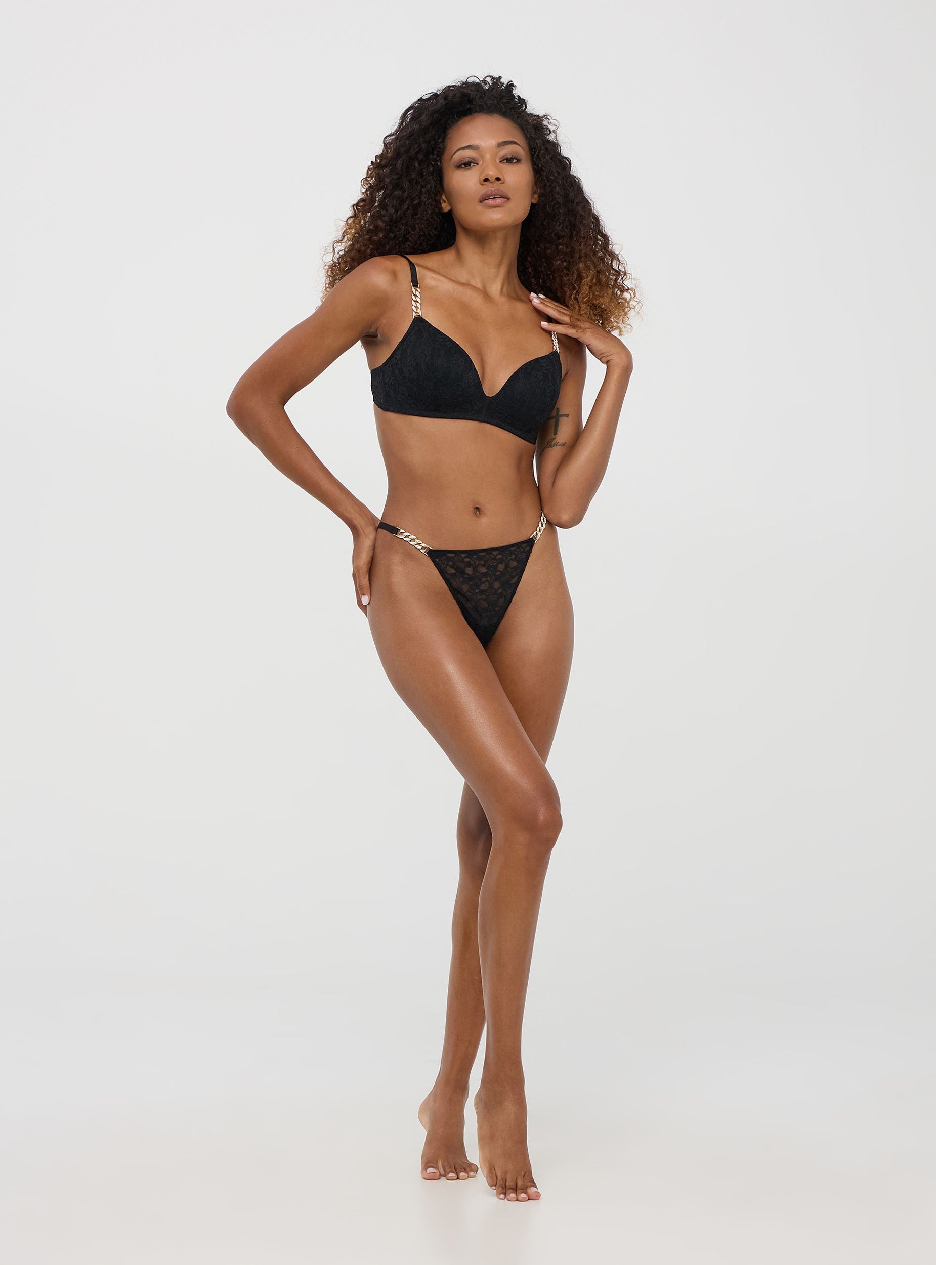 Slip da donna, modello brasiliana, in pizzo dal disegno floreale con dettaglio catena dorata con strass.