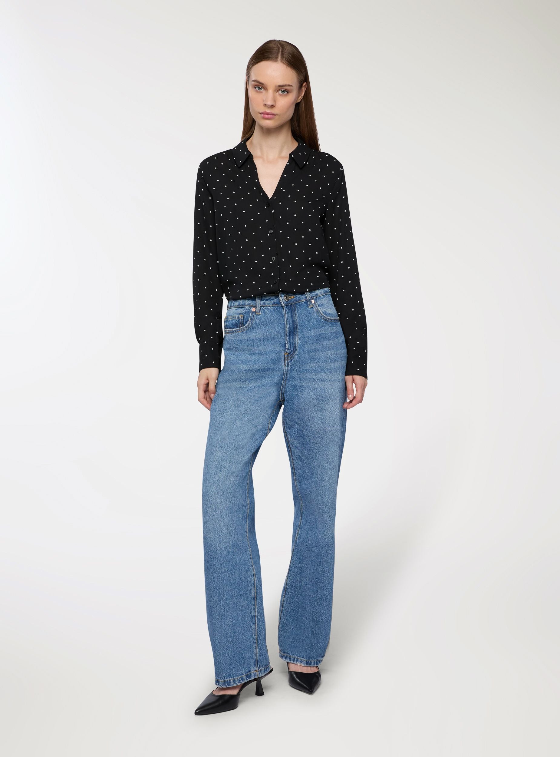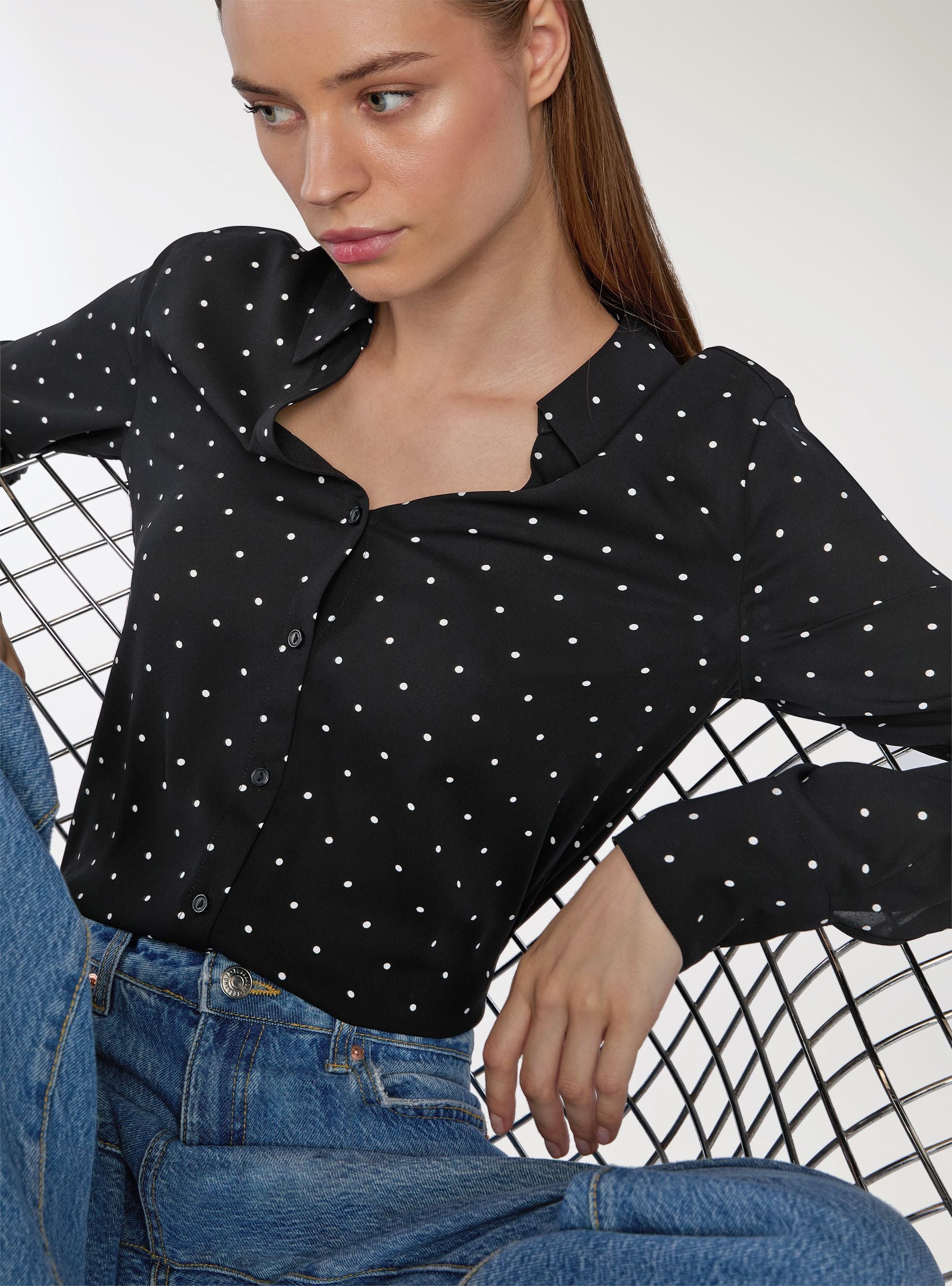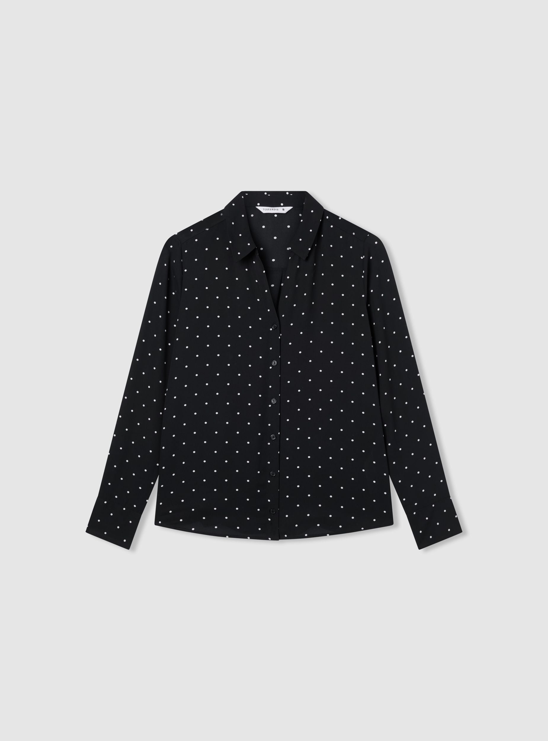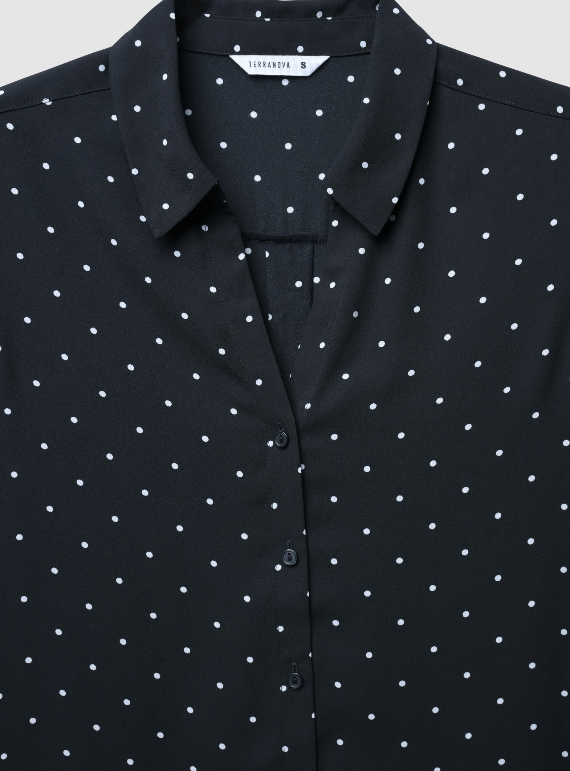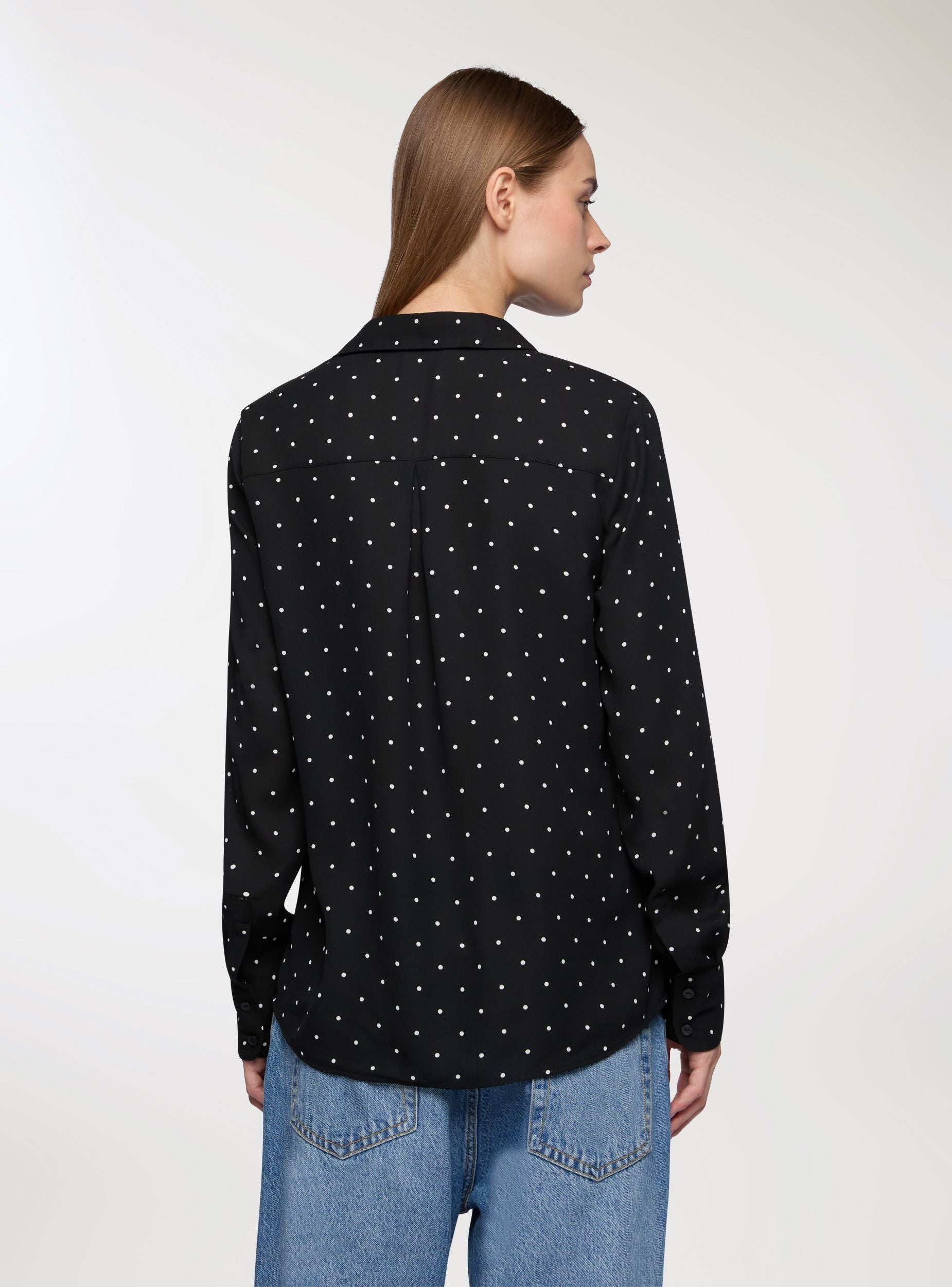 Camicia da donna con fantasia a pois, dotata di colletto e chiusura con bottoni. Le maniche lunghe e la vestibilità regolare la rendono ideale per un look versatile e raffinato. Perfetta per essere abbinata a pantaloni o gonne, si adatta a diverse occasioni, dal lavoro a eventi formali.