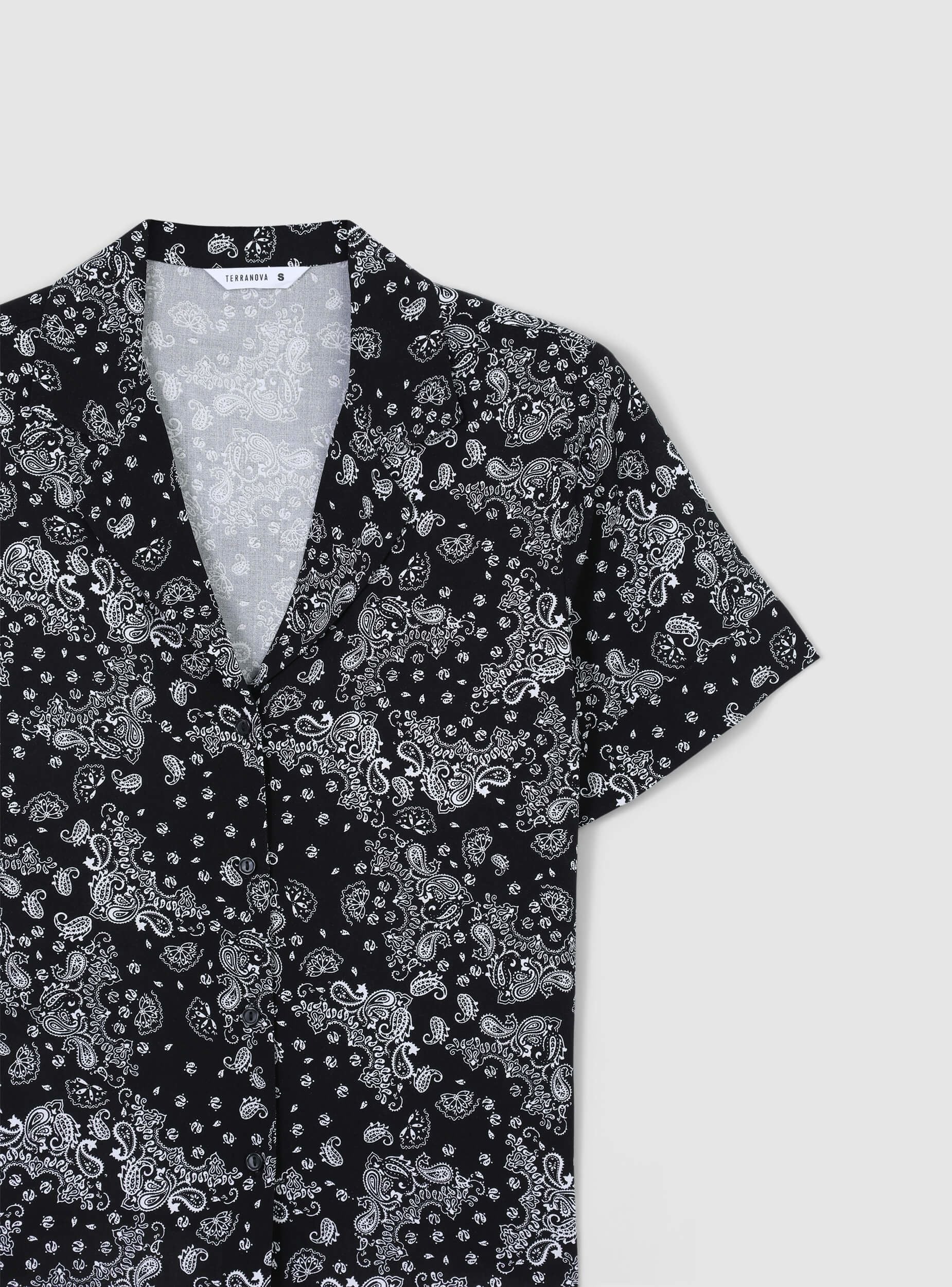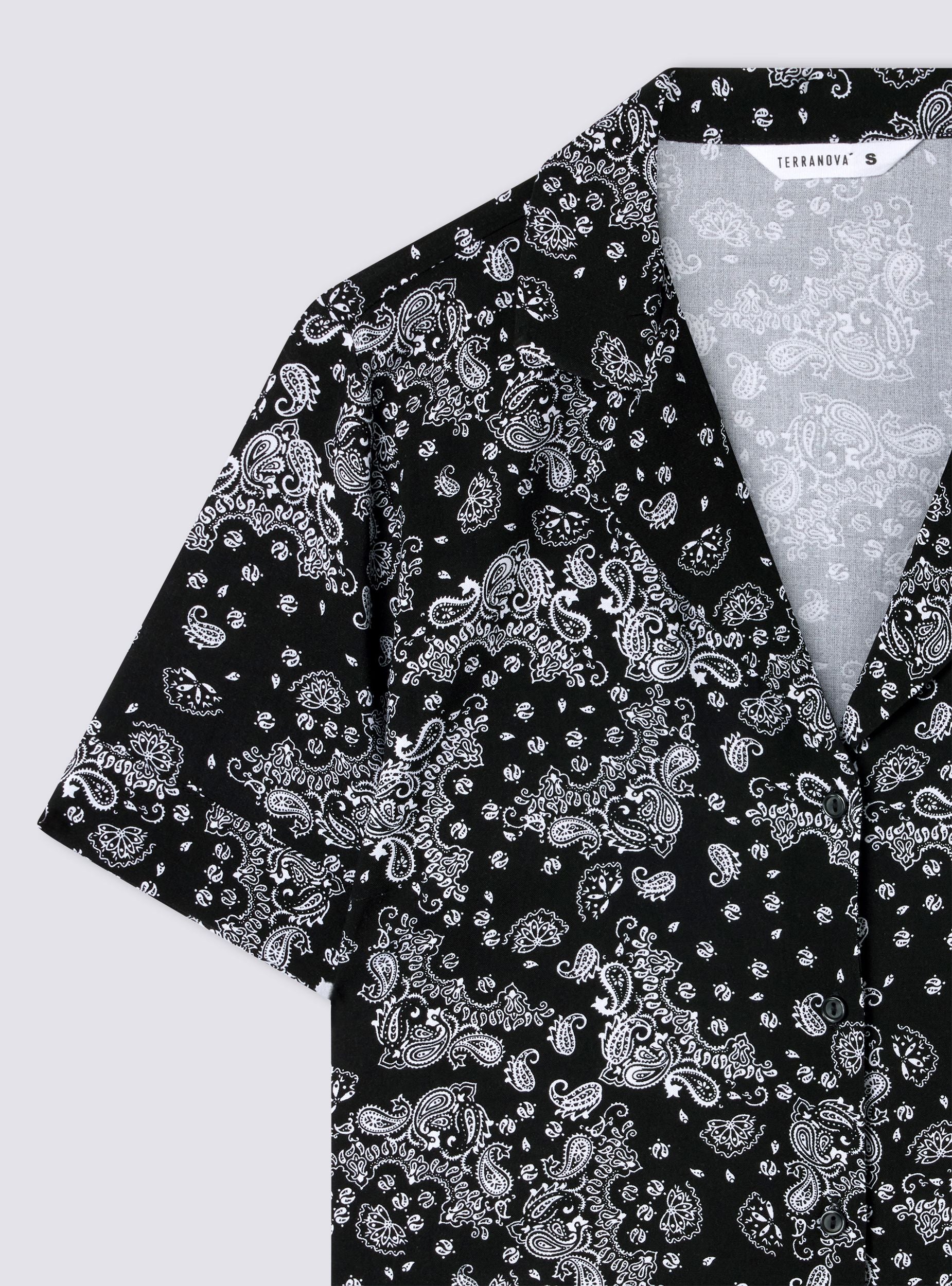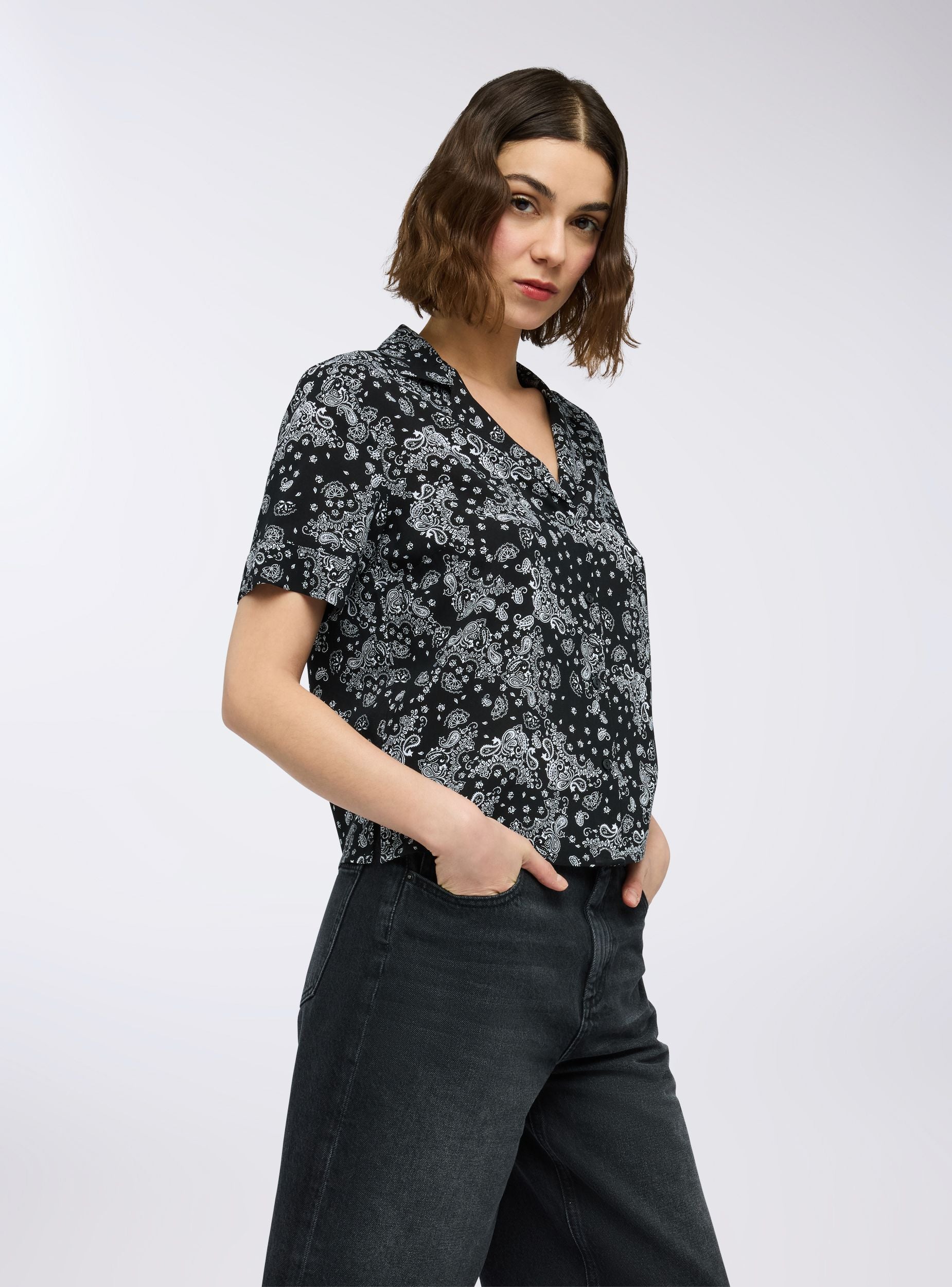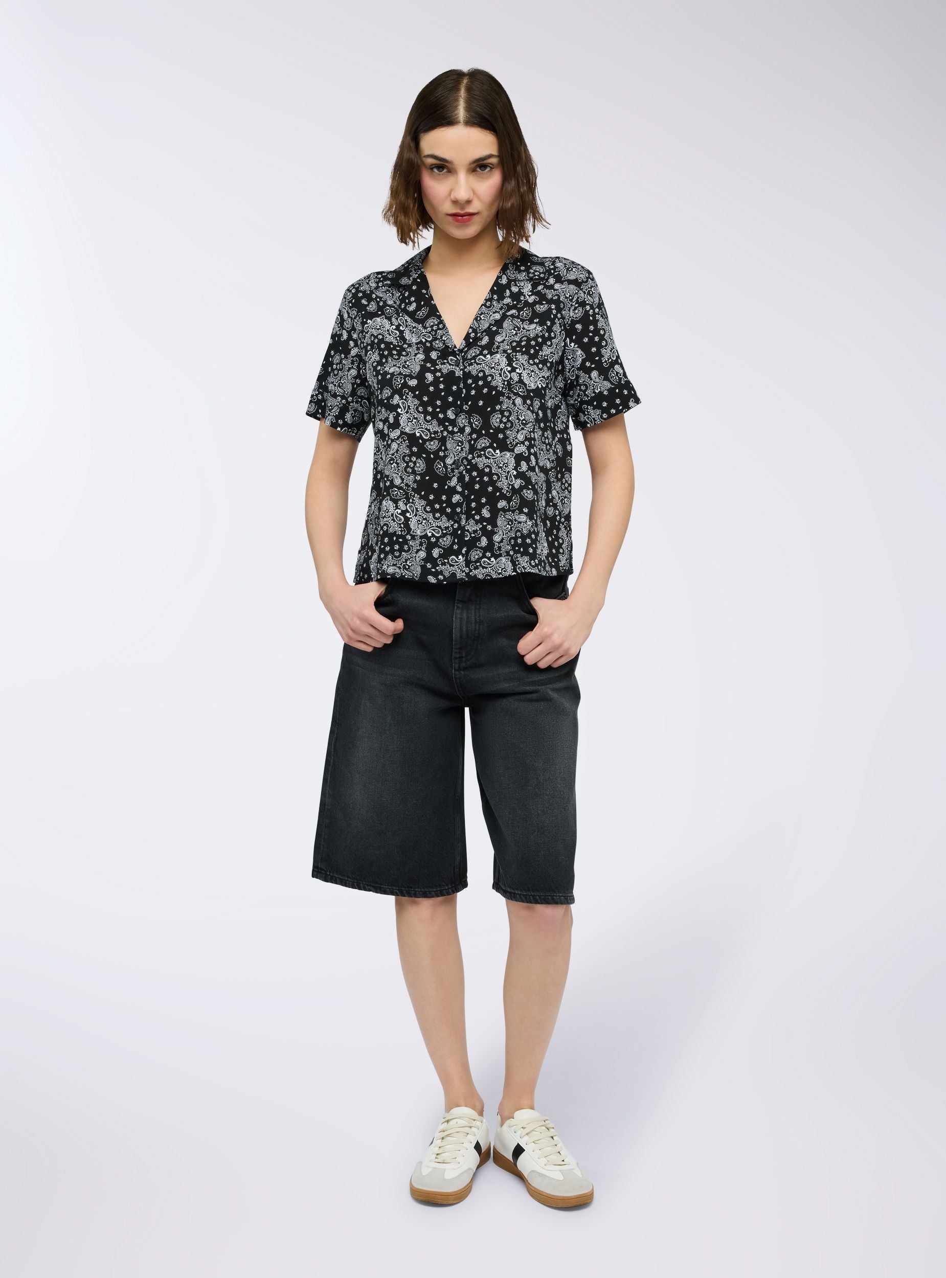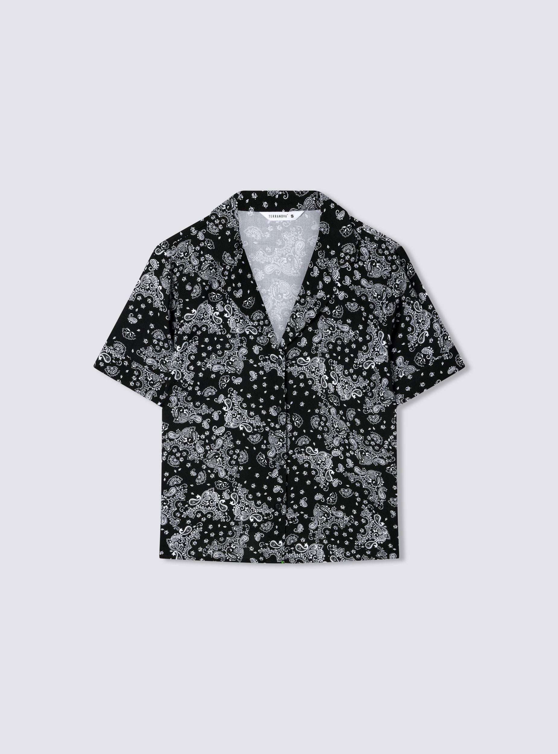 Camicia da donna dal fit ampio, perfetta per chi cerca uno stile rilassato e contemporaneo. Il design a maniche corte la rende ideale per le giornate più calde, mentre la stampa bandana dona un tocco distintivo e di tendenza. La chiusura con bottoni aggiunge un dettaglio pratico e versatile, permettendo di indossarla sia aperta che chiusa per diverse combinazioni di outfit.