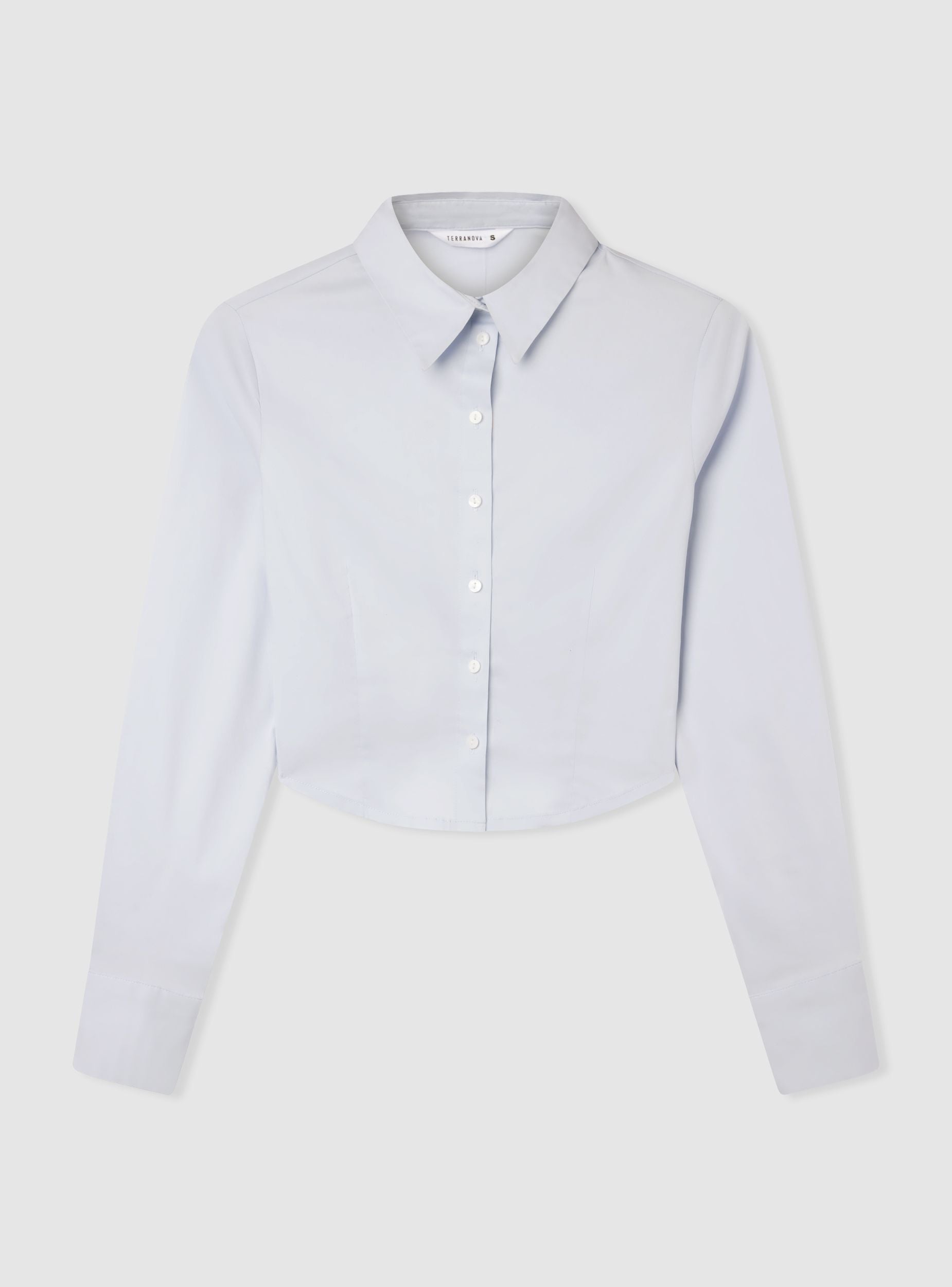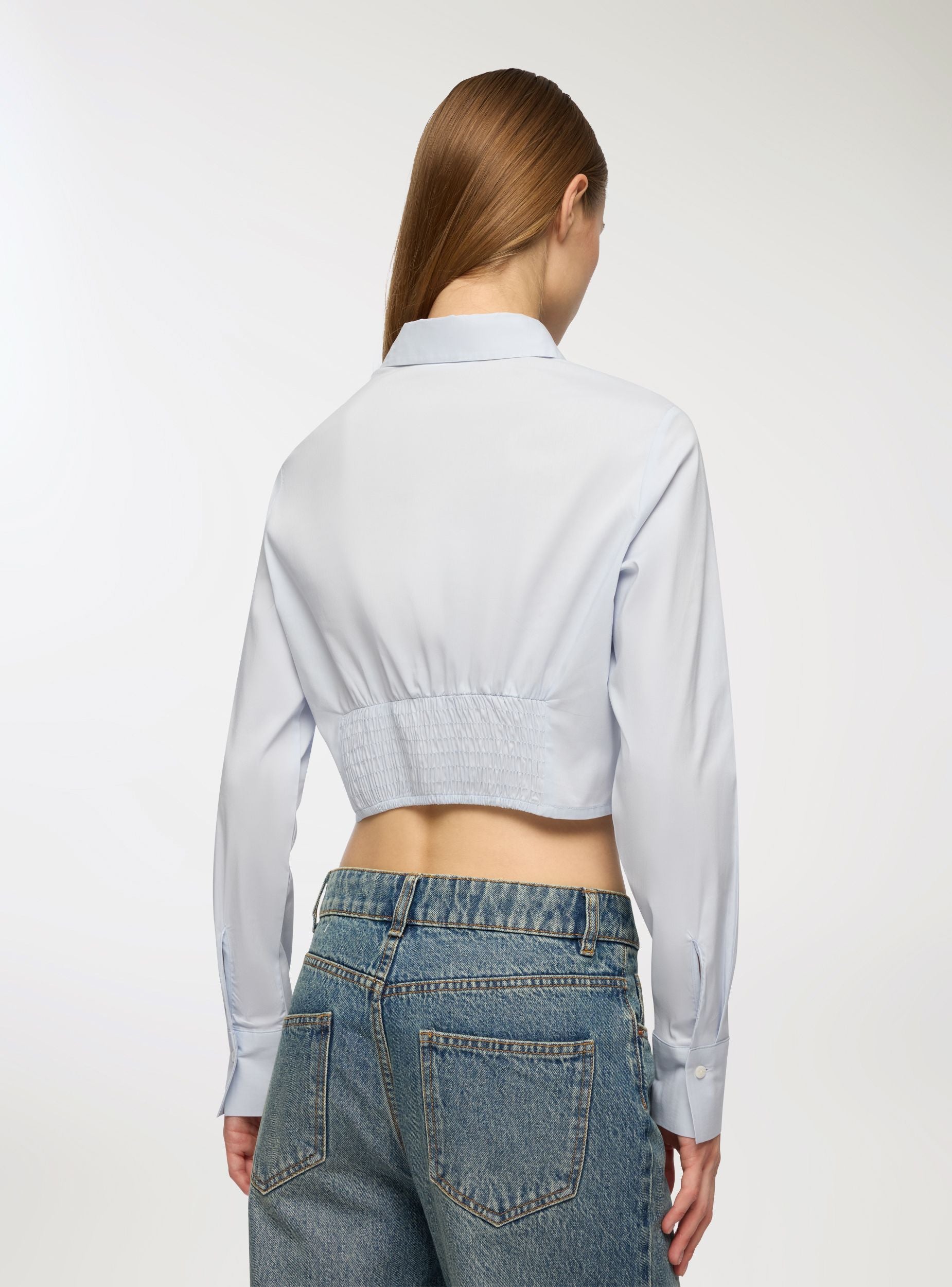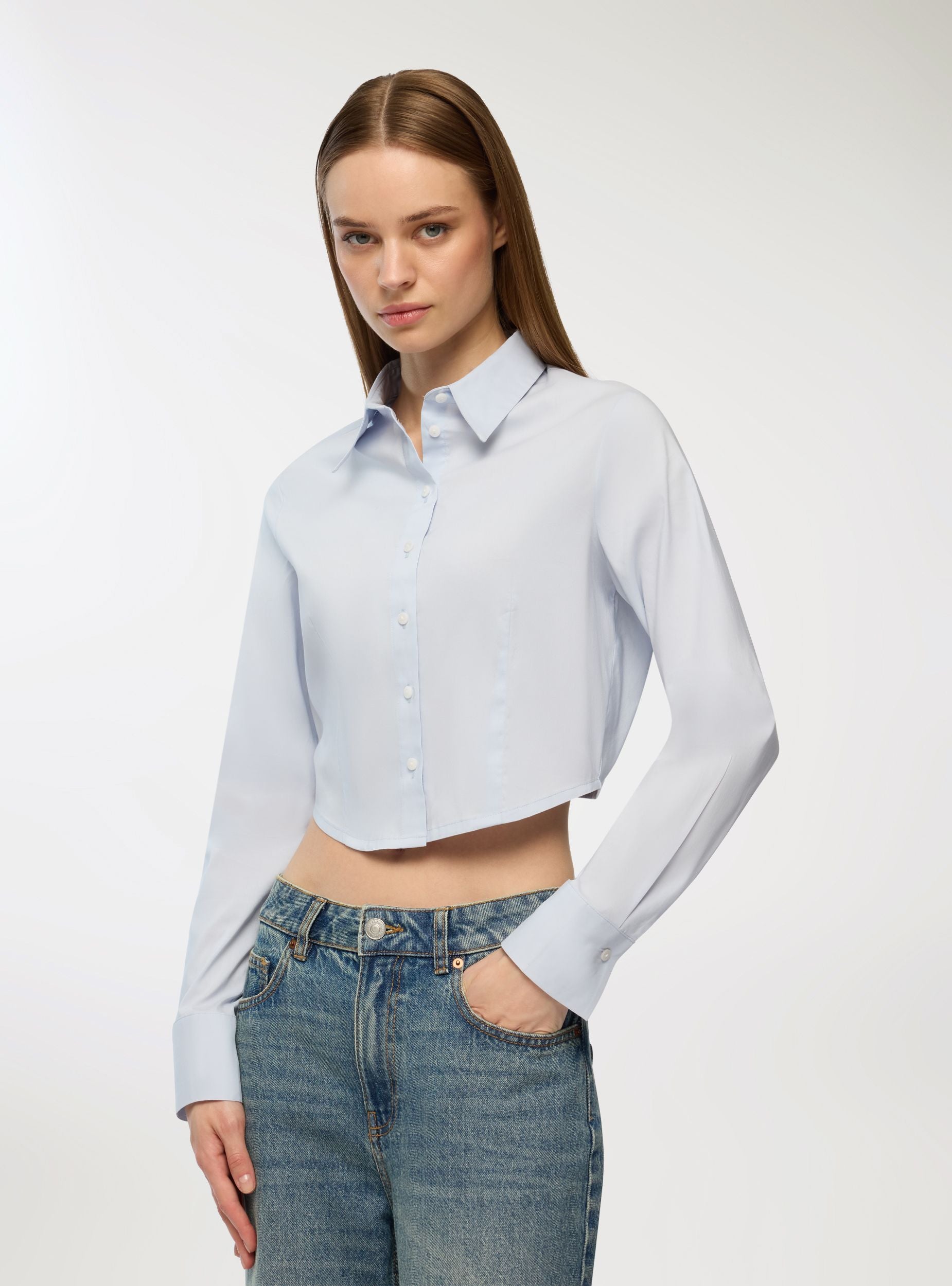Camicia da donna cropped a tinta unita, ideale per look urbani e contemporanei. Il modello presenta colletto classico, maniche lunghe e chiusura frontale con bottoni. Il retro è caratterizzato da un inserto in punto smock che dona un tocco moderno e valorizza la vestibilità. Perfetta da abbinare a pantaloni a vita alta o gonne per outfit versatili, adatta sia per l'ufficio che per il tempo libero.