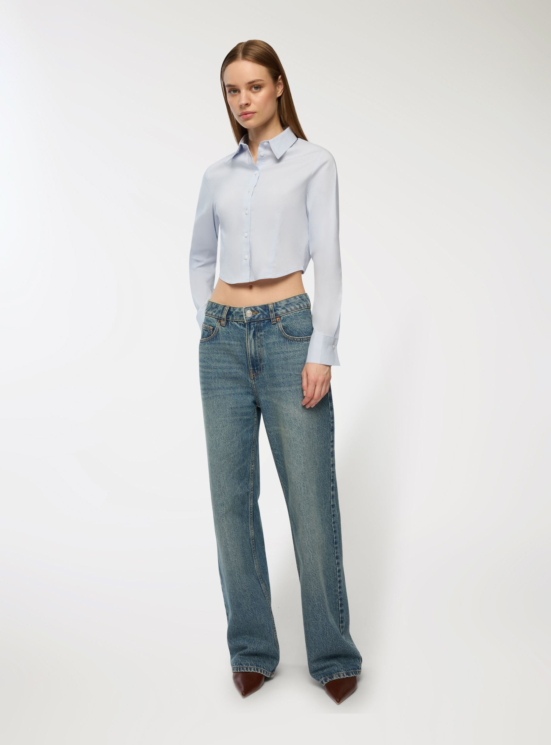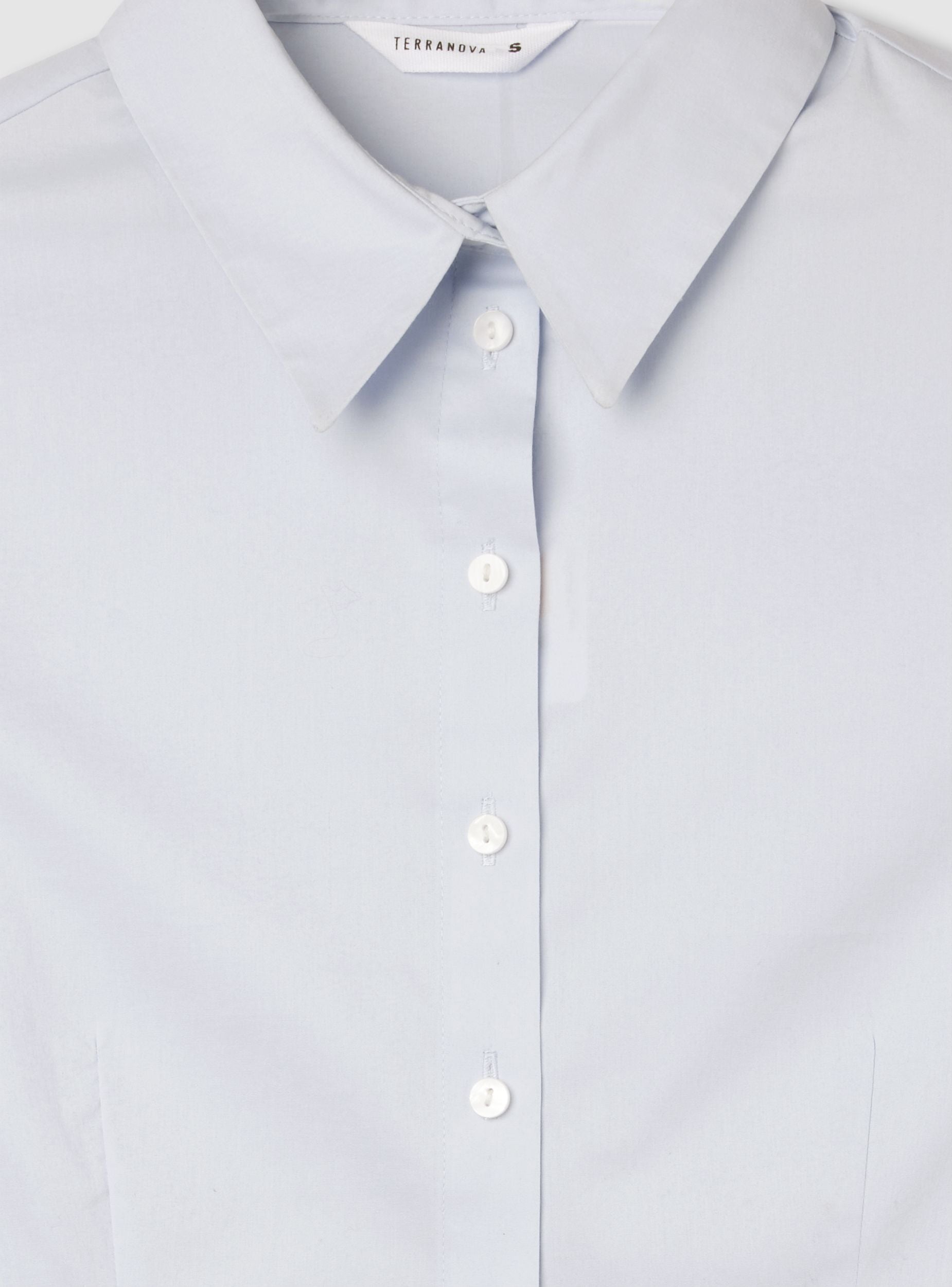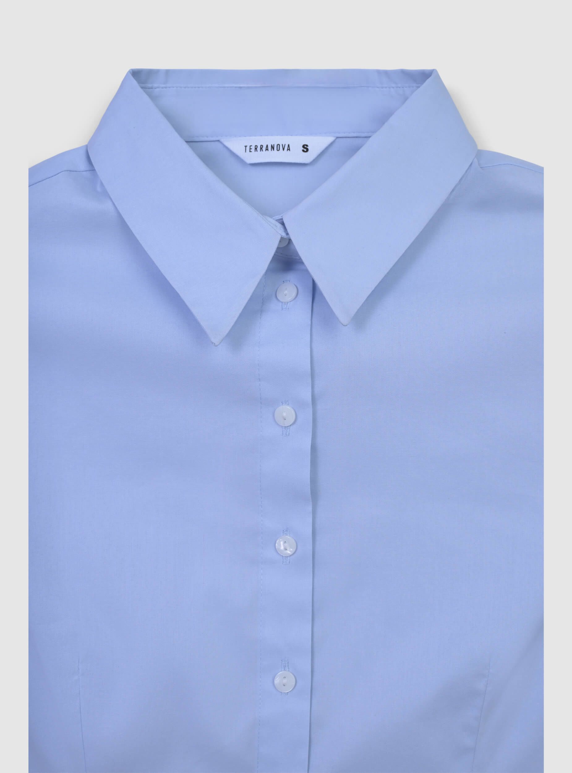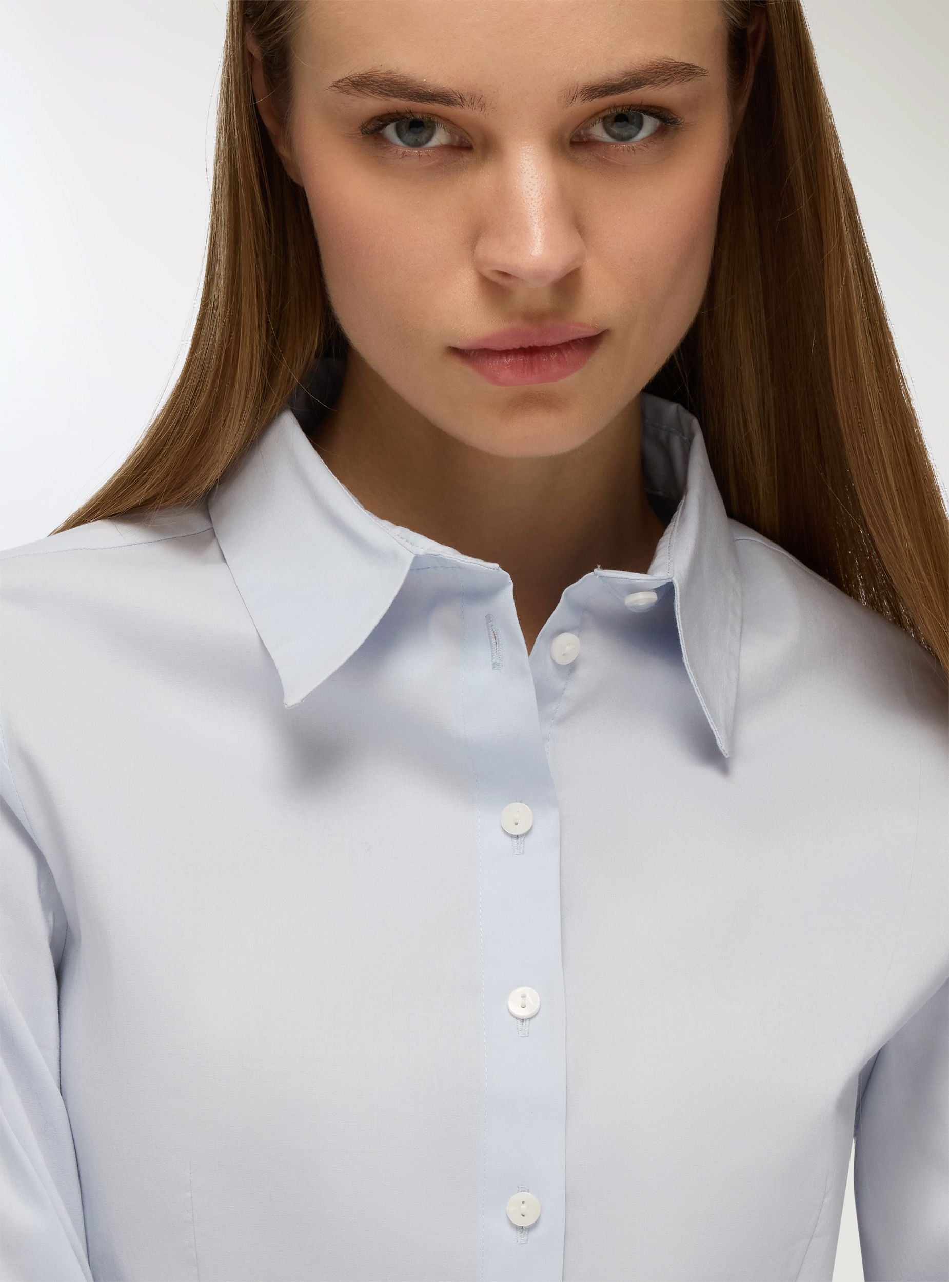Camicia da donna cropped a tinta unita, ideale per look urbani e contemporanei. Il modello presenta colletto classico, maniche lunghe e chiusura frontale con bottoni. Il retro è caratterizzato da un inserto in punto smock che dona un tocco moderno e valorizza la vestibilità. Perfetta da abbinare a pantaloni a vita alta o gonne per outfit versatili, adatta sia per l'ufficio che per il tempo libero.