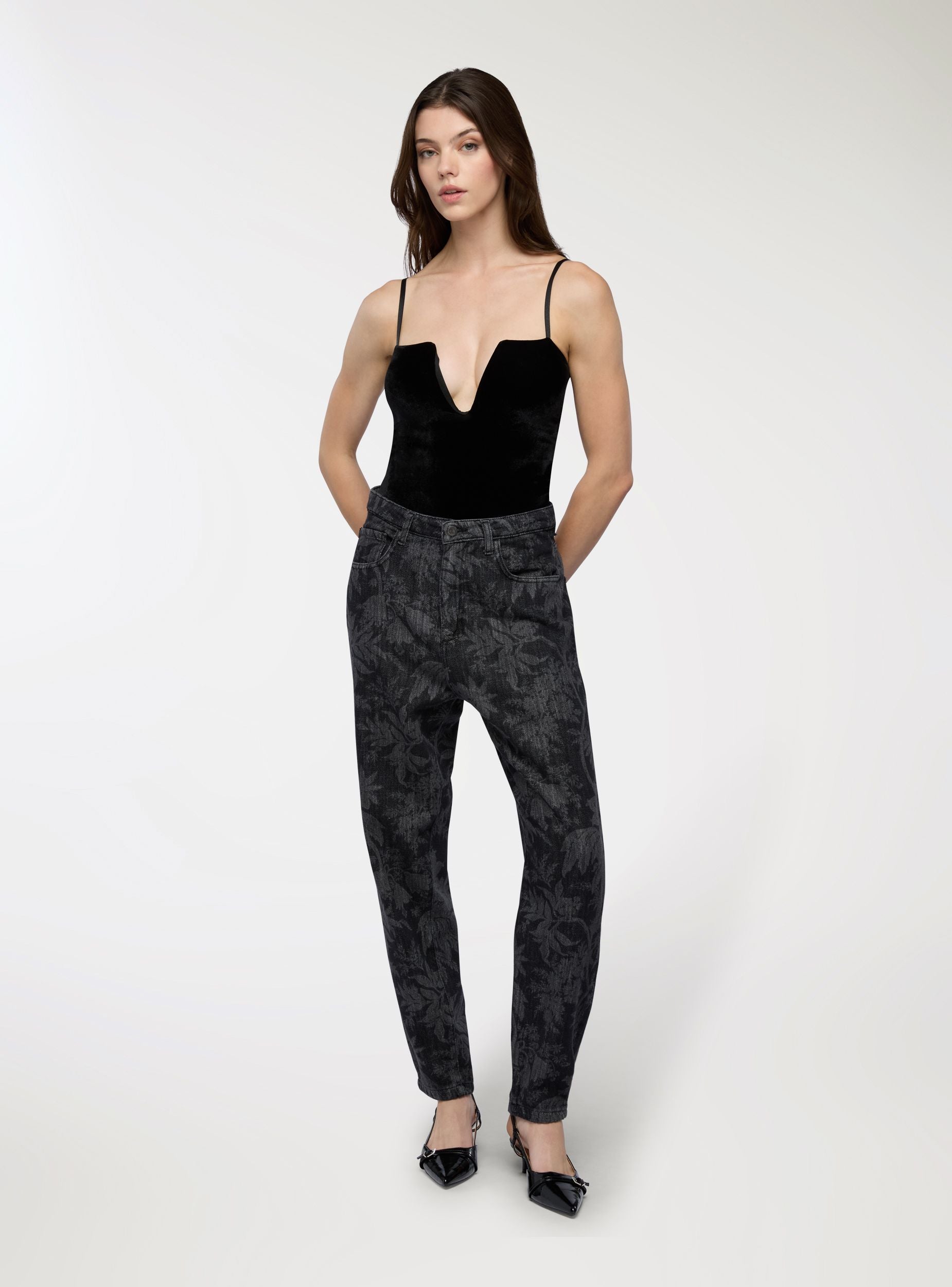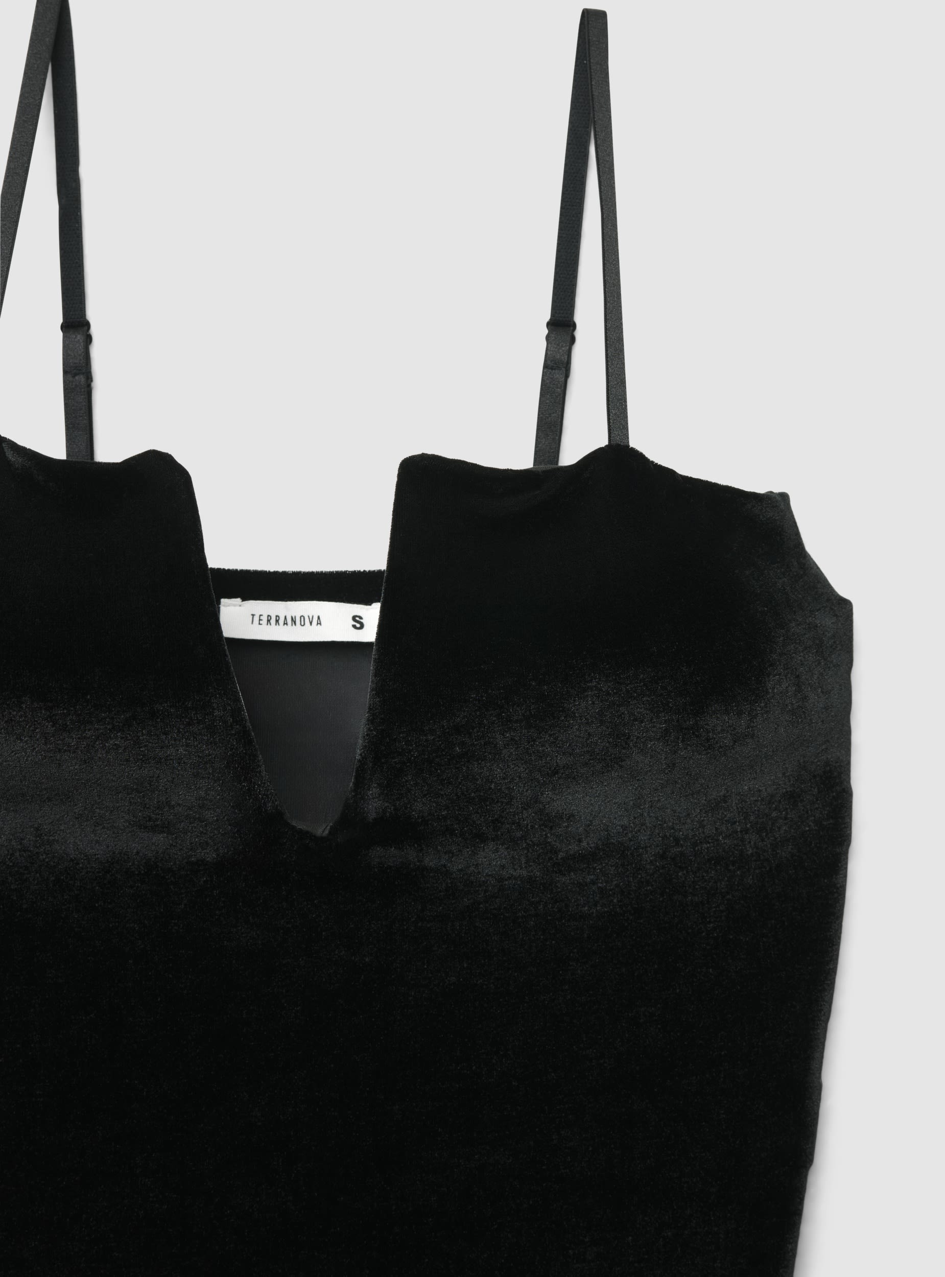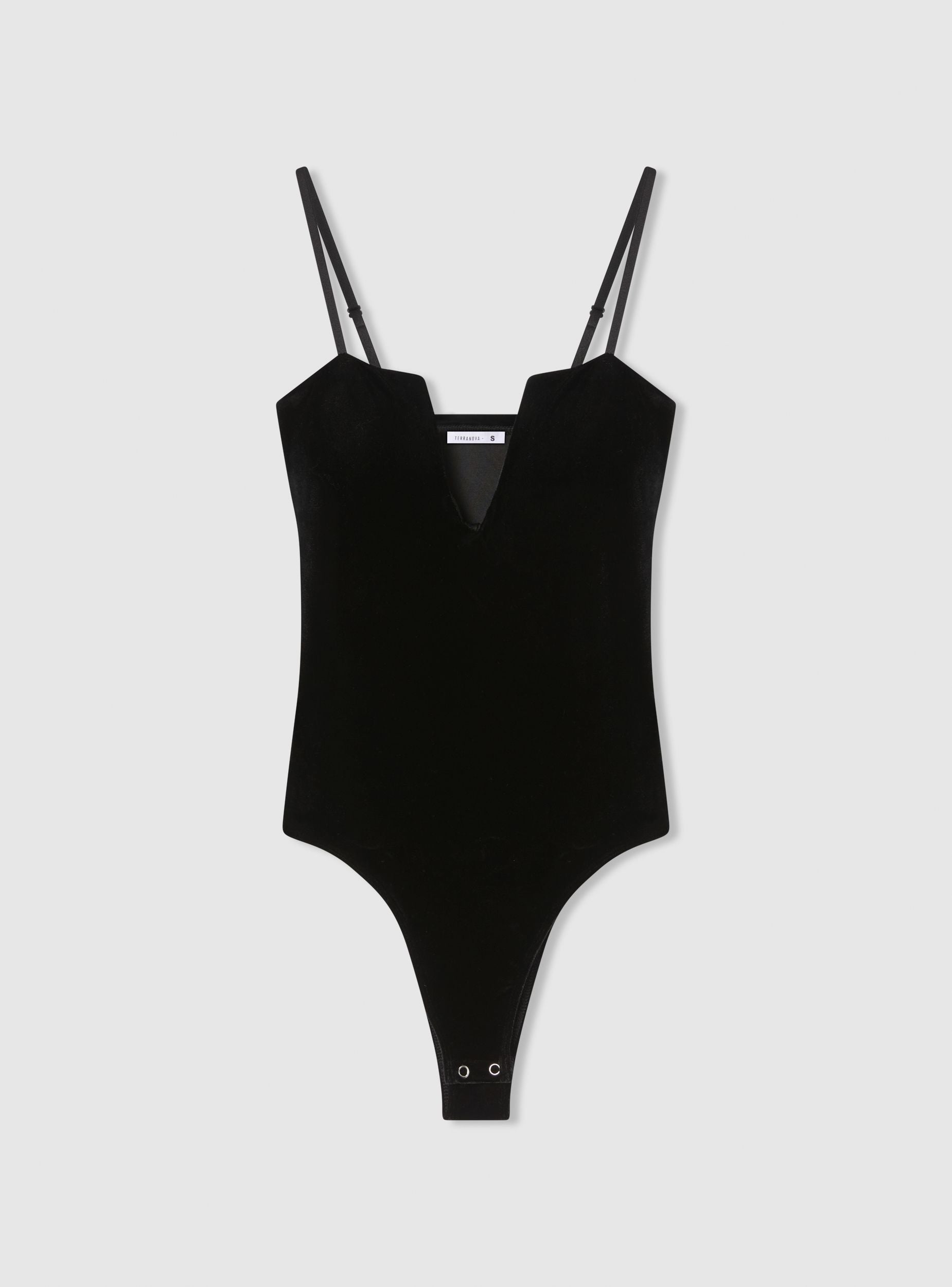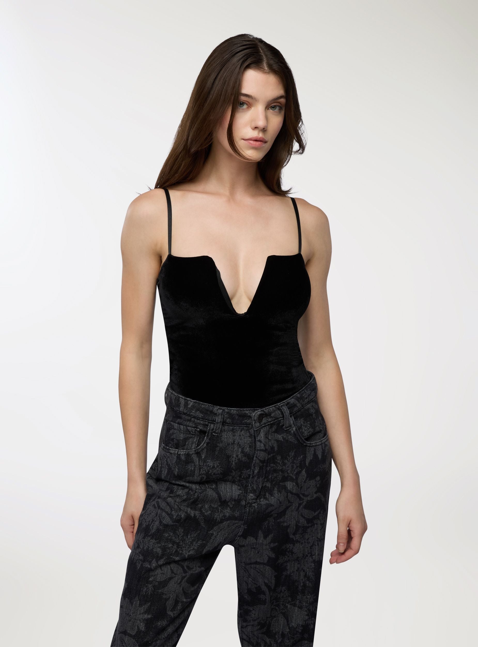Body da donna in effetto velluto a tinta unita con spalline sottili regolabili e scollo a V con intaglio centrale. Chiusura con bottoni a pressione per indossarlo con praticità. Vestibilità regolare che segue la silhouette senza costringere, ideale sotto blazer o cardigan per serate e occasioni speciali. Perfetto con jeans a vita alta o gonne midi per look eleganti e femminili.