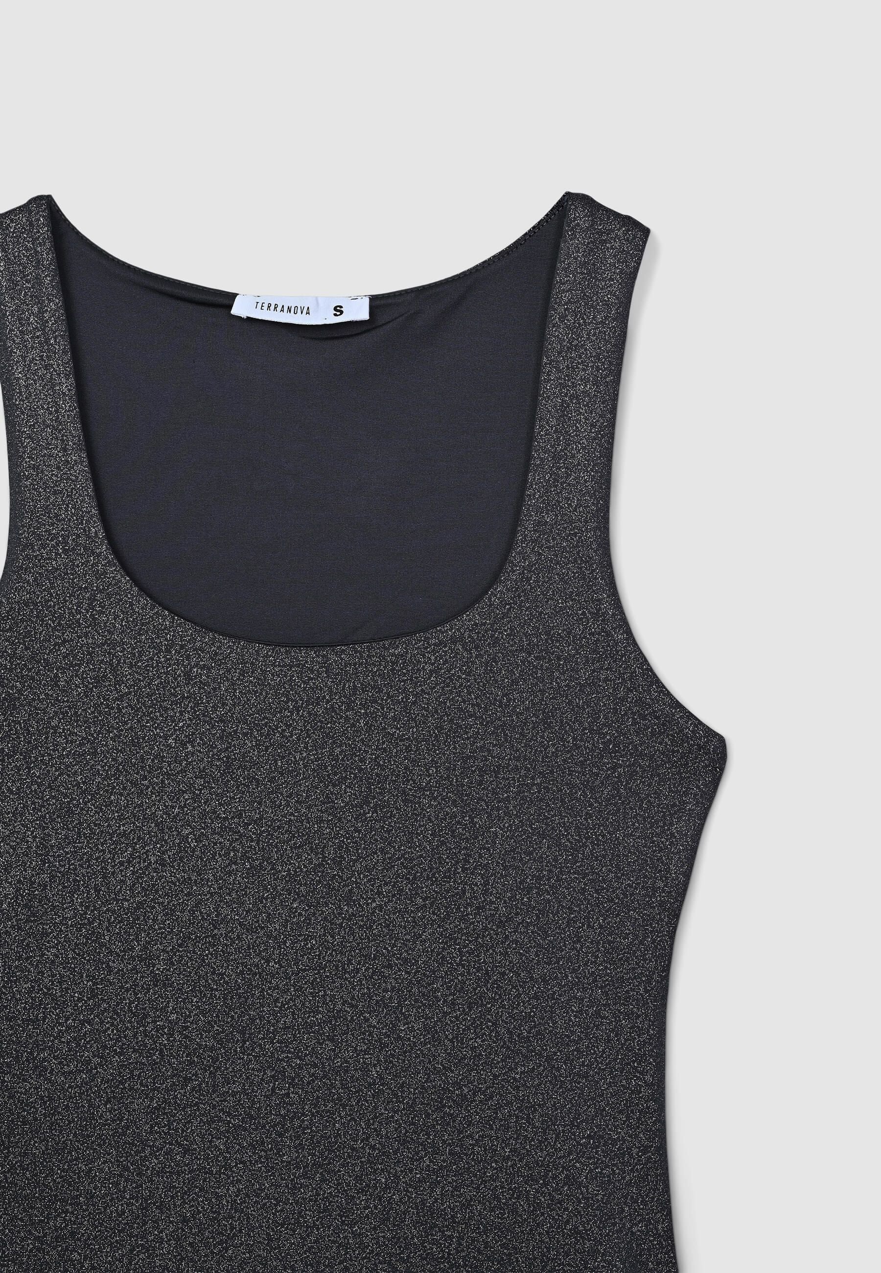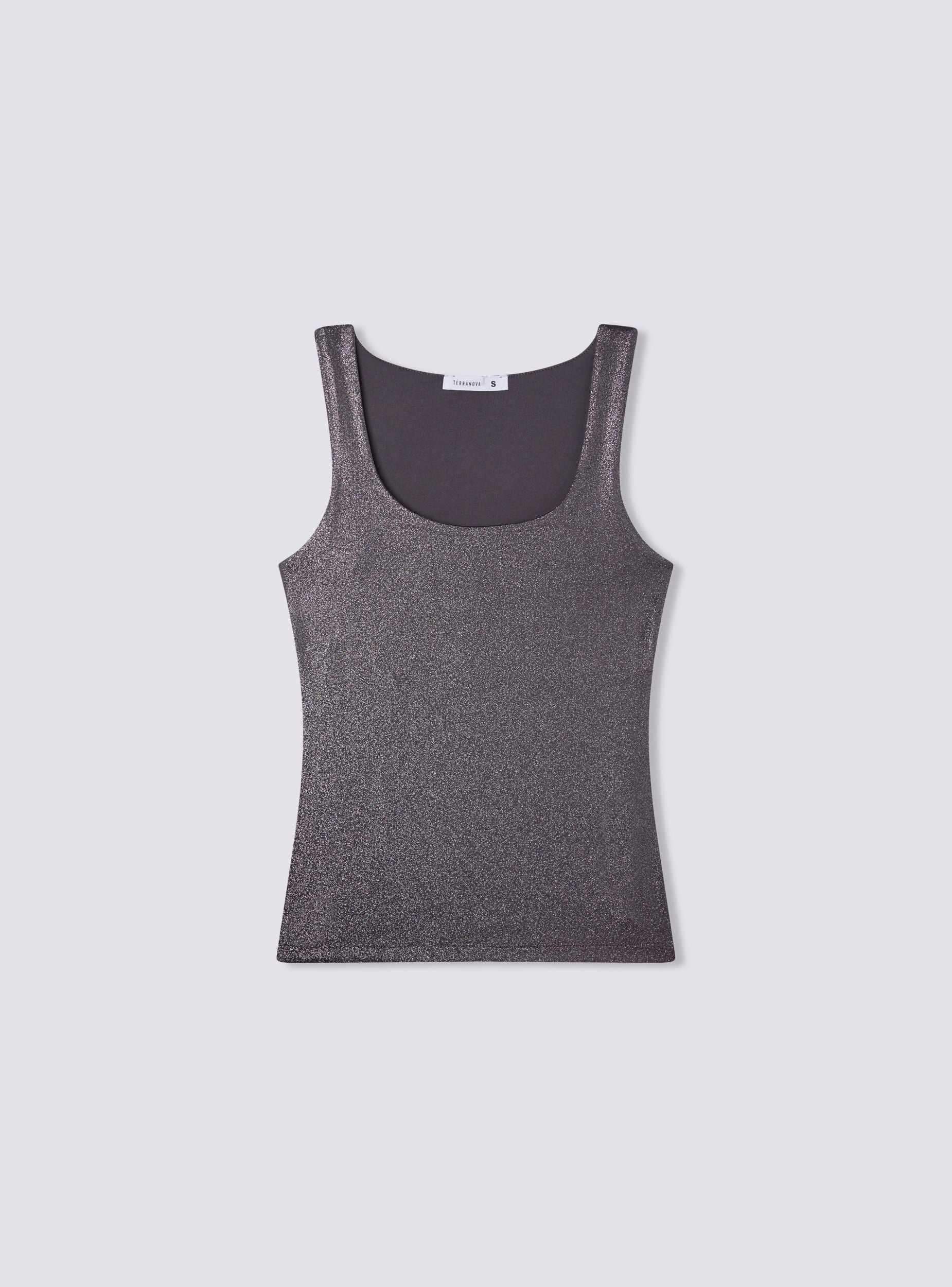 Canotta da donna con effetto luccicante che dona un tocco glamour e raffinato. Il design con scollo ampio valorizza la silhouette, rendendola perfetta per serate eleganti o eventi speciali. Facile da abbinare a pantaloni a vita alta o gonne aderenti, ideale anche indossata sotto una giacca. Un capo essenziale per brillare con stile in ogni occasione.
