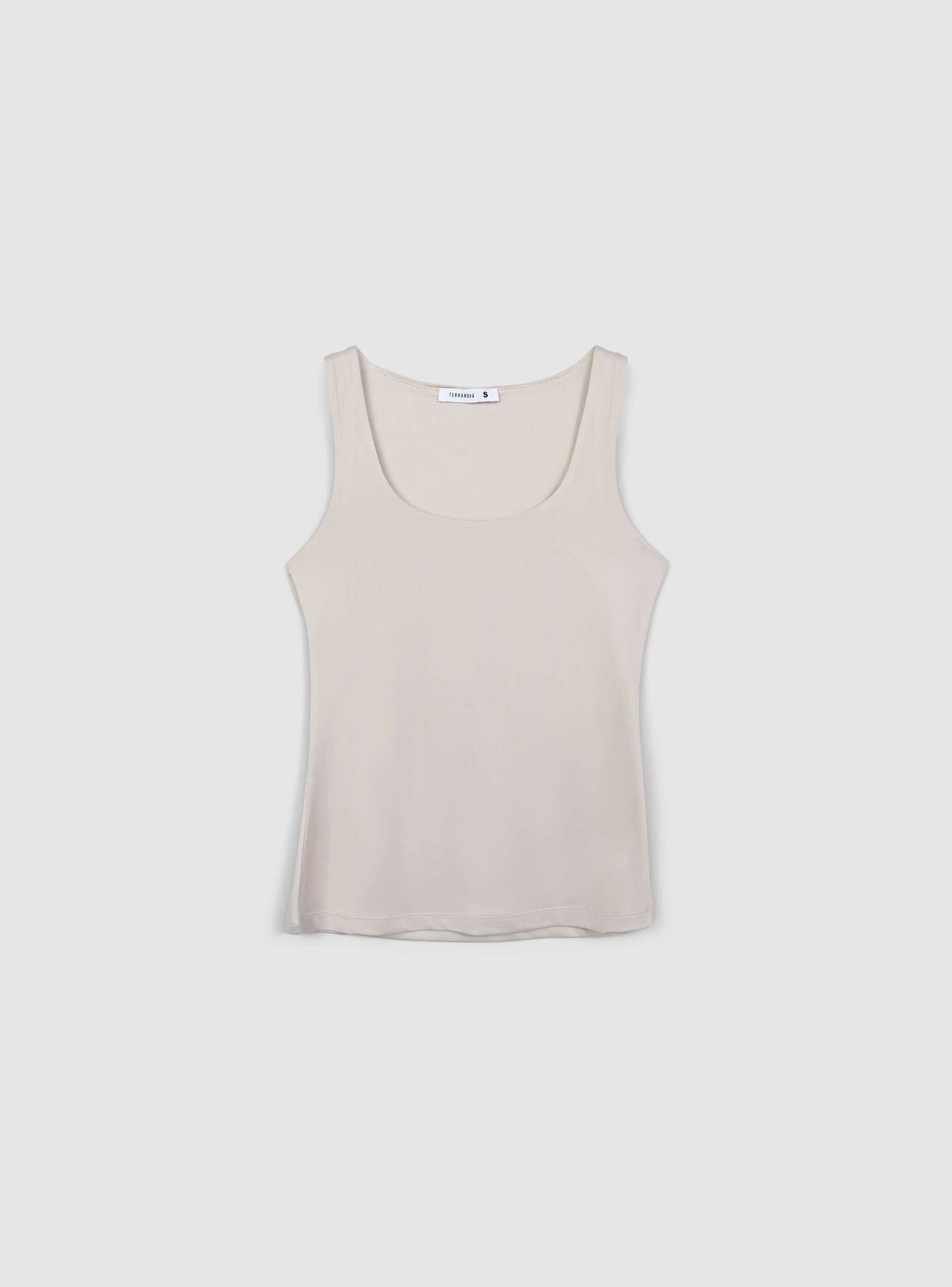 Canotta da donna caratterizzata da una tinta unita e realizzata in tessuto elasticizzato che la rende leggera e morbida sulla pelle. Il design presenta uno scollo ampio sul davanti, donando un tocco femminile e moderno. Il tessuto elasticizzato si adatta delicatamente alle forme del corpo, assicurando comfort e libertà di movimento. Ideale per la stagione estiva, grazie al suo look minimalista e pratico, perfetta per essere indossata sia come capo casual che sportivo.