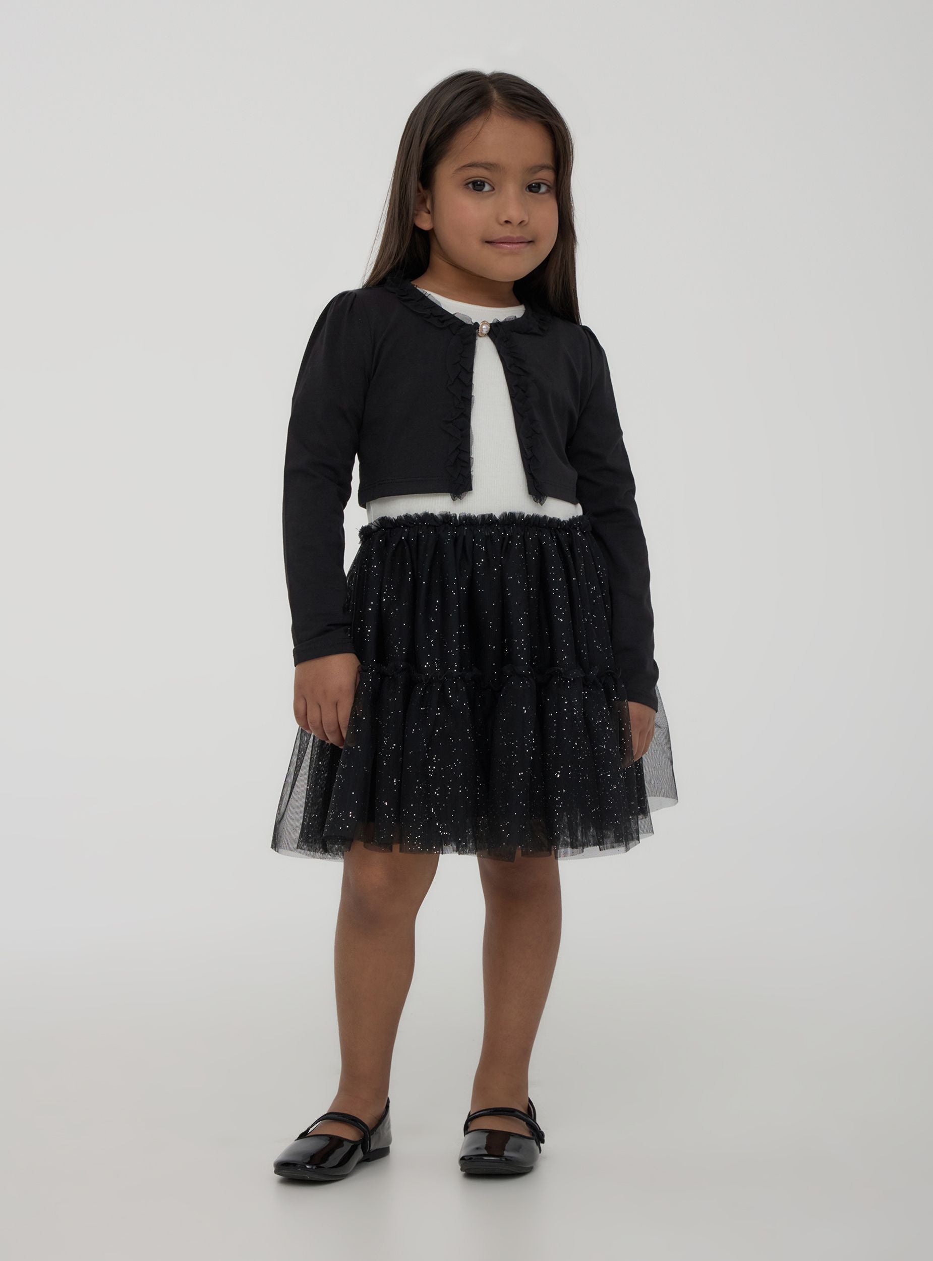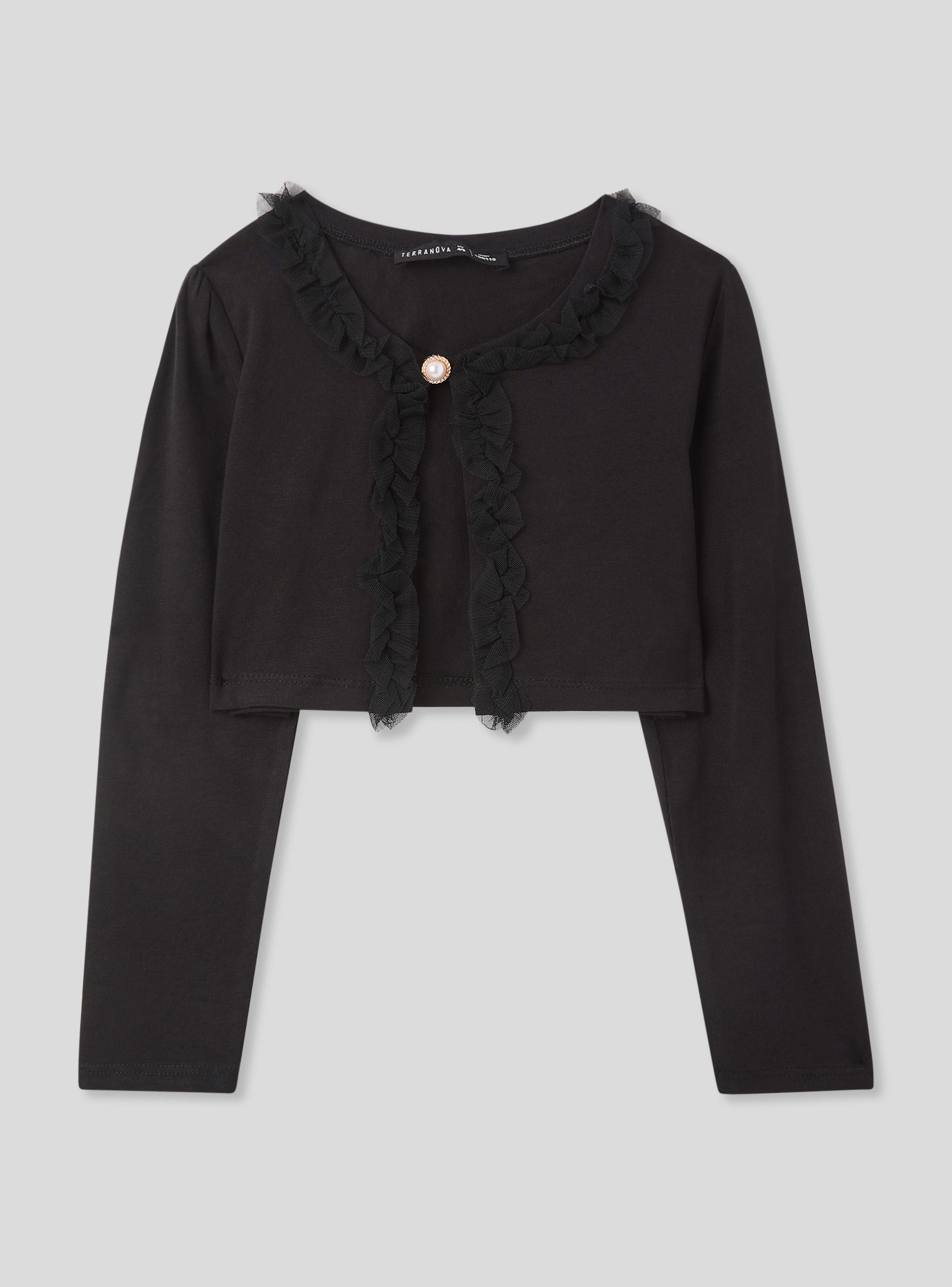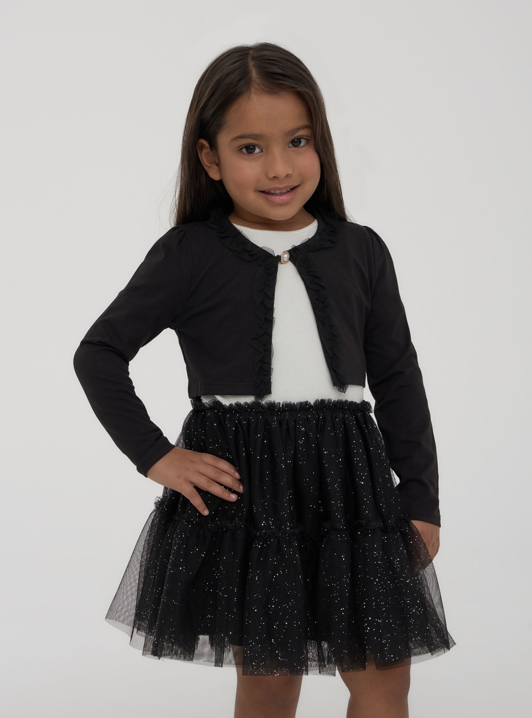 Coprispalle da bambina dal design elegante e versatile, ideale per completare outfit con un tocco raffinato. Le maniche lunghe e il taglio corto lo rendono perfetto per essere indossato sopra abiti o maglie, garantendo comfort e stile. La decorazione sul davanti dona un effetto delicato e femminile, mentre il taglio ben definito valorizza la silhouette con semplicità.