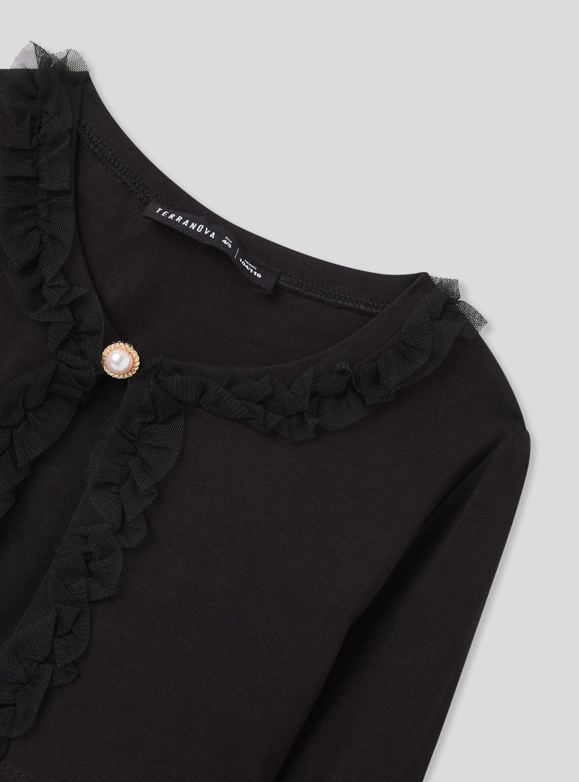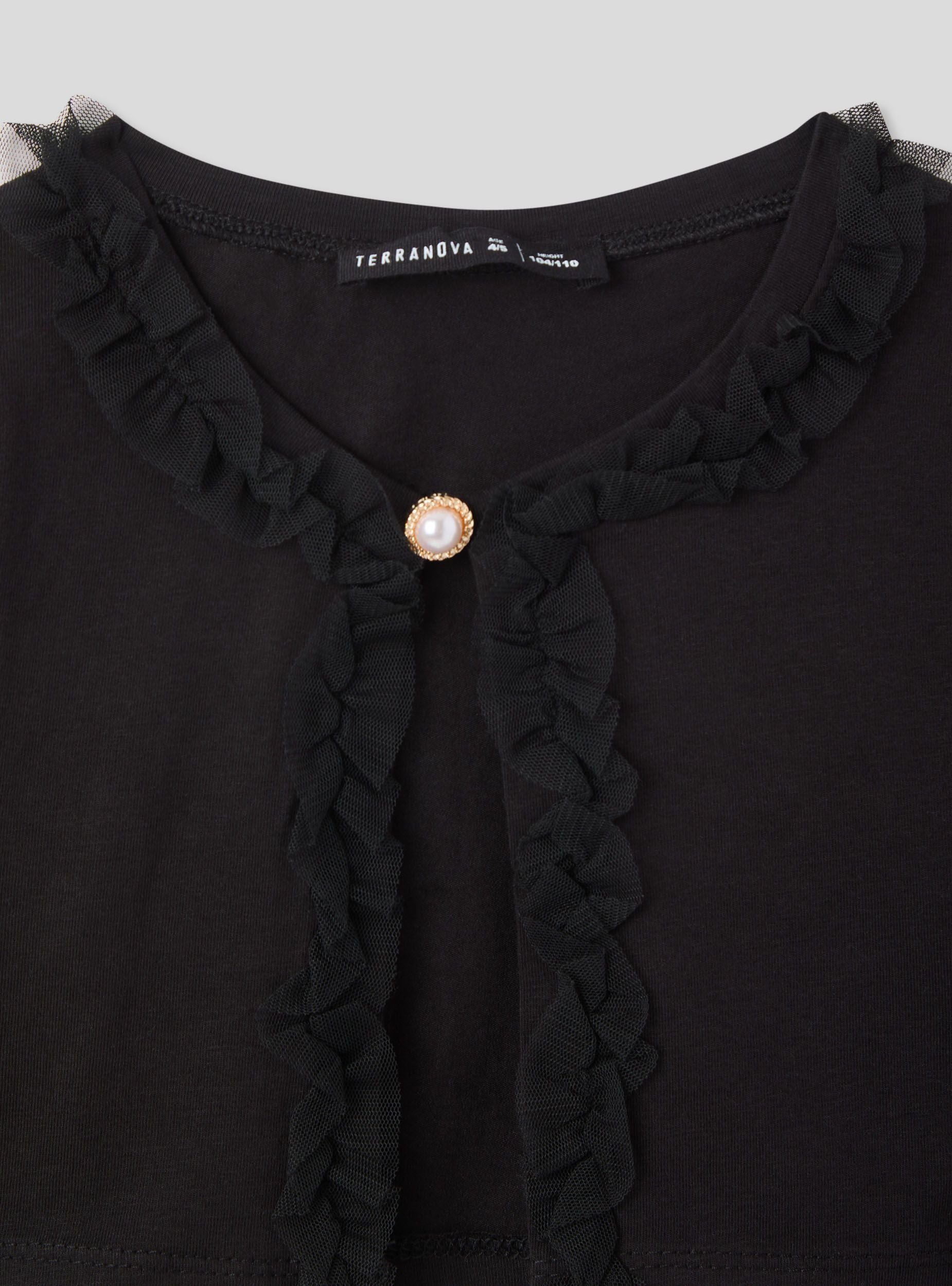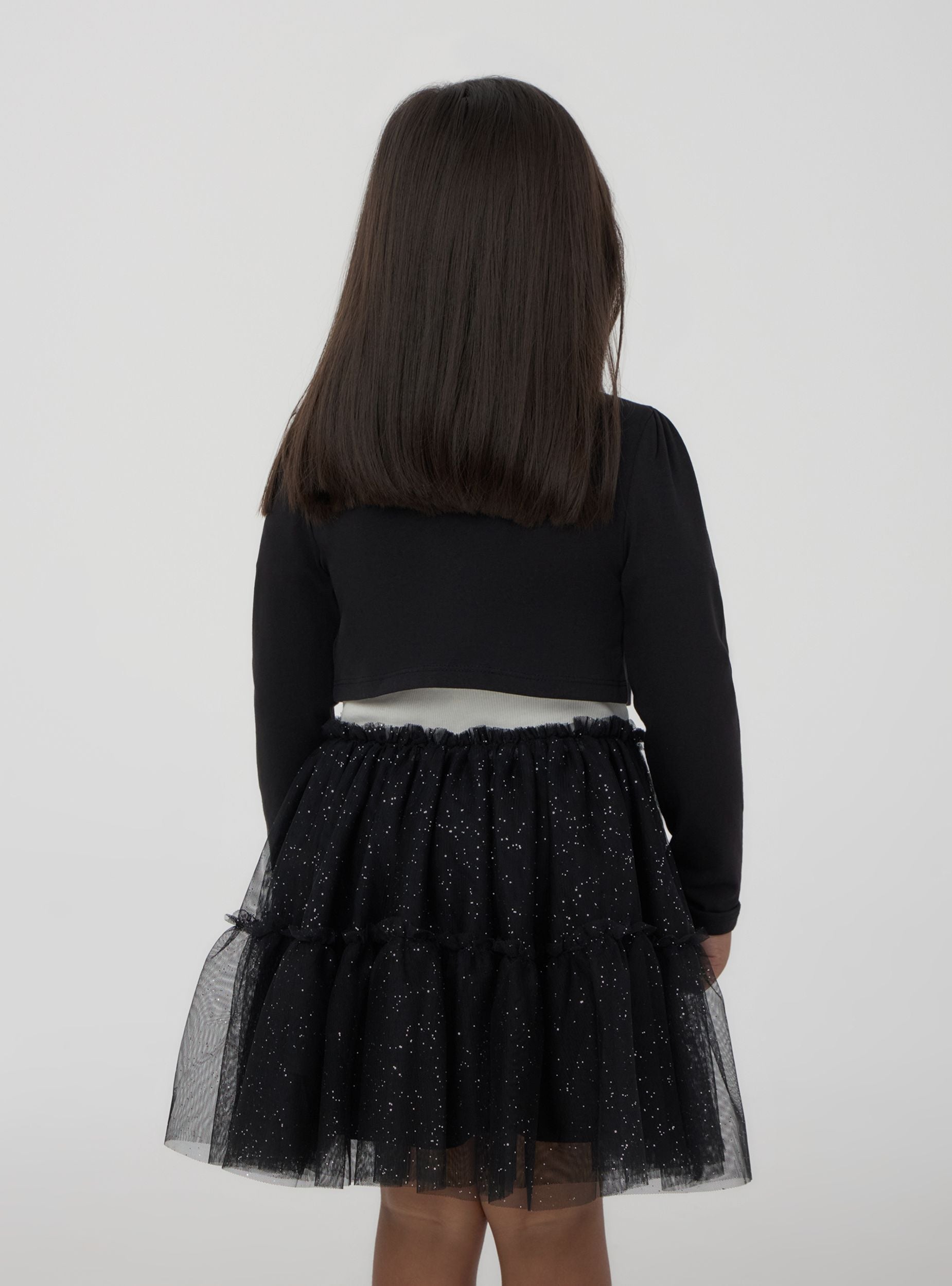 Coprispalle da bambina dal design elegante e versatile, ideale per completare outfit con un tocco raffinato. Le maniche lunghe e il taglio corto lo rendono perfetto per essere indossato sopra abiti o maglie, garantendo comfort e stile. La decorazione sul davanti dona un effetto delicato e femminile, mentre il taglio ben definito valorizza la silhouette con semplicità.