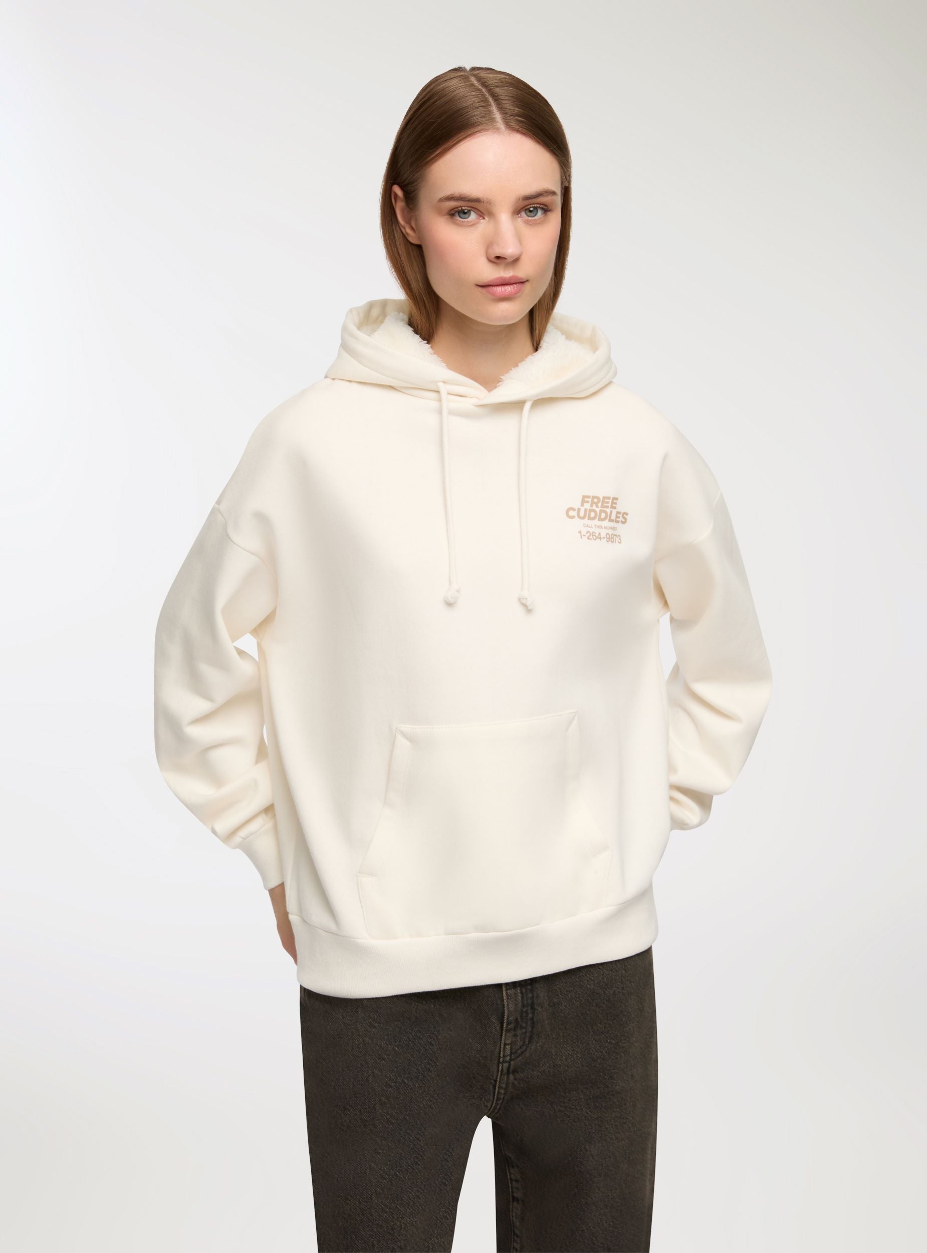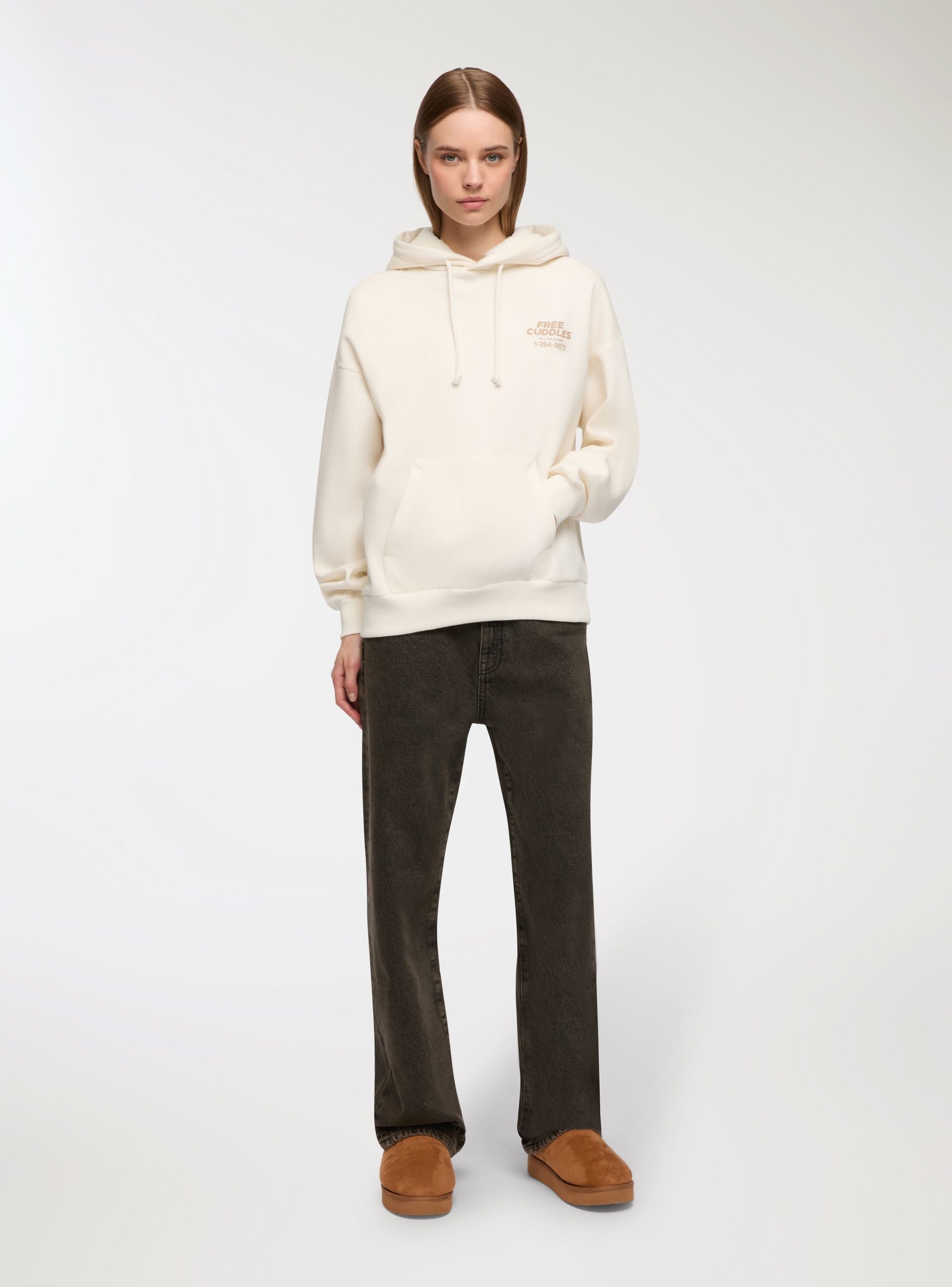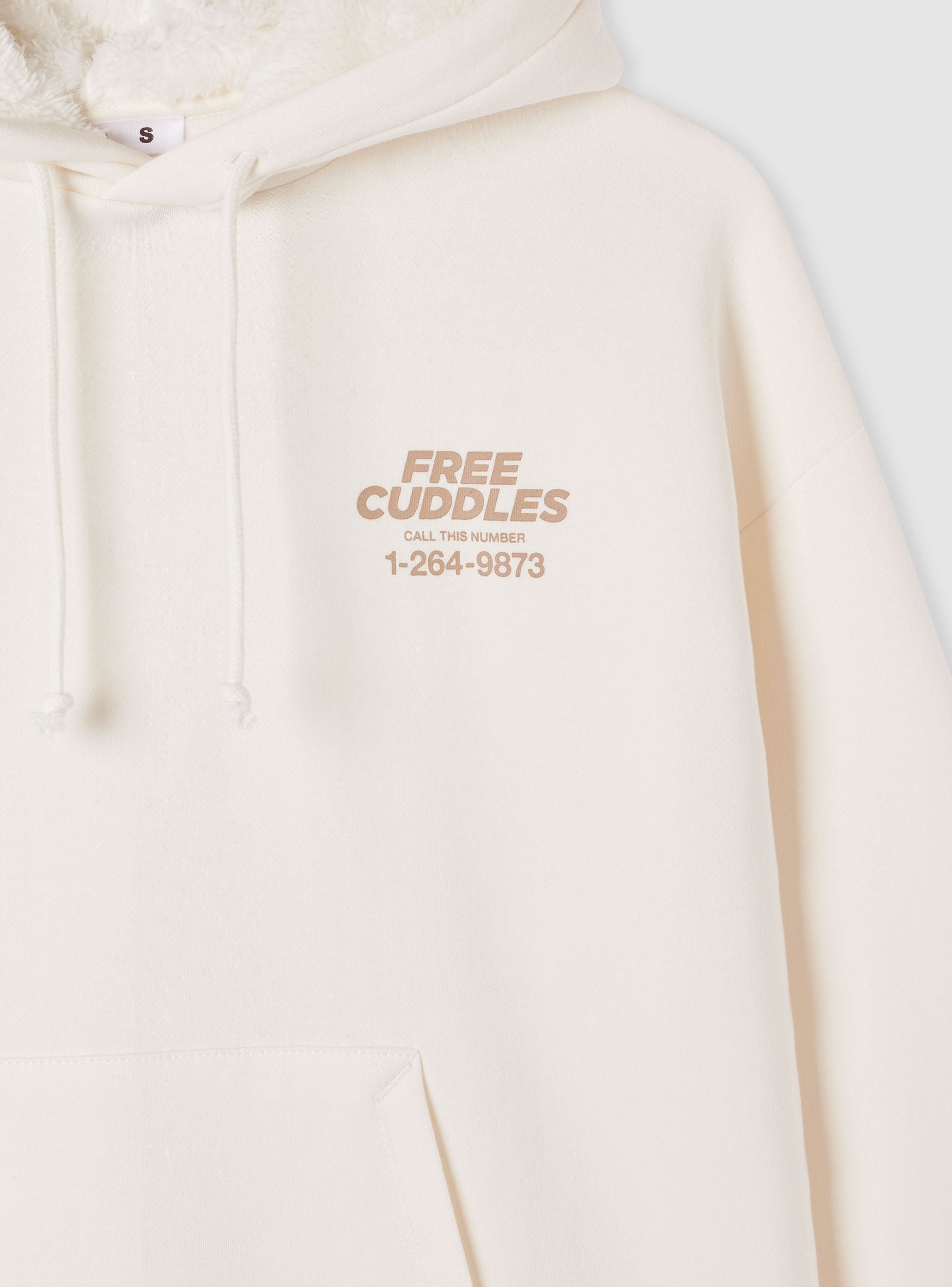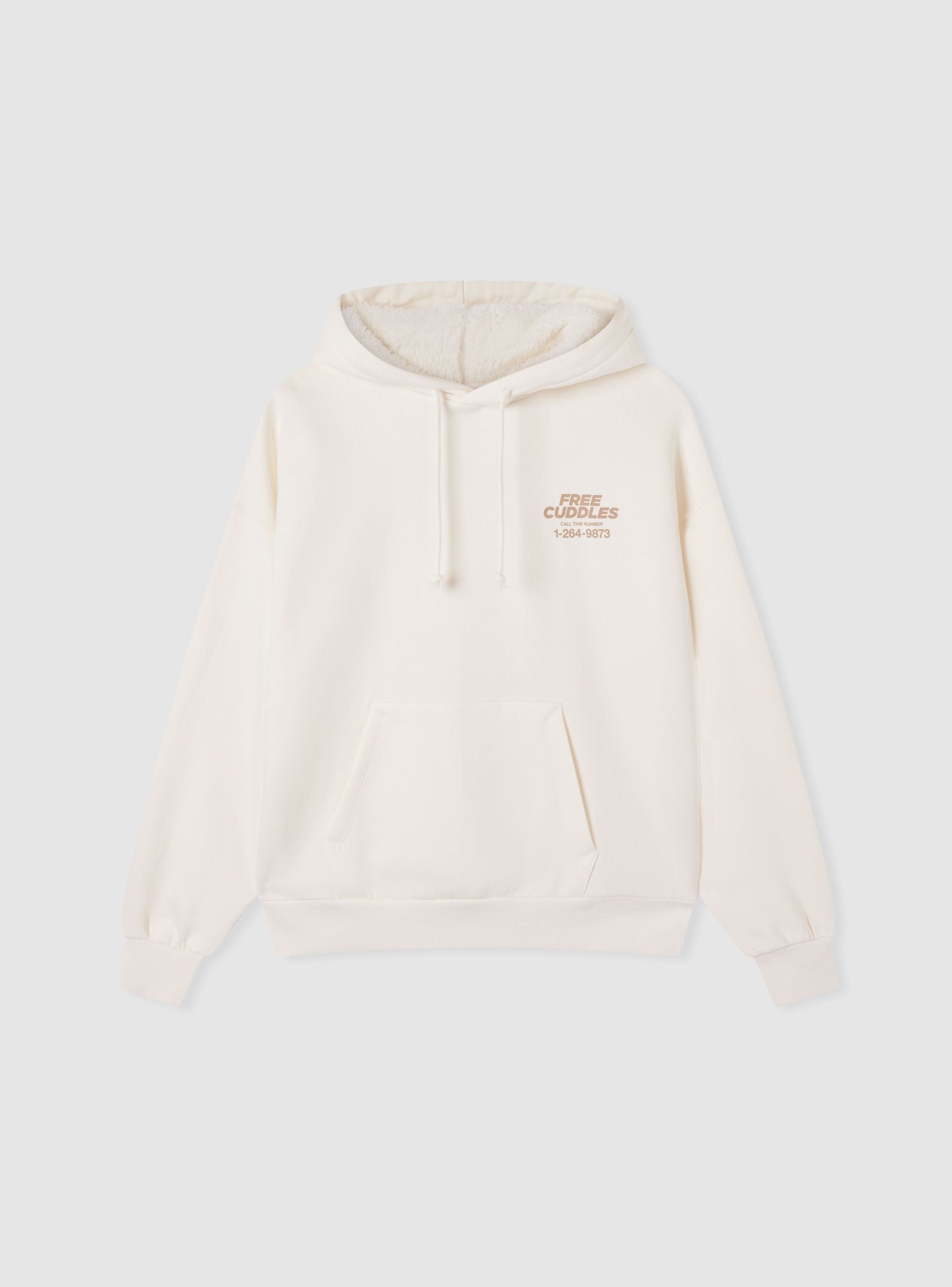 Felpa pesante da donna perfetta per l’inverno, con cappuccio foderato in morbido sherpa per un comfort extra. Modello chiuso, senza zip, dotato di coulisse regolabile e ampia tasca a marsupio. La stampa “Free Cuddles” con orsetto sul retro aggiunge un tocco giocoso e originale, mentre il fronte presenta una stampa più piccola. Un capo caldo e accattivante, ideale per look casual e rilassati.