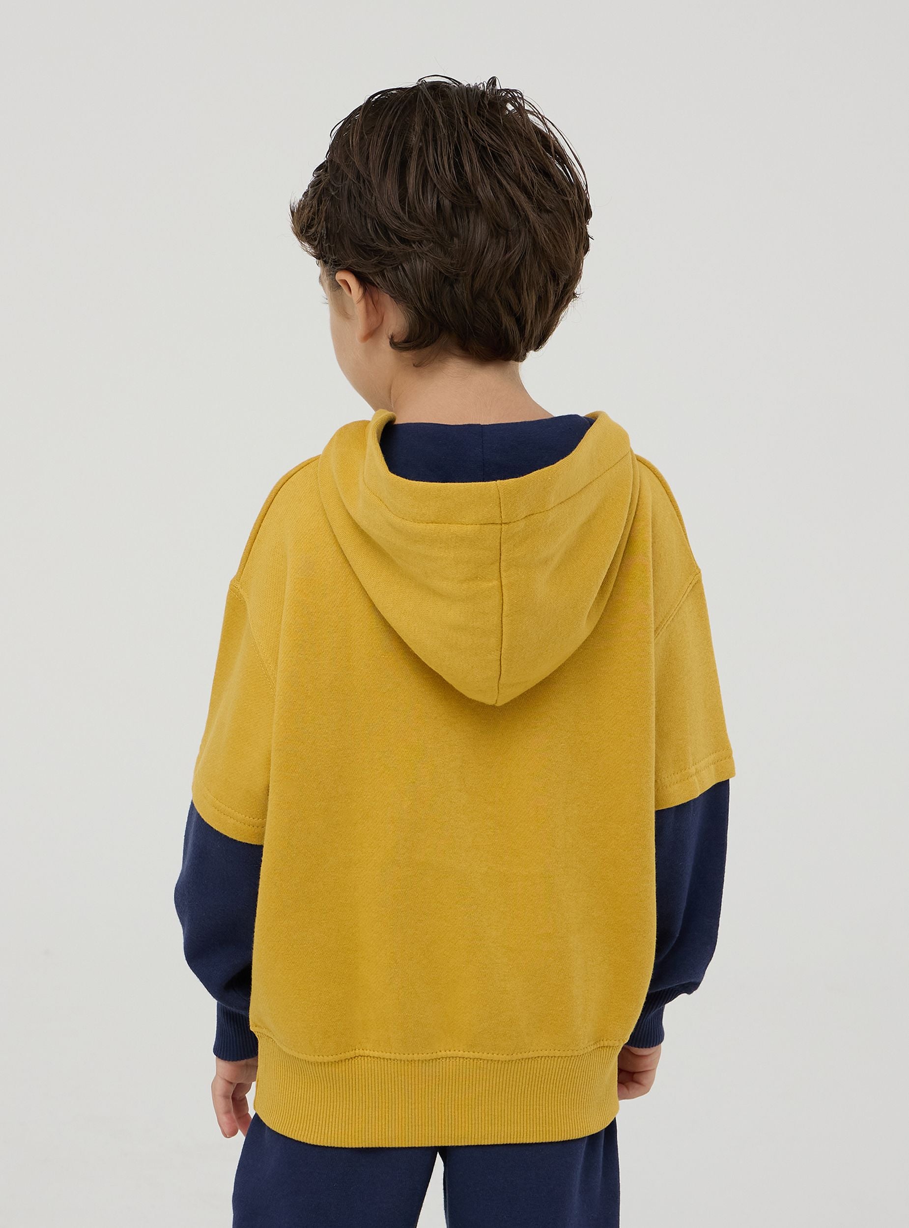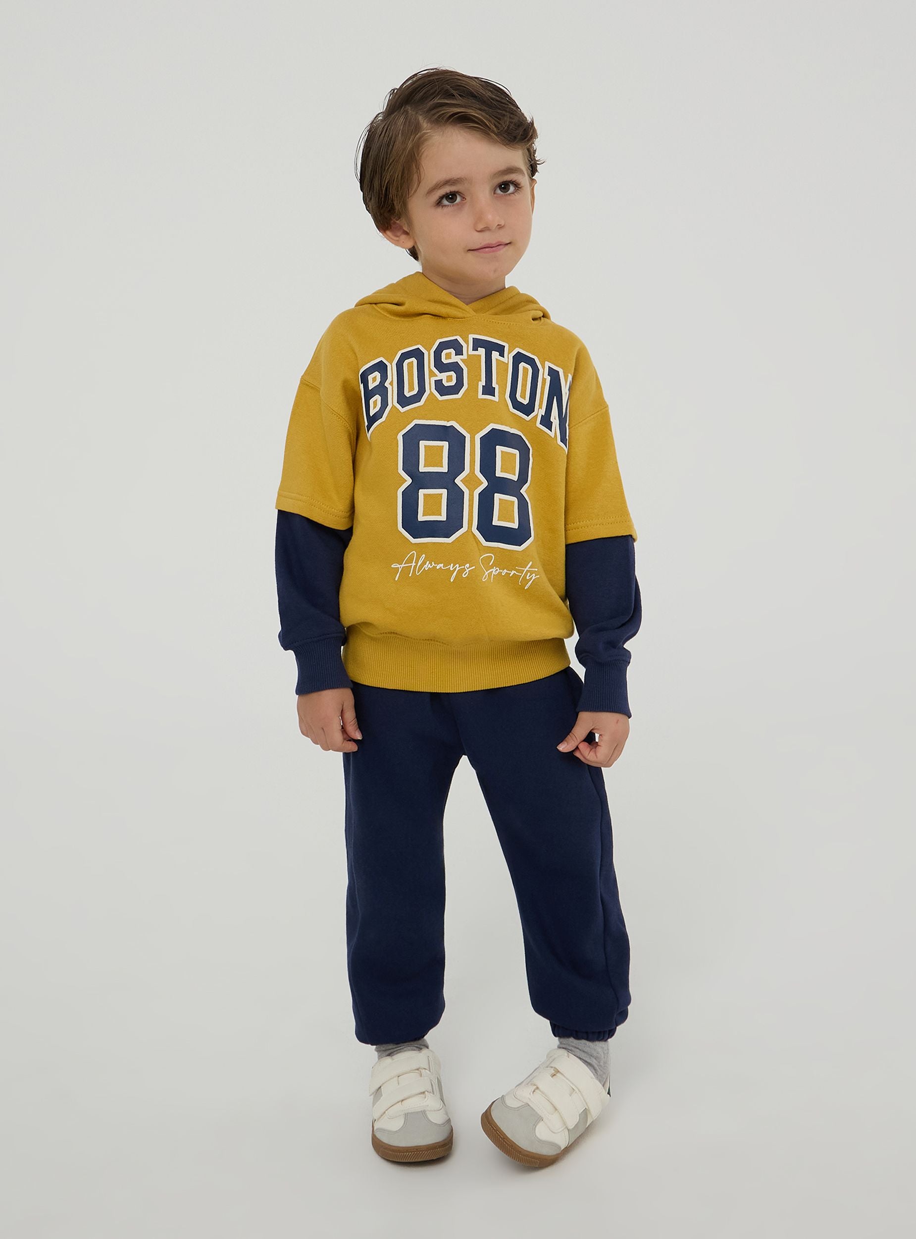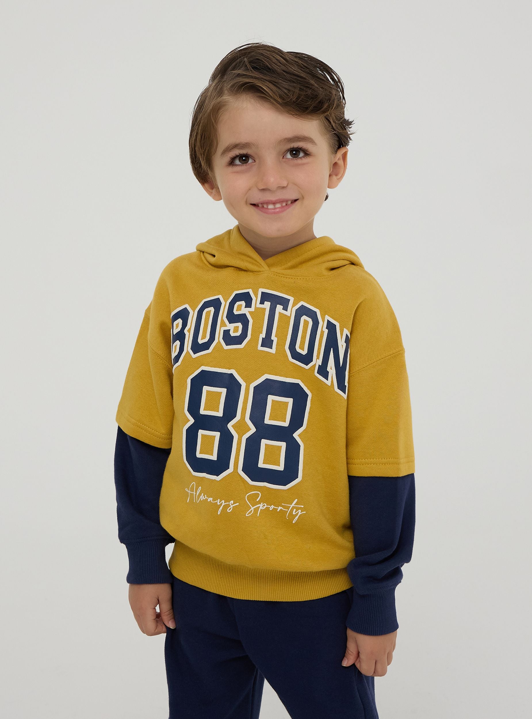 Felpa da bimbo con cappuccio, maniche doppie bicolor, tessuto pesante con stampa stile sport sul davanti. Perfetta per look sportivi o casual. Vestibilità regular.