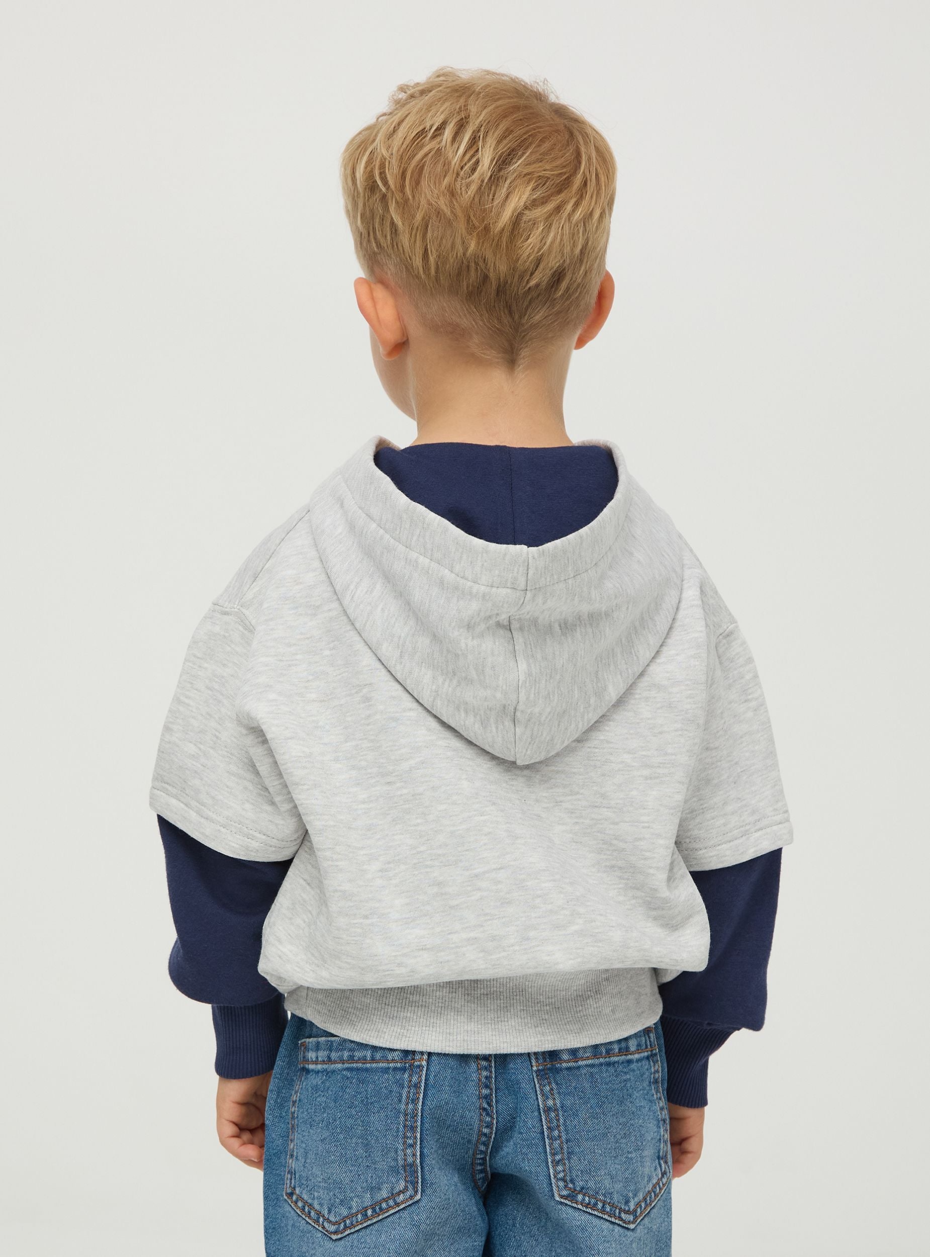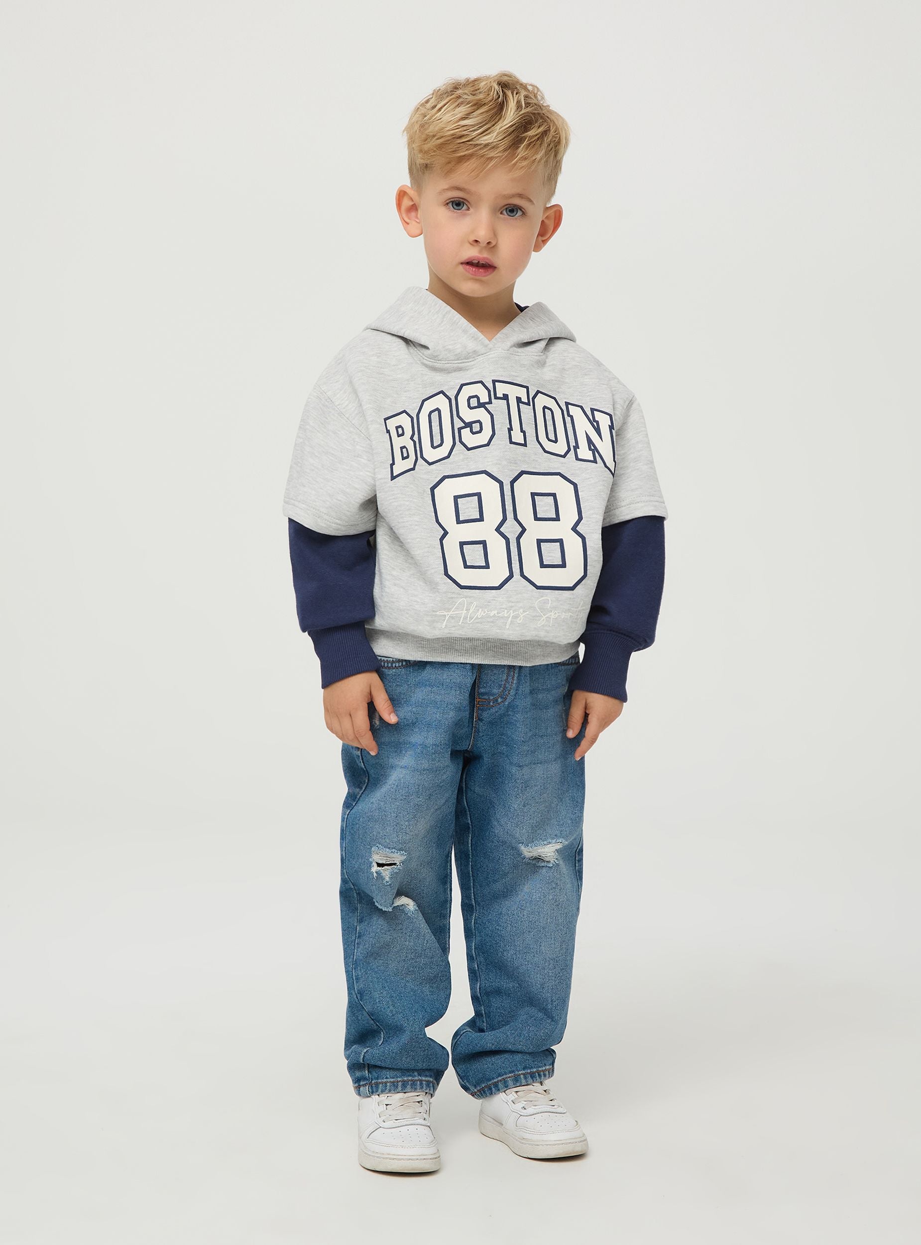 Felpa da bimbo con cappuccio, maniche doppie bicolor, tessuto pesante con stampa stile sport sul davanti. Perfetta per look sportivi o casual. Vestibilità regular.