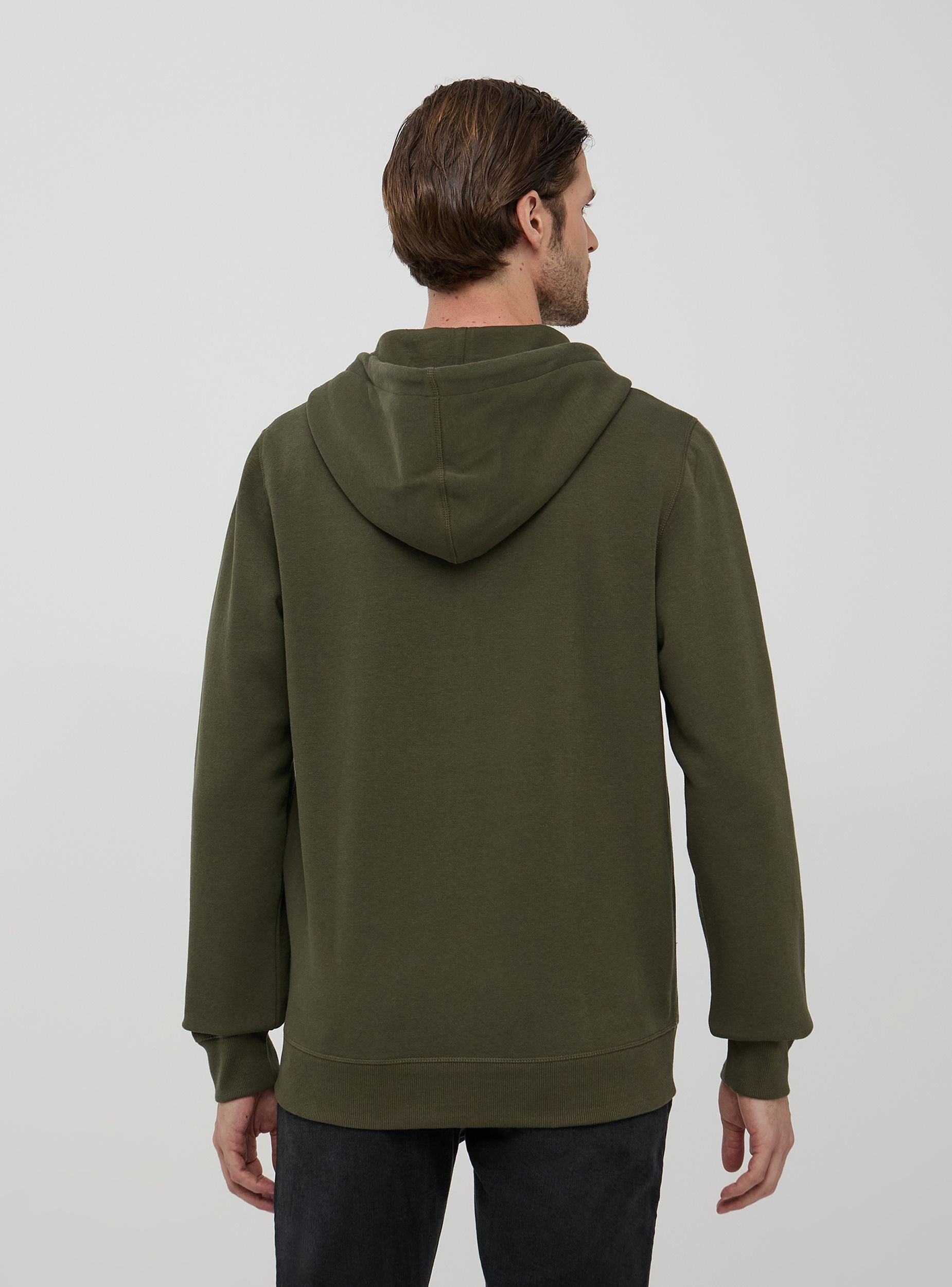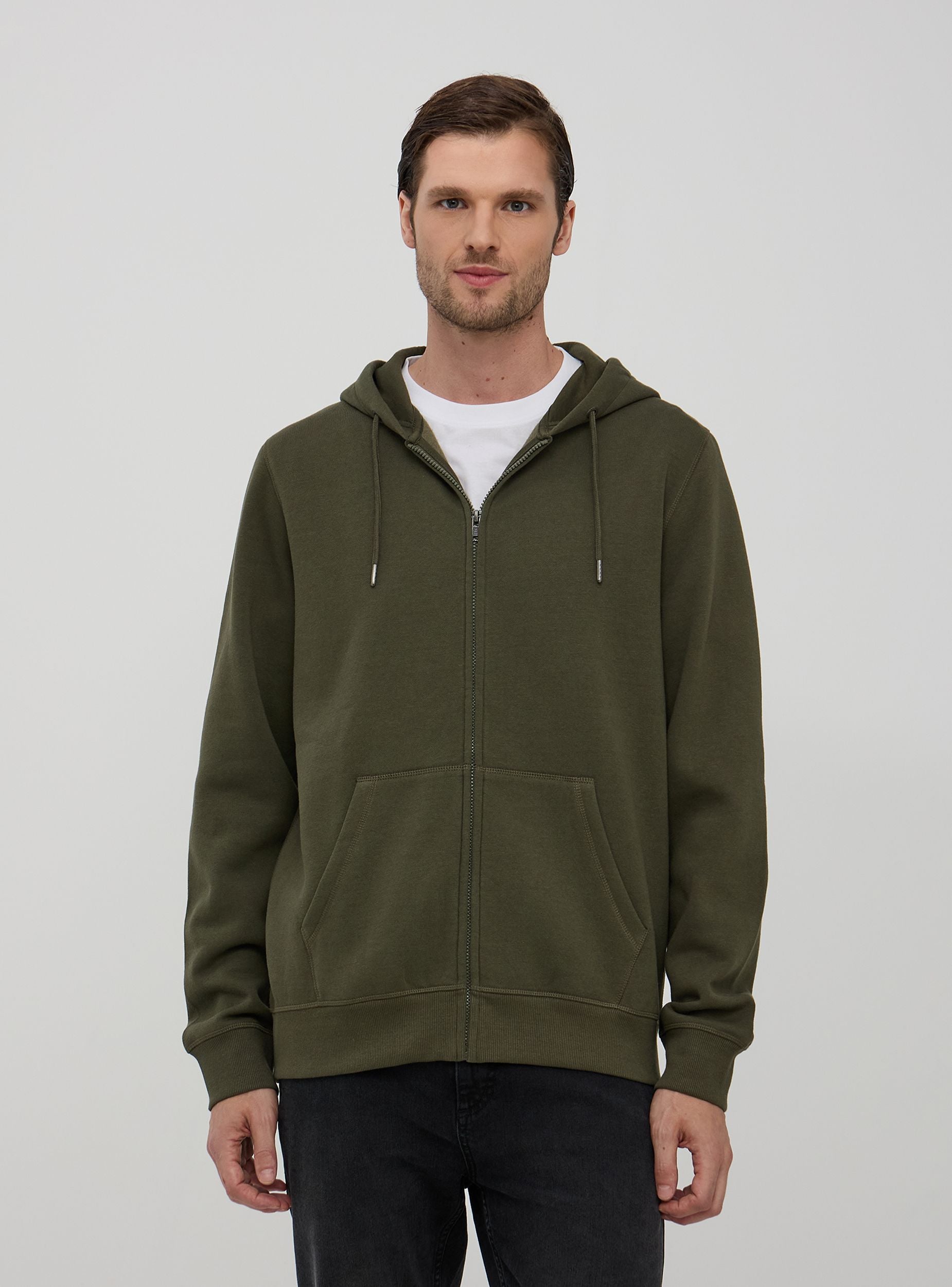 Felpa da uomo con cappuccio dotato di coulisse, chiusura con cerniera, tasche a marsupio e finiture a costine. Tessuto pesante a tinta unita. Capo basic ideale per un look casual o sportivo. Vestibilità regular.