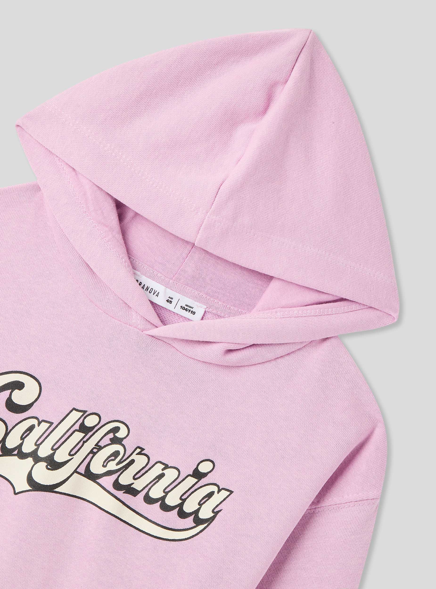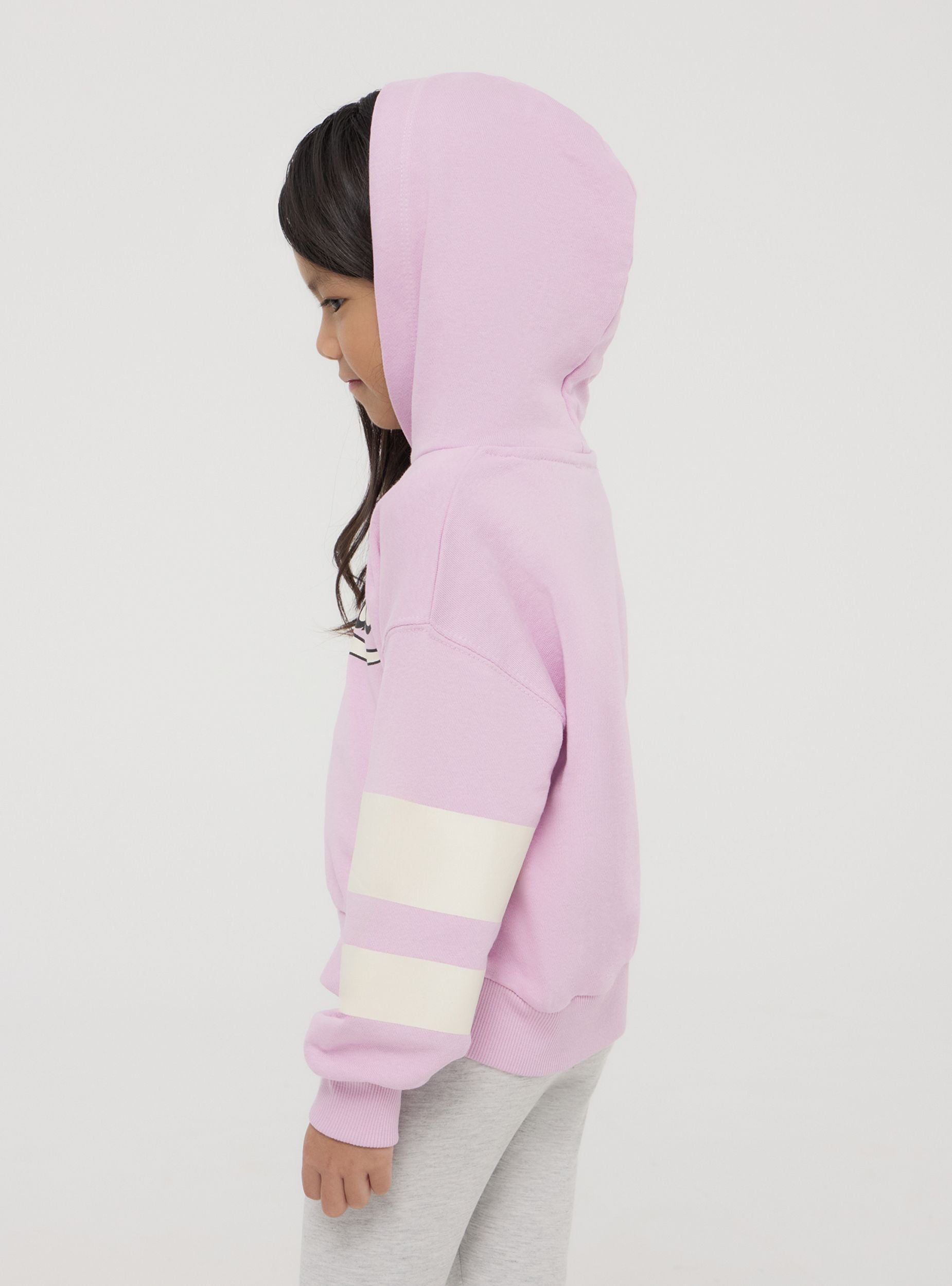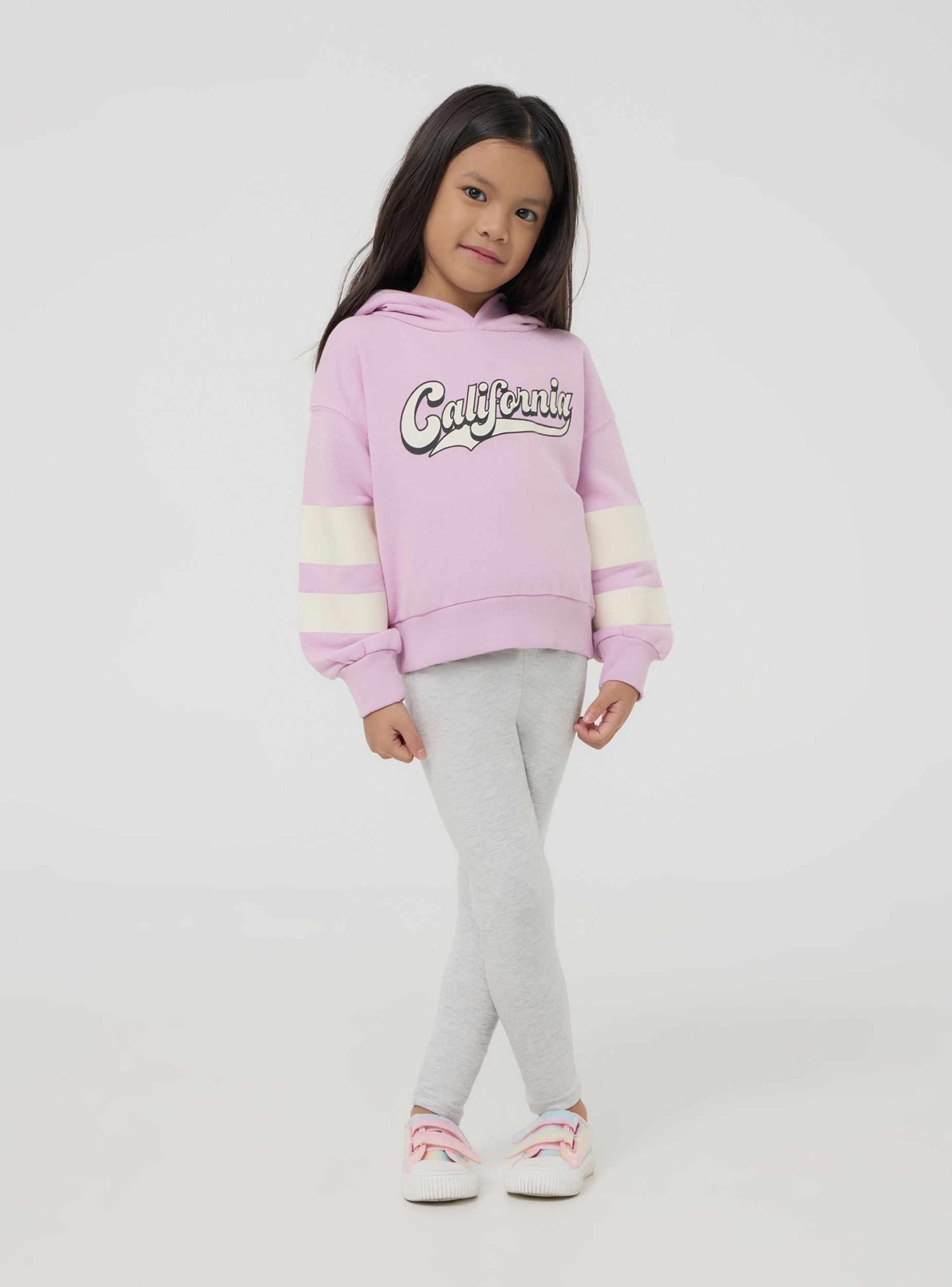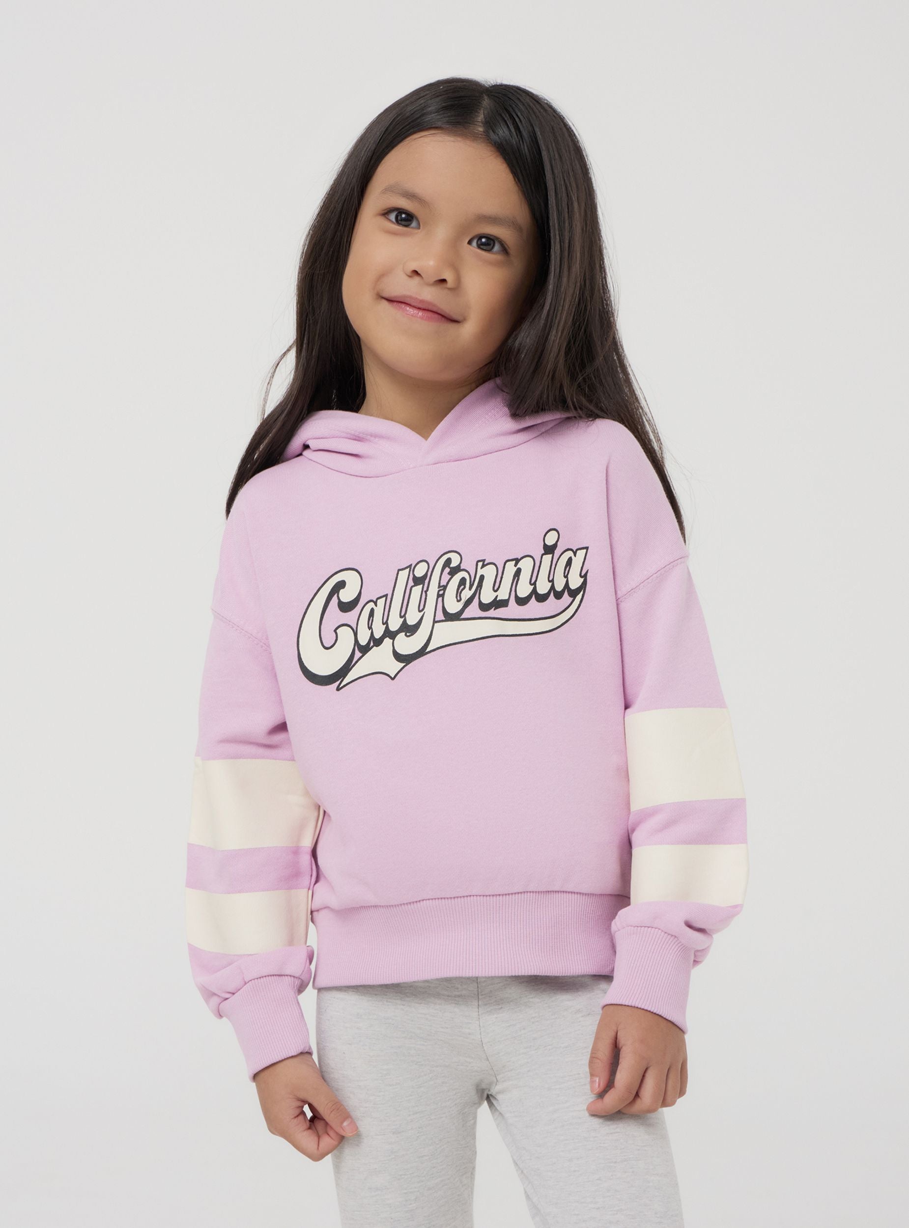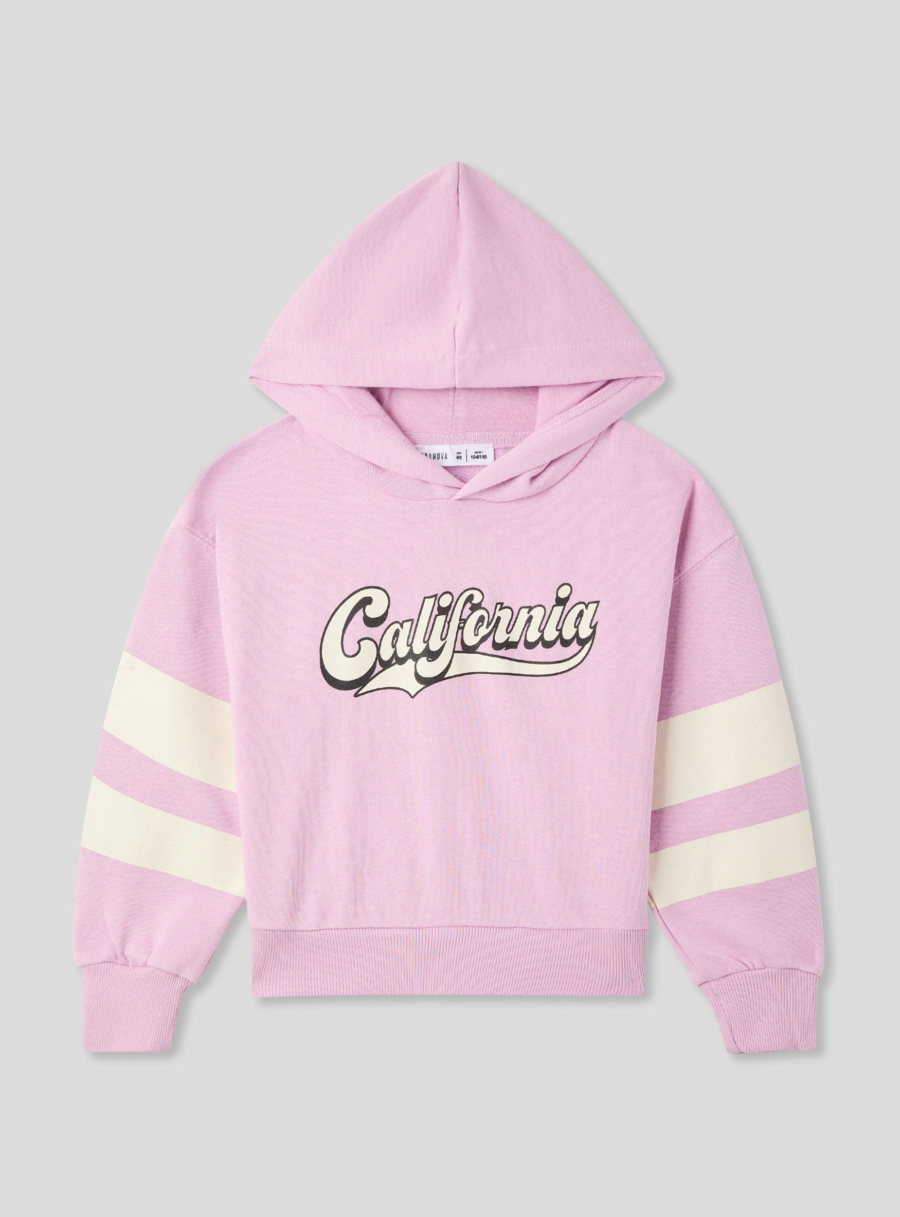 Felpa leggera da bambina con cappuccio, stile moderno e lunghezza crop, ideale per un look vivace e dinamico. La stampa ispirata al mondo college americano aggiunge un tocco grintoso, mentre le bande sulle maniche valorizzano il design sportivo. Perfetta per abbinamenti casual, garantisce comodità e versatilità, accompagnando le giornate con stile e praticità.Dettagli