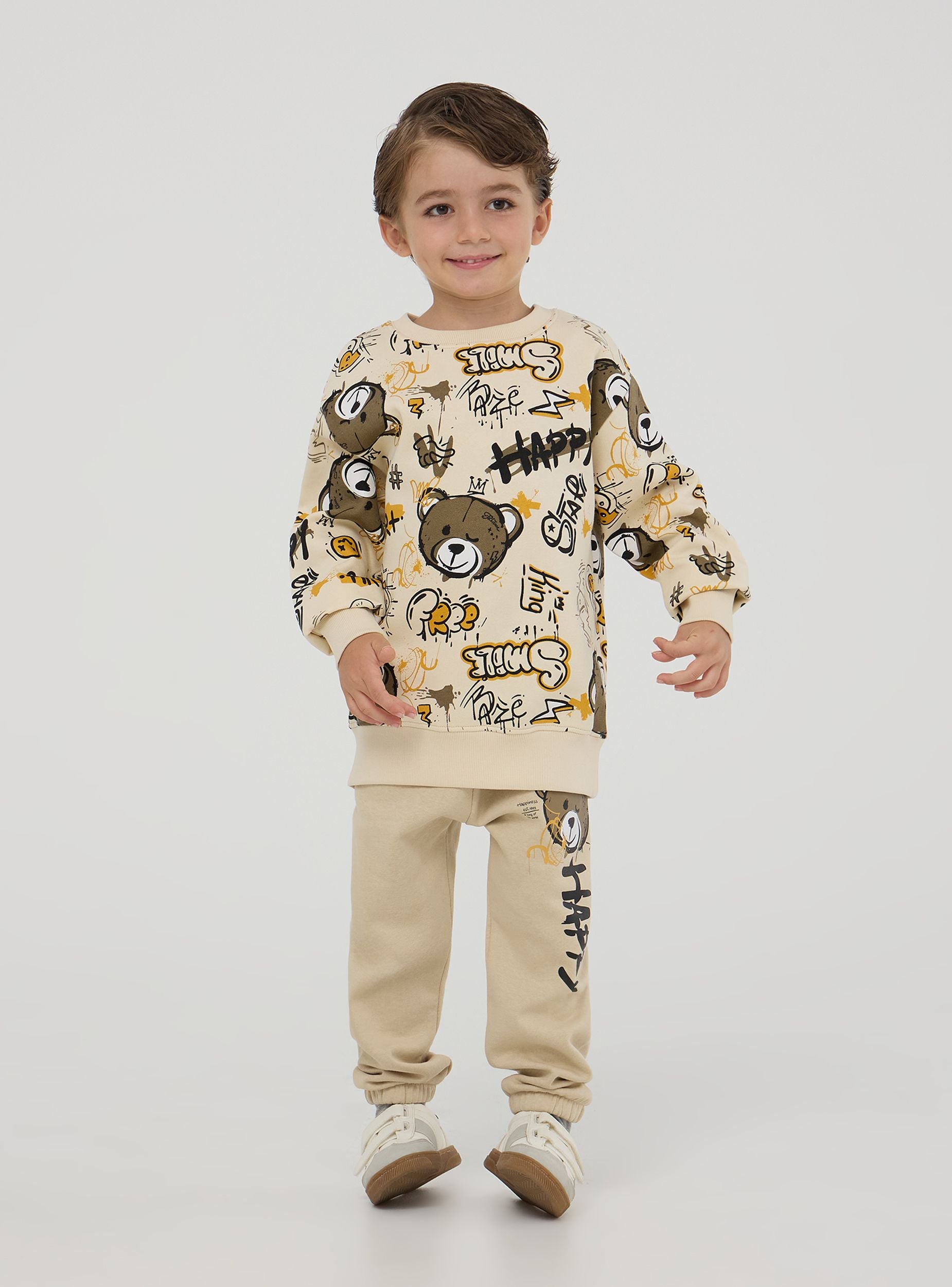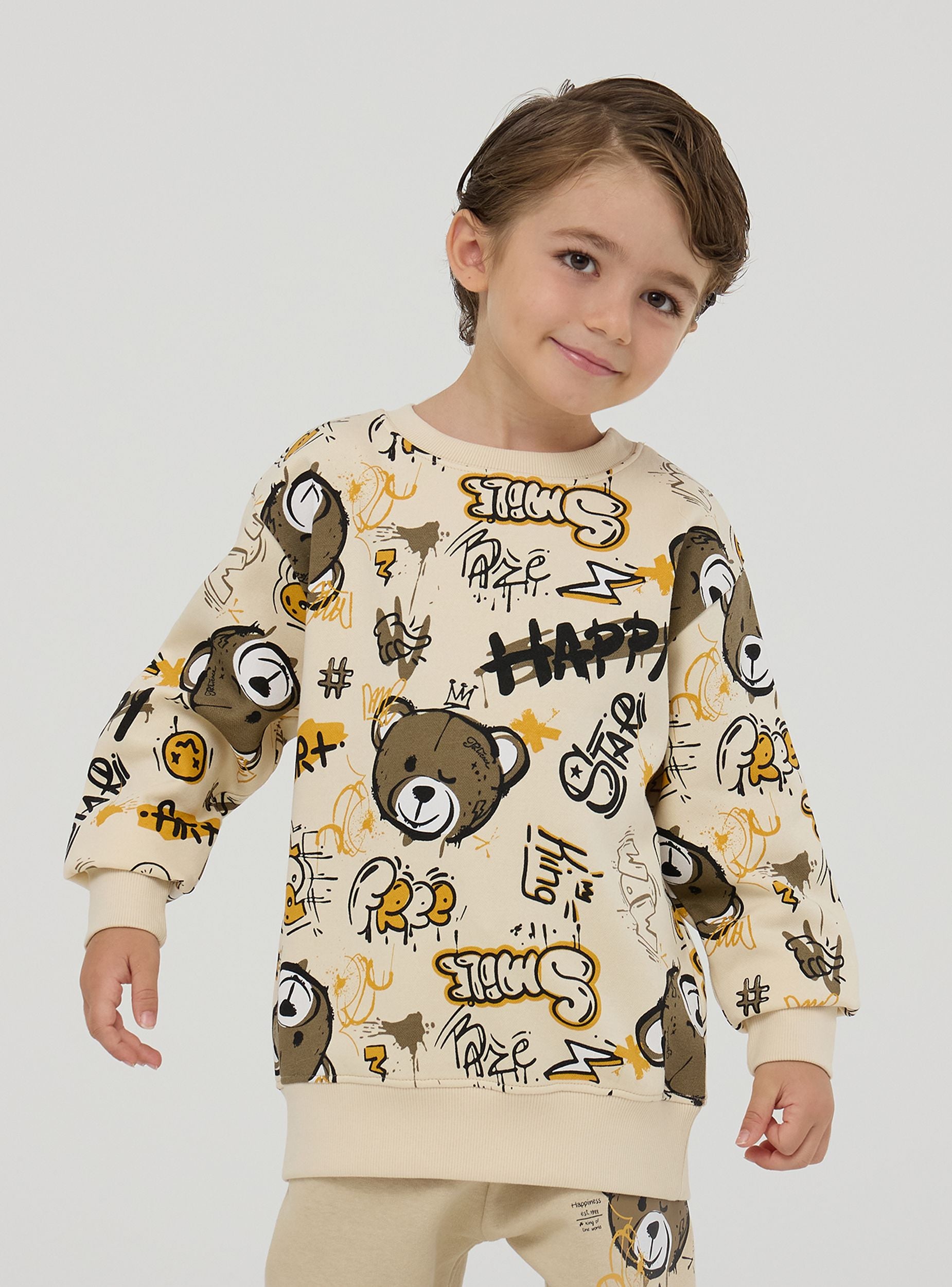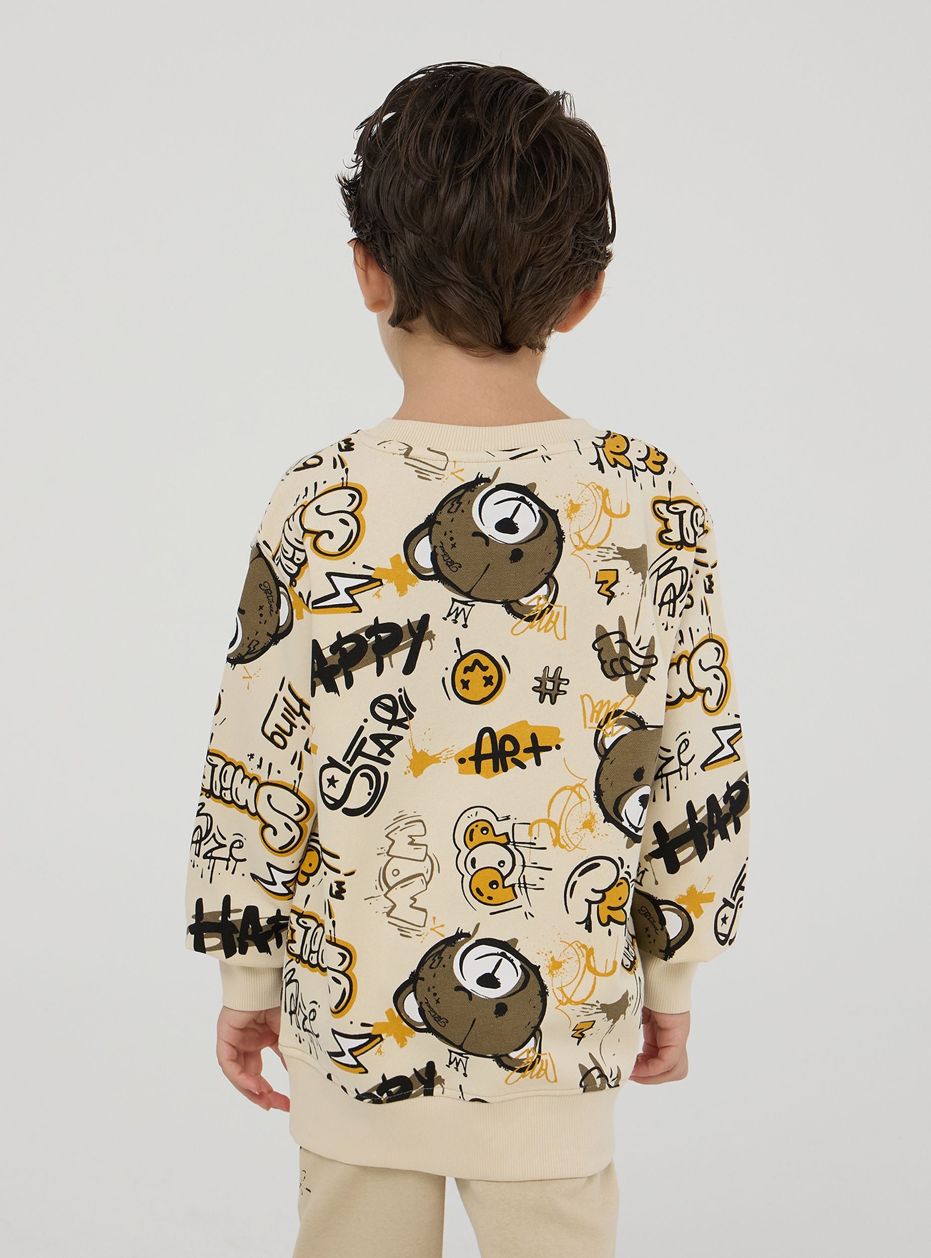 Felpa pesante da bimbo con stampa all-over ispirata ai graffiti, che include elementi giocosi come un orsetto, parole e simboli vari. Il design vivace e creativo rende la felpa ideale per un look casual e divertente. La felpa è dotata di polsini e orlo a costine per una vestibilità confortevole, mantenendo il calore durante le giornate più fredde.