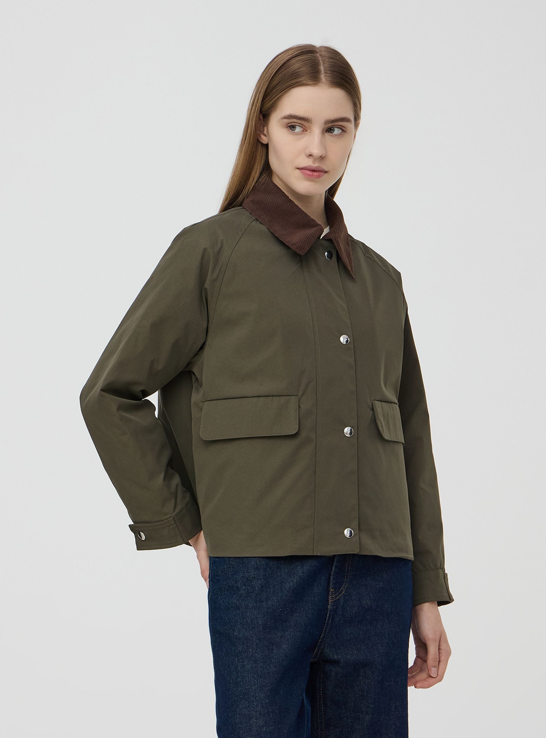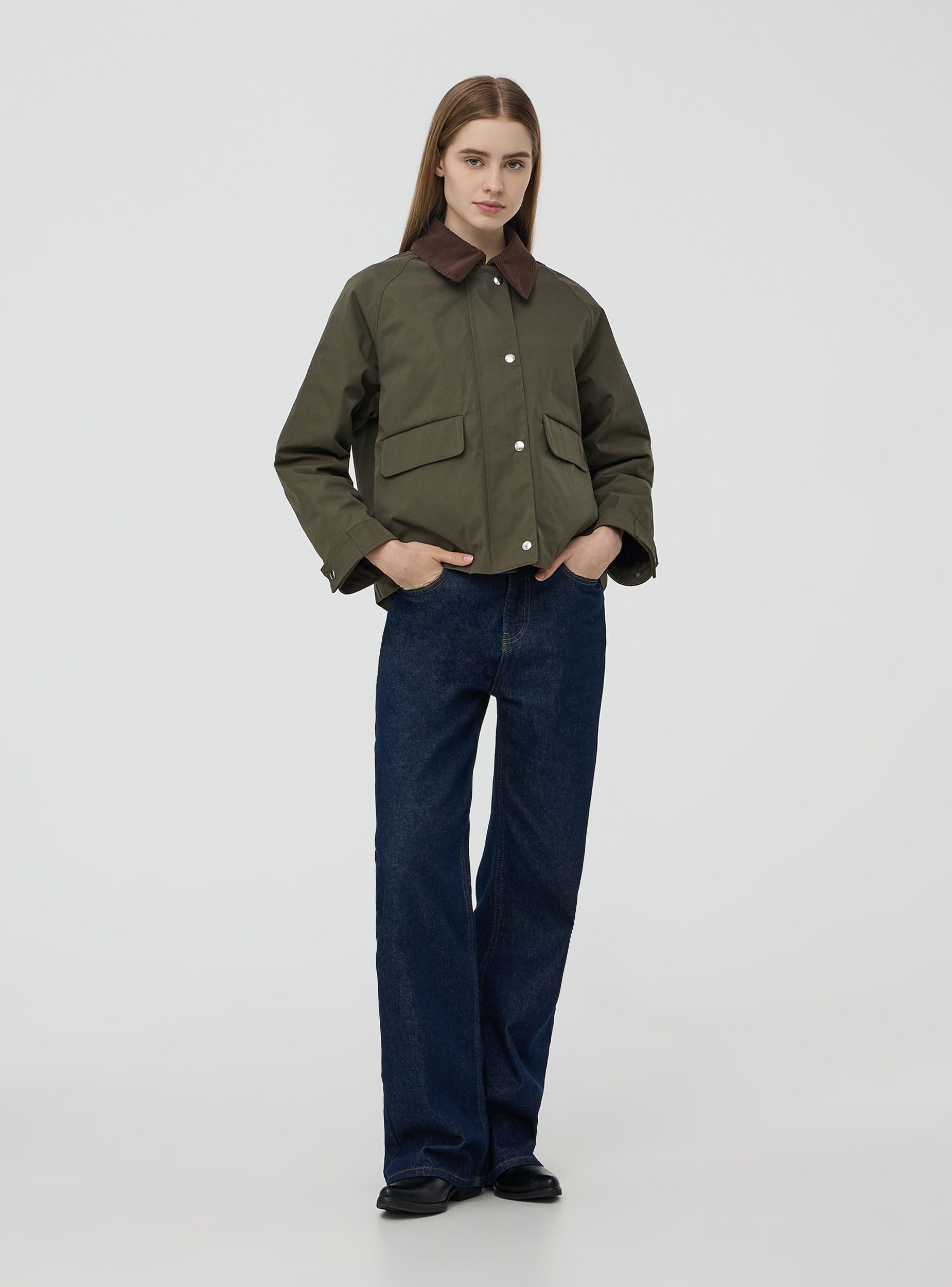Giubbotto da donna corto con imbottitura, modello spolverino, caratterizzato da un taglio dritto e ampio che offre comfort e libertà di movimento. Presenta un colletto a contrasto e una chiusura frontale con bottoni a pressione. Le ampie tasche con patta sul davanti aggiungono funzionalità al capo, mentre le maniche lunghe e il design essenziale lo rendono adatto a un look casual e contemporaneo. Ideale alle giornate fredde grazie alla sua imbottitura che garantisce calore.