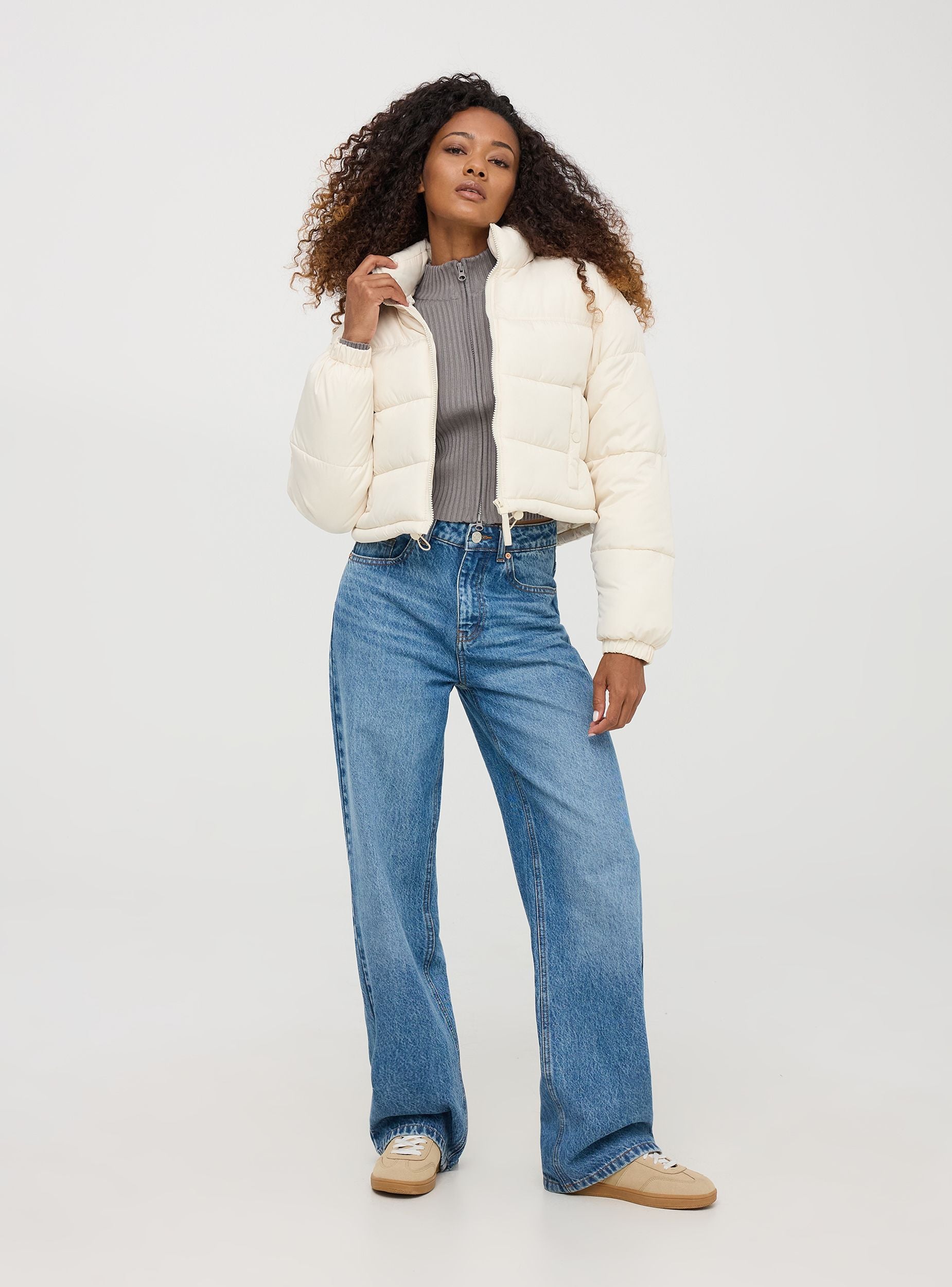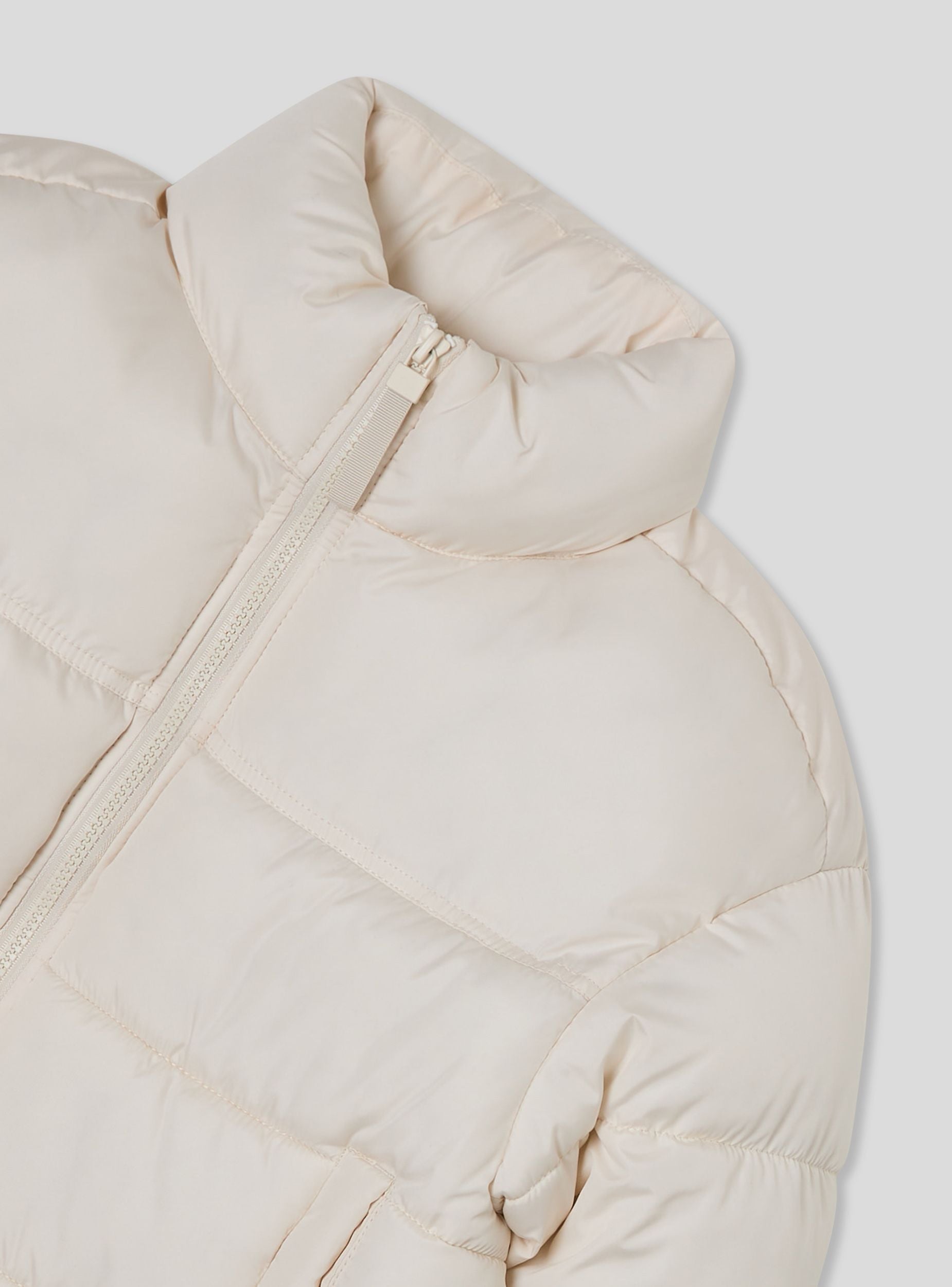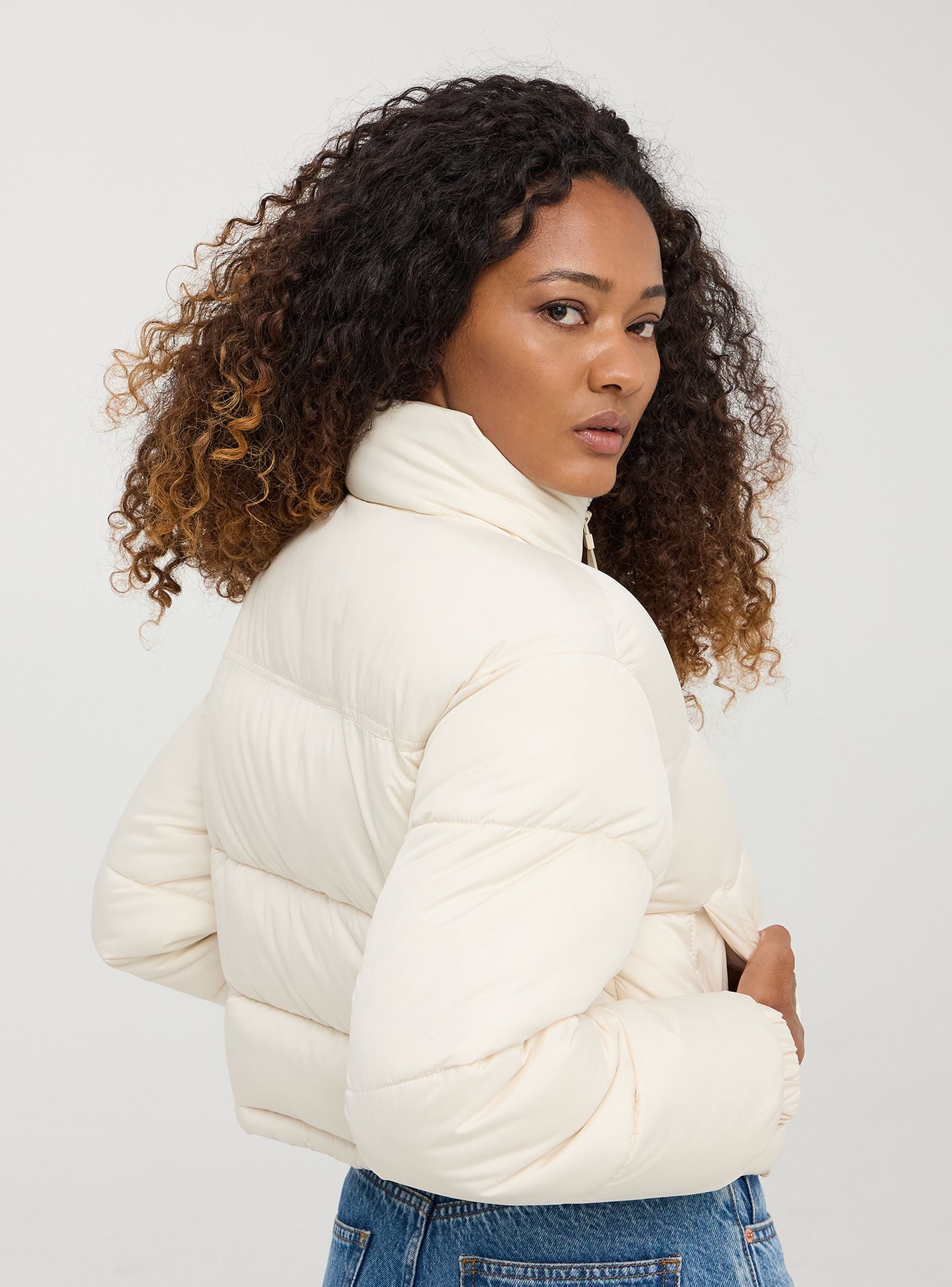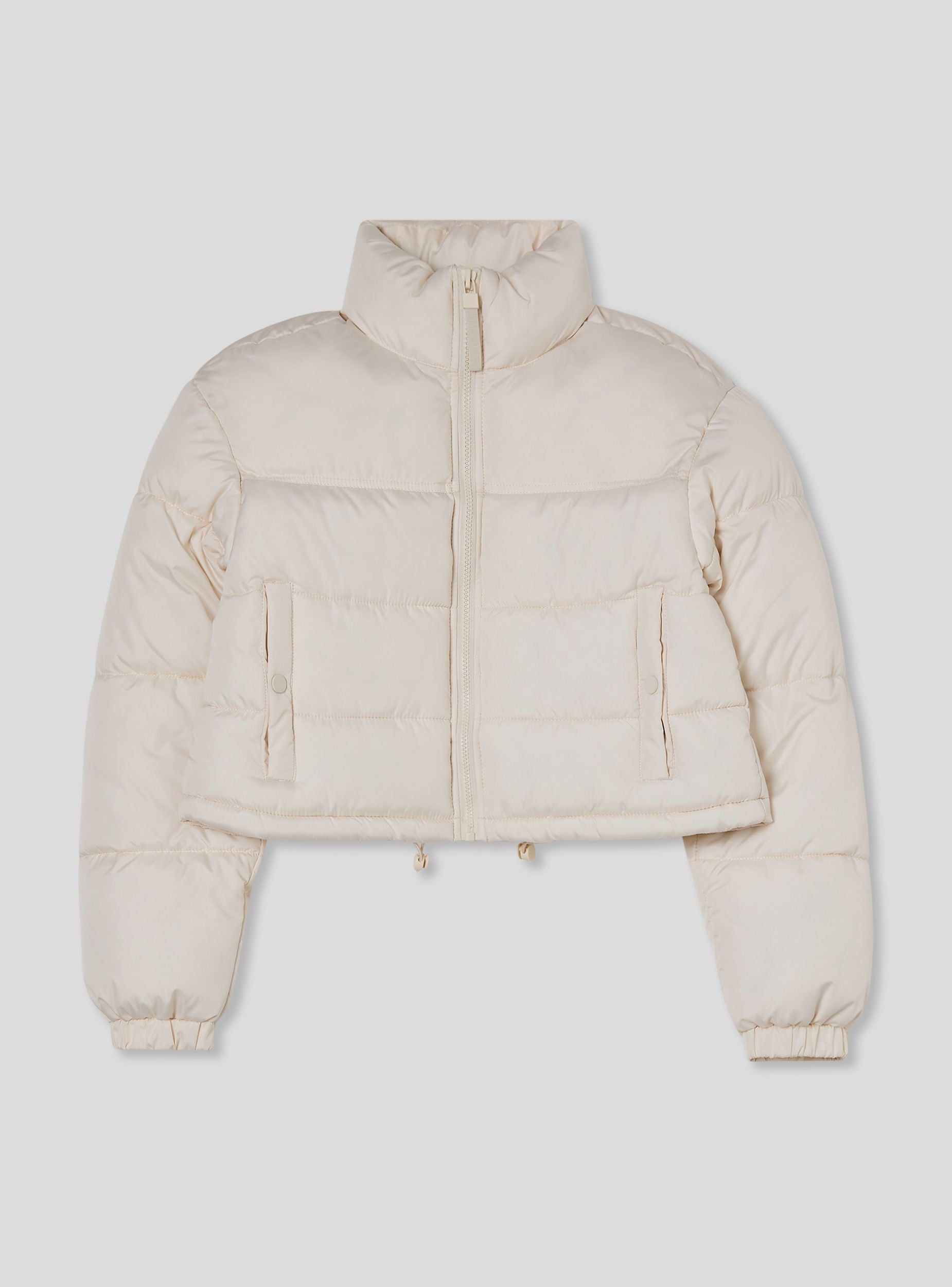 Giubbotto da donna in nylon imbottito, modello con collo alto, chiusura frontale con zip tono su tono e tirazip in tessuto. Bordo inferiore con coulisse regolabile. Tasche frontali con chiusura con bottoni a pressione tono su tono. Vestibilità crop.