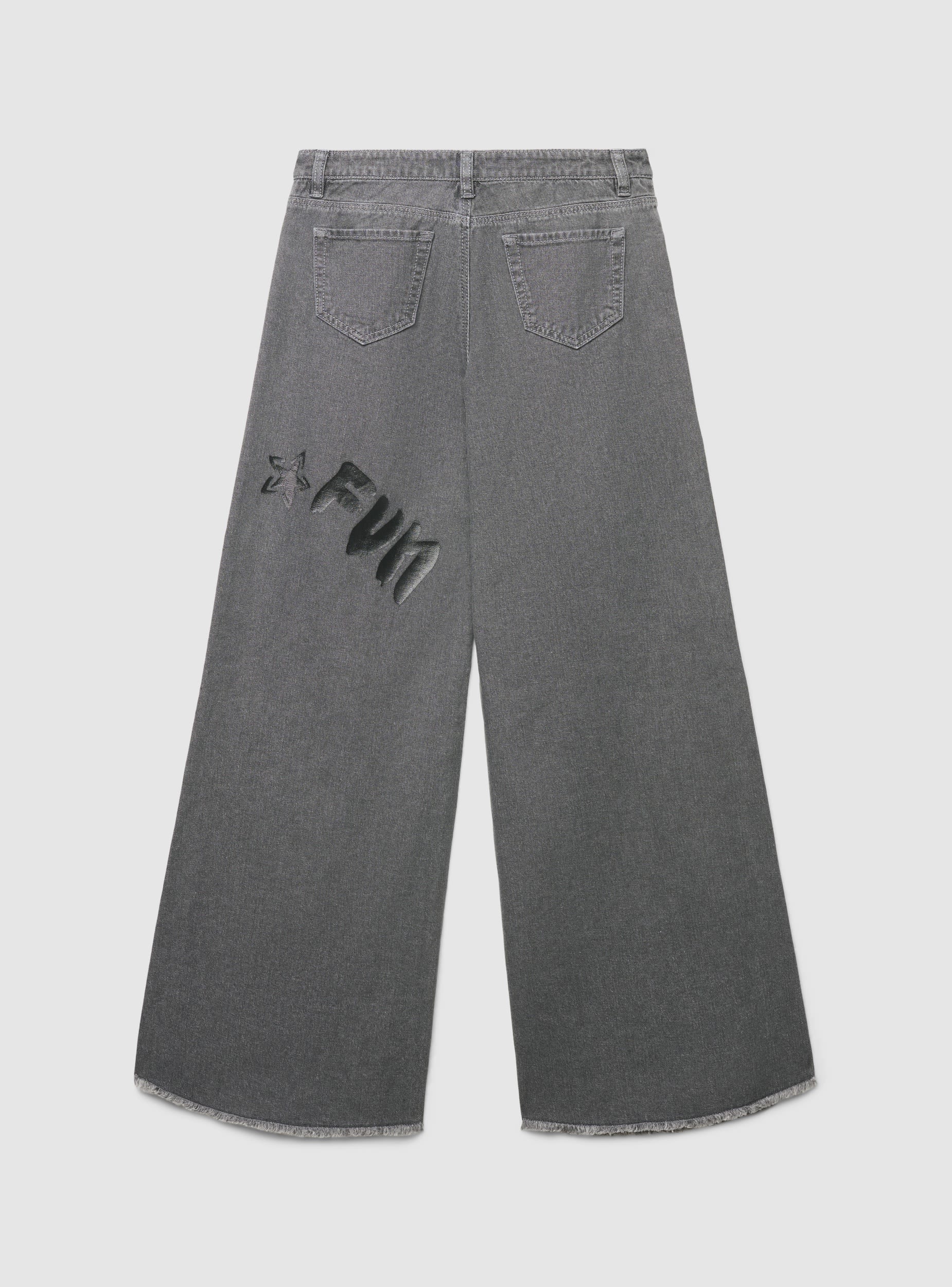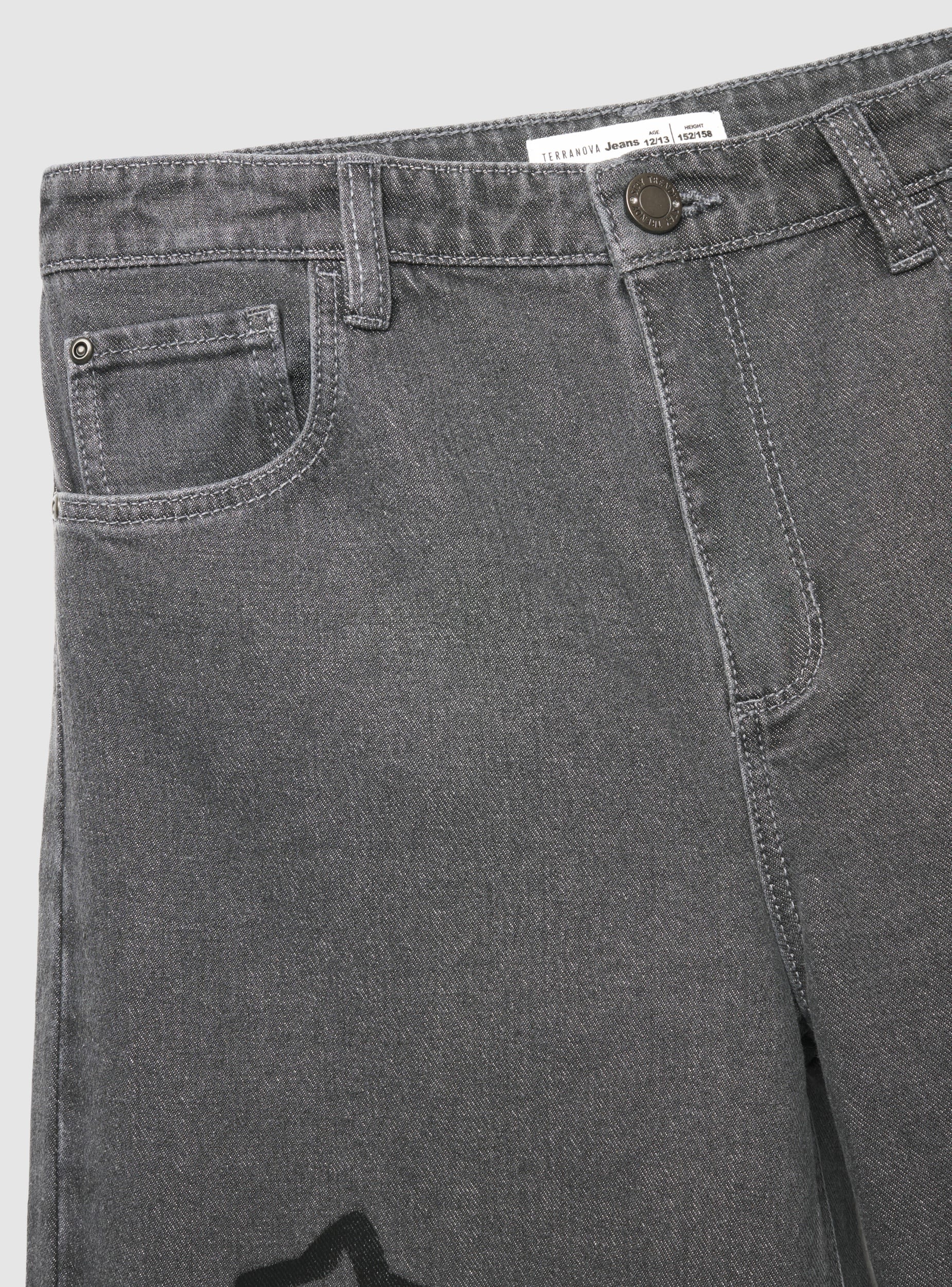 Jeans da bambina a gamba larga, perfetti per look casual e trendy. Modello lungo con vita media, chiusura con bottone e zip e classico taglio a cinque tasche. La vestibilità ampia garantisce comfort nei movimenti, mentre le scritte e le stelle lucide sul davanti e sul retro aggiungono un tocco rock. Ideali con felpe o maglietta e sneakers per la scuola o il tempo libero.
