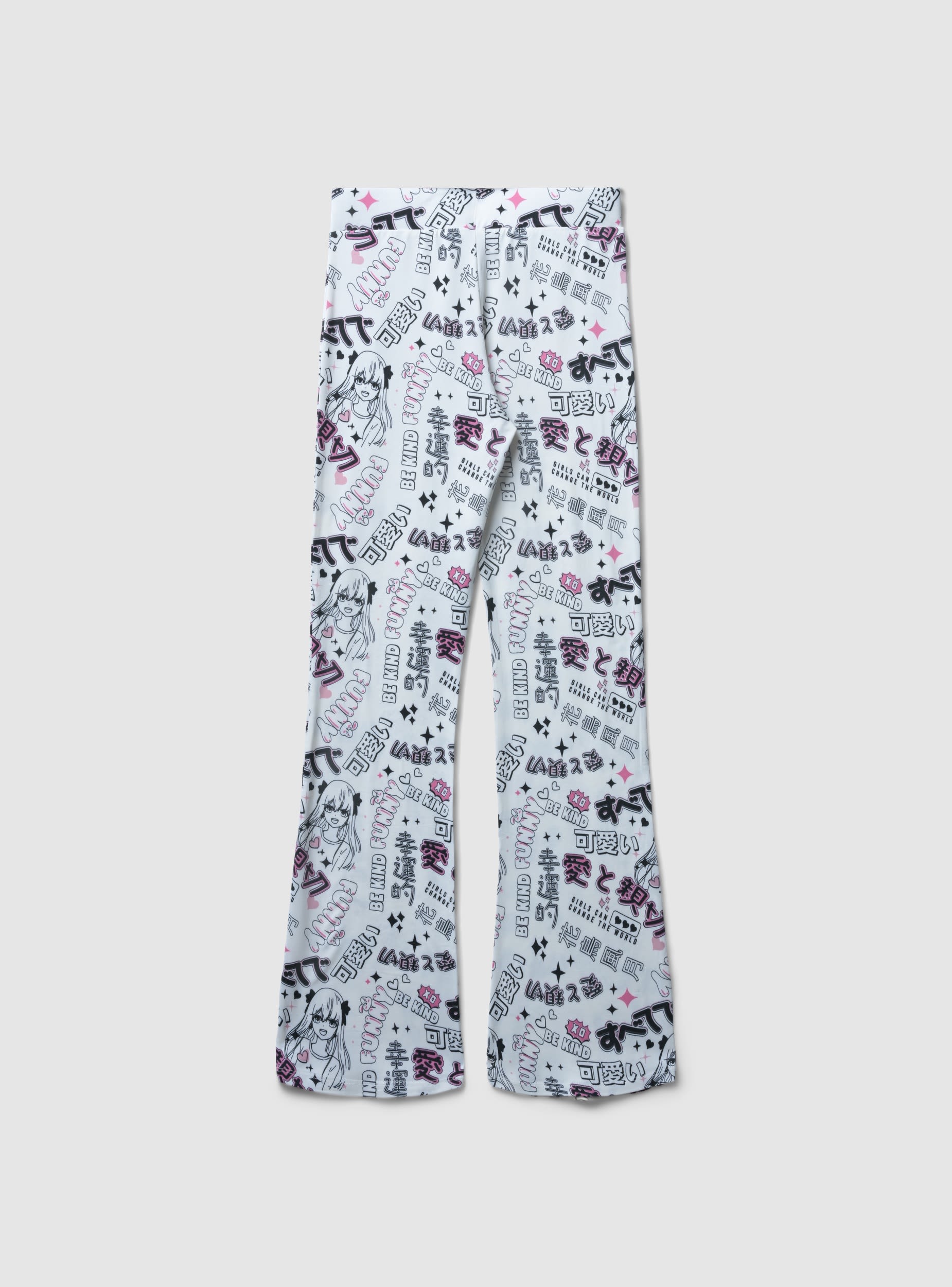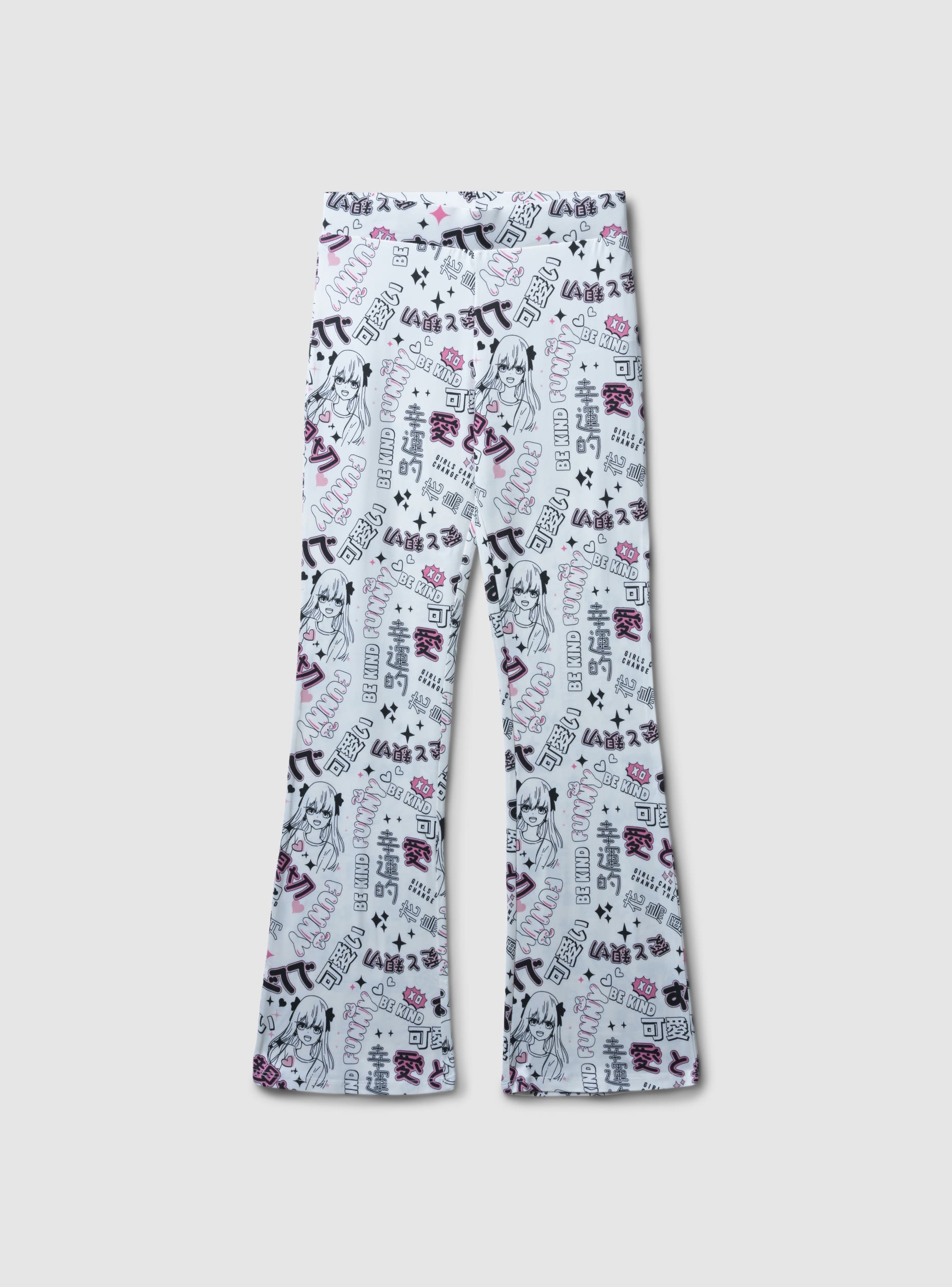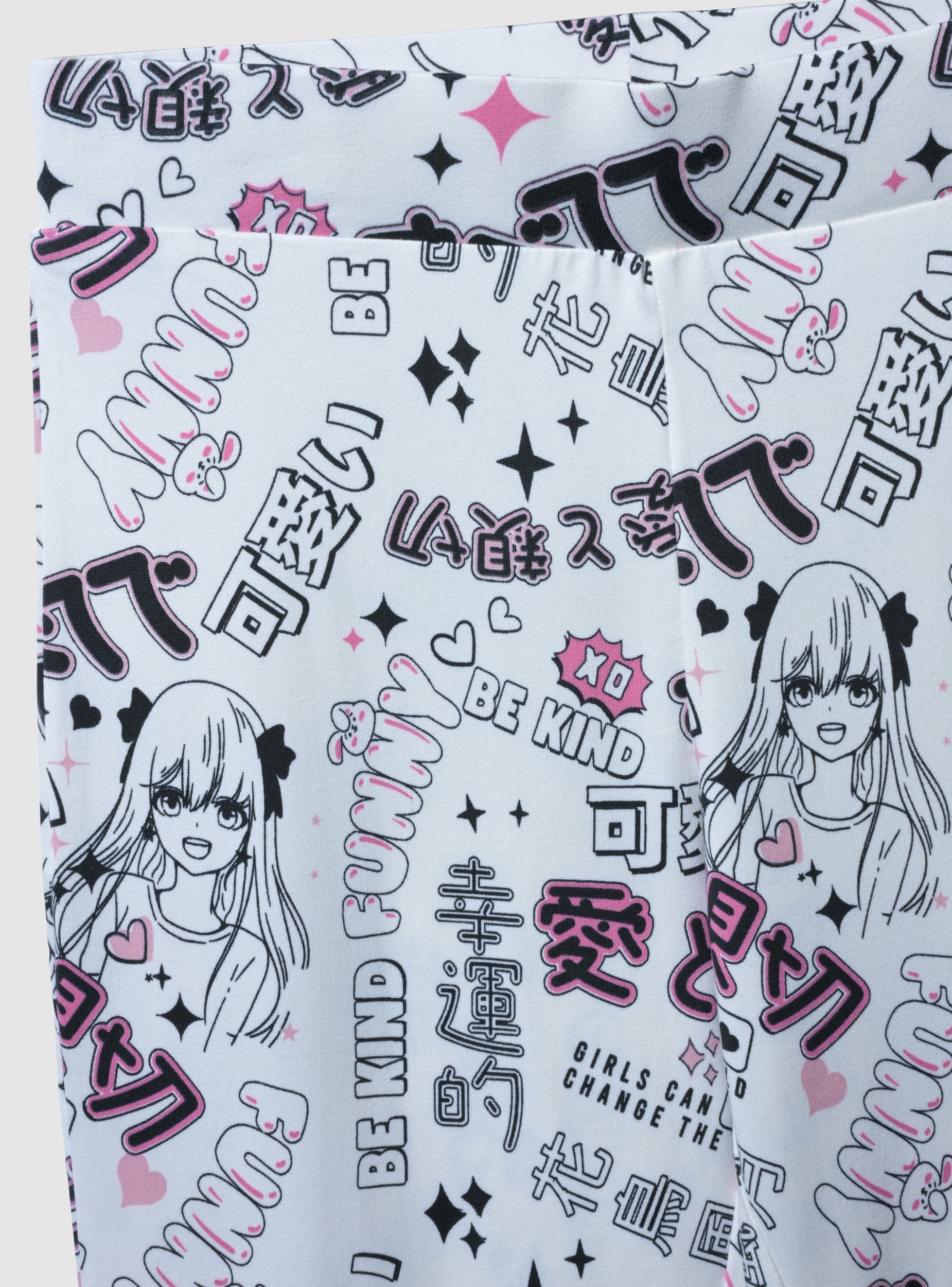Leggings da bambina con design a zampa, caratterizzati da una stampa vivace con scritte e motivi grafici in stile manga. Ideali per un look casual e alla moda, si adattano a diverse occasioni grazie alla loro vestibilità comoda e al design accattivante. Perfetti per esprimere uno stile unico e personale, possono essere abbinati a magliette e felpe per un outfit dinamico e originale.