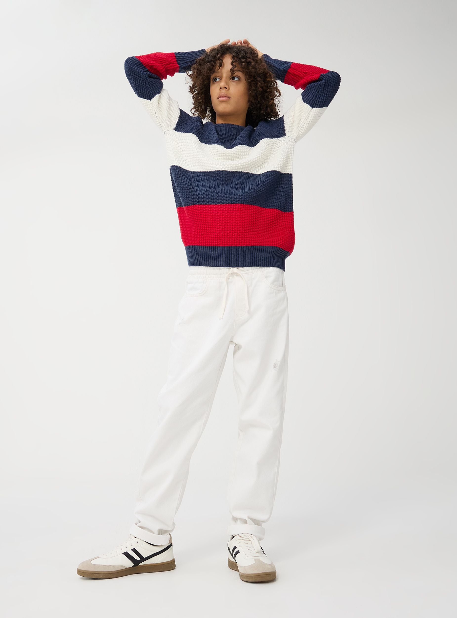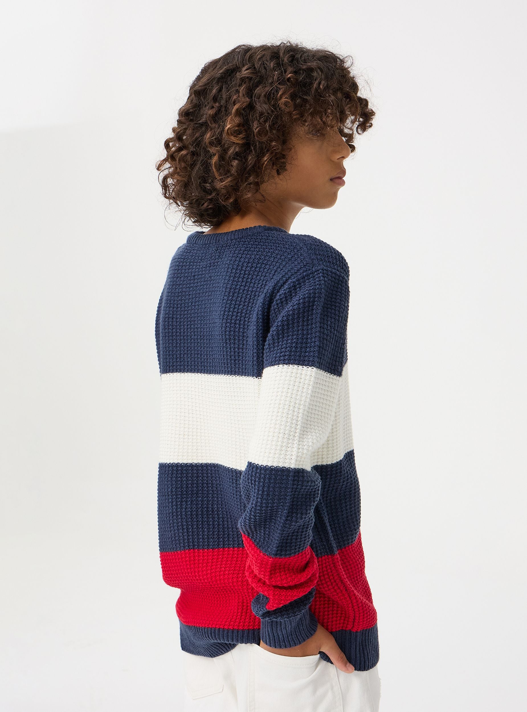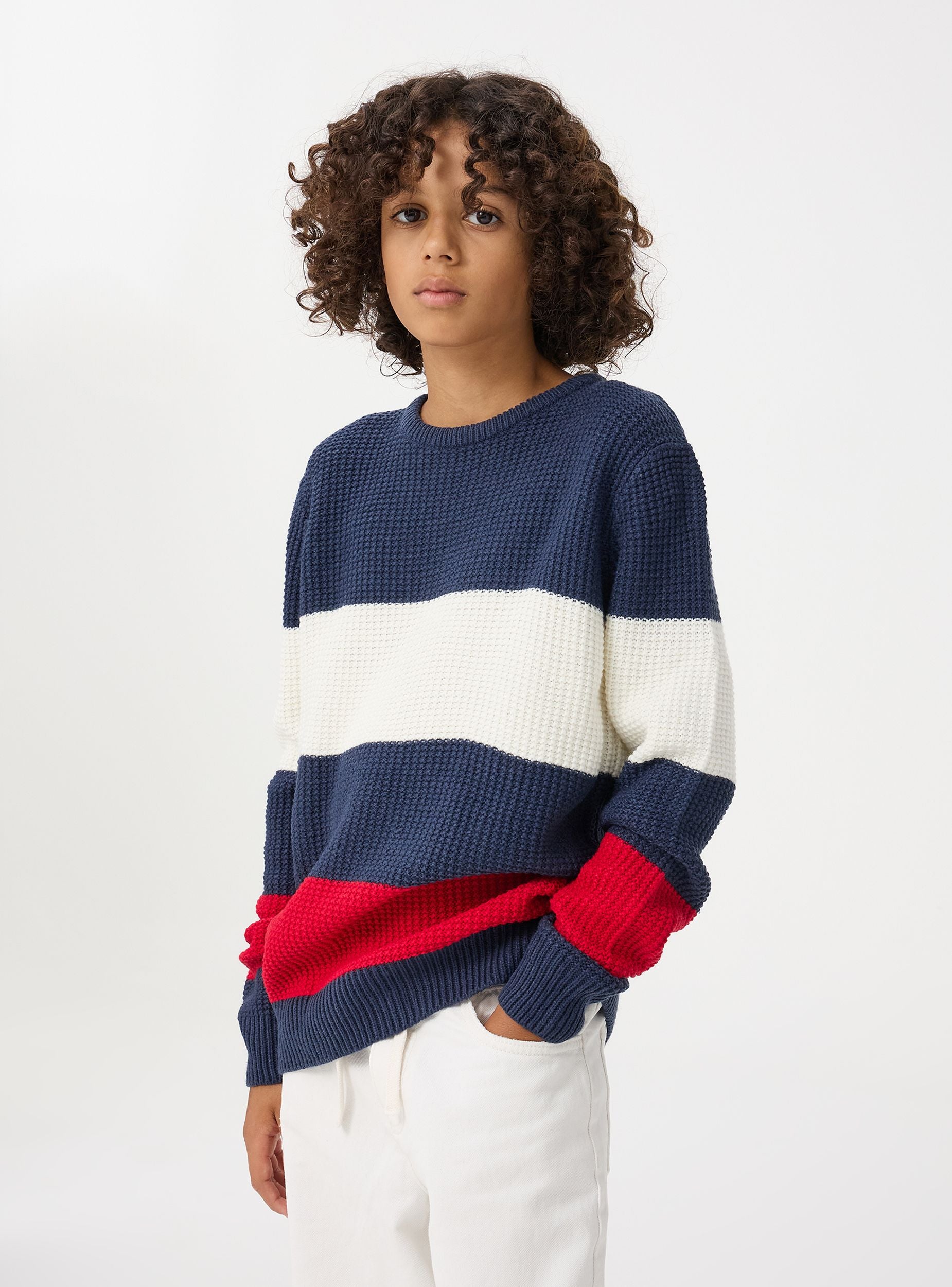 Maglia da bambino a righe orizzontali. Perfetta per un aspetto fresco e dinamico. La struttura a maglia grossa dona una sensazione di calore e comfort, ideale per le giornate più fredde. La vestibilità regolare e lo stile casual lo rendono adatto per uscite informali, giornate scolastiche o passeggiate in città.