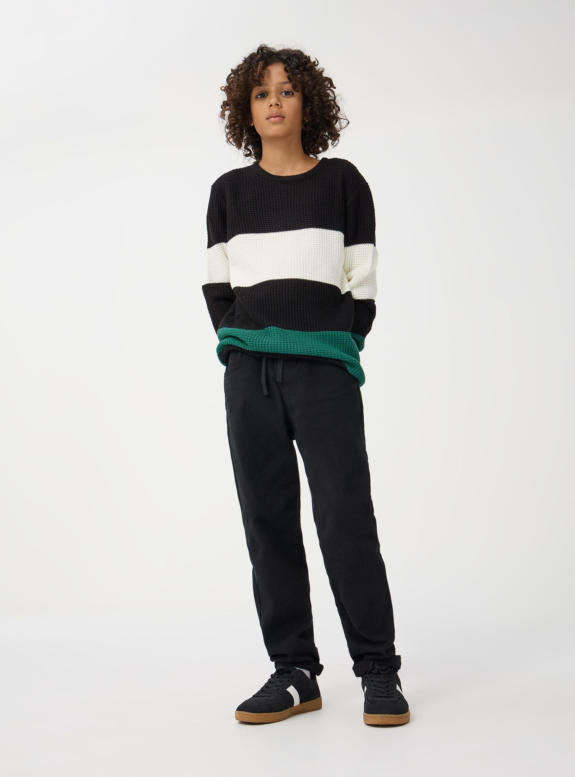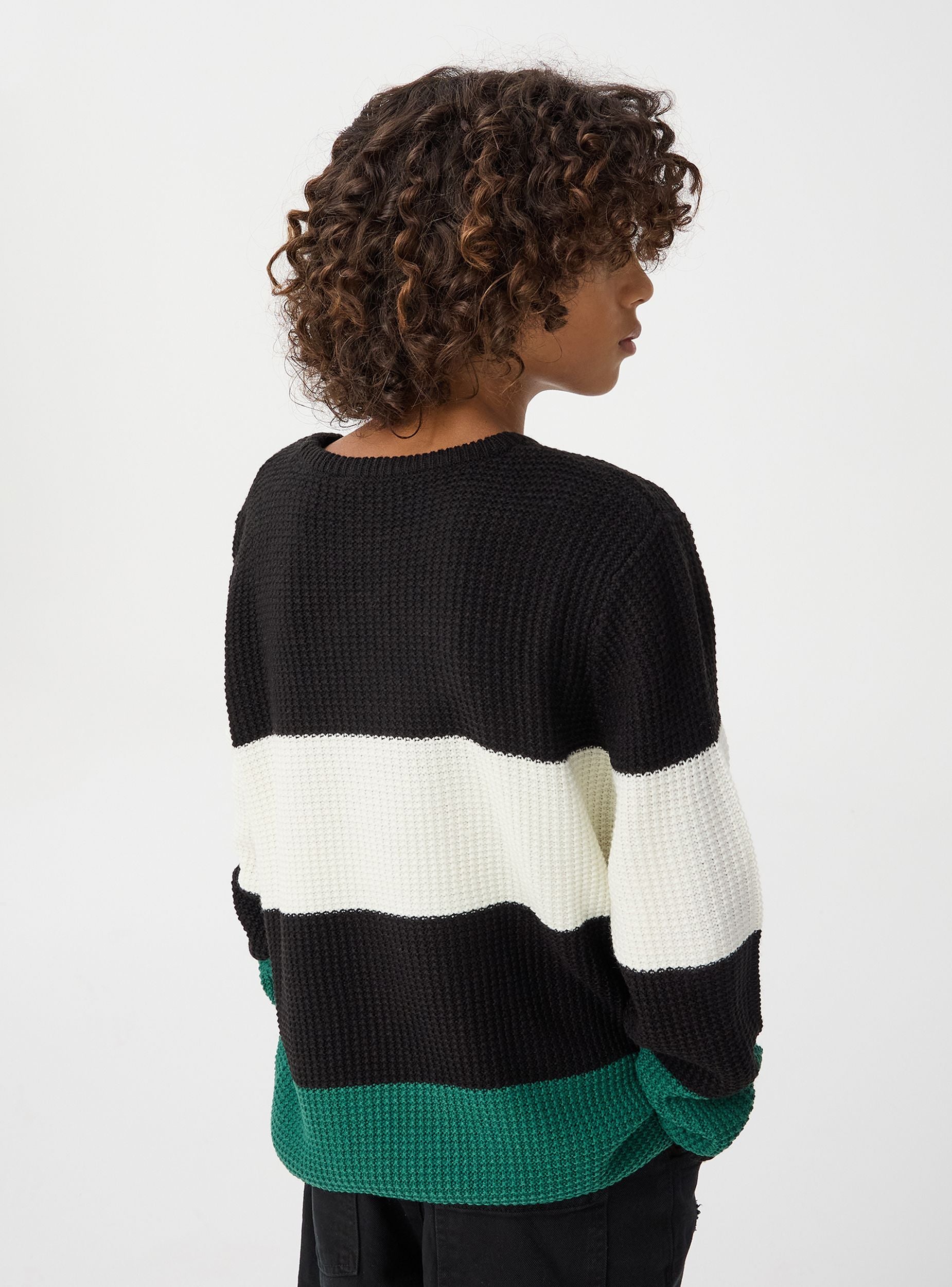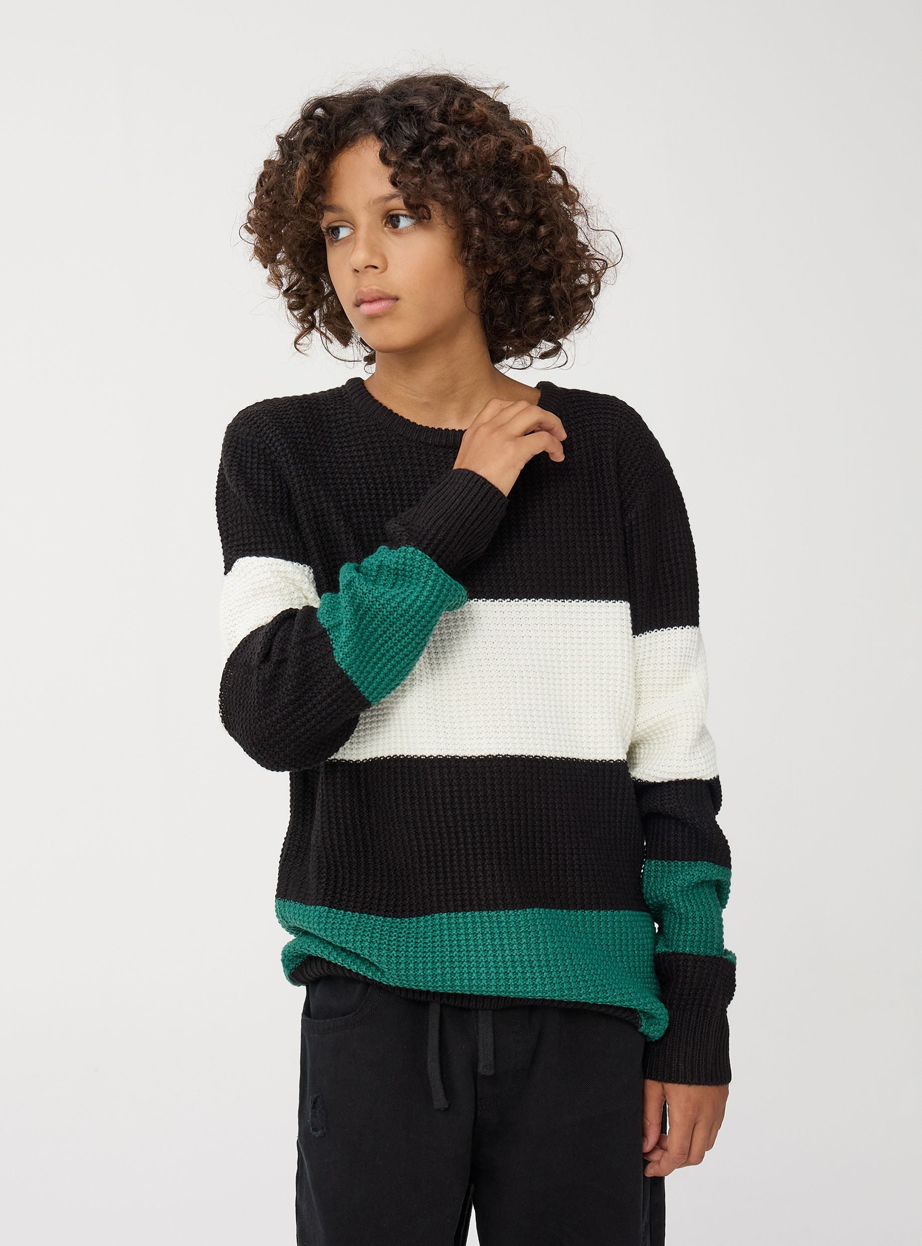 Maglia da bambino a righe orizzontali. Perfetta per un aspetto fresco e dinamico. La struttura a maglia grossa dona una sensazione di calore e comfort, ideale per le giornate più fredde. La vestibilità regolare e lo stile casual lo rendono adatto per uscite informali, giornate scolastiche o passeggiate in città.