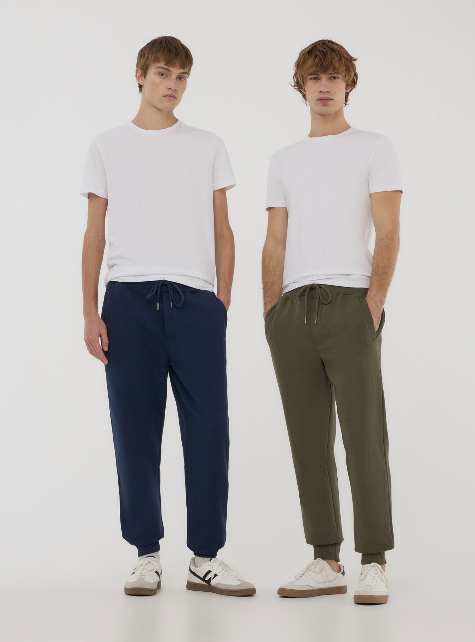 Confezione composta da due pantaloni della tuta da uomo. Realizzati in tessuto pesante a tinta unita. Modello con vita elasticizzata con coulisse regolabili per assicurare una vestibilità personalizzata e comoda, tasche laterali e una tasca posteriore, polsini elasticizzati. Perfetti per il tempo libero, momenti di relax o uscite informali.Dettagli