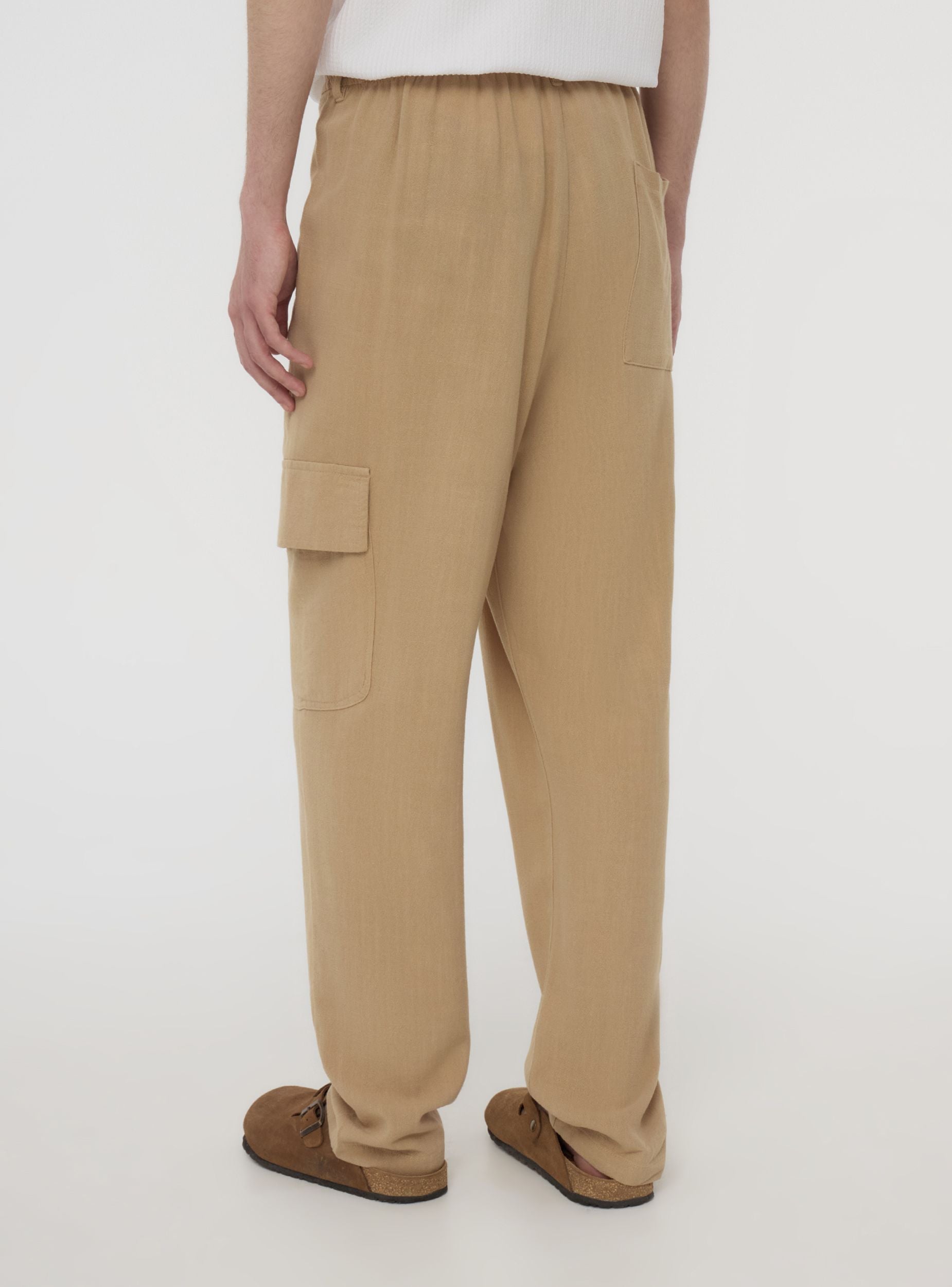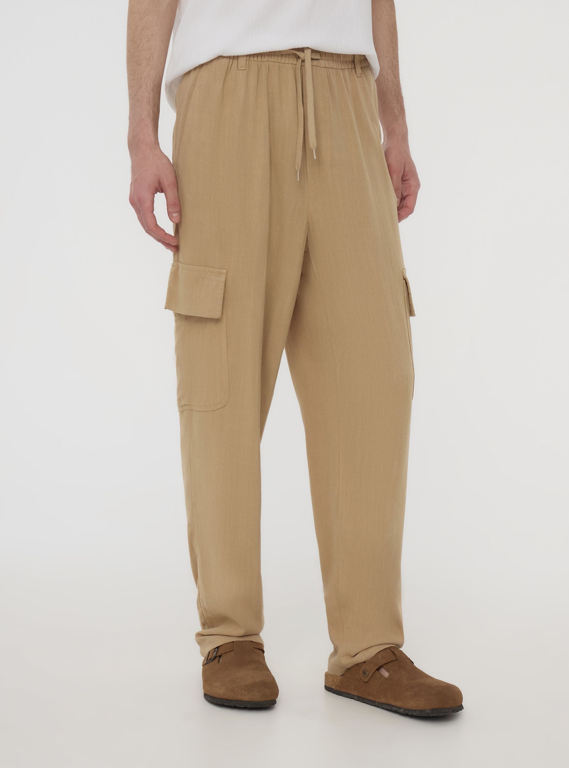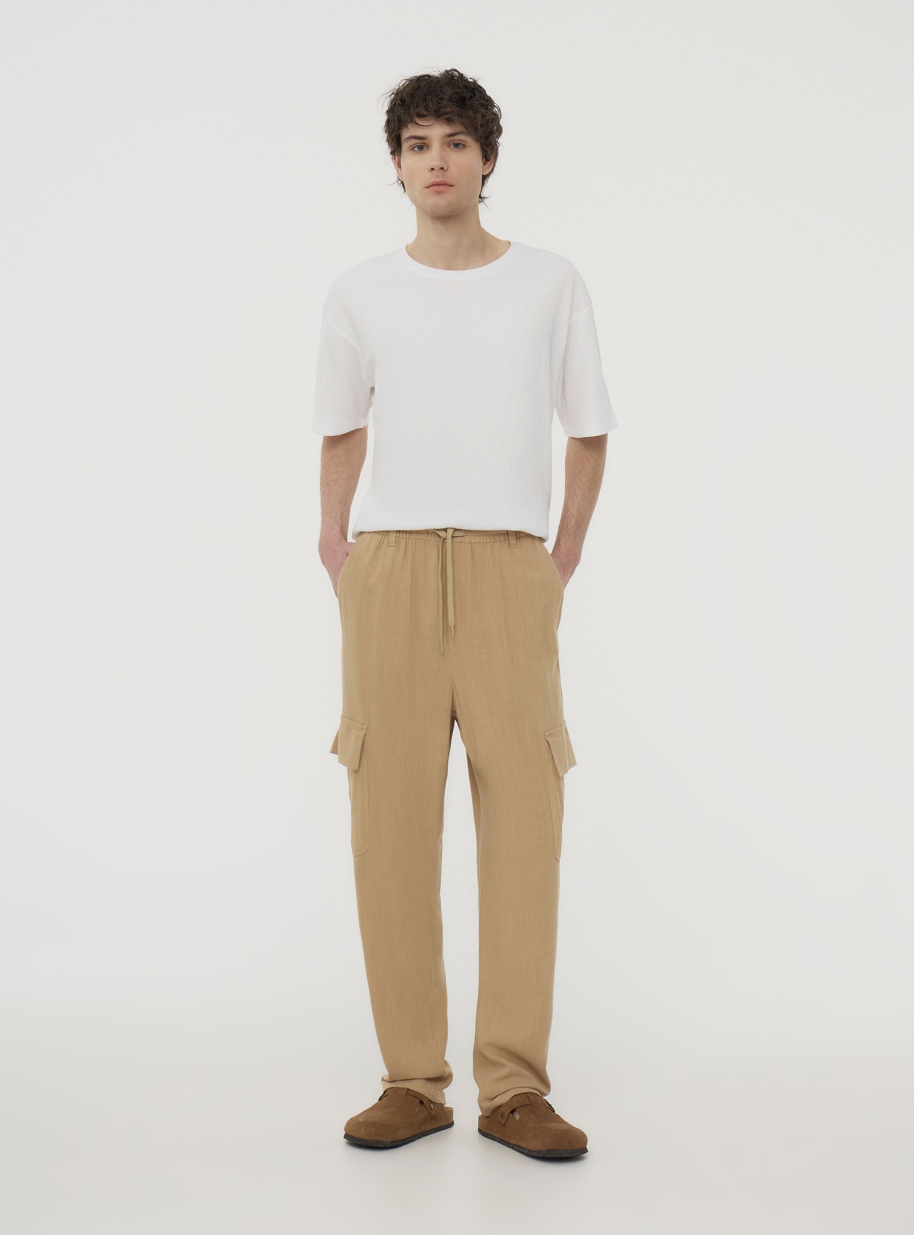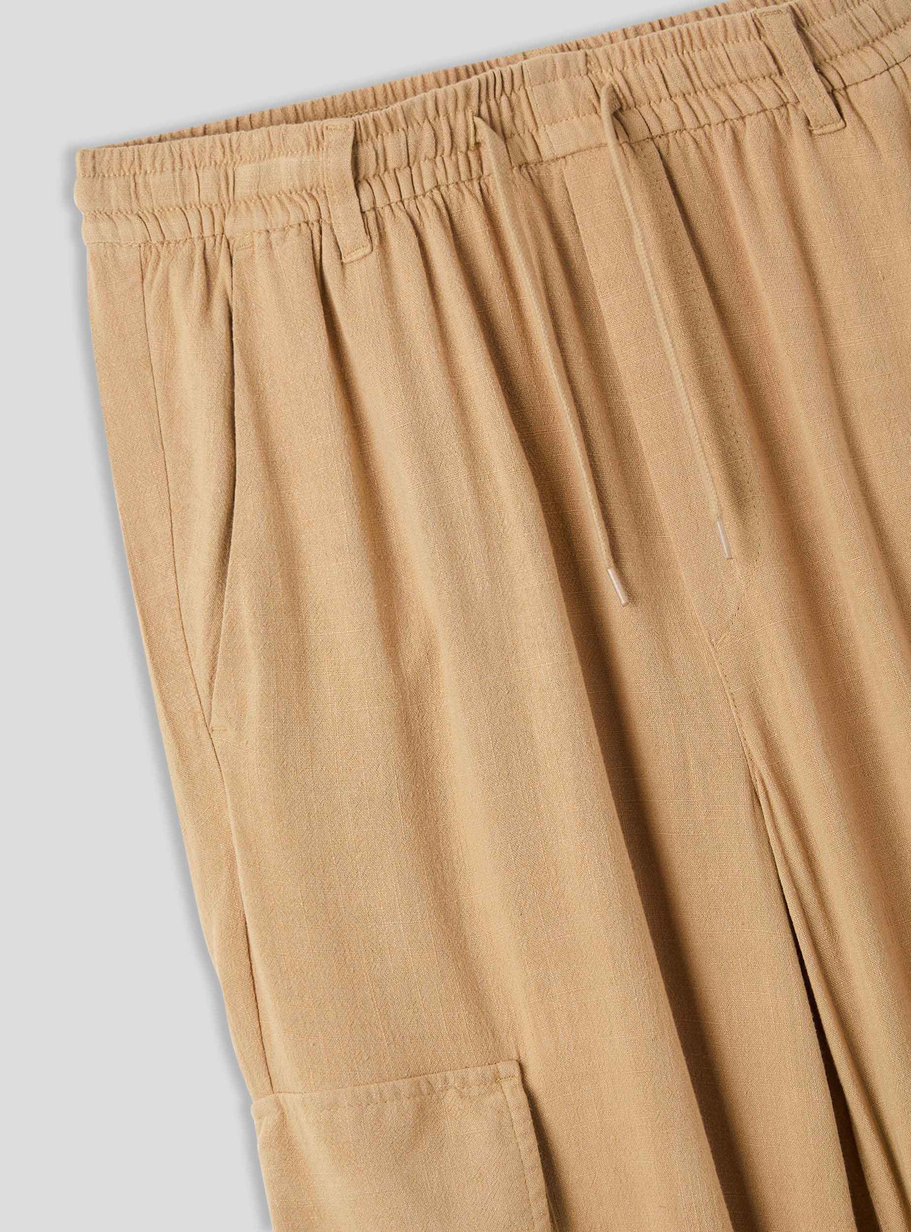 Pantaloni da uomo in misto lino ideali per un look casual e versatile, perfetti per il tempo libero o per un outfit informale. Caratterizzati da una vestibilità regolare, presentano un design con tasche applicate e chiusura con coulisse. Una scelta pratica e comoda per chi cerca stile e funzionalità.