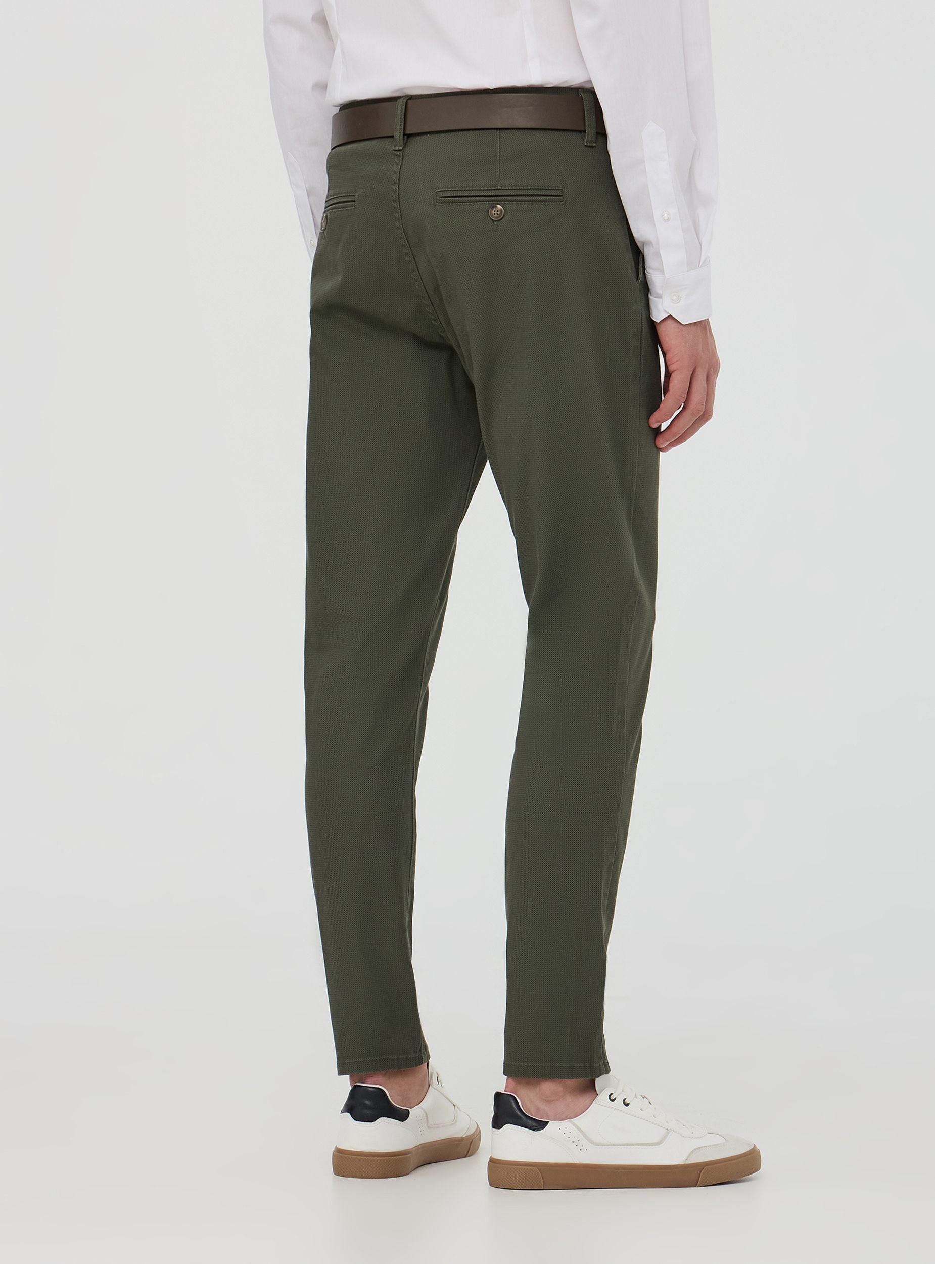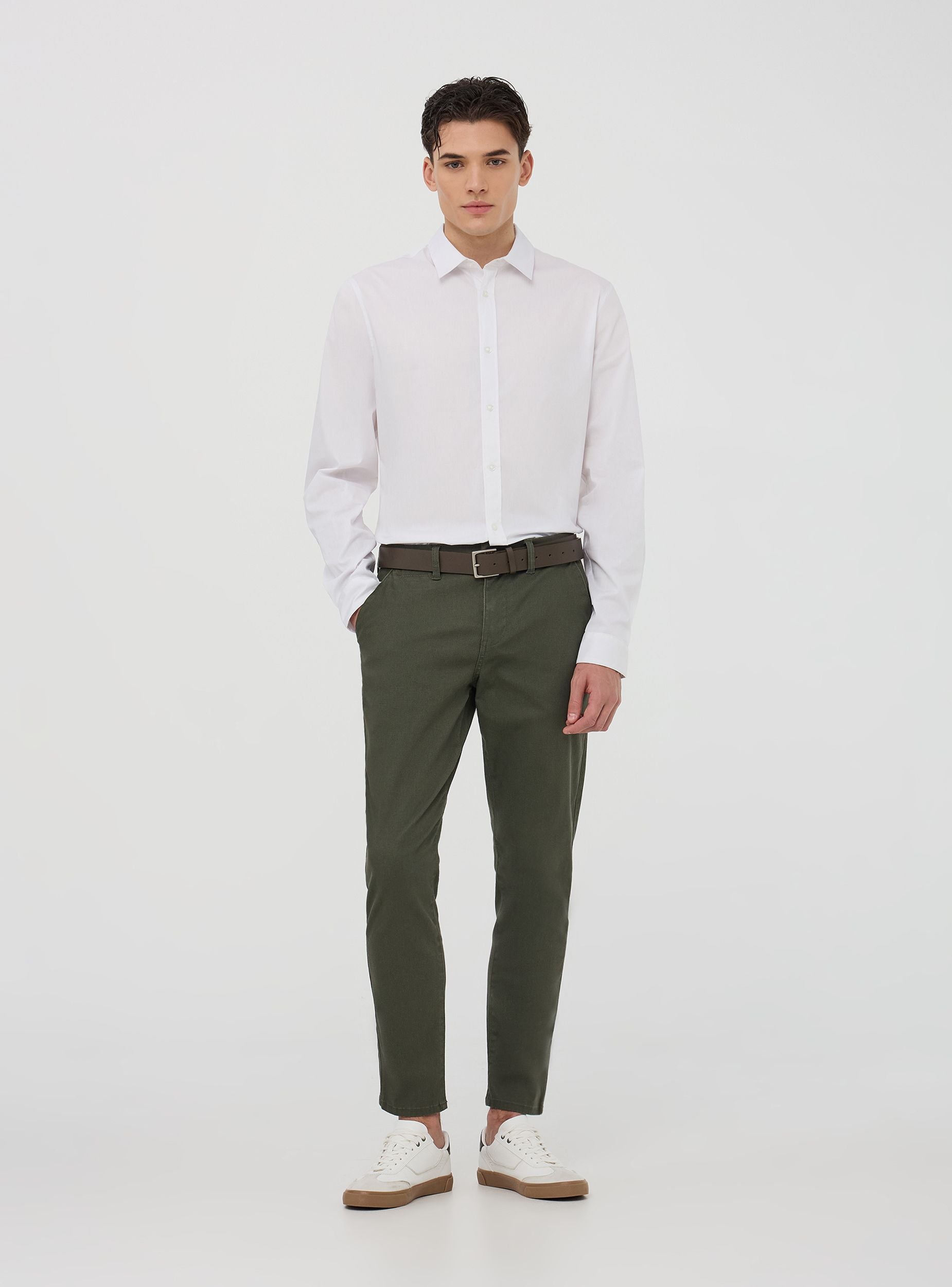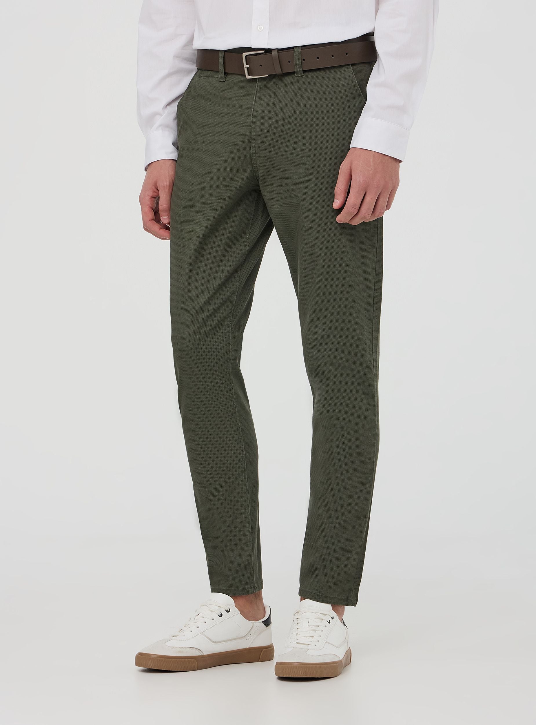 Pantaloni da uomo modello chino con fit skinny e microfantasia, ideali per un look moderno e curato. Dotati di chiusura con bottone e zip, passanti in vita e pratiche tasche, offrono stile e funzionalità. Perfetti per l’ufficio, abbinati a camicie e mocassini, o per il tempo libero con maglie casual e sneakers, garantendo versatilità in ogni occasione.