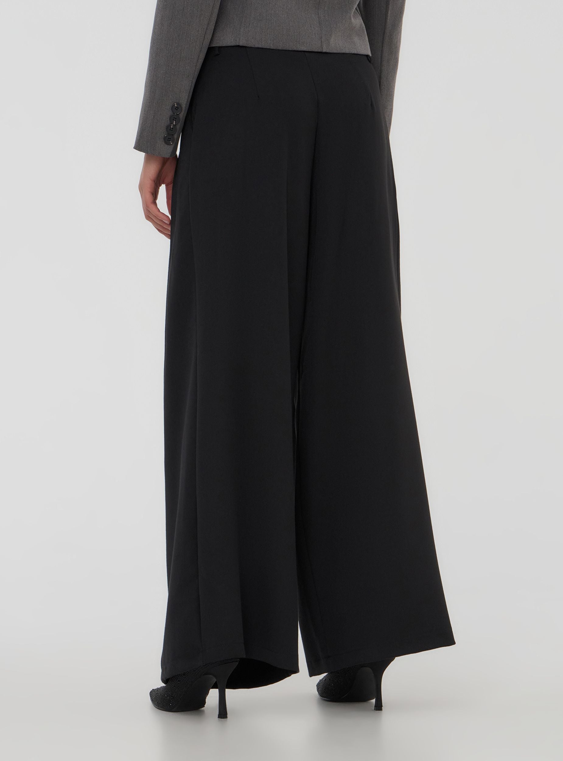 Pantaloni da donna dal taglio palazzo, caratterizzati da un design moderno in tinta unita. Le pinces sulla parte frontale aggiungono un tocco raffinato, esaltando la silhouette con un effetto elegante e contemporaneo. La loro vestibilità ampia e confortevole li rende perfetti per creare outfit sia formali che casual. Un capo versatile e di grande impatto per completare il guardaroba con stile.Dettagli