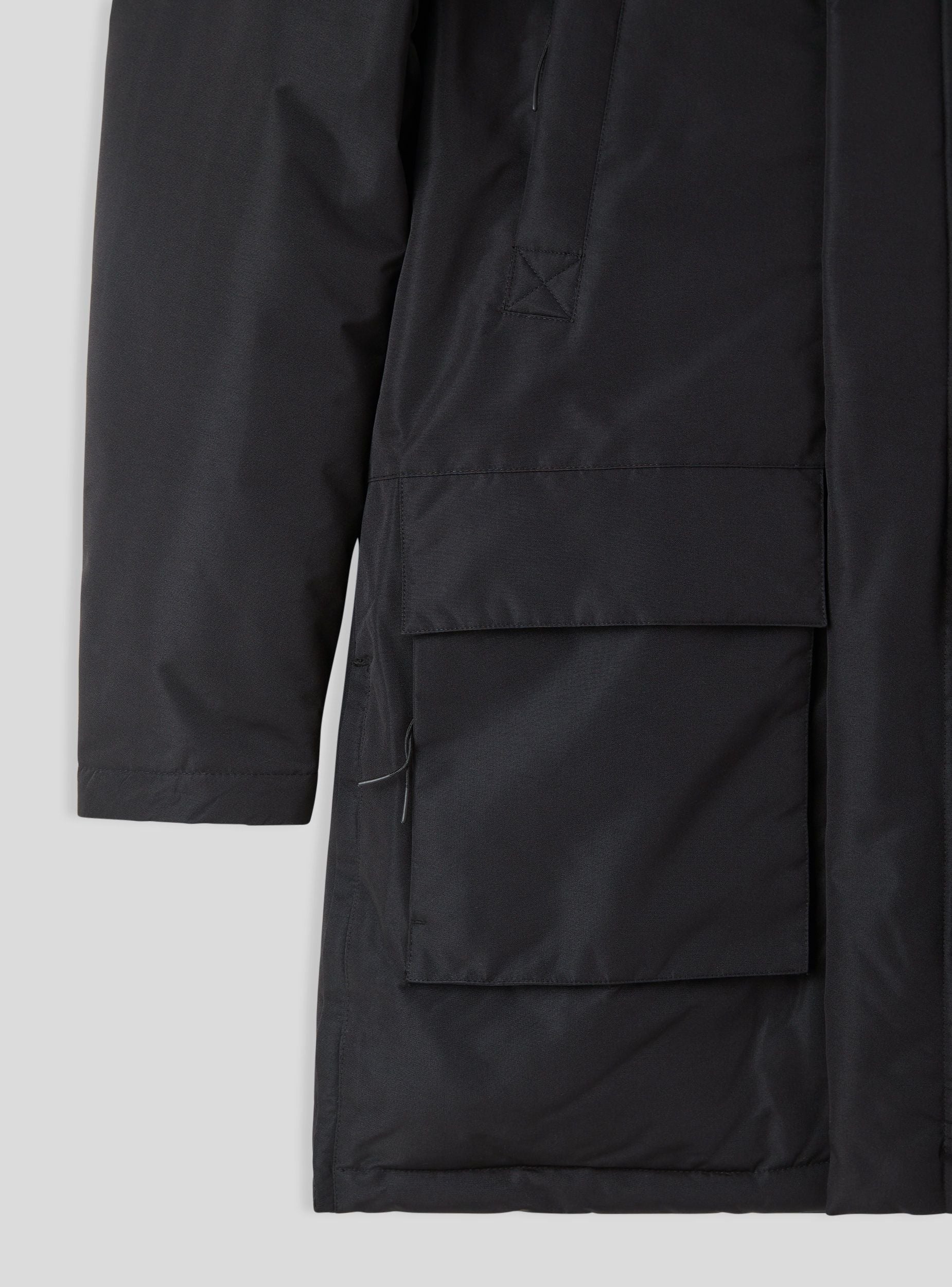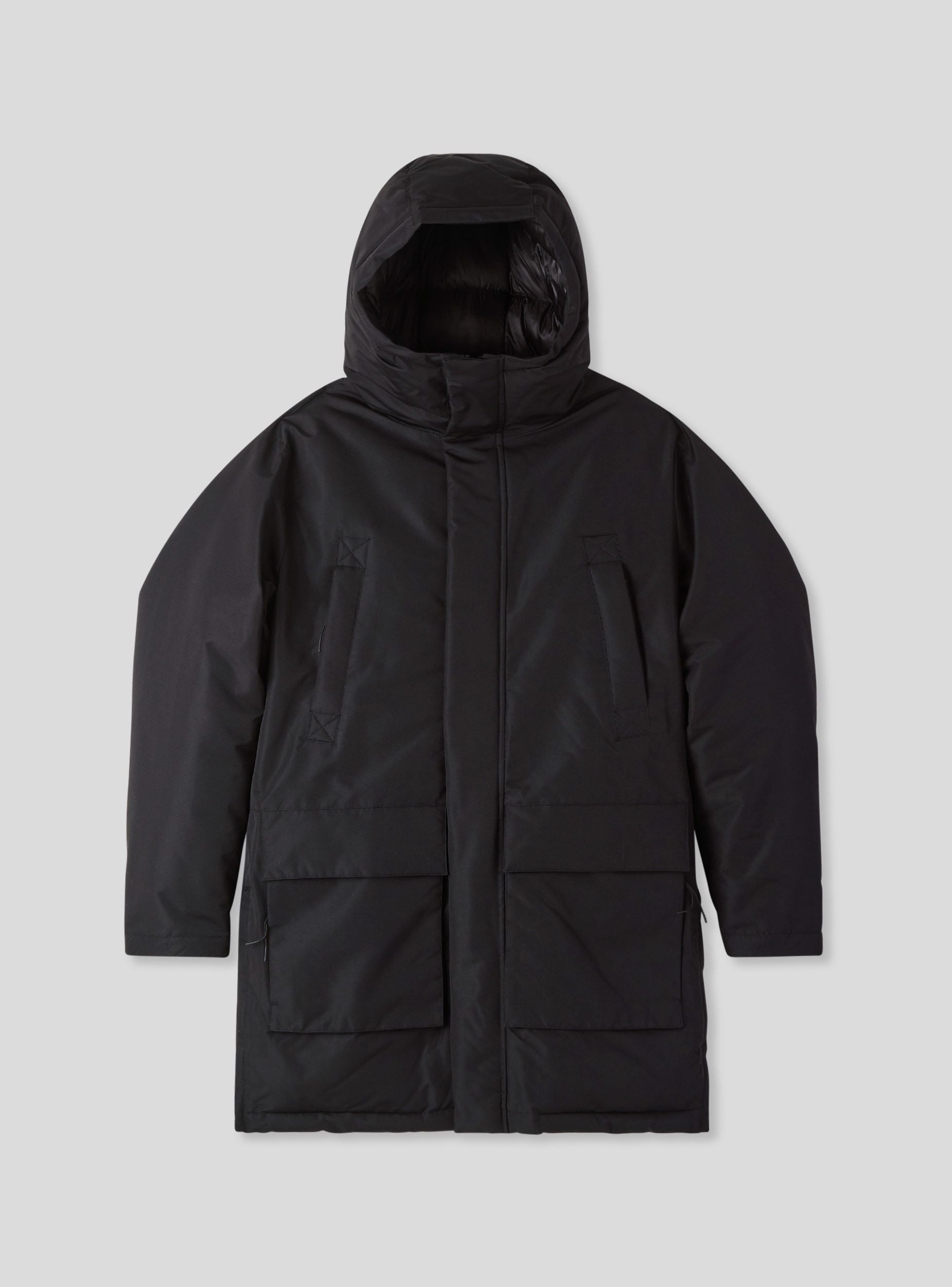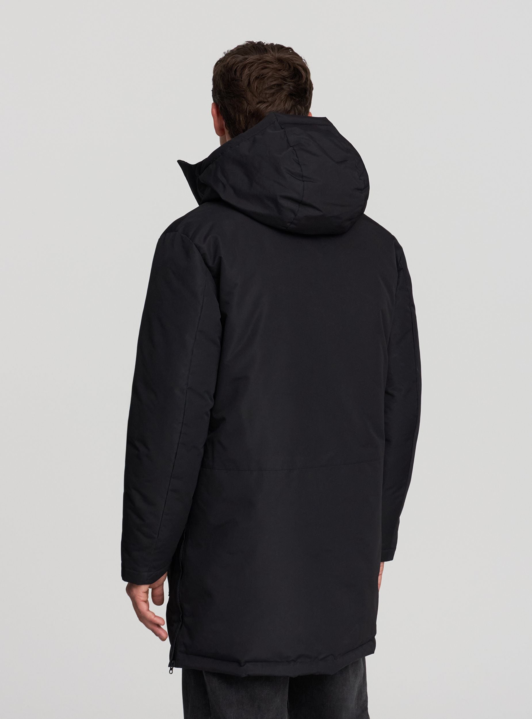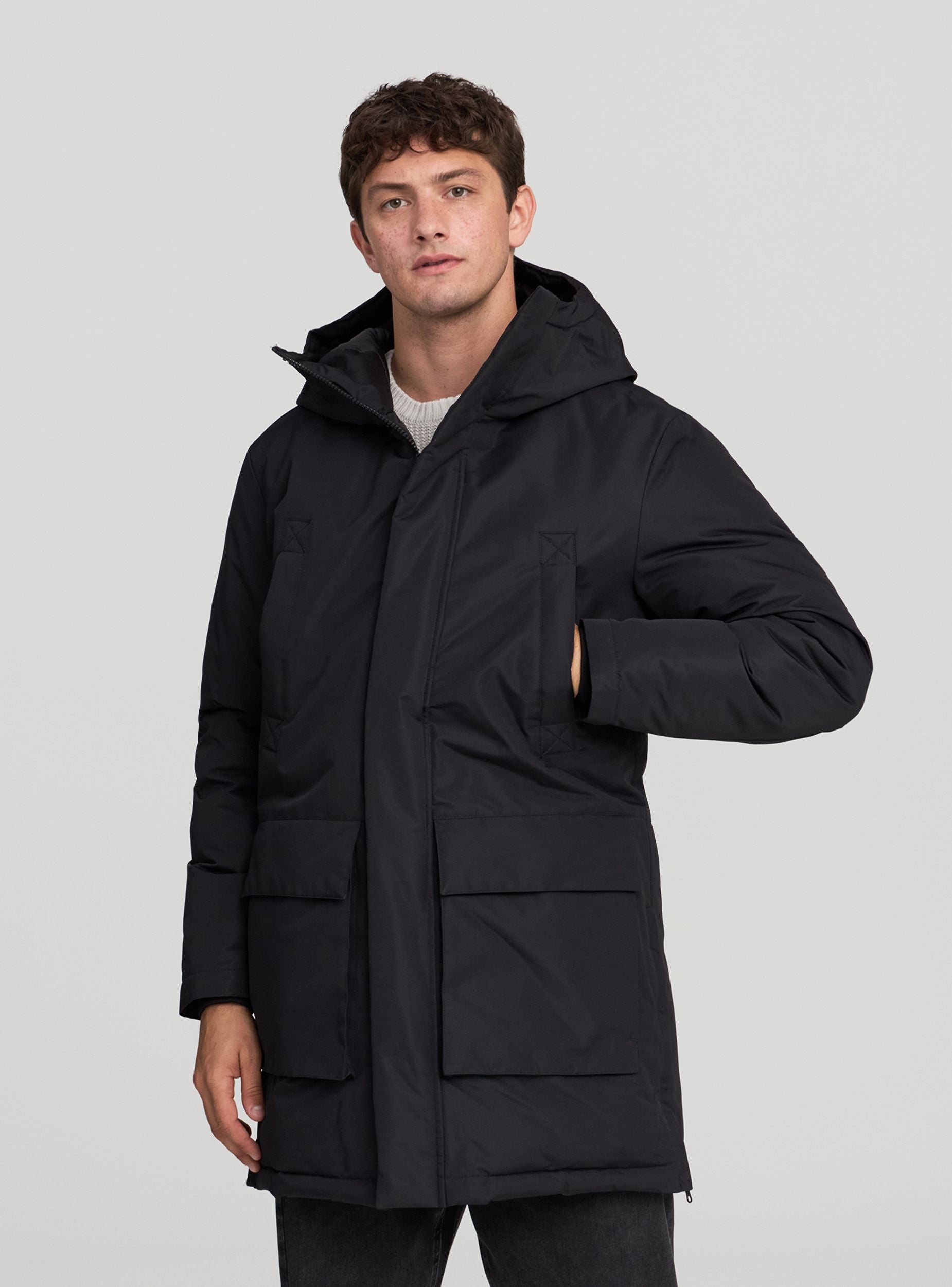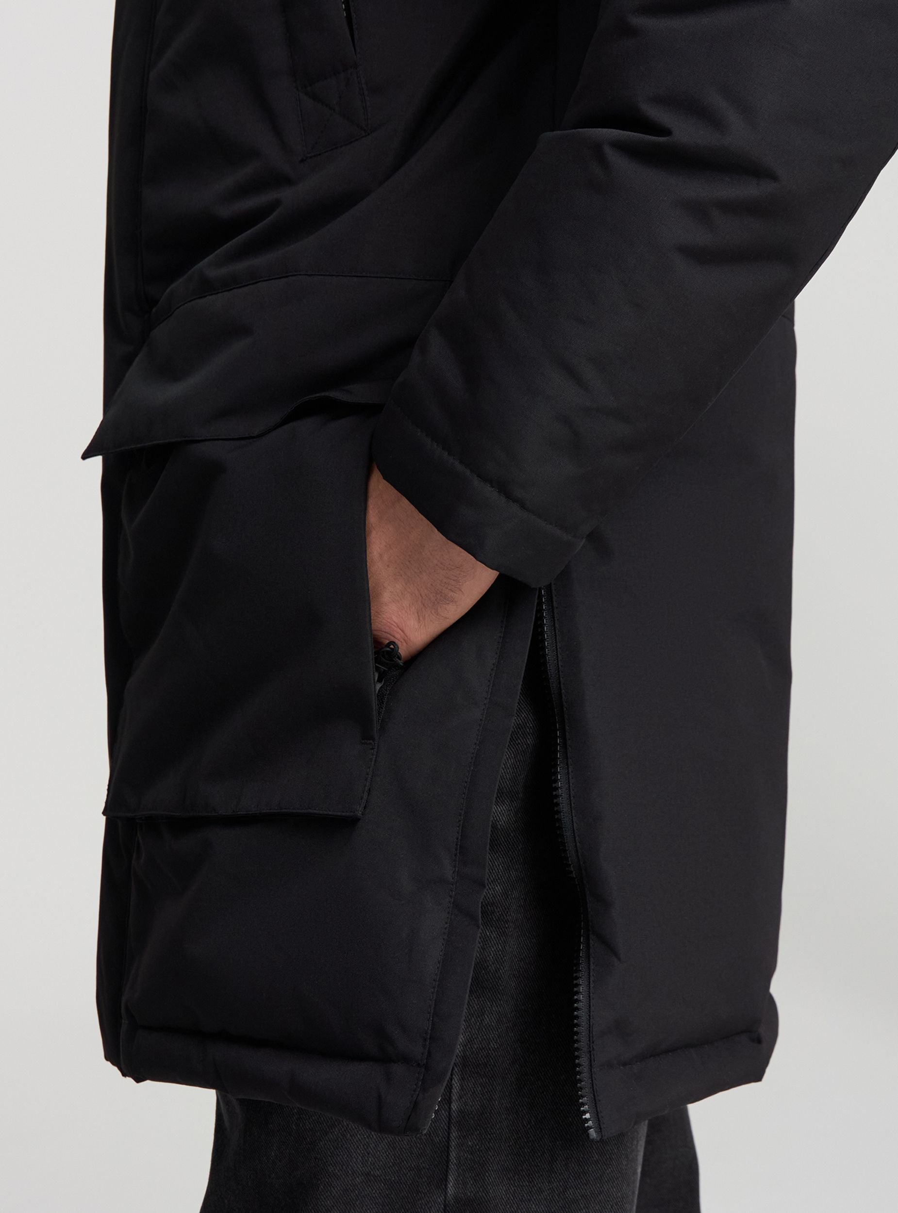 Parka da uomo lungo imbottito con cappuccio, pensato per offrire il massimo comfort durante la stagione invernale. Design funzionale dotato di maniche lunghe con polsini in maglia interna, garantisce una protezione ottimale dal freddo, chiusura con zip nascosta e bottoni a pressione. Tessuto resistente all'acqua a tinta unita. Dotato di quattro tasche esterne con zip e una tasca interna con velcro. Perfetto per affrontare le giornate di pioggia o vento, è l’ideale da indossare su outfit casual o da lavoro.