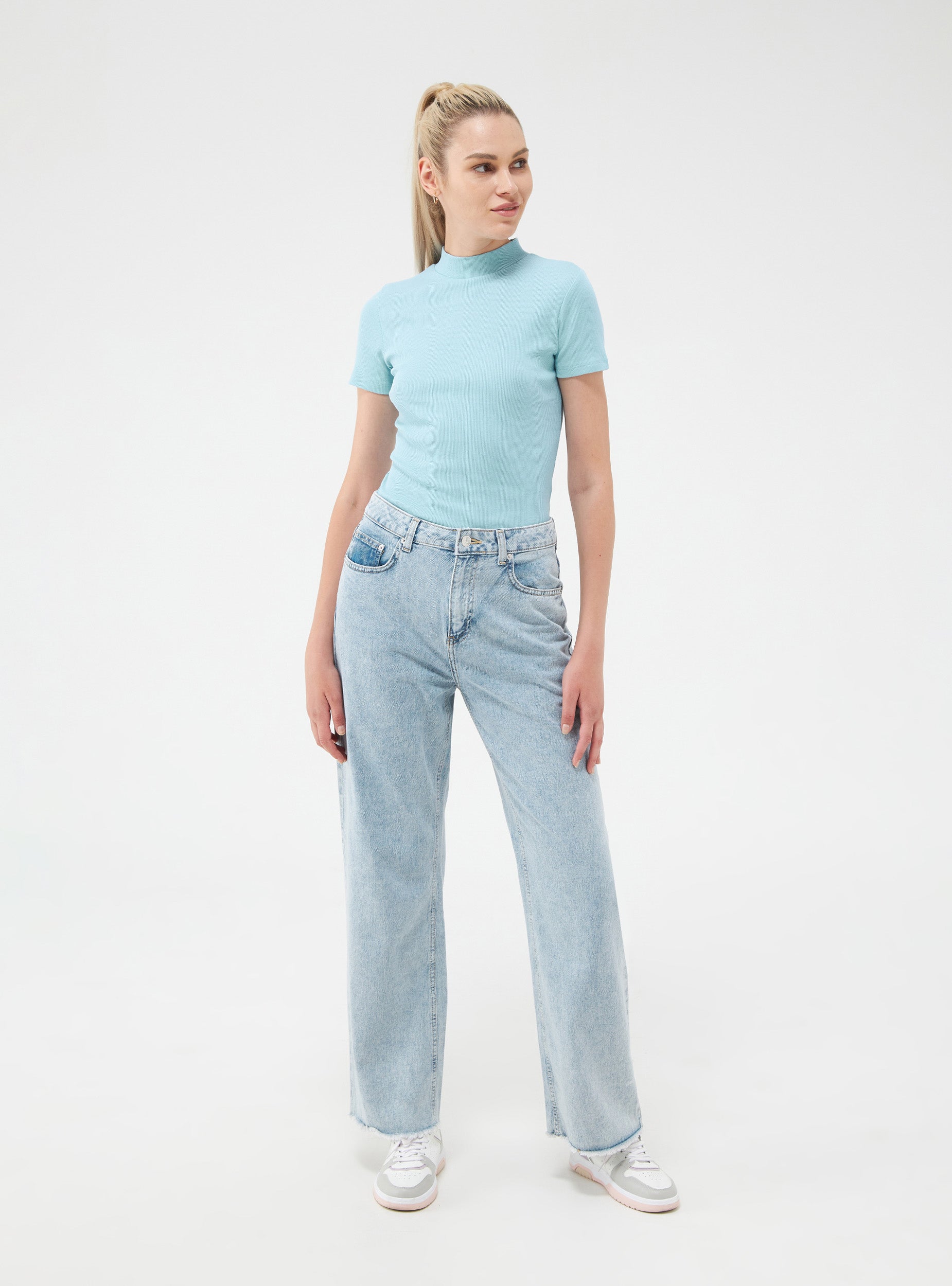 Maglietta donna a manica corta in tessuto a costina tinta unita. Collo lupetto. Vestibilità  slim.