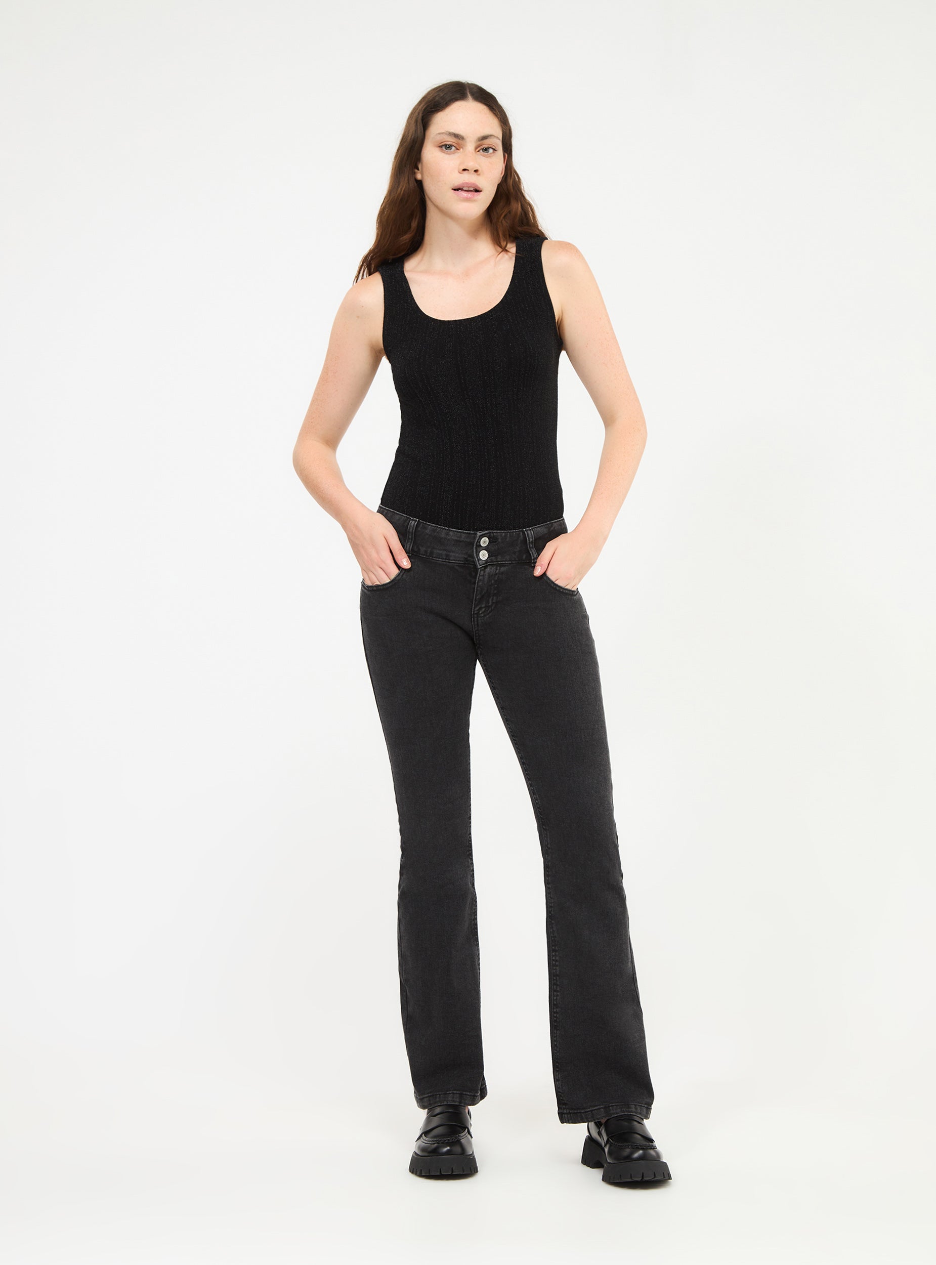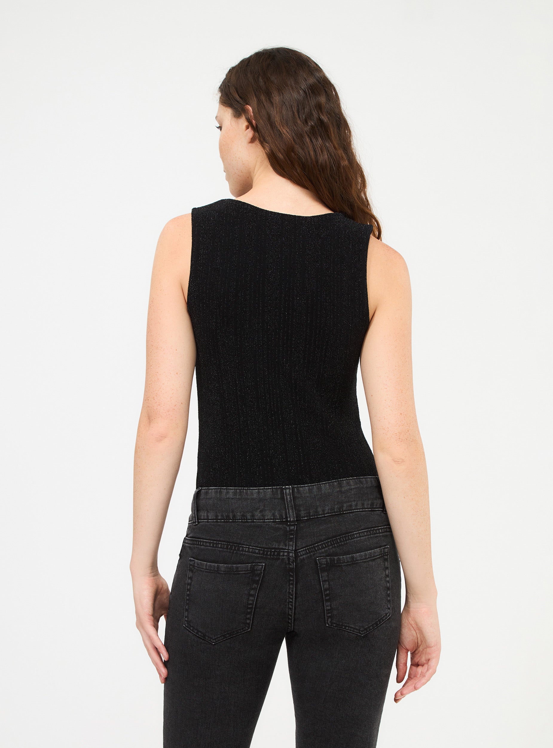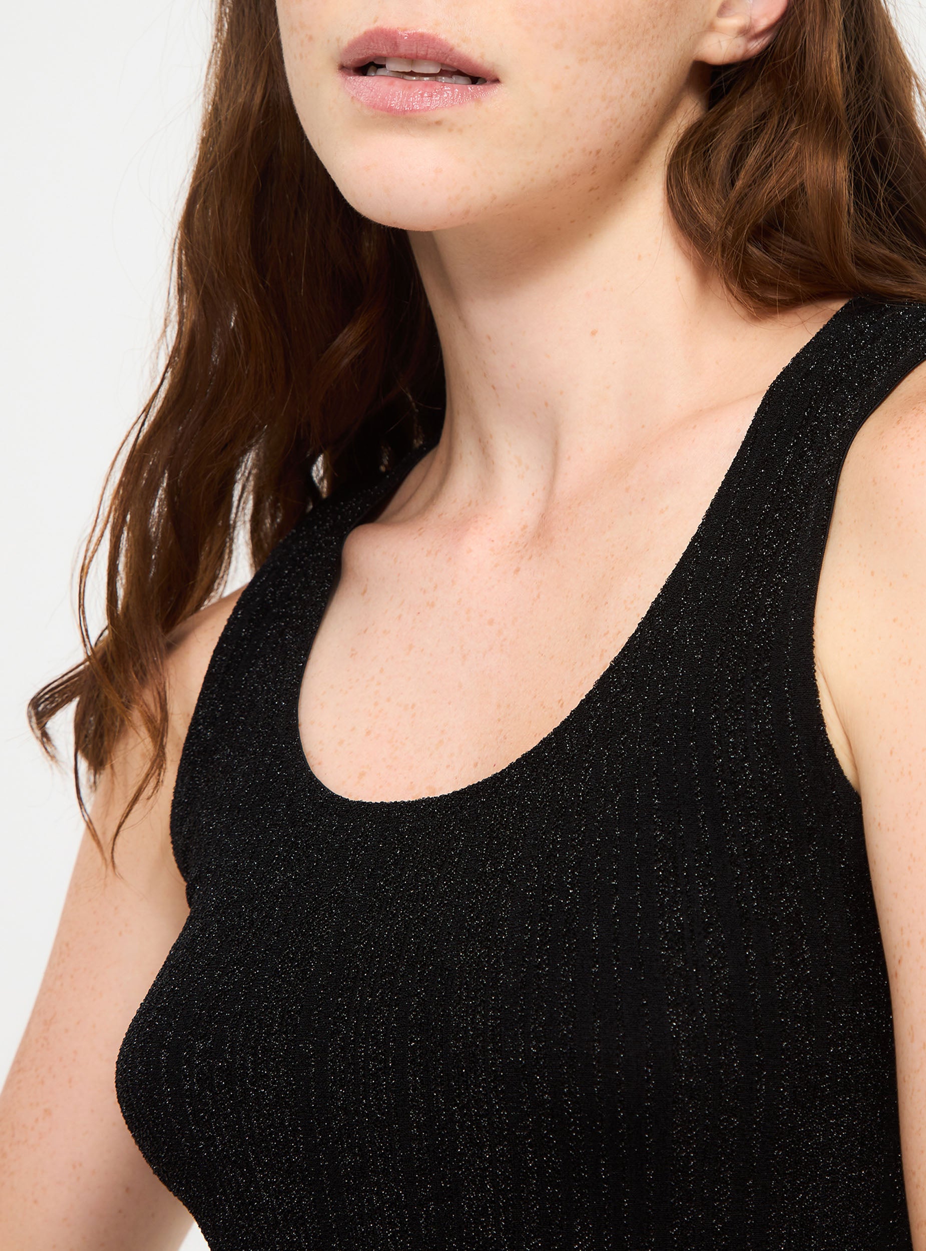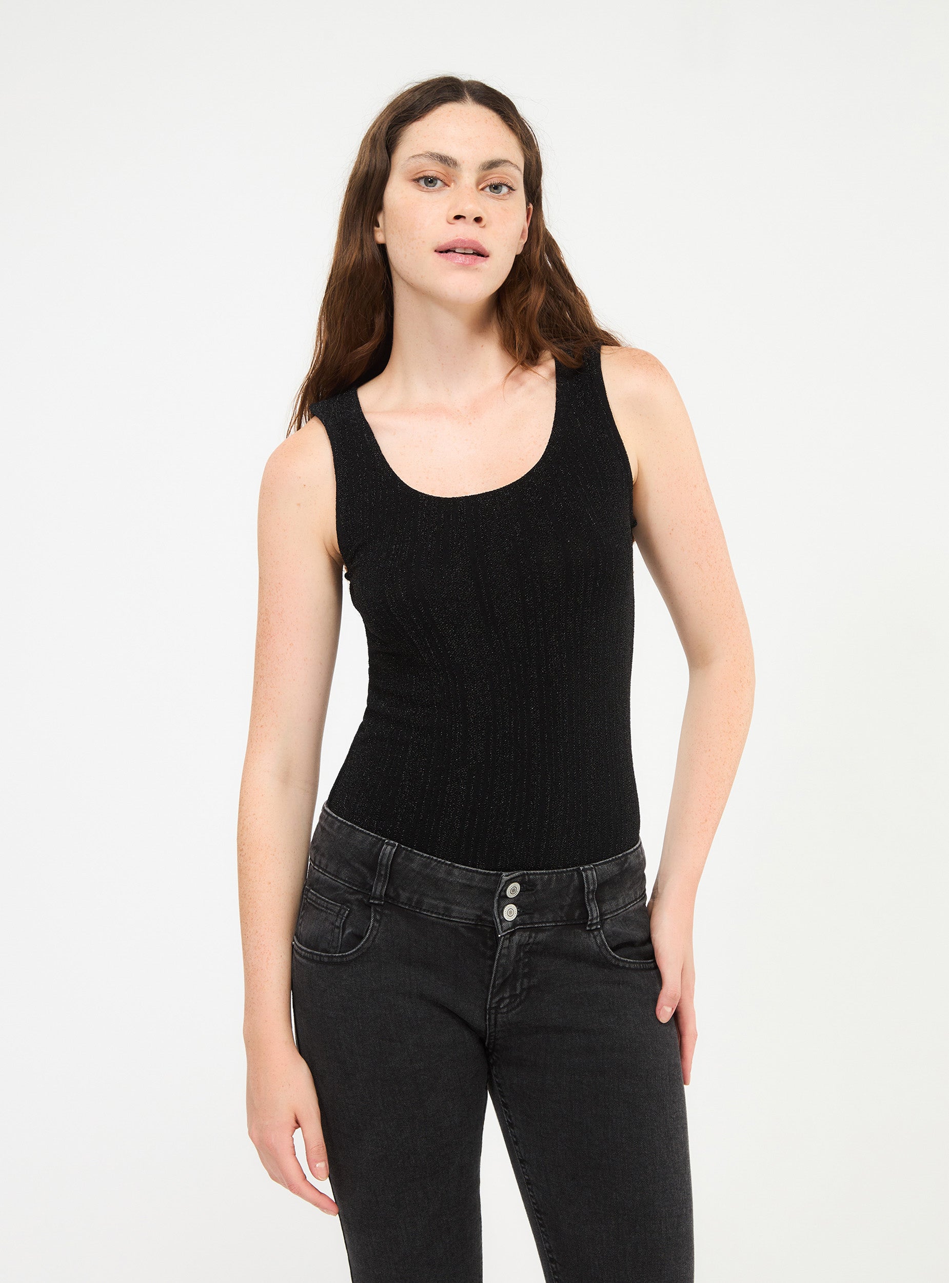 Canotta da donna con scollo ampio e spallina larga. Tessuto tinta unita luccicante.La modellaèalta 1,78 e indossa la taglia S.