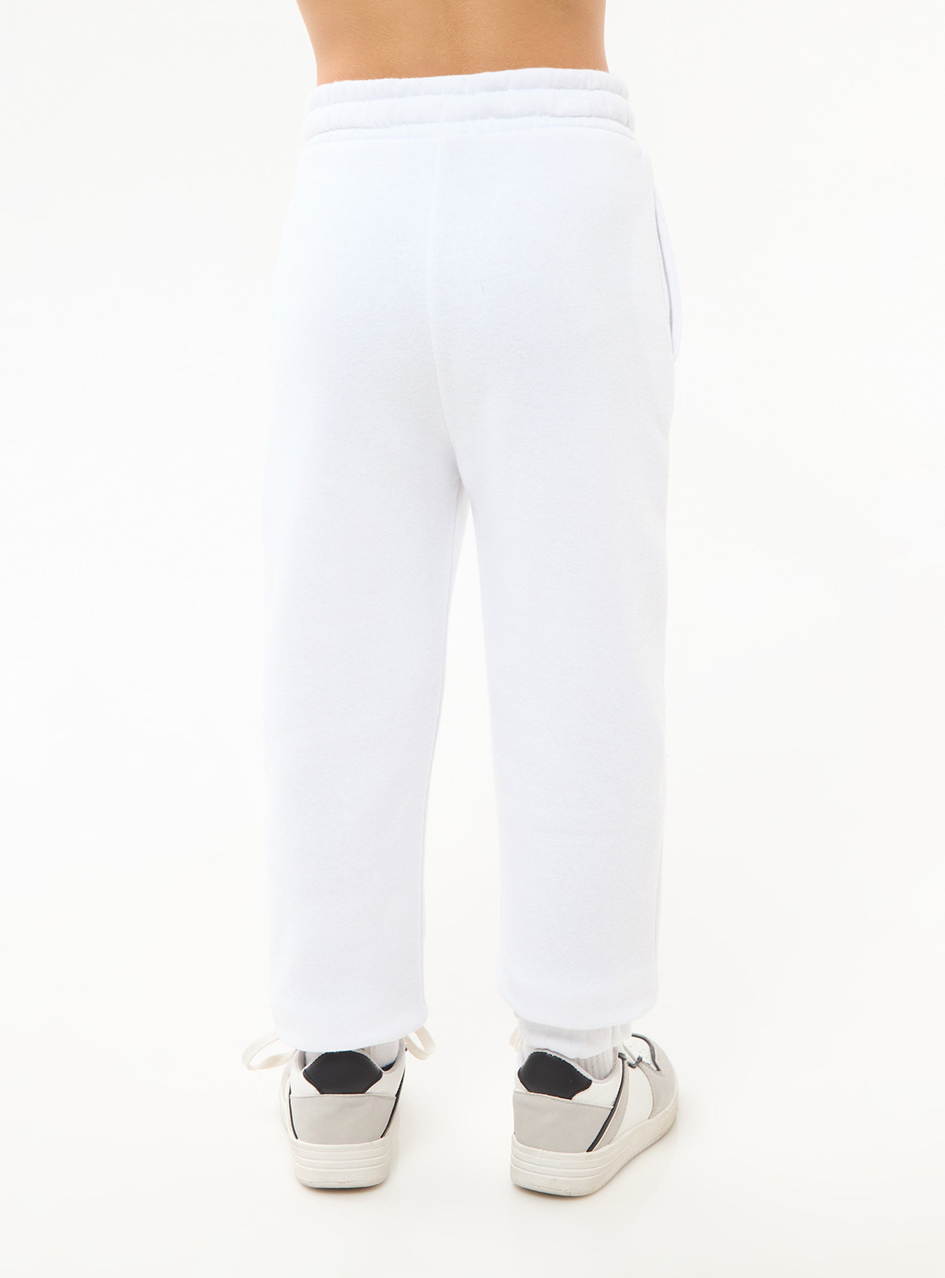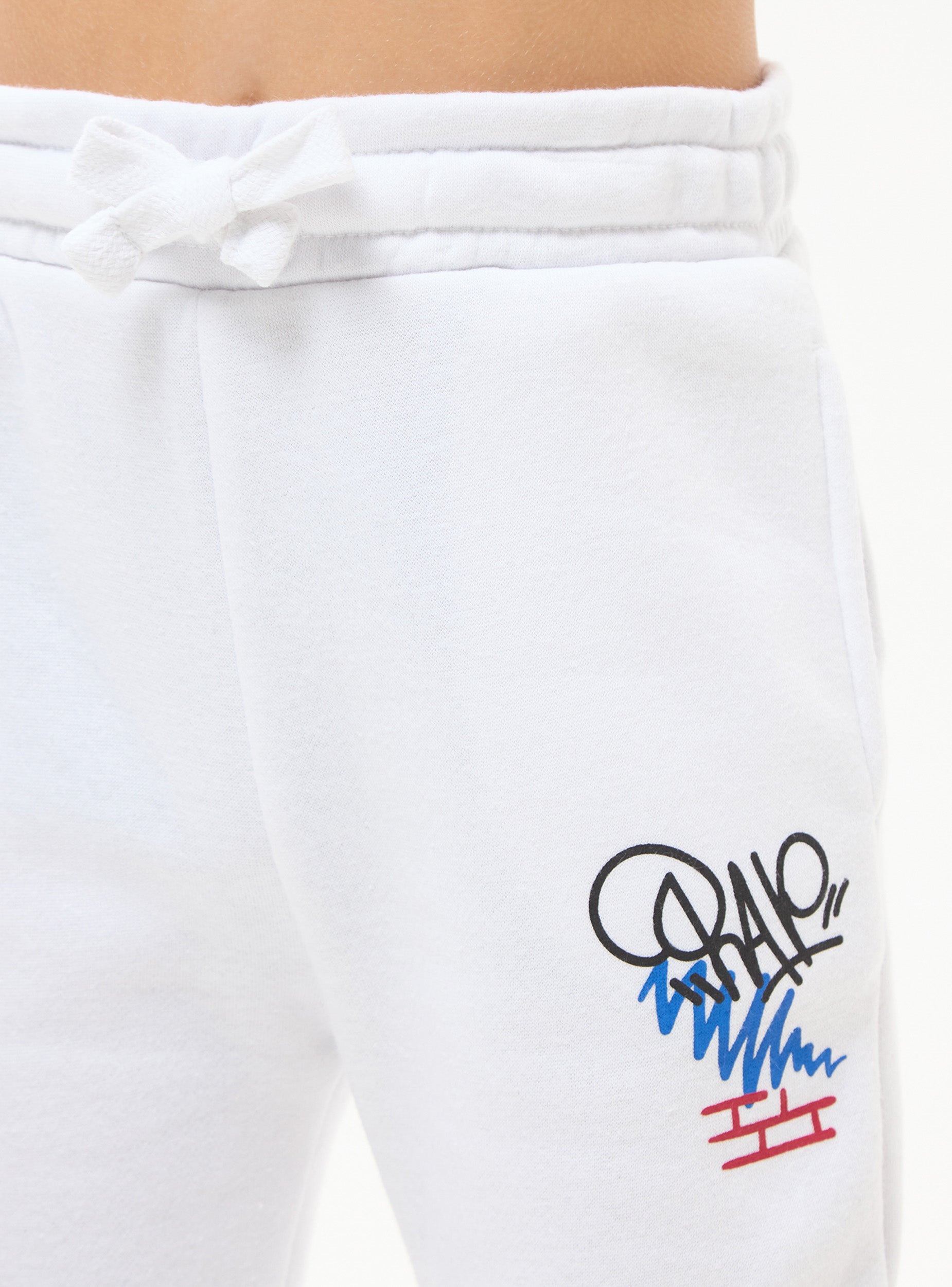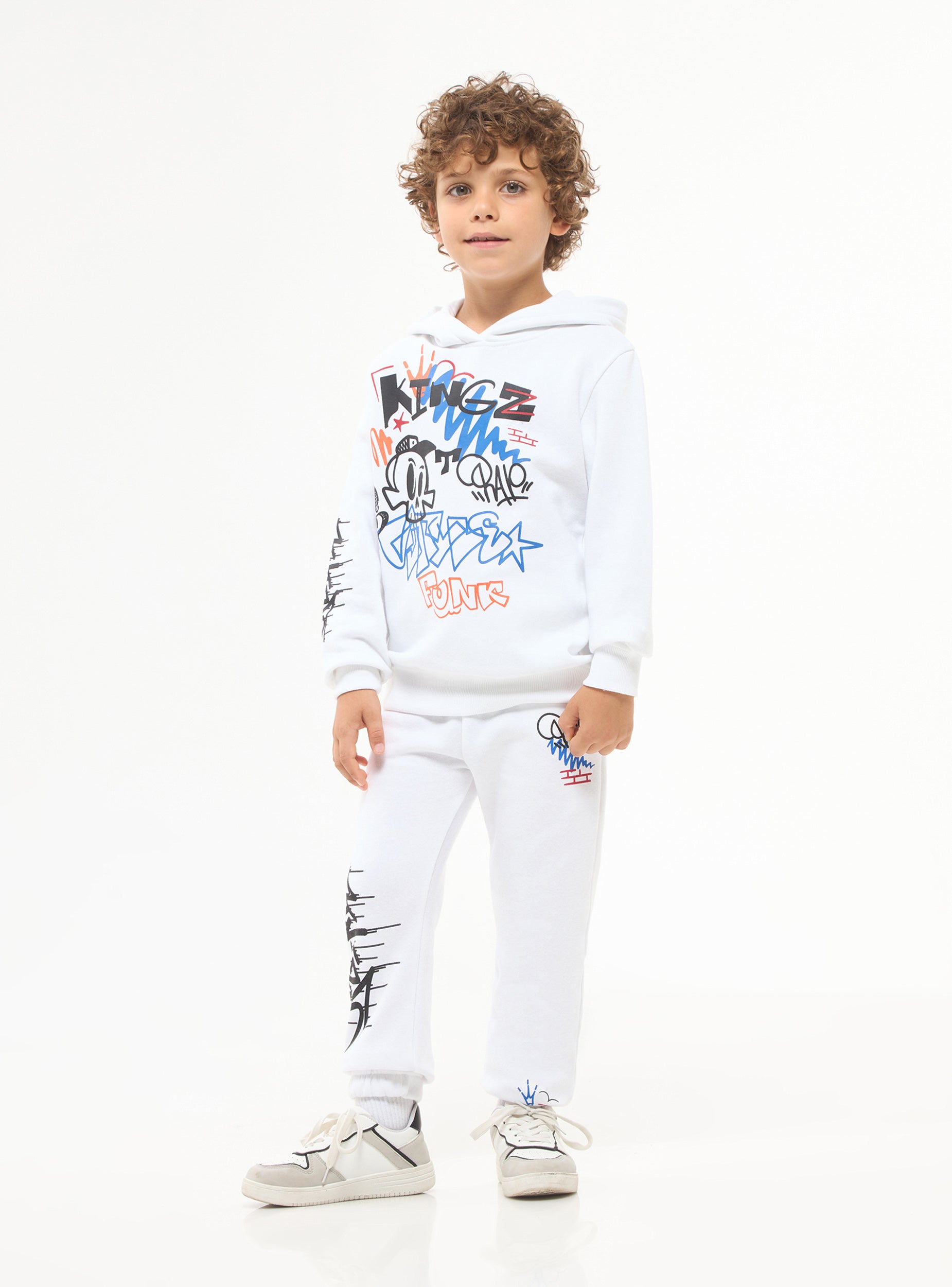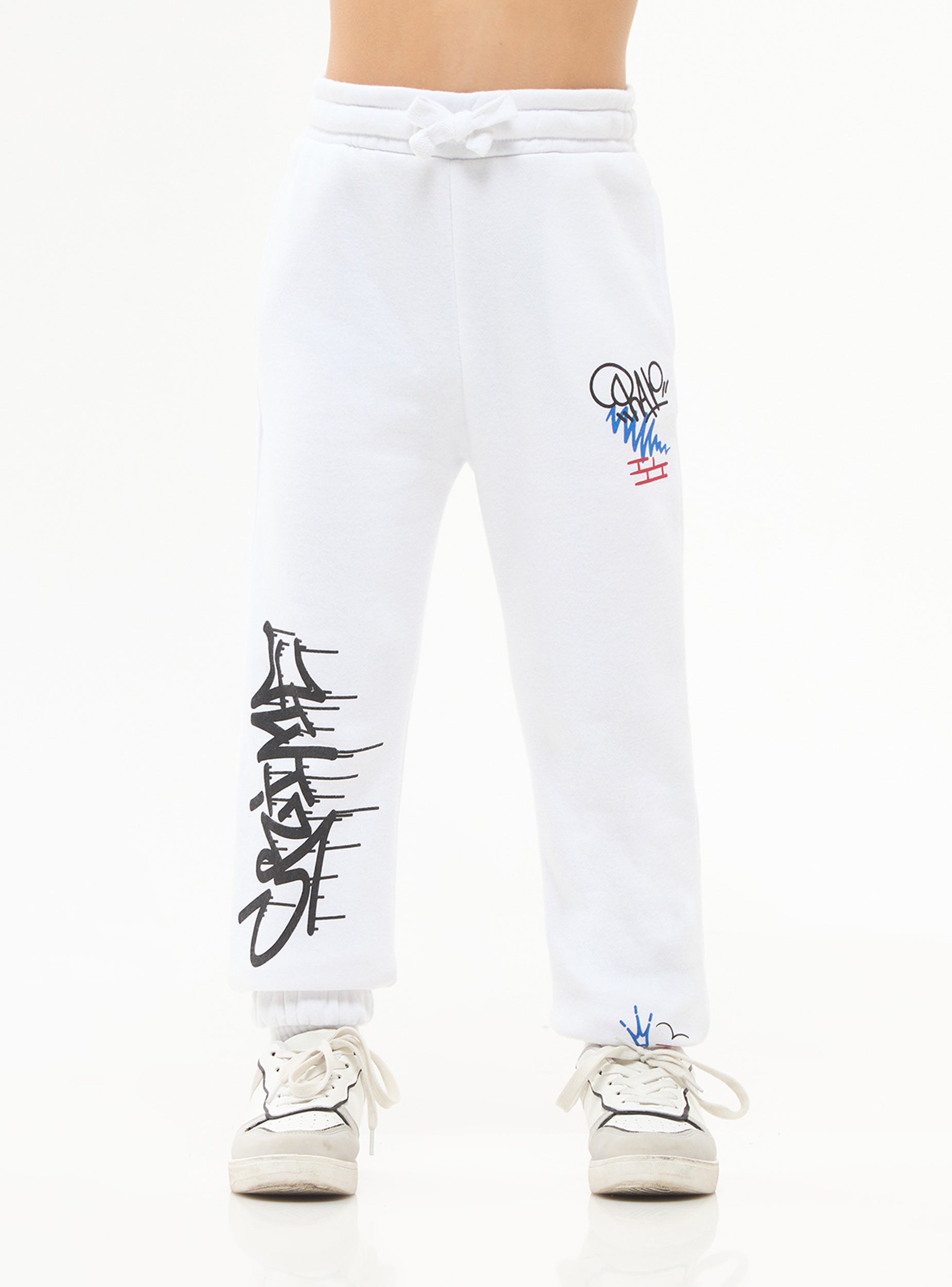 Pantaloni tuta da bambino. Elastico in vita con coulisse, fondo con polsino. Tessuto pesante a tinta unita con stampe stile graffiti.