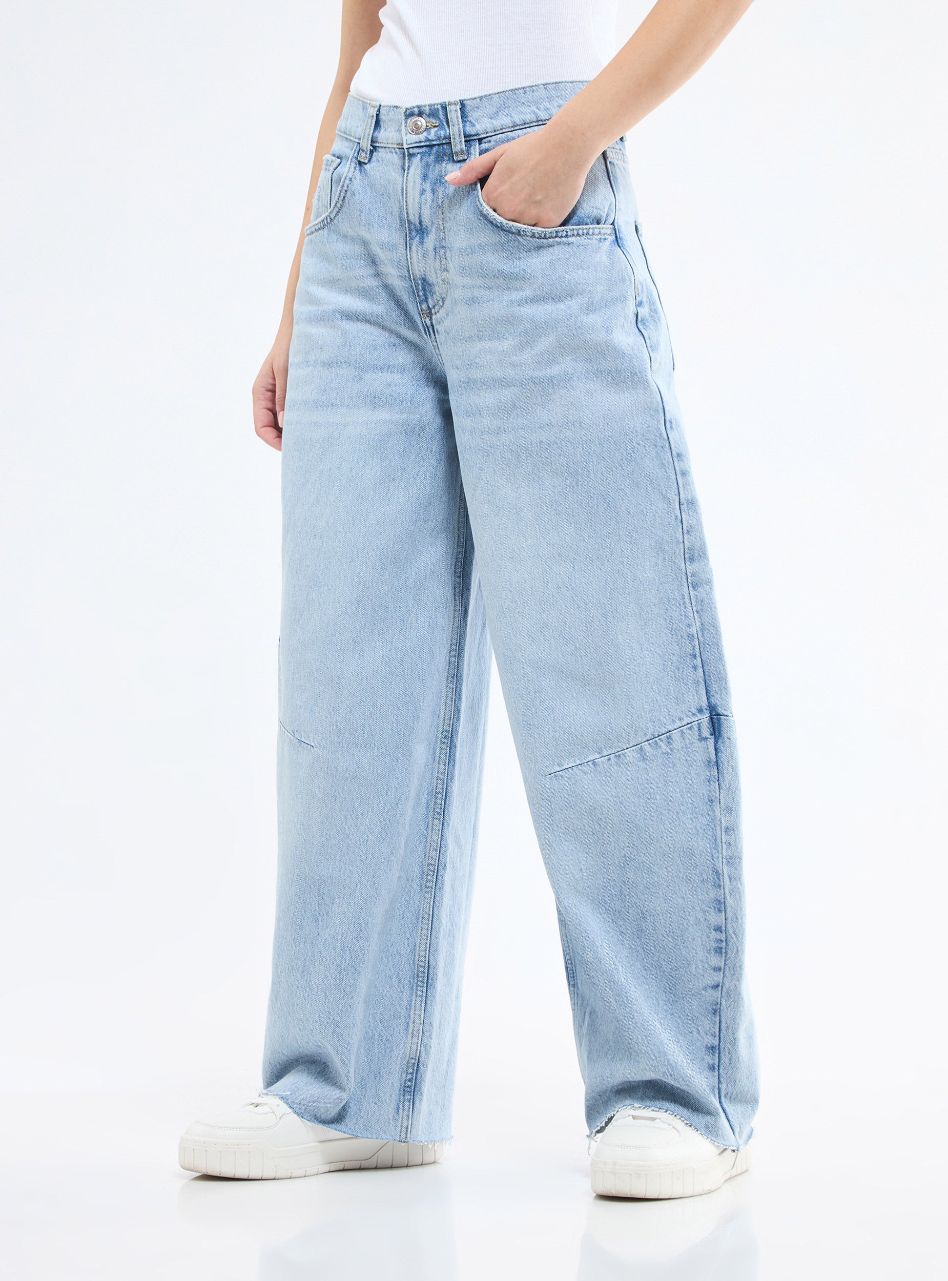 Jeans da donna a 5 tasche, modello boyfriend fit. Lavaggio blu denim chiaro. La modella è alta 1,80 e indossa la taglia 42.