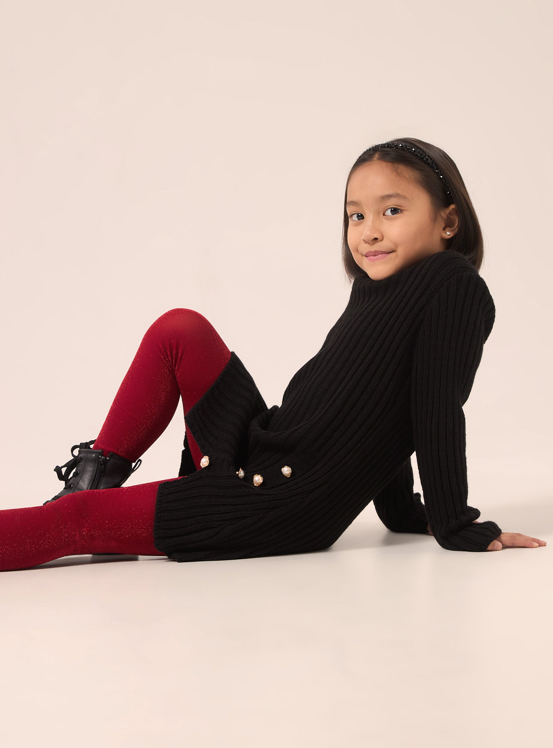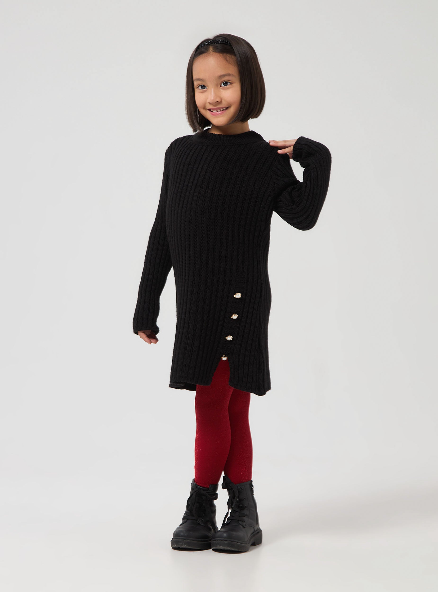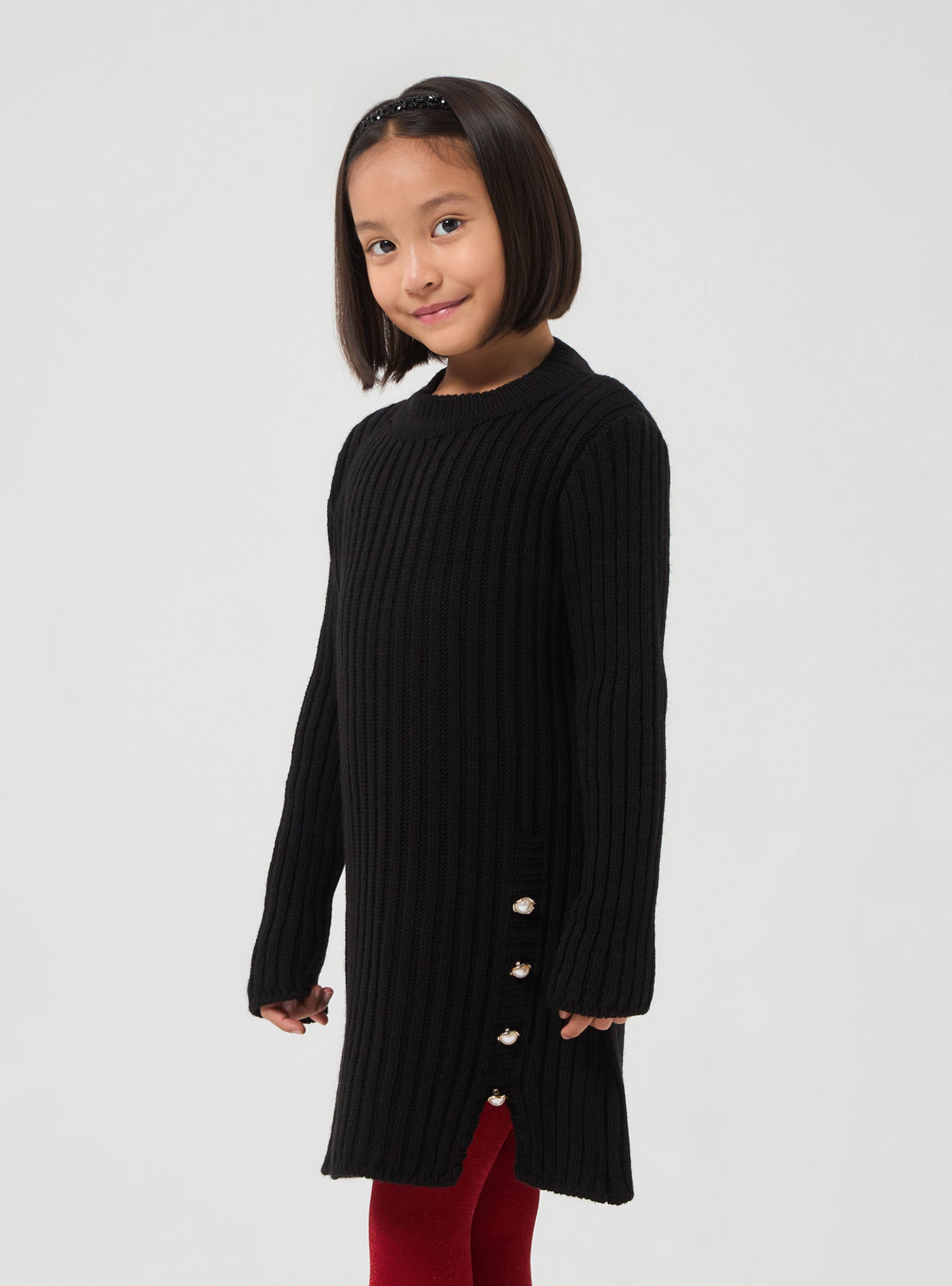 Abito da bambina in maglia a costine tinta unita. Collo a lupetto con maniche lunghe svasate. Piccolo spacco laterale con dettaglio bottoni gioiello. Lunghezza maxi.