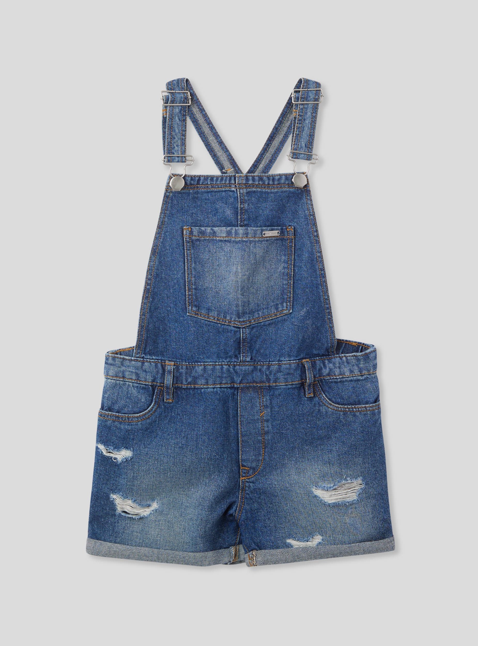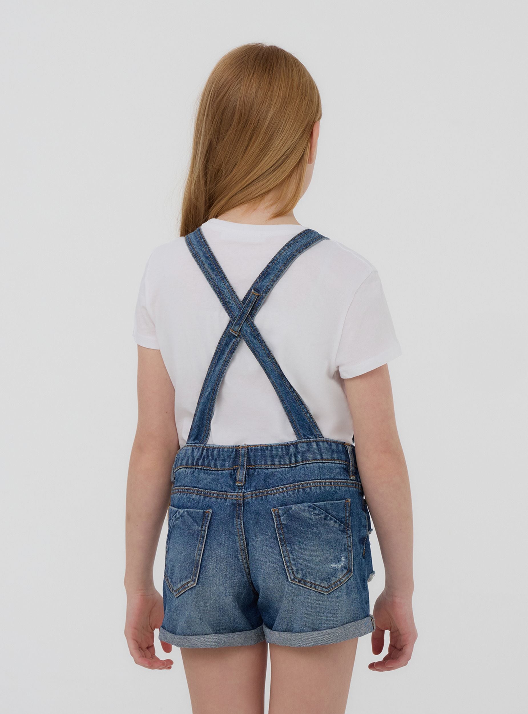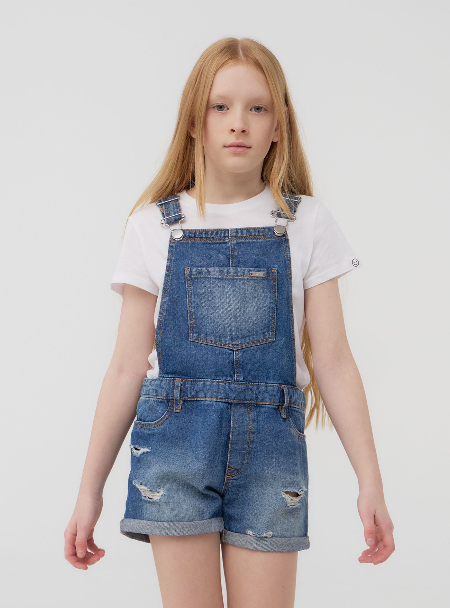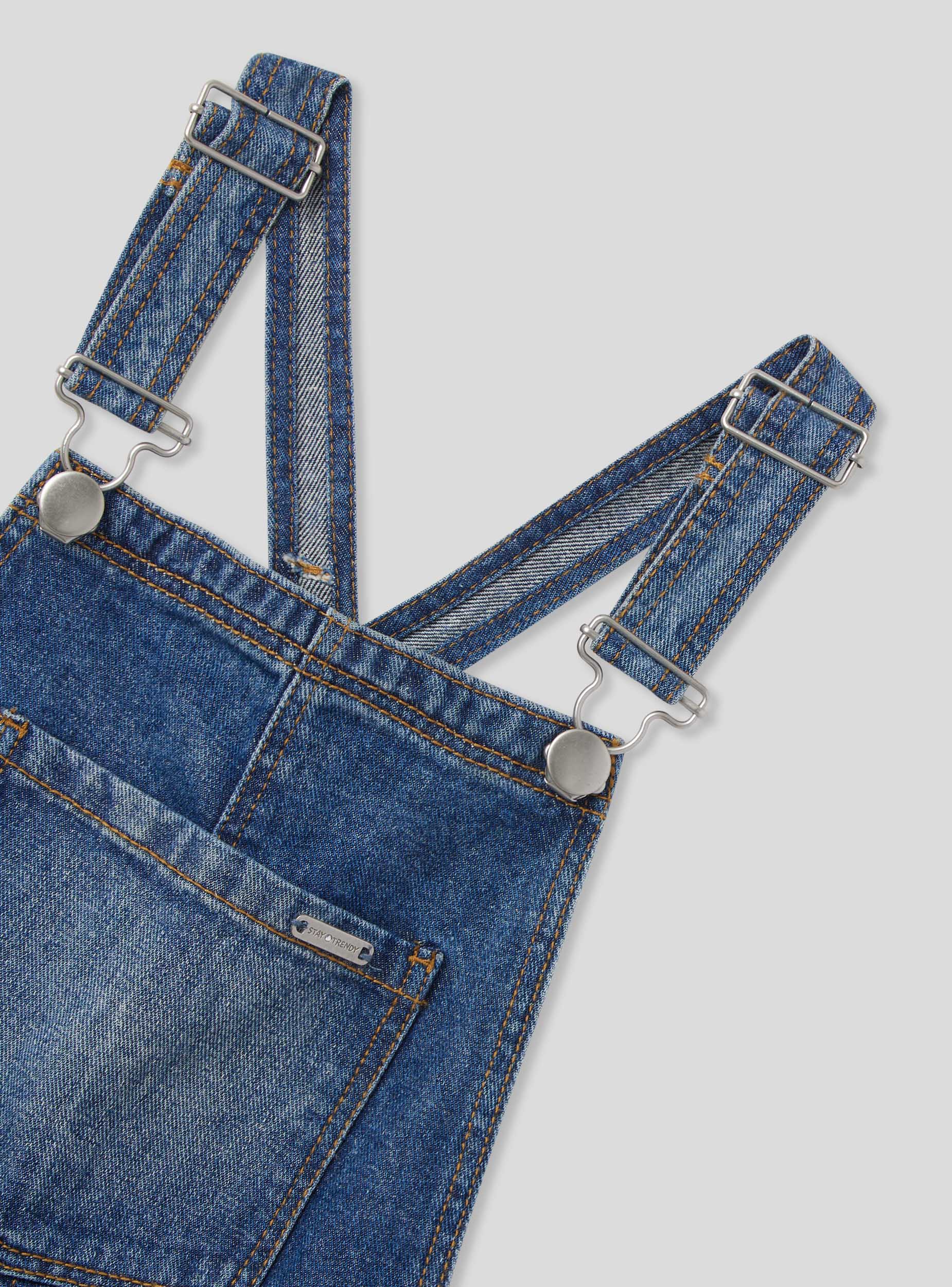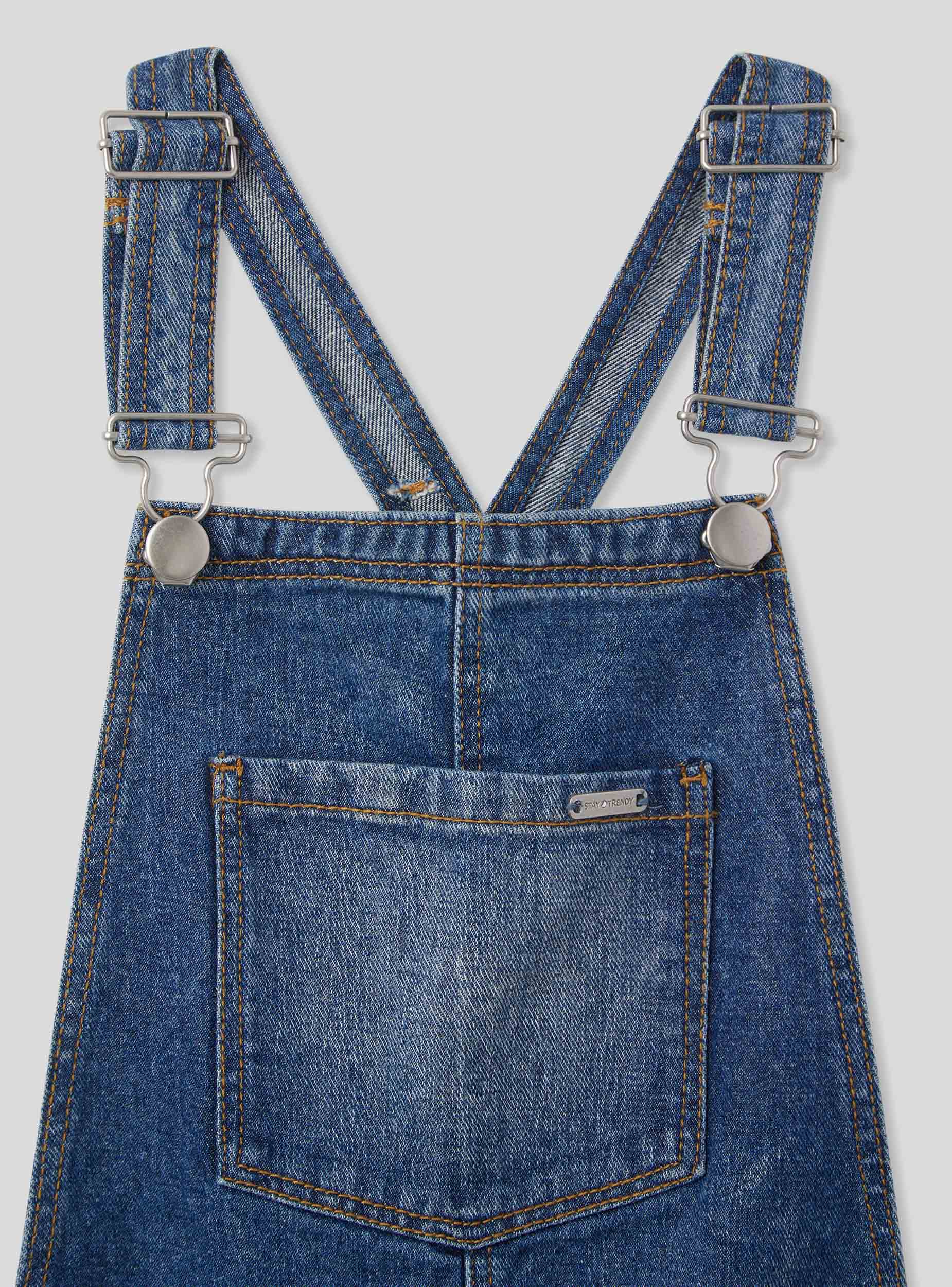 Salopette da bambina dallo stile casual e giocoso. Realizzata in tinta unita con un lavaggio denim medio che dona un look autentico e vissuto, è caratterizzata da strappi strategici che aggiungono un tocco grintoso al capo. Dotata di pratiche bretelle regolabili per una vestibilità ottimale, offre anche comode tasche anteriori e posteriori per riporre piccoli oggetti. Questa salopette è perfetta per le piccole che amano muoversi liberamente e con stile, rendendola ideale per ogni occasione casual o di gioco all'aria aperta.