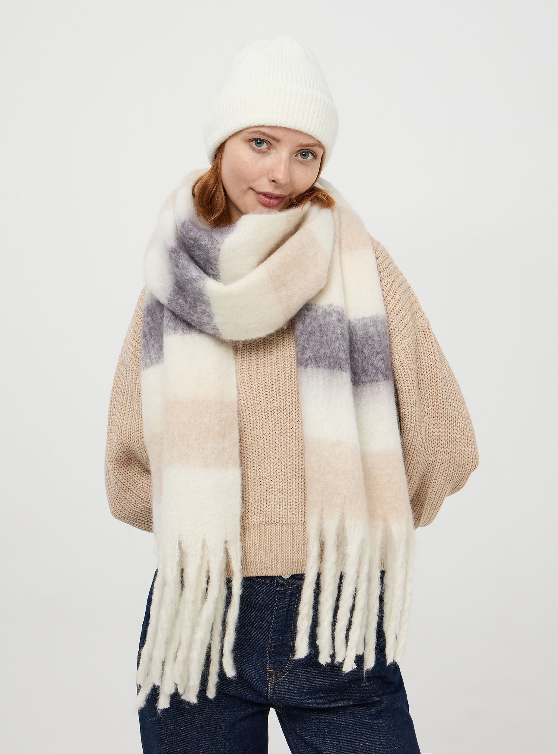 Maxi sciarpa da donna, ideale per affrontare il freddo con stile. Il tessuto offre calore e comfort, mentre le righe sfumate aggiungono un tocco di eleganza. Le frange alle estremità contribuiscono a un look trendy e sofisticato. Questo accessorio è perfetto per occasioni casual e giornate di lavoro all’aperto, donando un tocco di classe ad ogni outfit.
