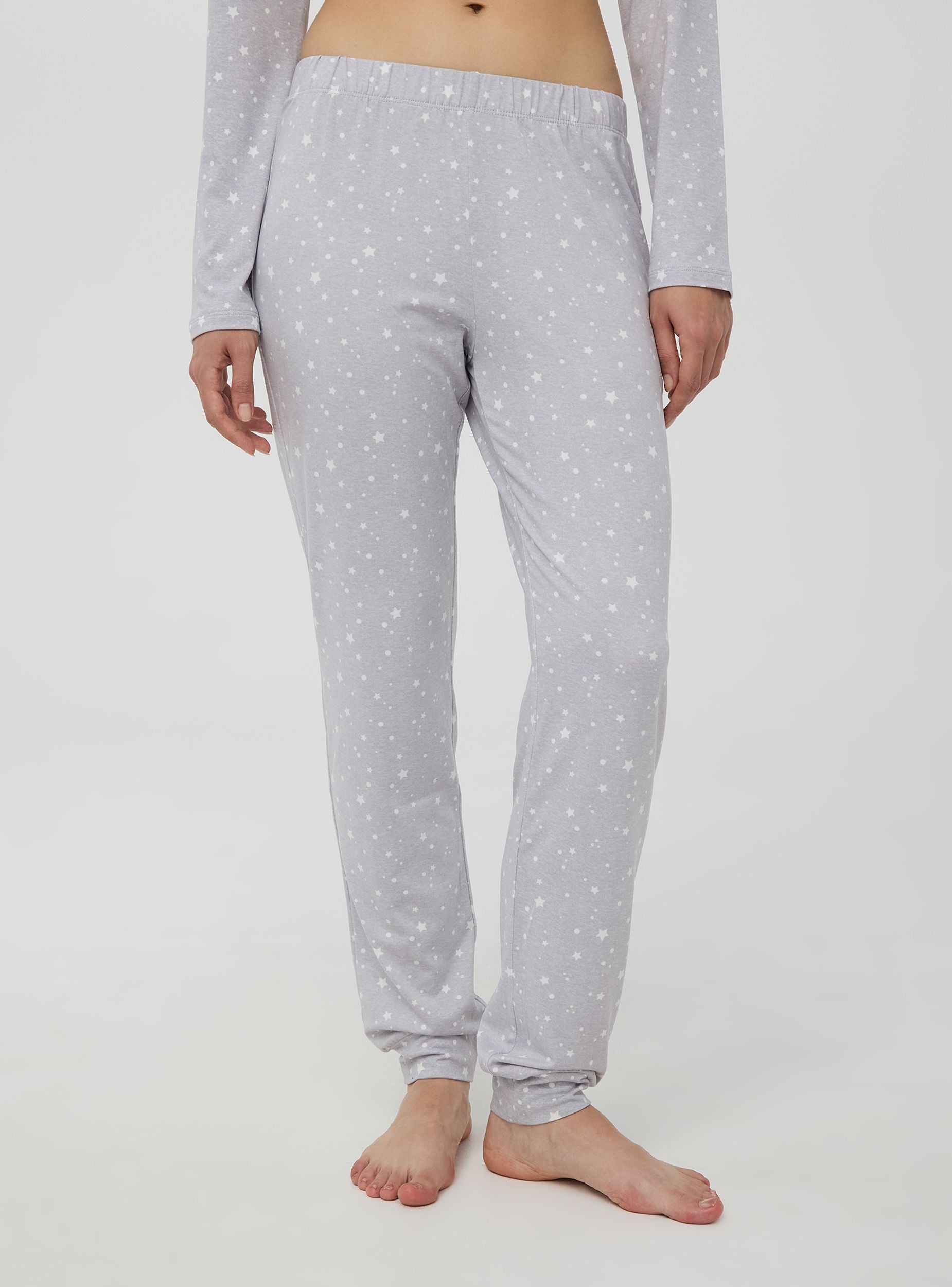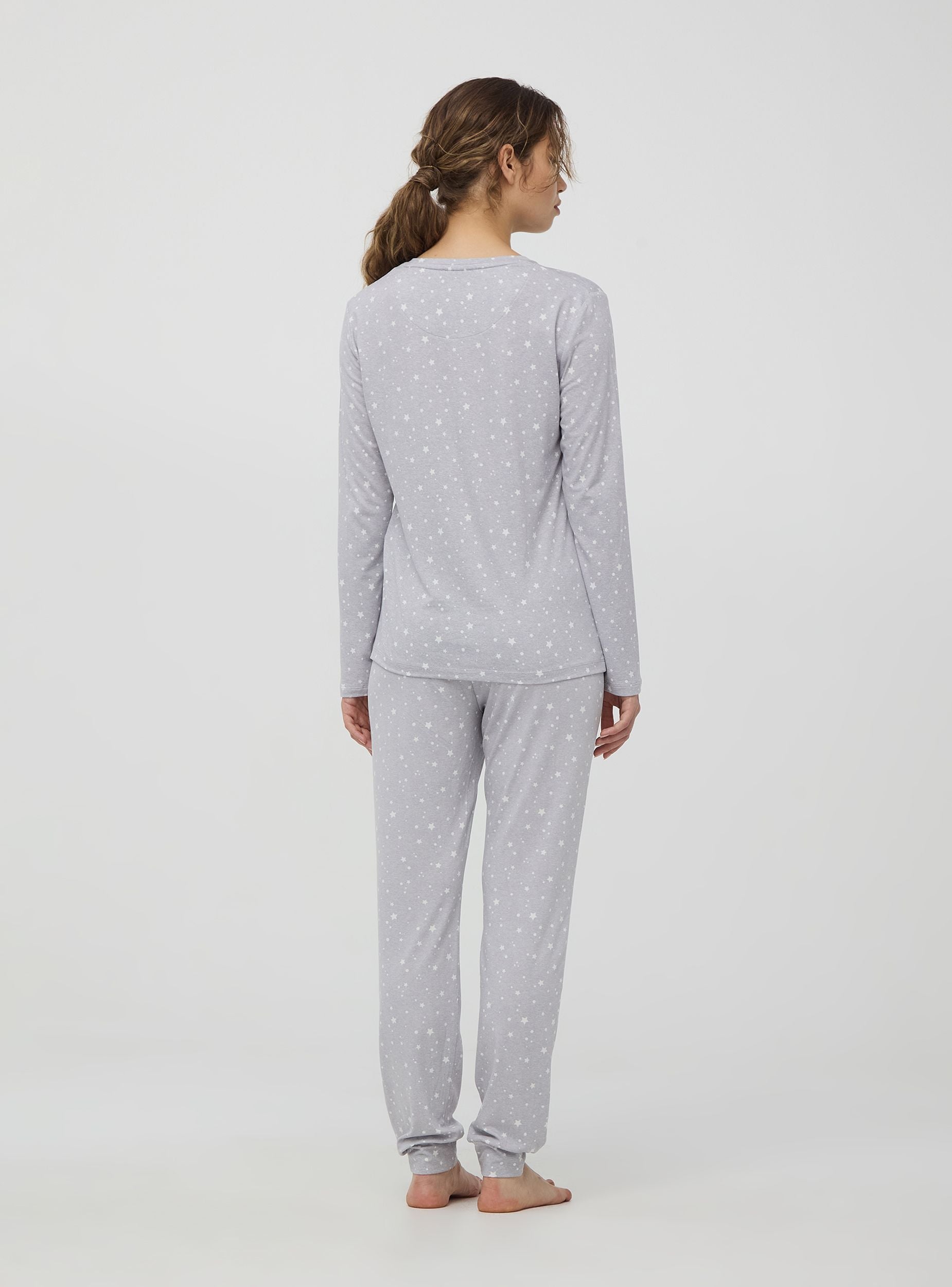 Set pigiama a pois e stelline Pigiama da donna ideale per il massimo comfort durante il sonno. Il set include una maglia a maniche lunghe e pantaloni aderenti con elastico in vita e ai polsini. Di colore grigio chiaro con una delicata stampa di pois e stelle bianche, questo pigiama presenta un design semplice e rilassato. Perfetto per le serate casual a casa, offre una vestibilità confortevole.