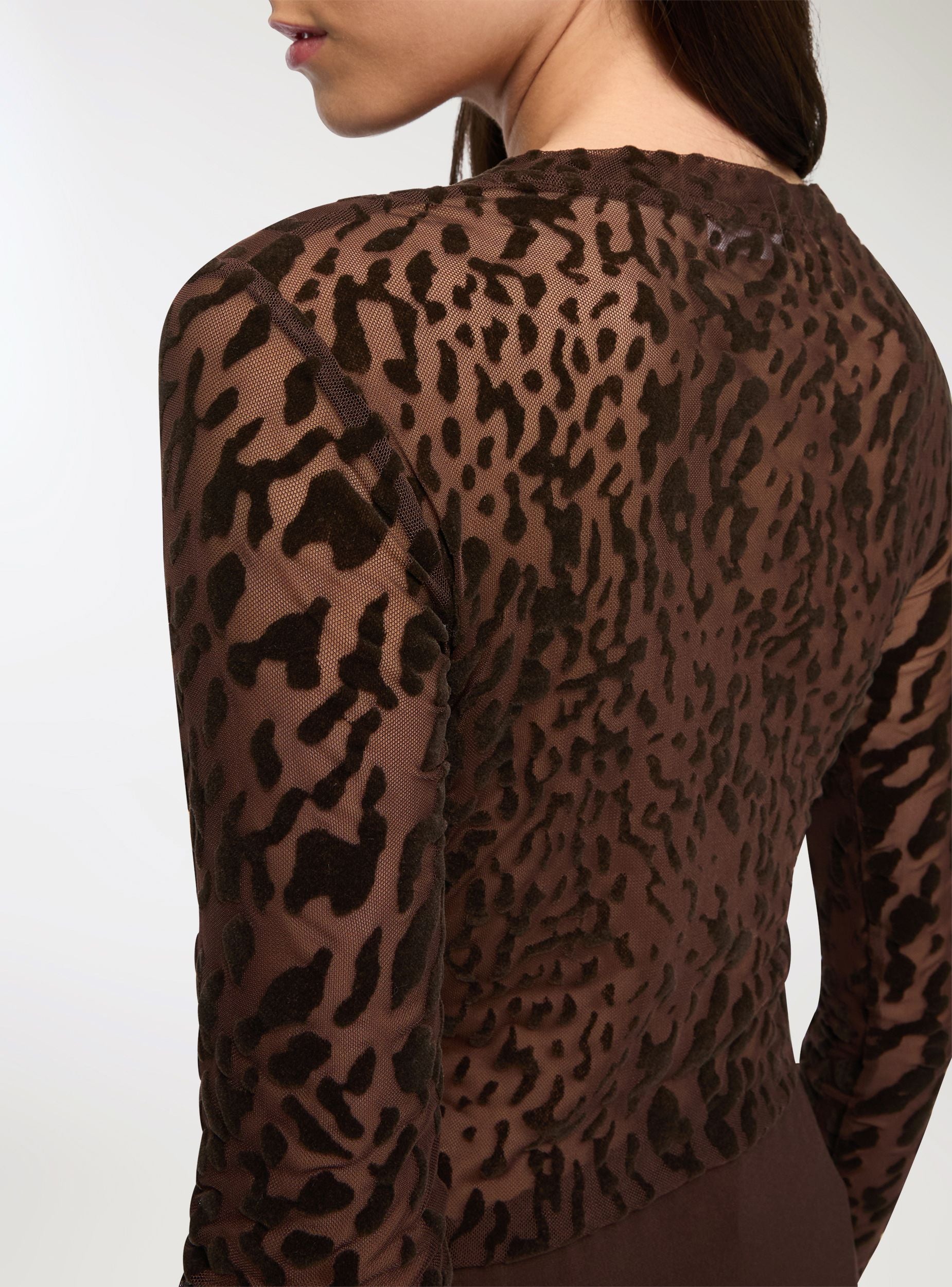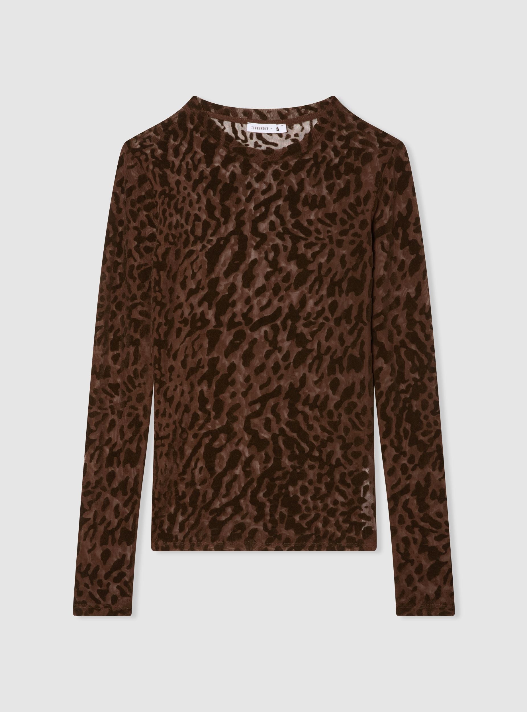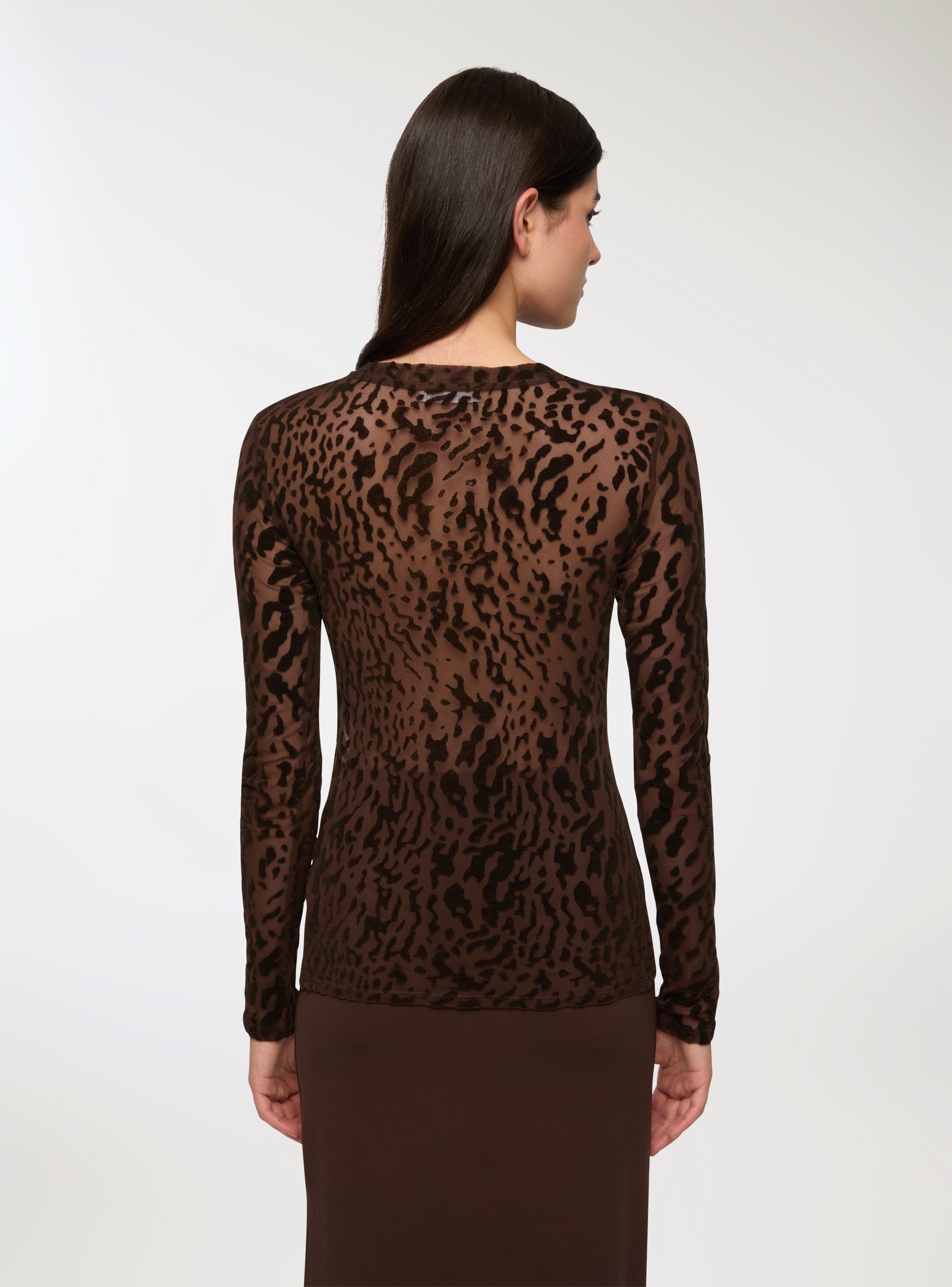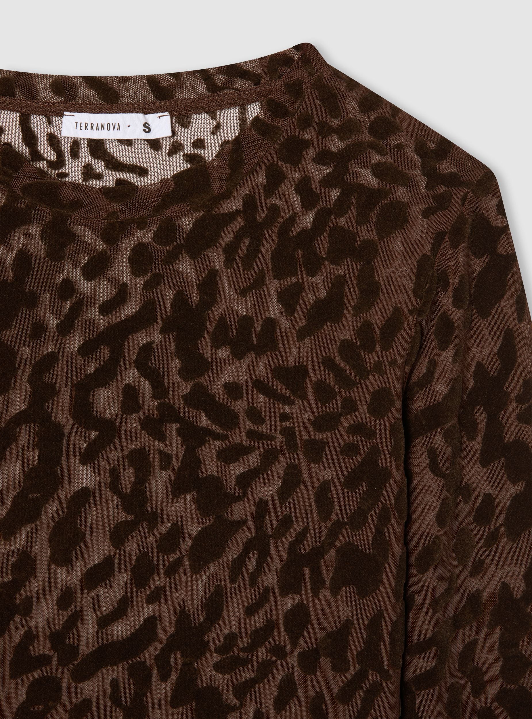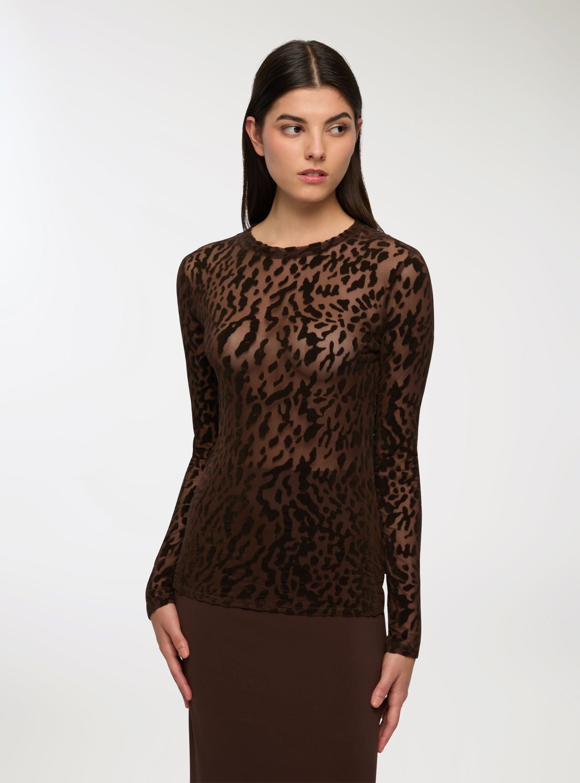 Maglietta da donna a maniche lunghe con stampa animalier. Ideale per occasioni speciali o per aggiungere un tocco di stile al tuo outfit. La vestibilità aderente e il design moderno la rendono perfetta da abbinare a pantaloni eleganti o gonne. Il collo rotondo e il tessuto in tulle trasparente con motivo animalier donano un look sofisticato e alla moda.