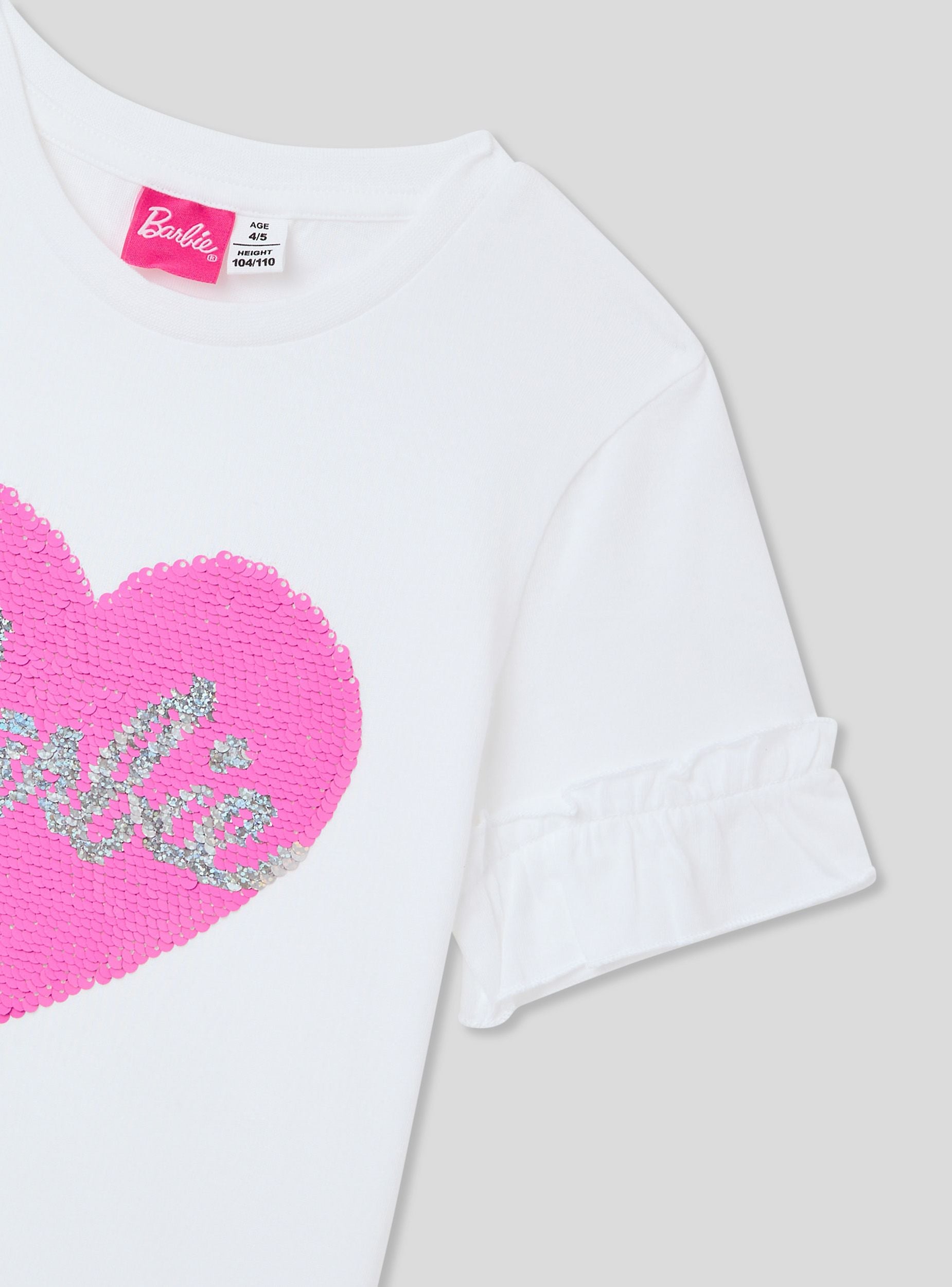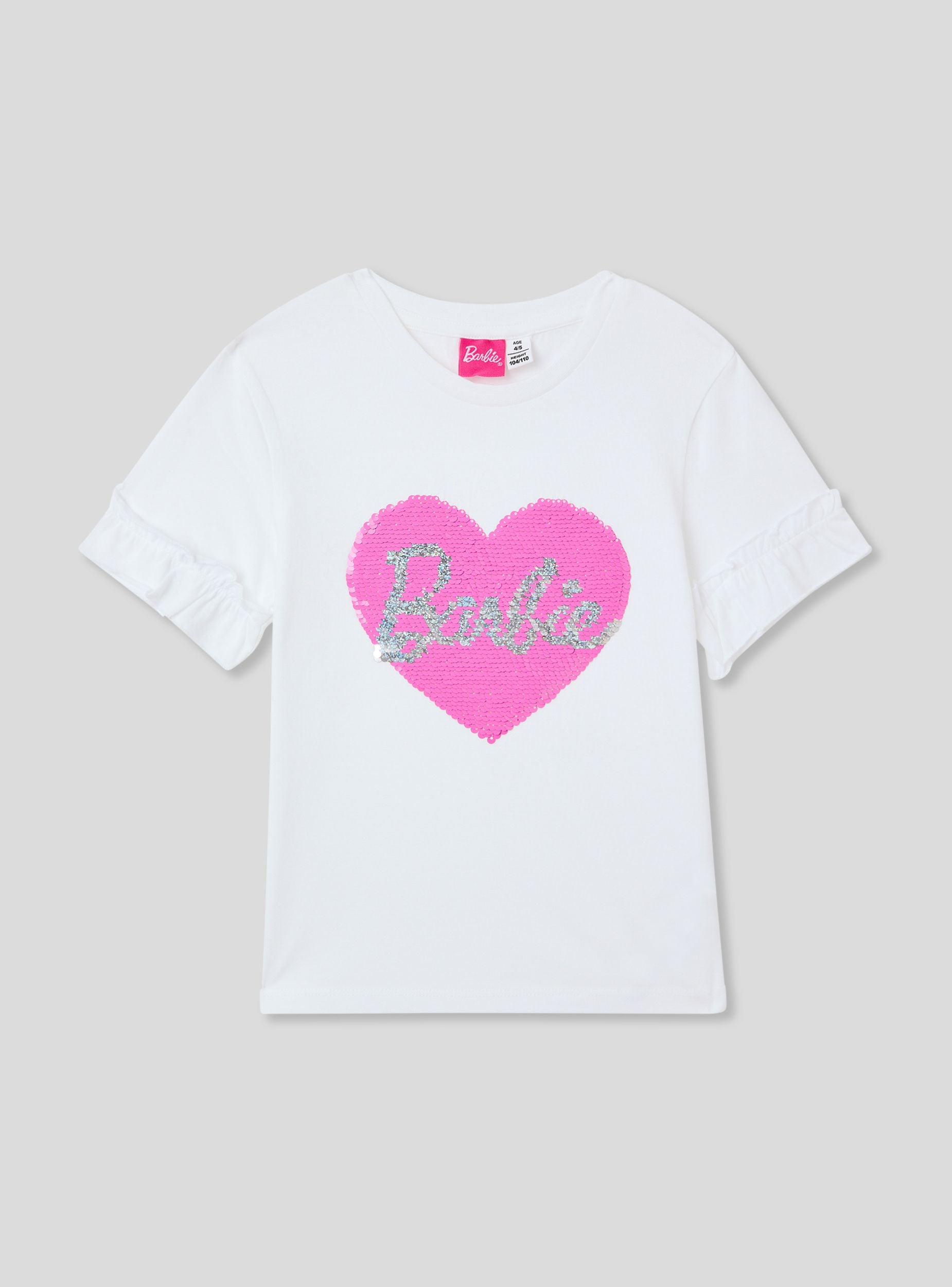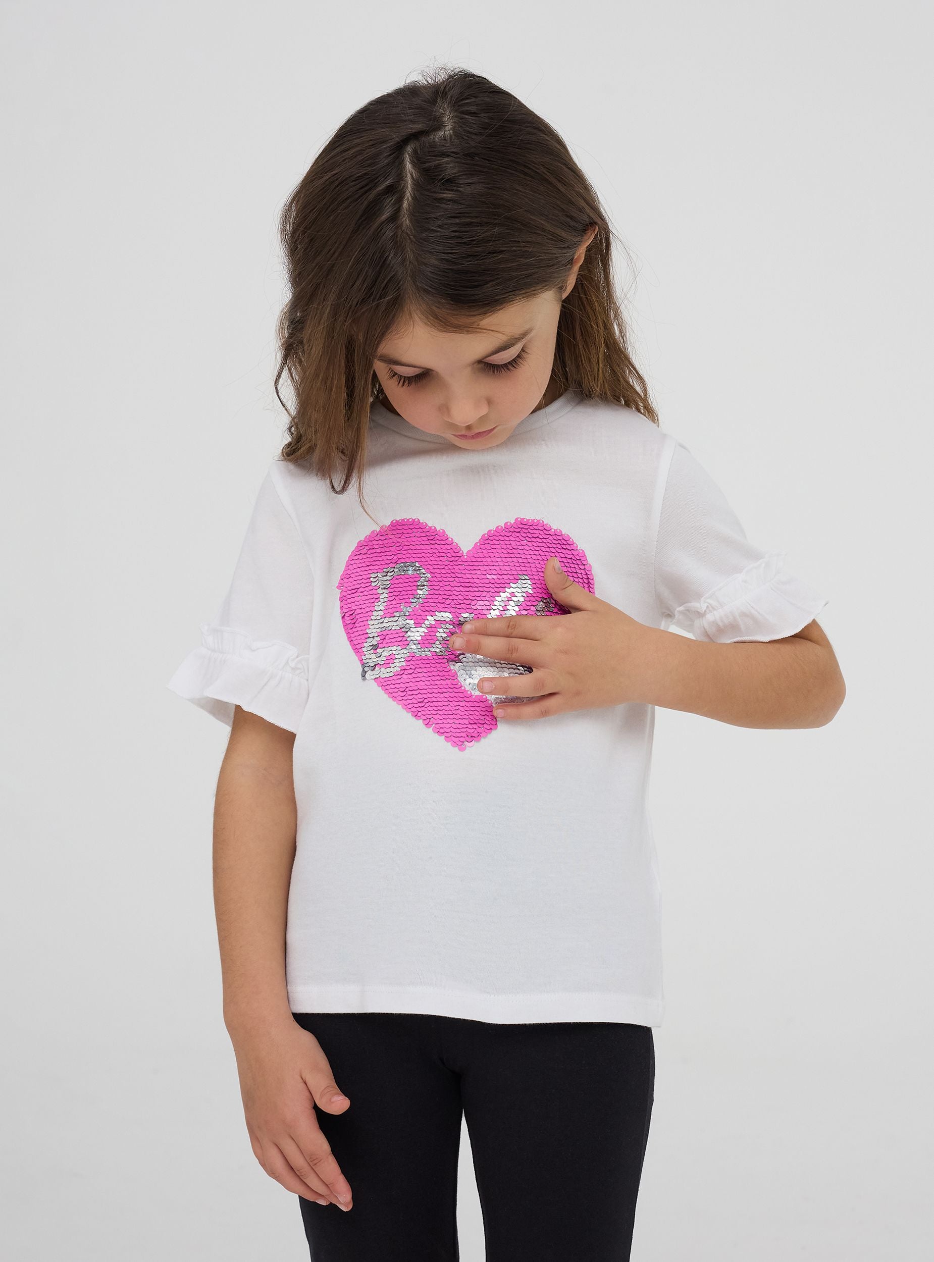 Maglietta da bimba dal look divertente e trendy, perfetta per aggiungere un tocco di stile a ogni outfit. Le maniche corte con volant donano un tocco romantico, mentre il girocollo assicura un comfort quotidiano. Al centro, spicca un grande cuore con scritta Barbie®, impreziosito da paillettes che cambiano colore al passaggio della mano, regalando un effetto giocoso e sorprendente. Un capo pensato per chi ama brillare e divertirsi con un dettaglio speciale, ideale per outfit vivaci e spensierati.