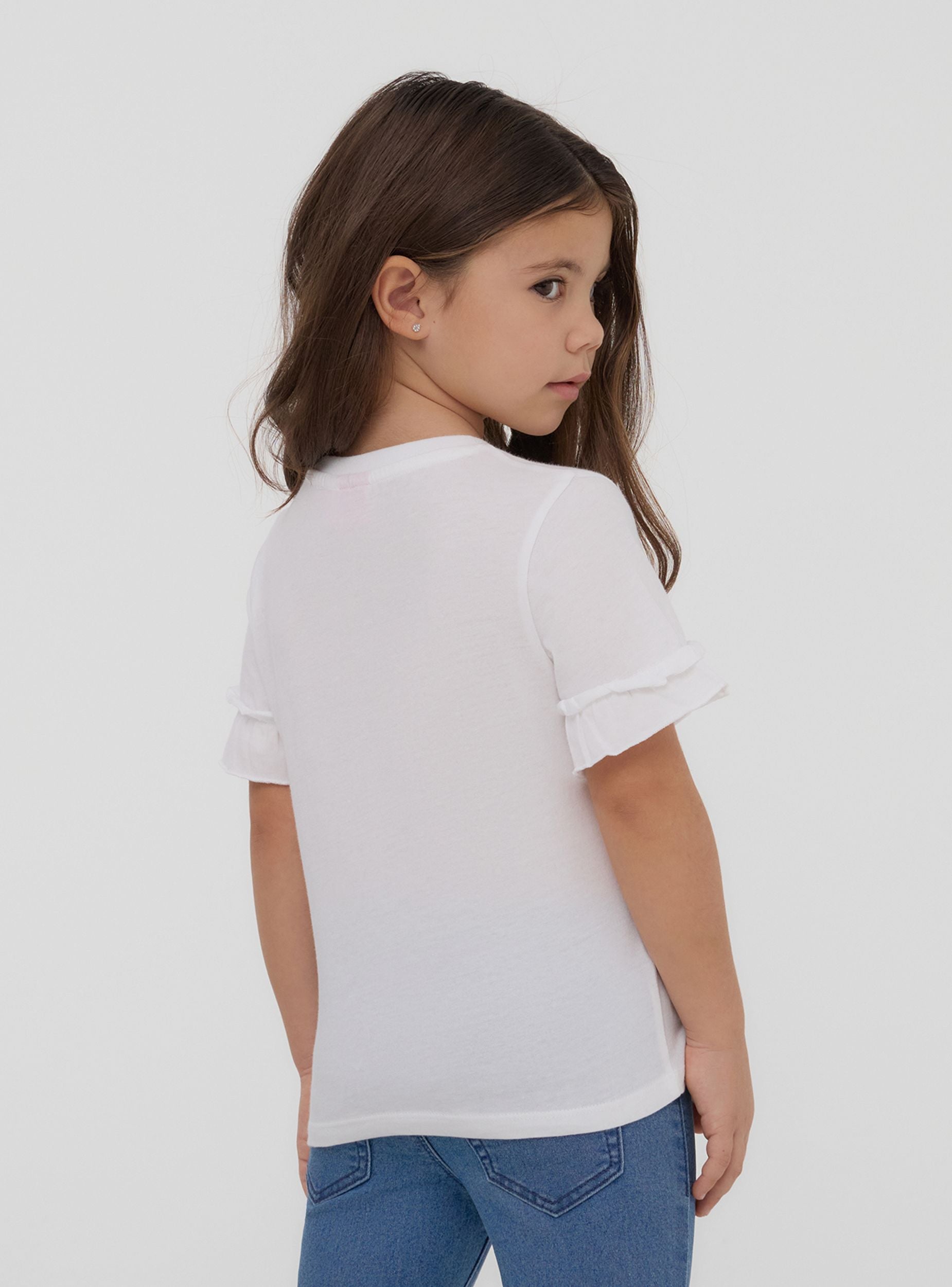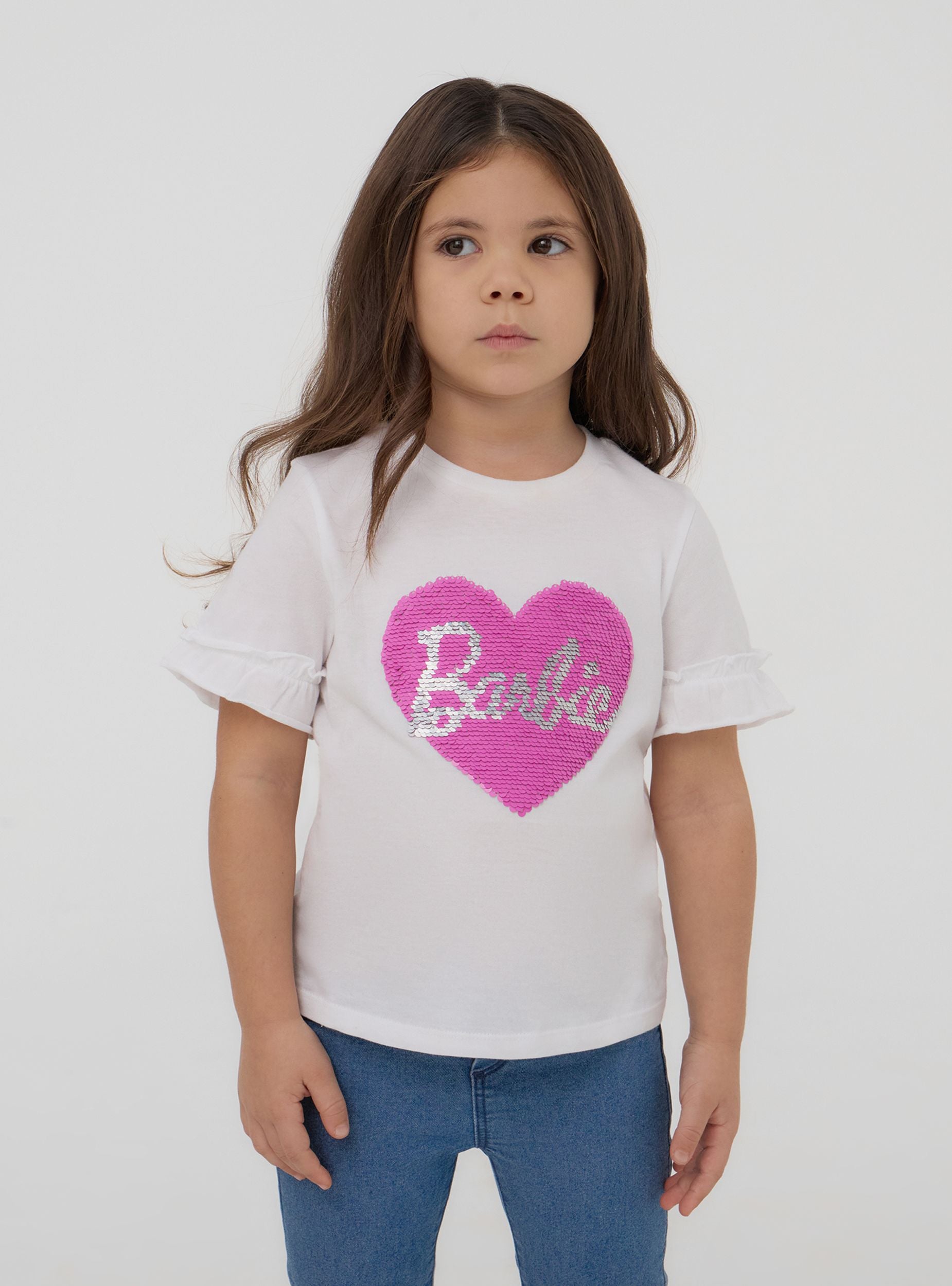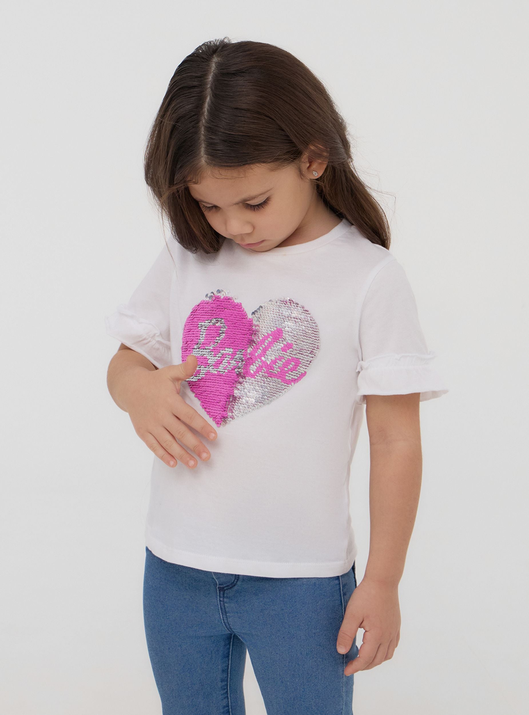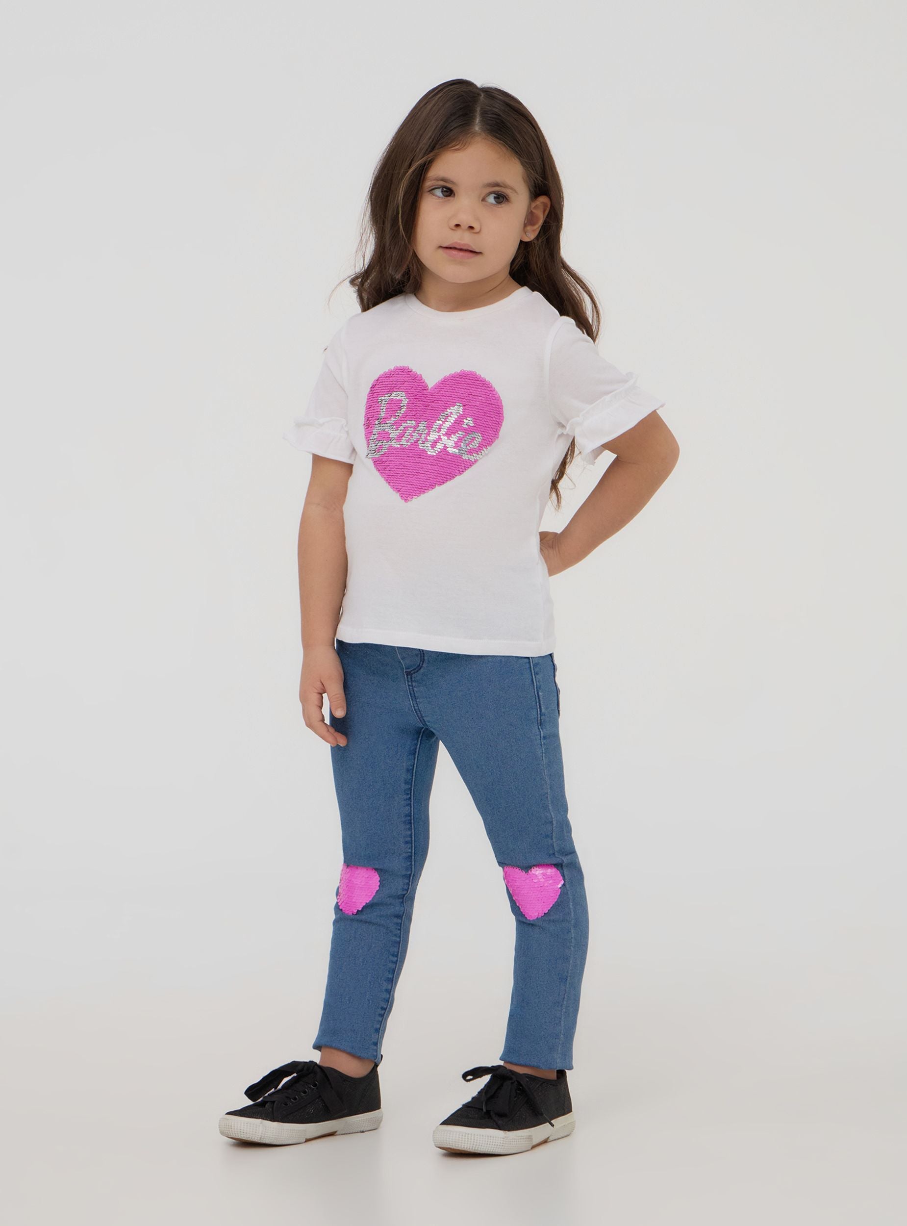Maglietta da bimba dal look divertente e trendy, perfetta per aggiungere un tocco di stile a ogni outfit. Le maniche corte con volant donano un tocco romantico, mentre il girocollo assicura un comfort quotidiano. Al centro, spicca un grande cuore con scritta Barbie®, impreziosito da paillettes che cambiano colore al passaggio della mano, regalando un effetto giocoso e sorprendente. Un capo pensato per chi ama brillare e divertirsi con un dettaglio speciale, ideale per outfit vivaci e spensierati.