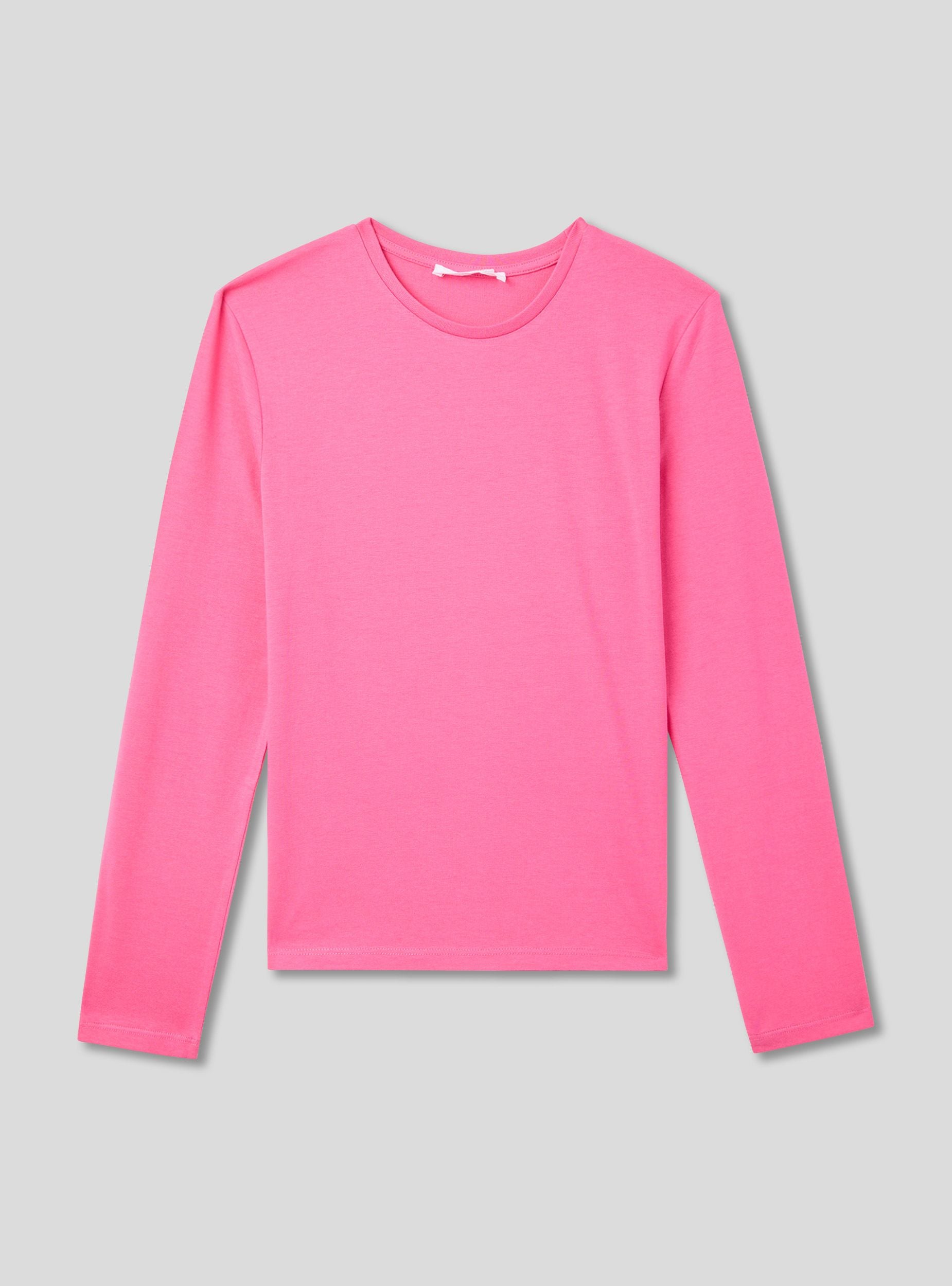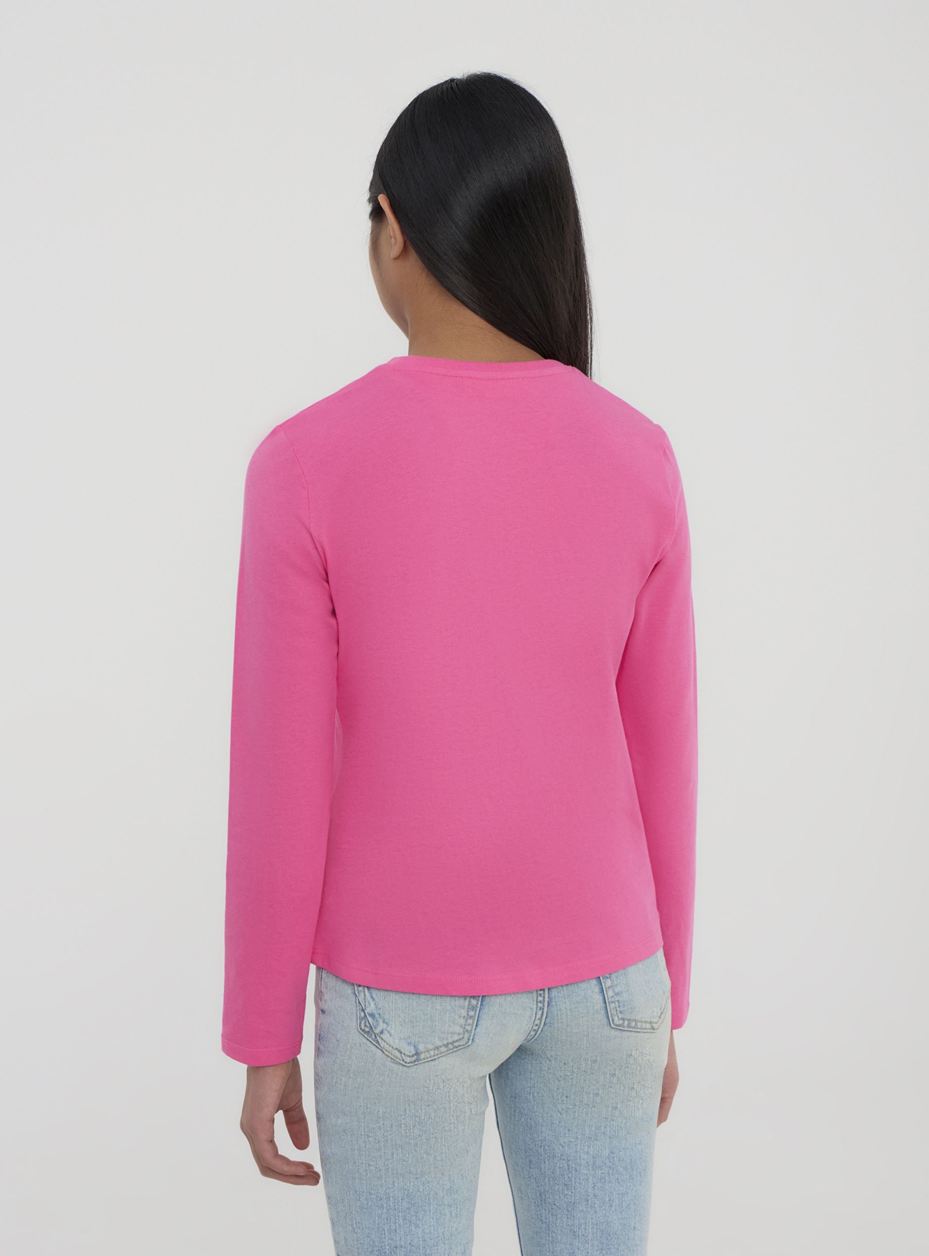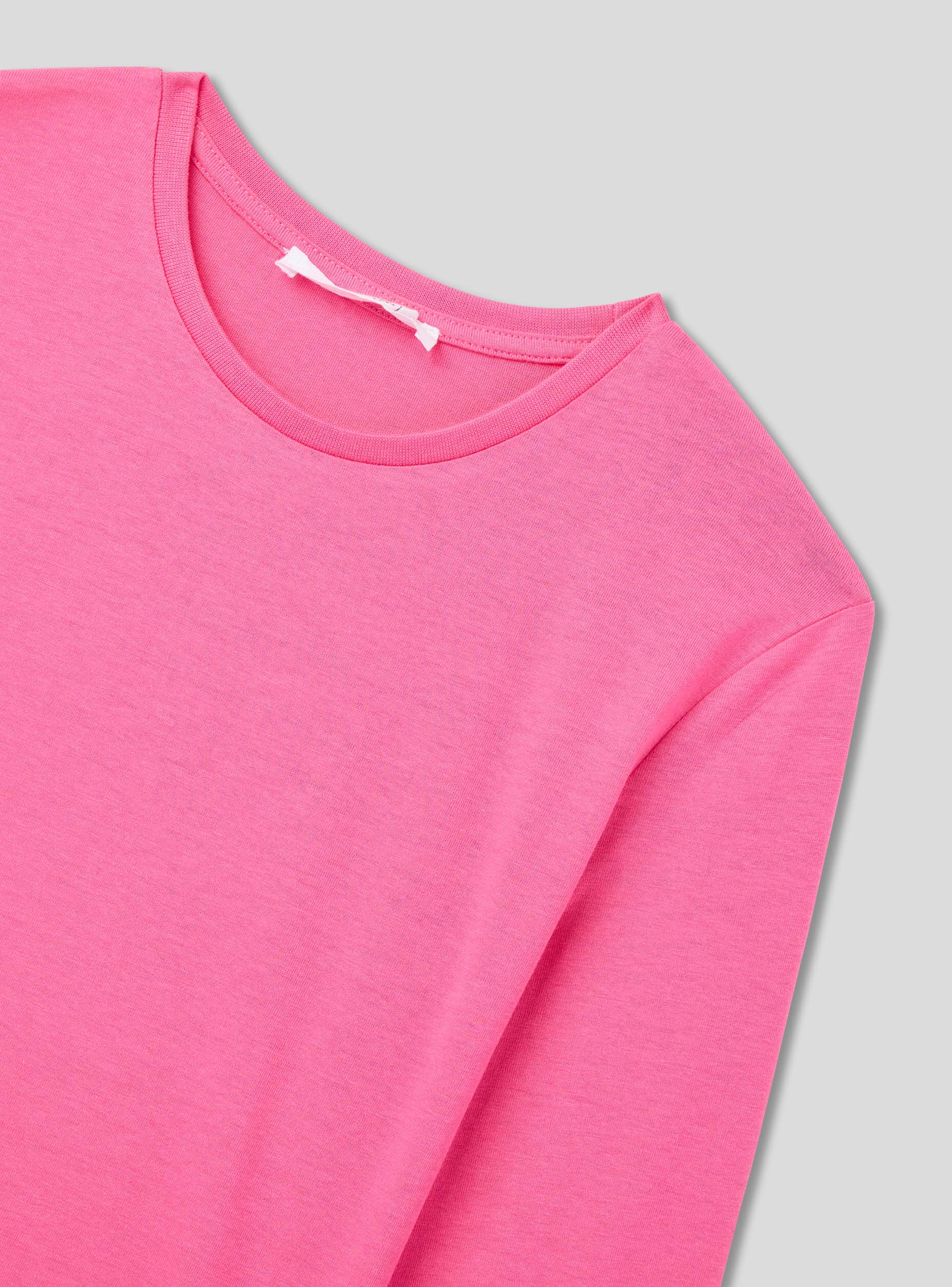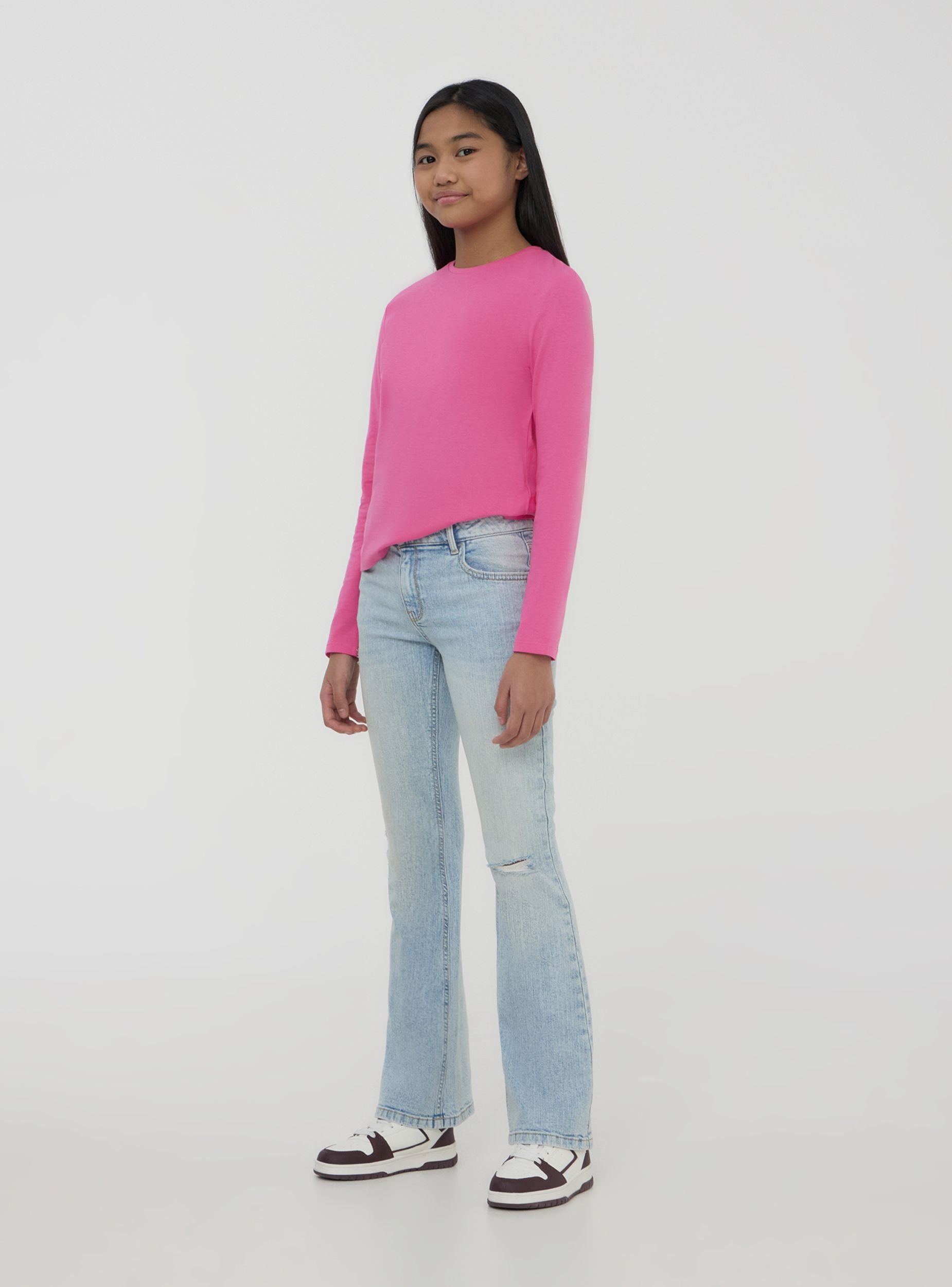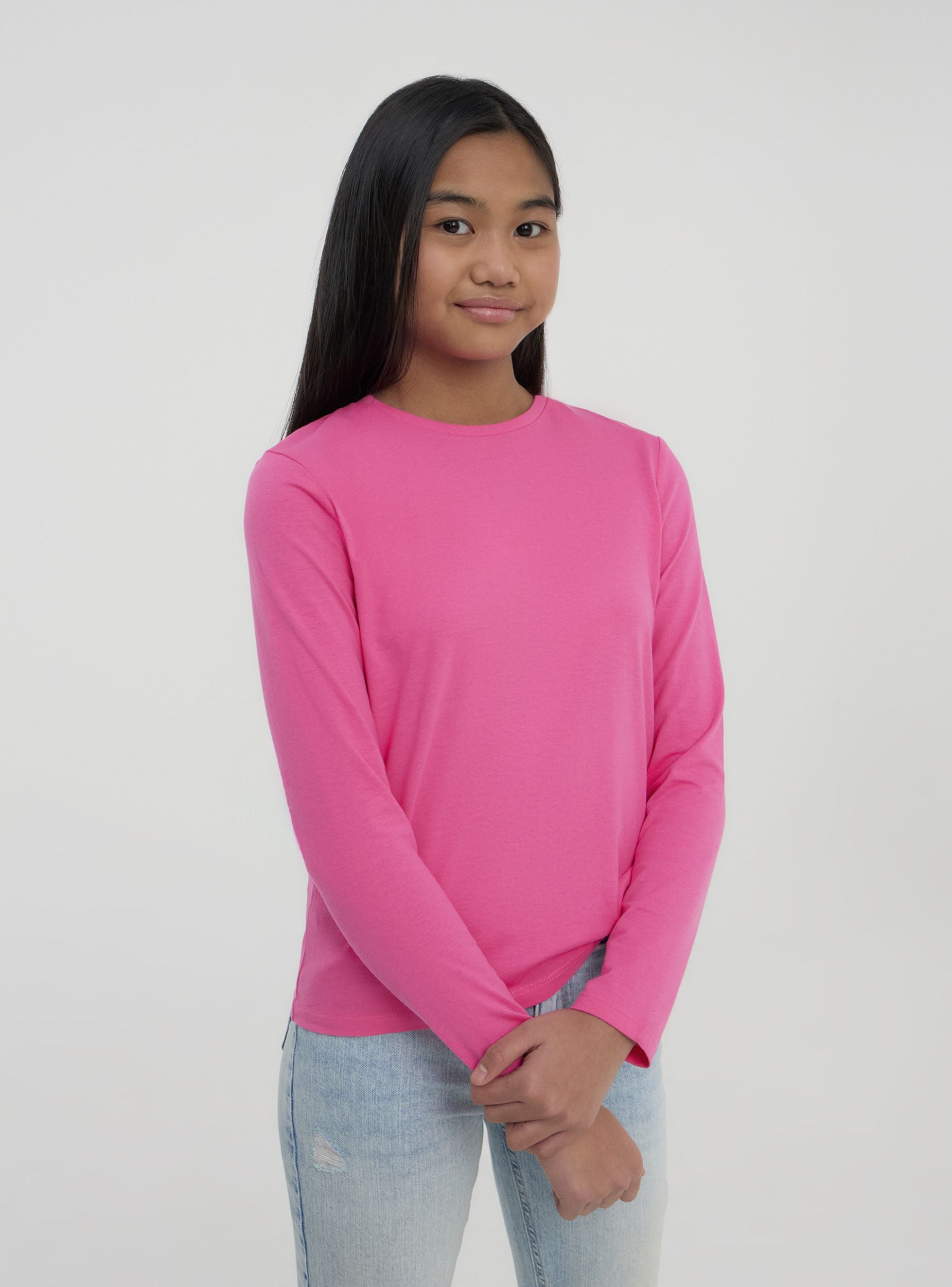 Maglia da bambina a tinta unita, caratterizzata da un design semplice e versatile. Le maniche lunghe e il girocollo garantiscono un comfort ideale per tutte le stagioni, adattandosi perfettamente a look casual o più elaborati, mantenendo uno stile sobrio e delicato. Un capo essenziale nel guardaroba delle più piccole, pensato per un utilizzo quotidiano e per abbinarsi facilmente ad altri capi.