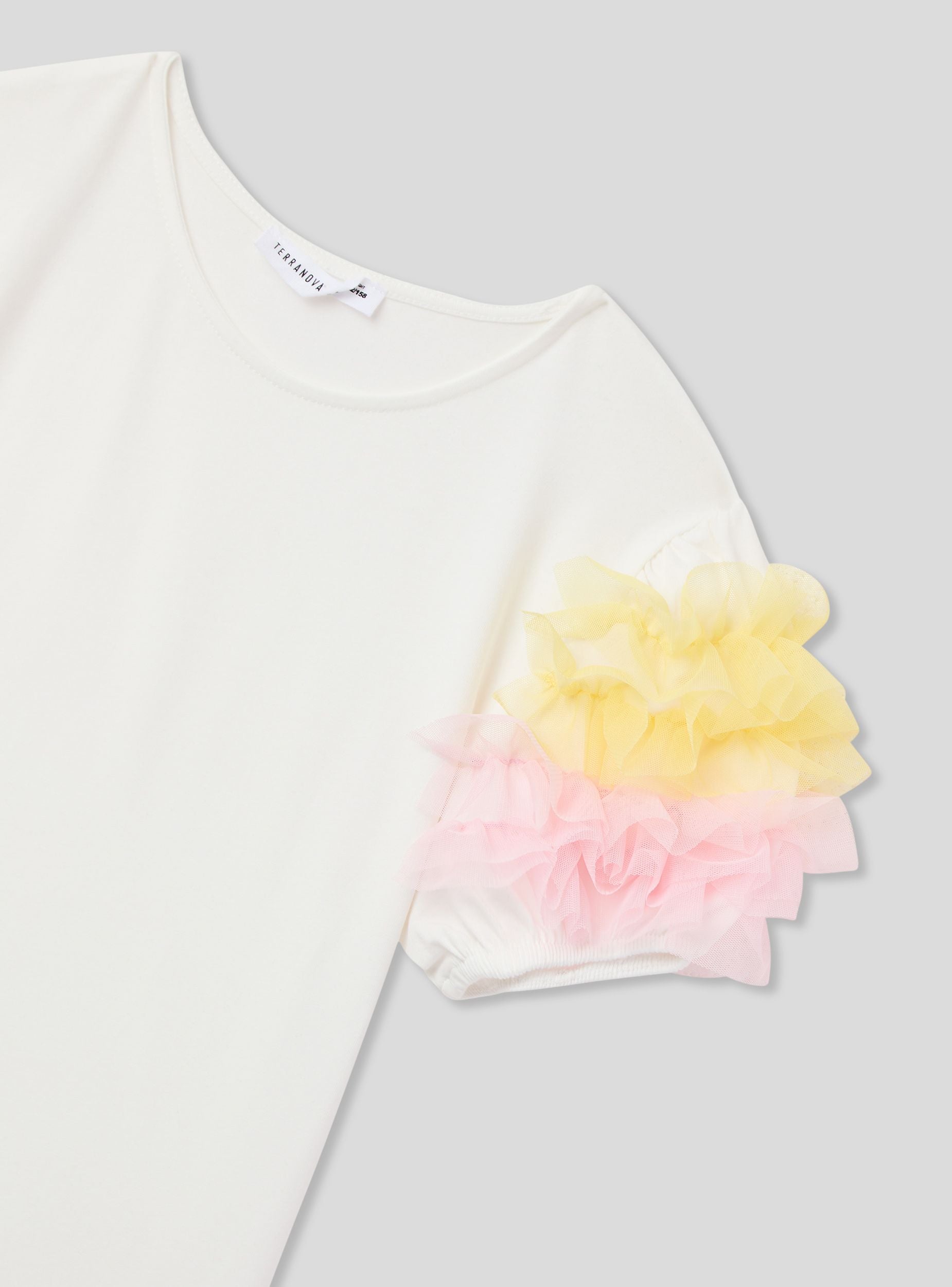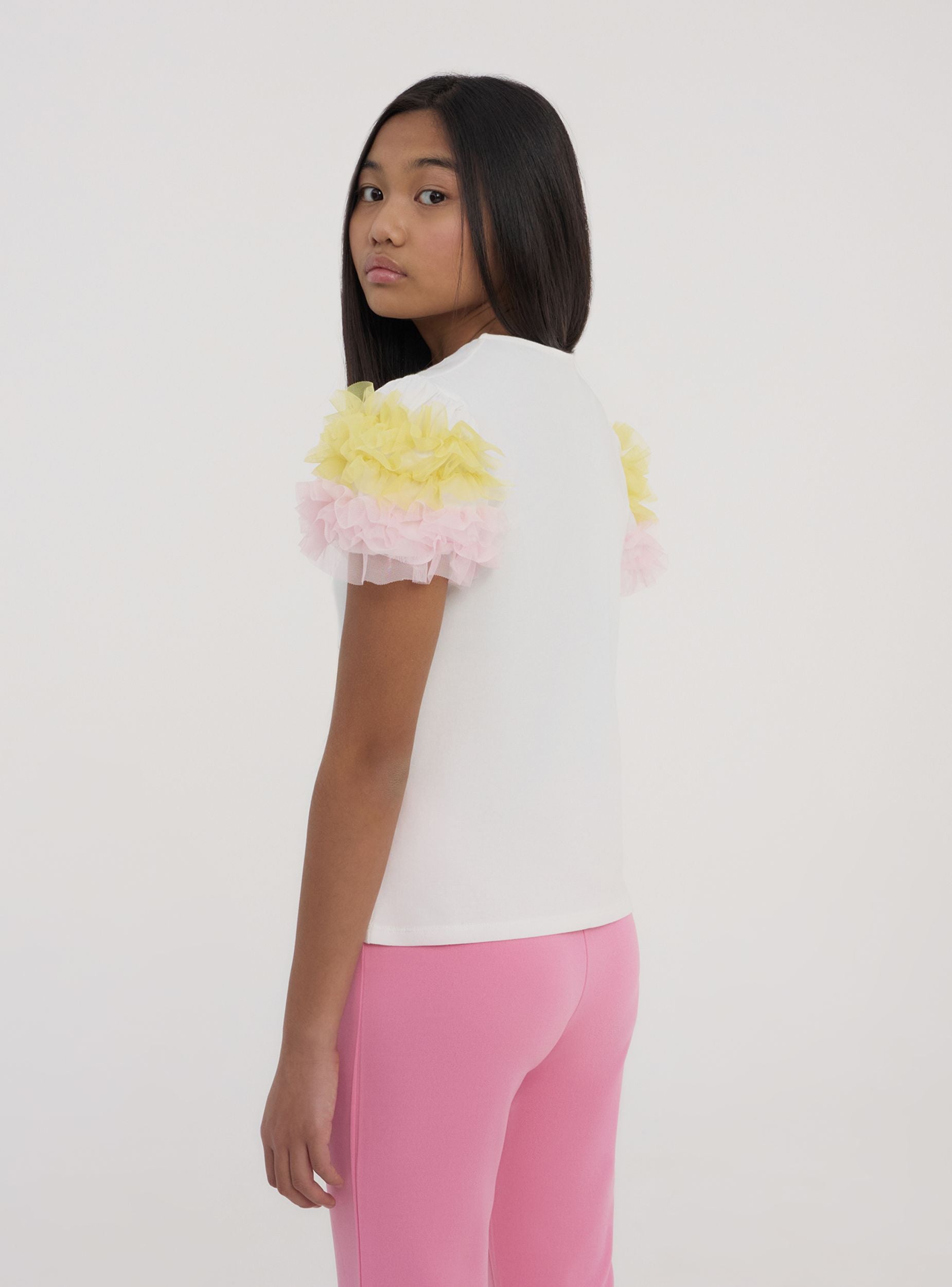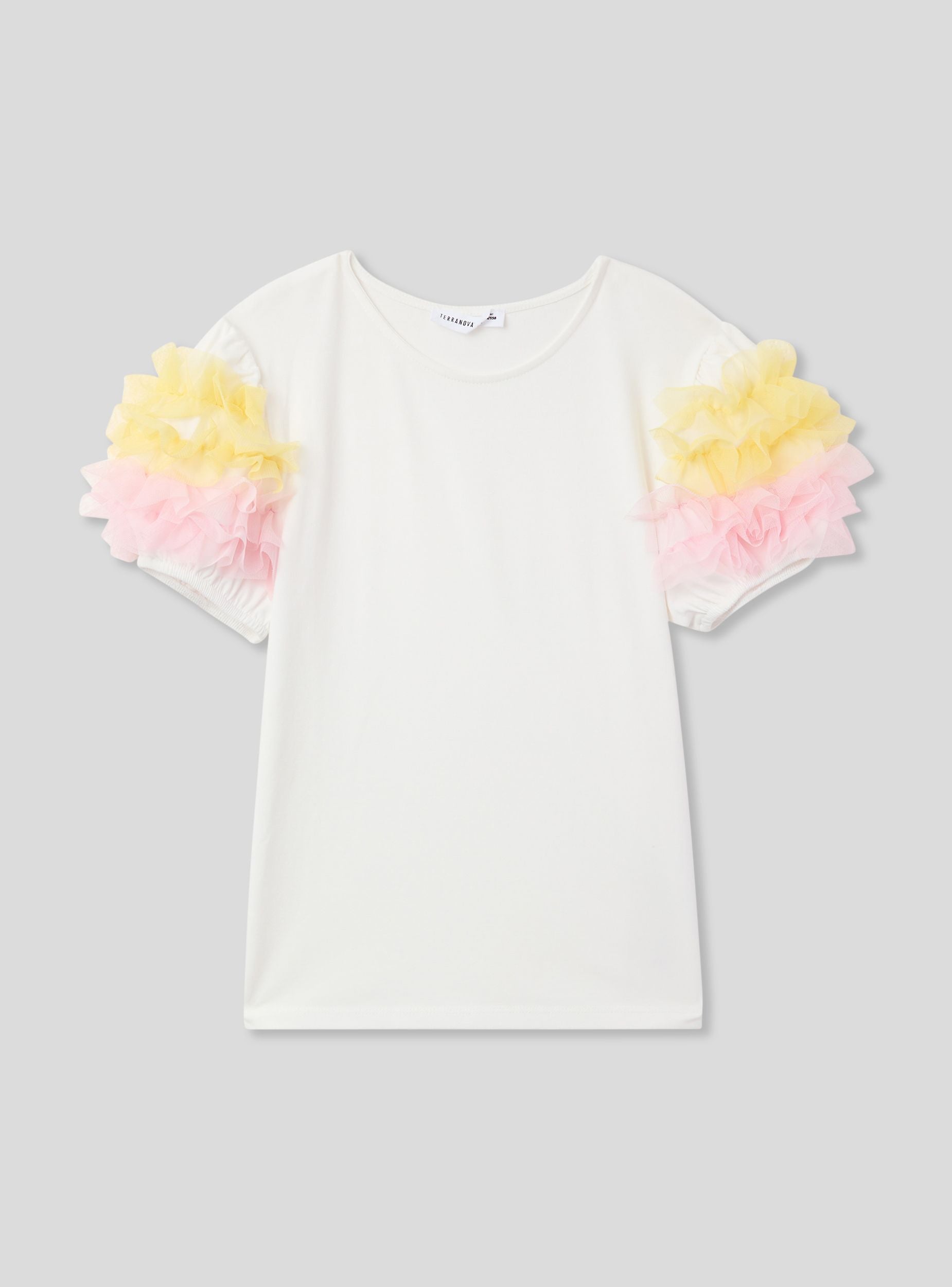 Maglietta da bambina allegra e vivace, perfetta per dare un tocco di originalità a ogni look. Presenta un comodo girocollo e maniche corte impreziosite da balze in tulle che donano movimento e stile. Ideale per le piccole fashioniste che amano distinguersi con un capo speciale. Questa maglietta unisce comfort e fantasia, perfetta sia per le occasioni quotidiane che per i momenti più festivi. Un capo che rende il guardaroba delle bambine ancora più colorato e giocoso.Dettagli