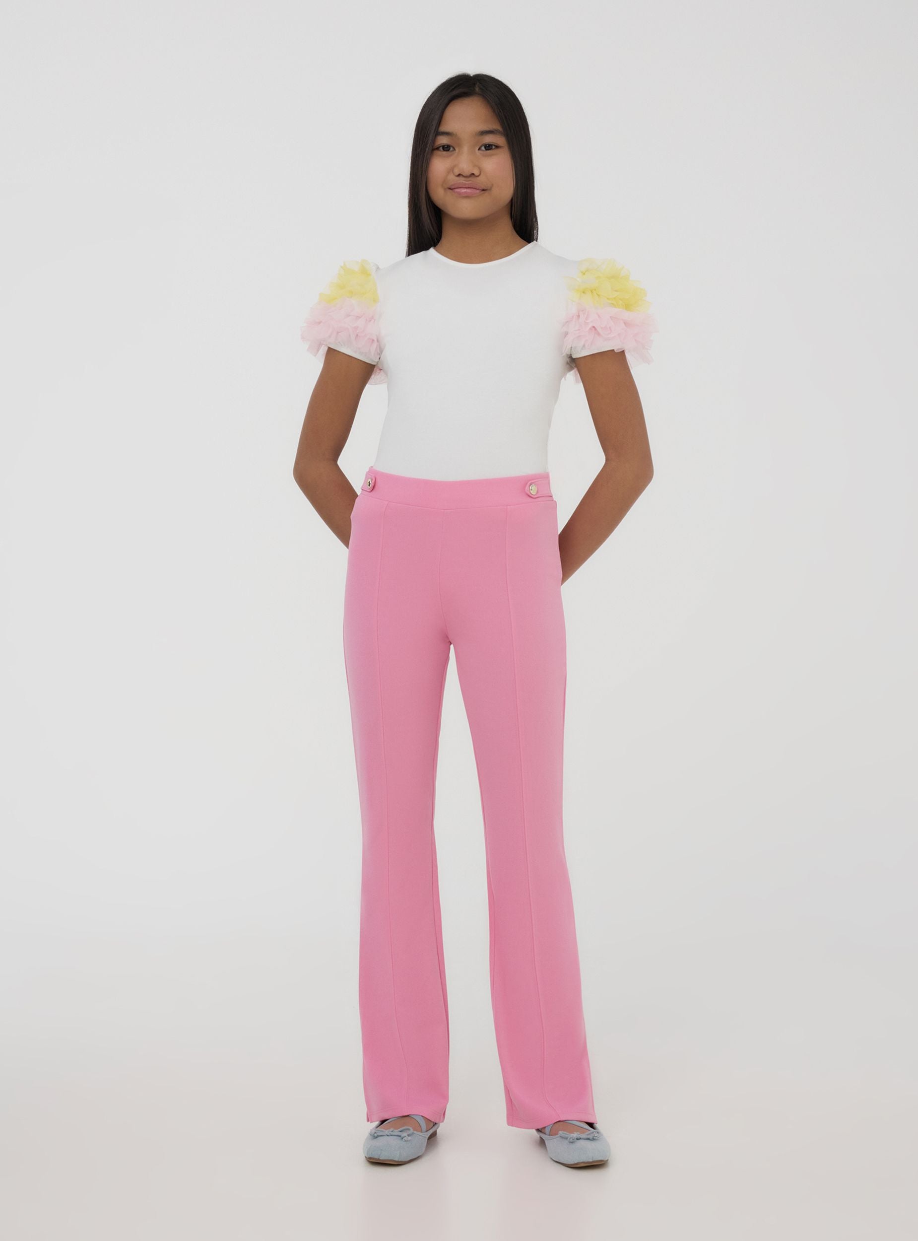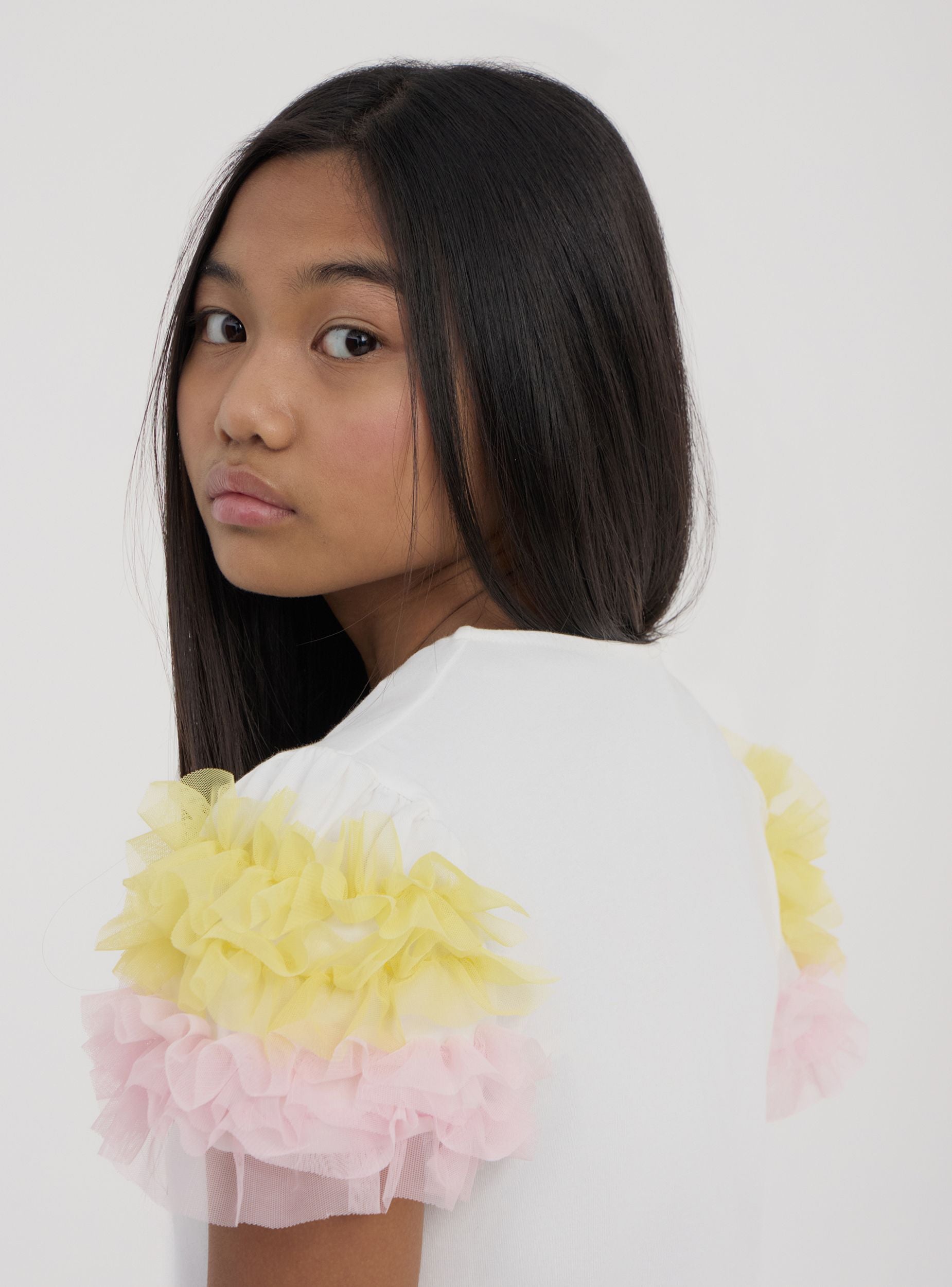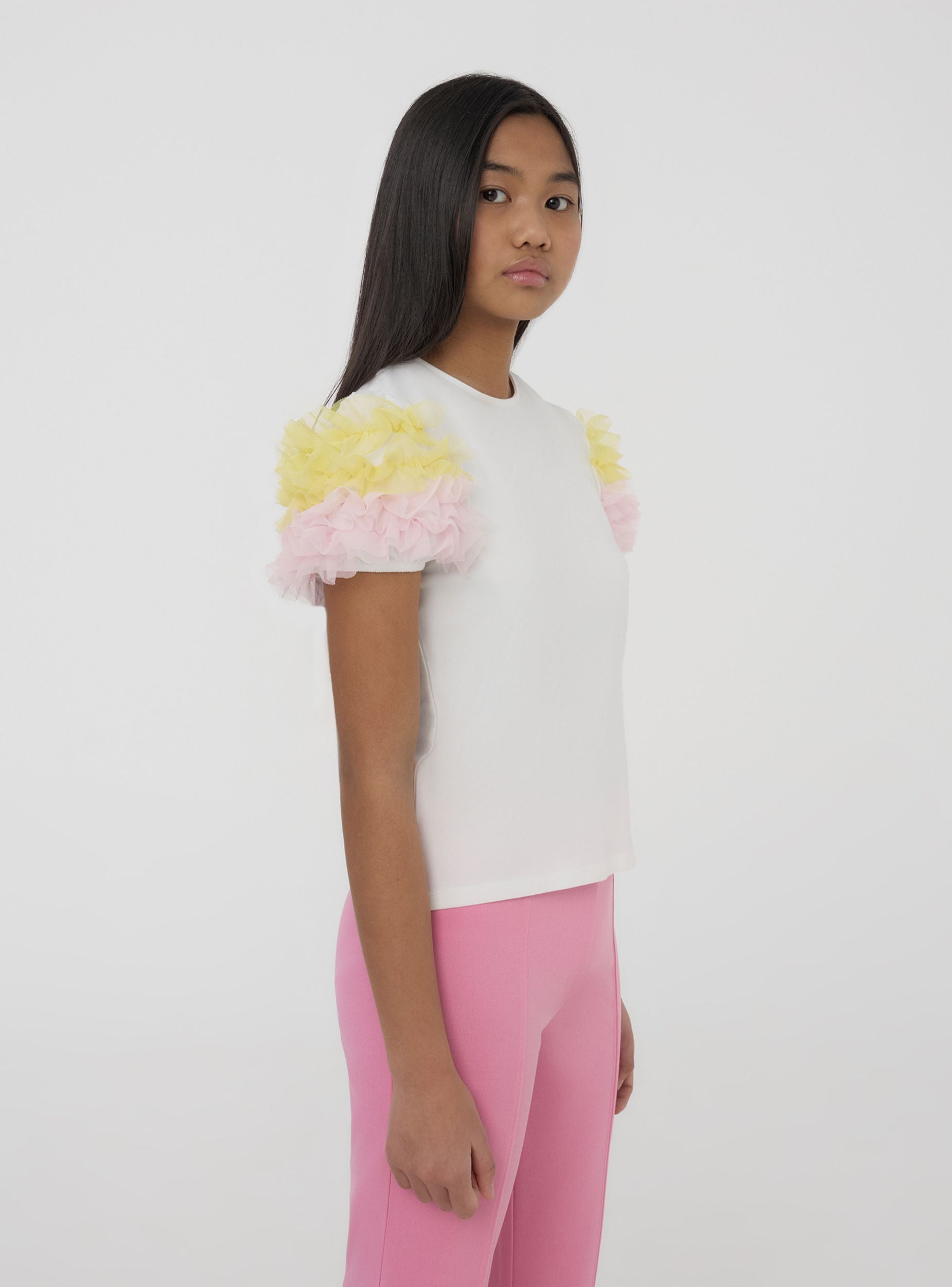 Maglietta da bambina allegra e vivace, perfetta per dare un tocco di originalità a ogni look. Presenta un comodo girocollo e maniche corte impreziosite da balze in tulle che donano movimento e stile. Ideale per le piccole fashioniste che amano distinguersi con un capo speciale. Questa maglietta unisce comfort e fantasia, perfetta sia per le occasioni quotidiane che per i momenti più festivi. Un capo che rende il guardaroba delle bambine ancora più colorato e giocoso.Dettagli