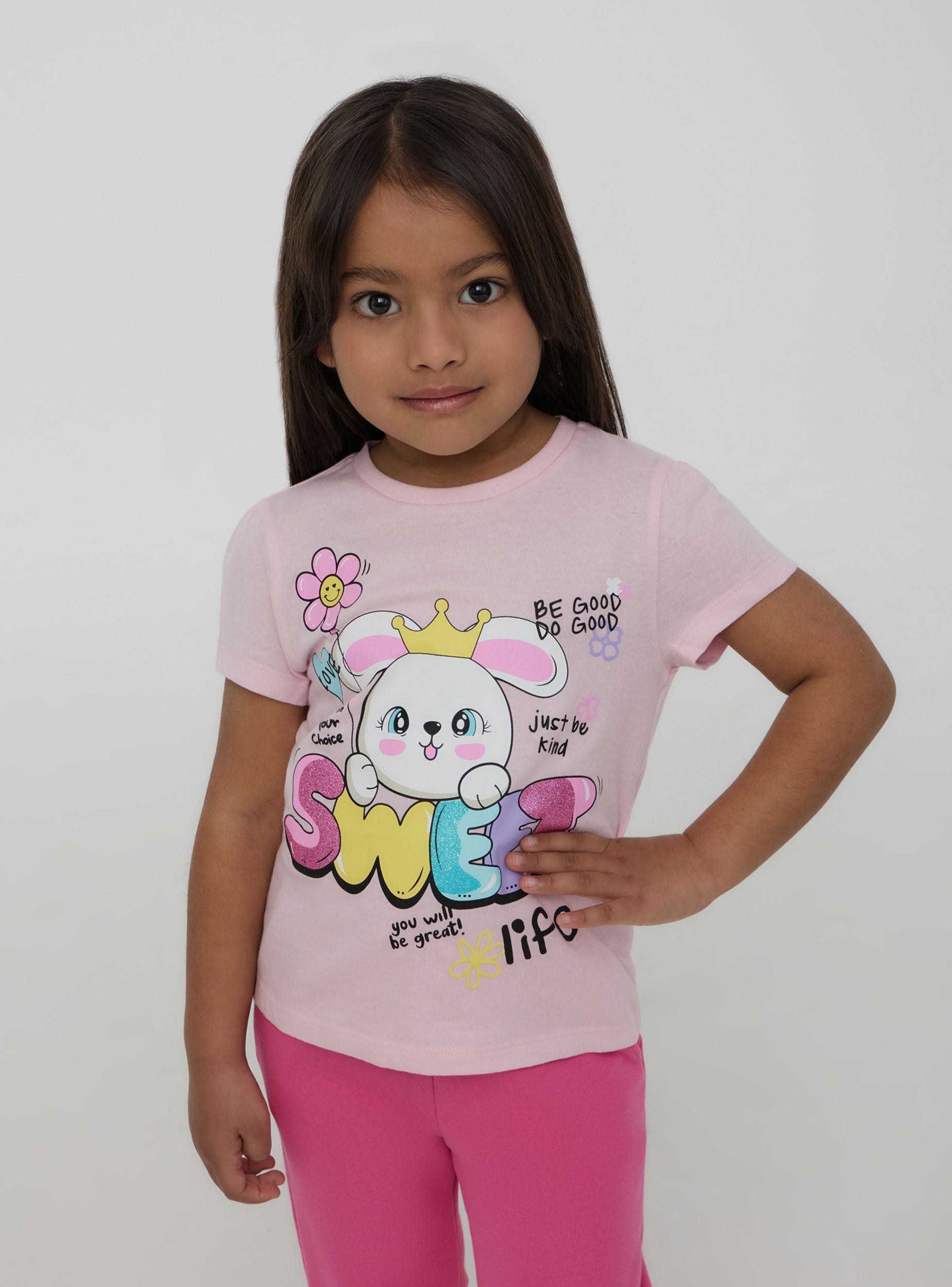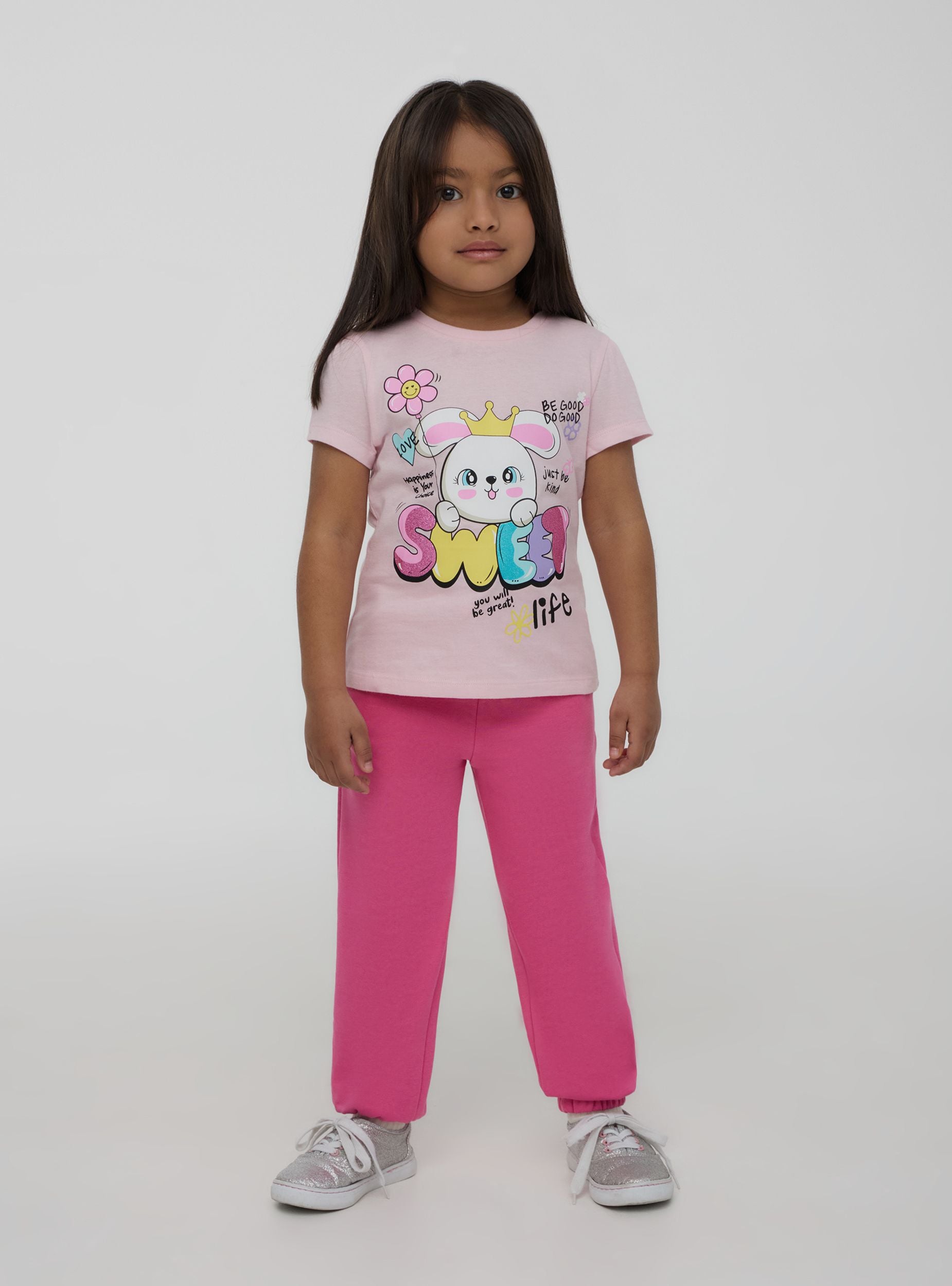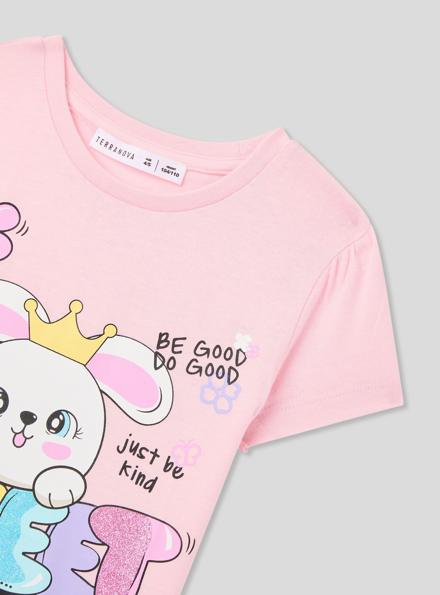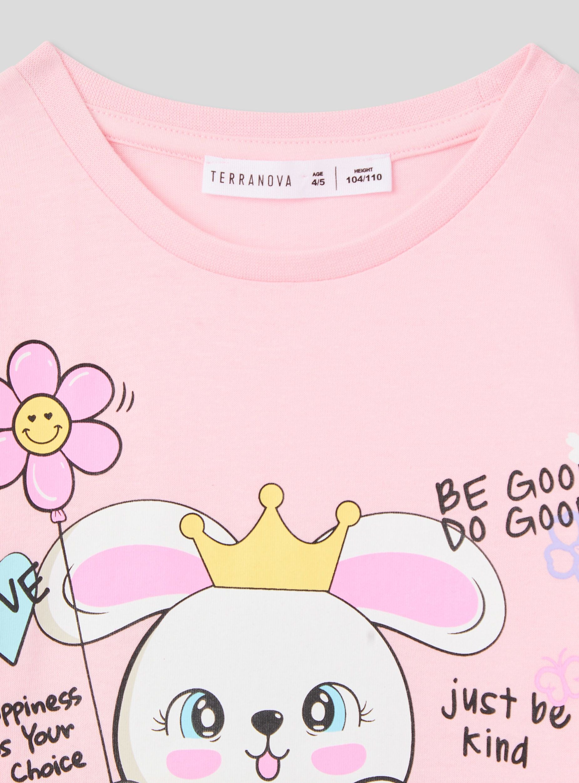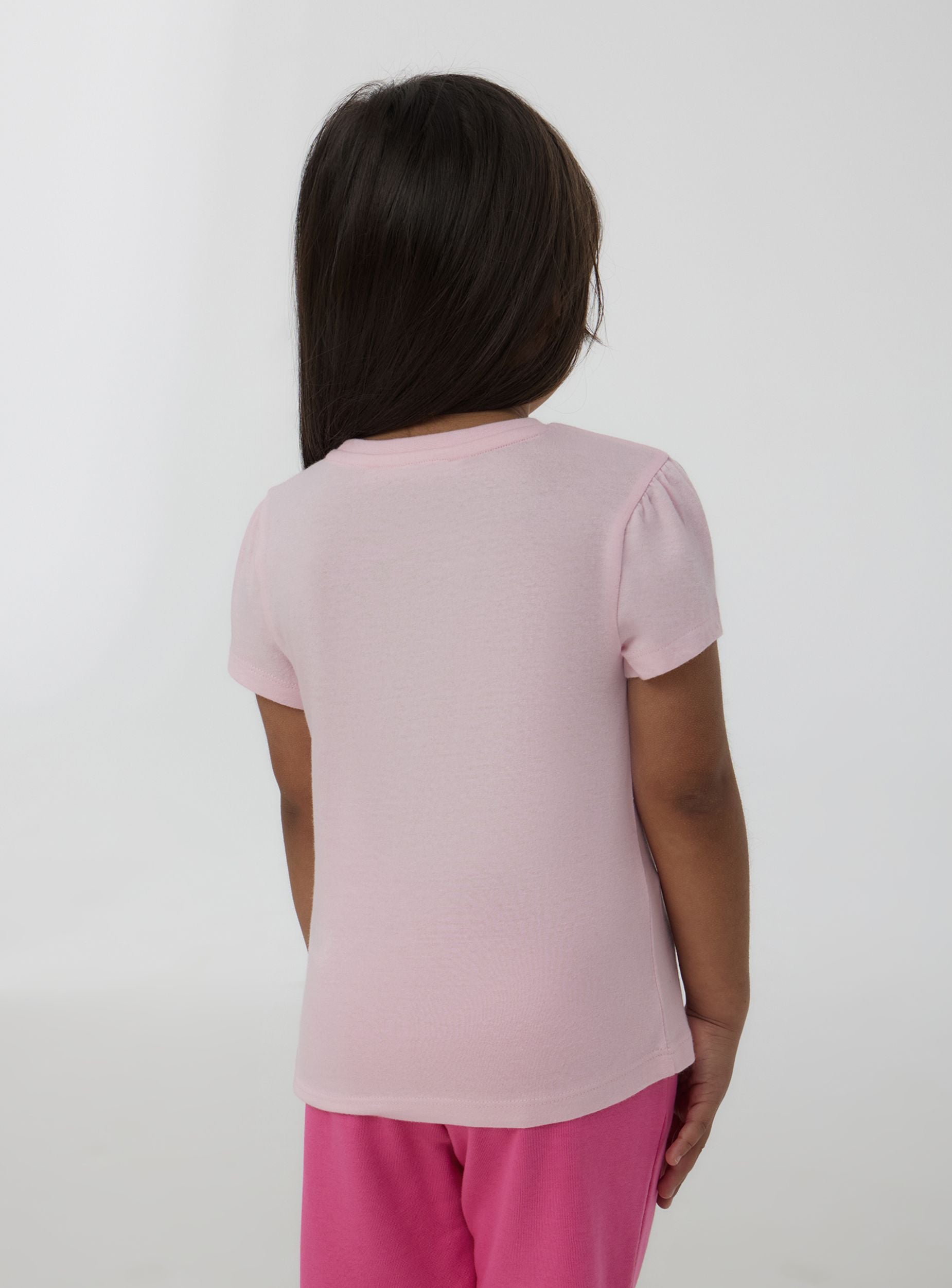 Maglietta da bimba con girocollo classico e maniche corte, arricchita da una vivace stampa centrale che dona un tocco di allegria e originalità. Perfetta per un look casual e giocoso, ideale da indossare durante il tempo libero o per creare abbinamenti comodi e divertenti.