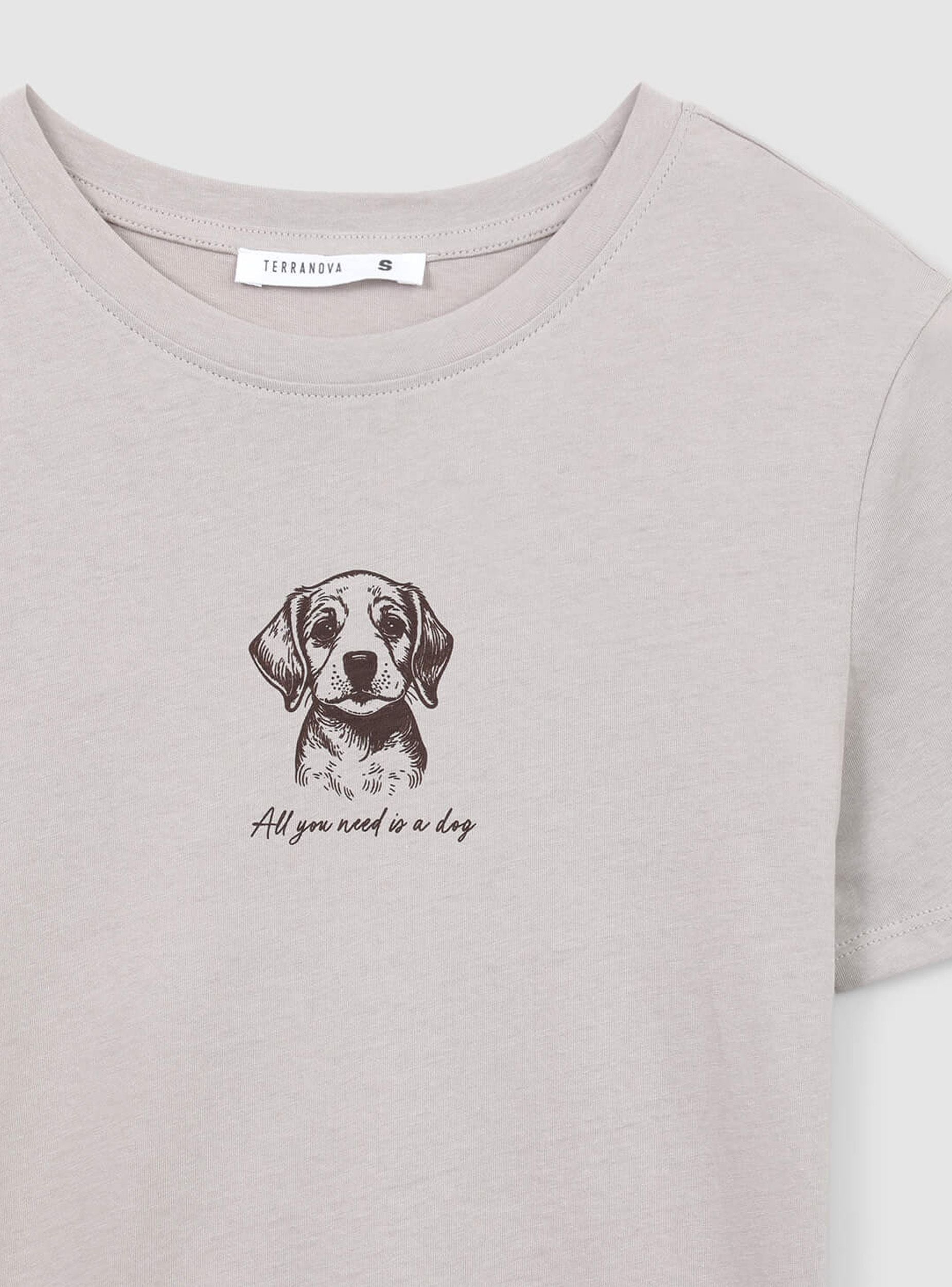 Maglietta da donna con stampa di un dolce cagnolino e la scritta "all you need is a dog", ideale per un look casual e versatile. Perfetta per essere abbinata a jeans o pantaloni sportivi, questa maglietta offre un comfort ottimale grazie al suo design semplice e alla vestibilità regolare. Adatta per il tempo libero, si distingue per la sua stampa originale che aggiunge un tocco di personalità al tuo outfit.